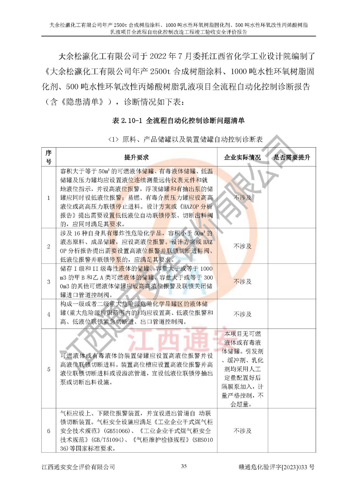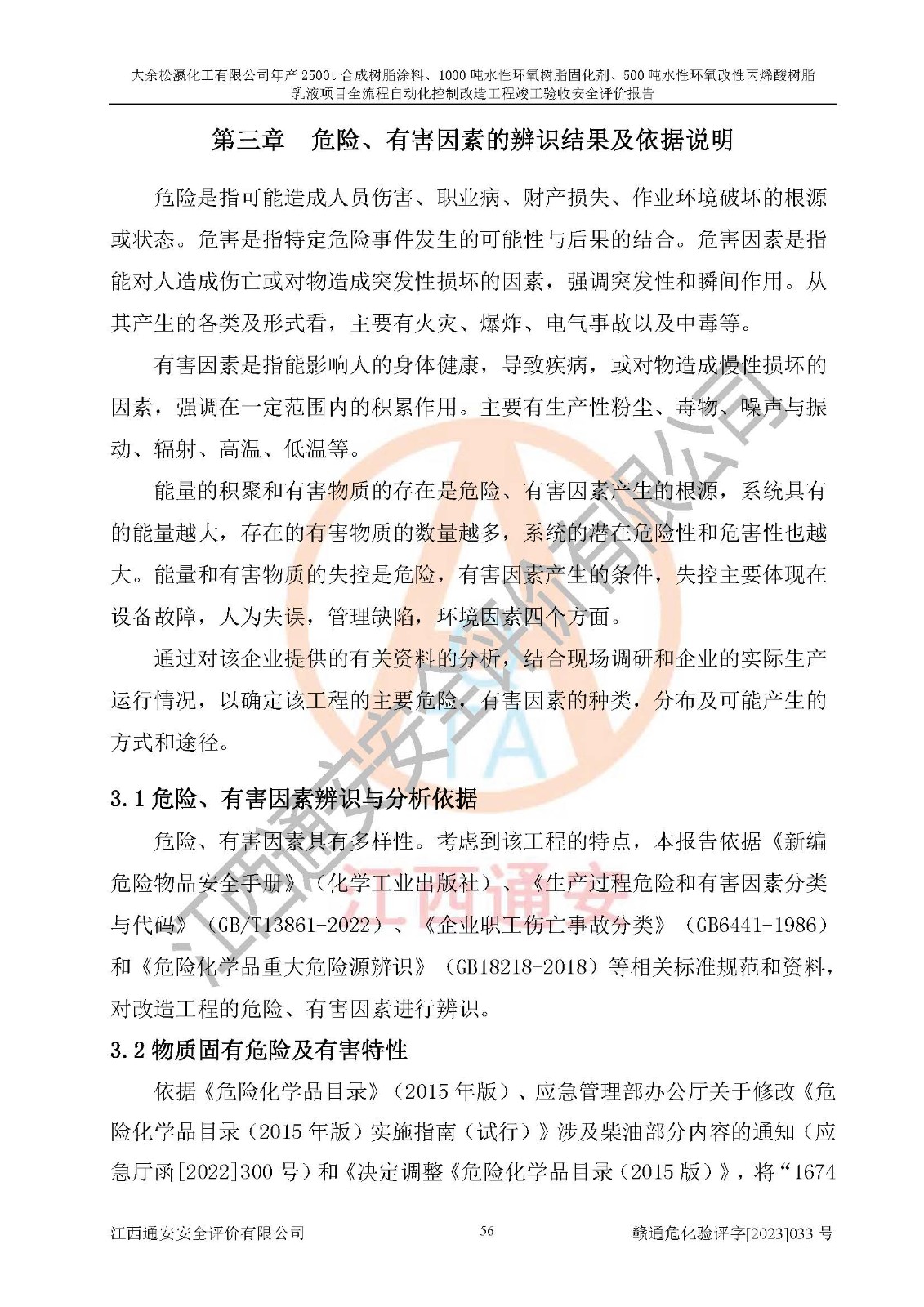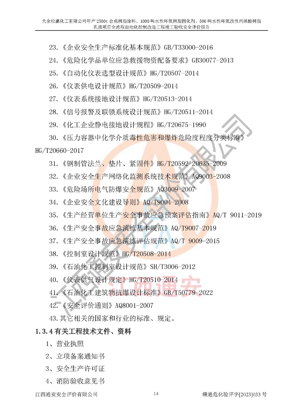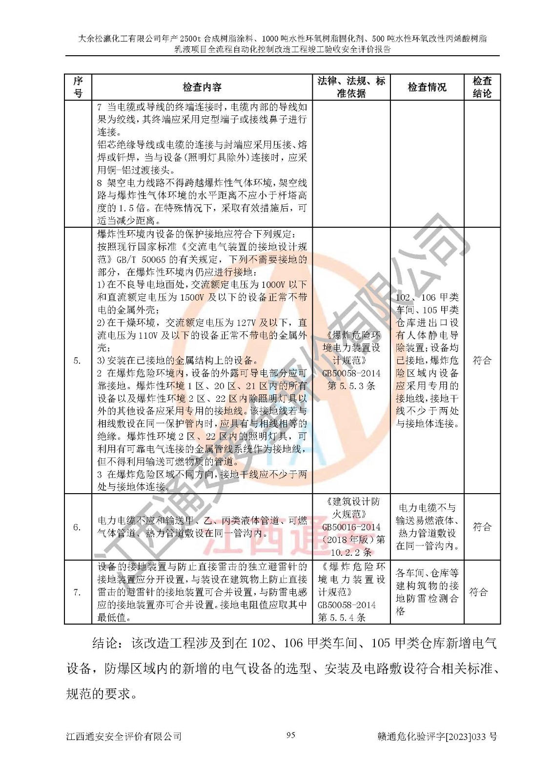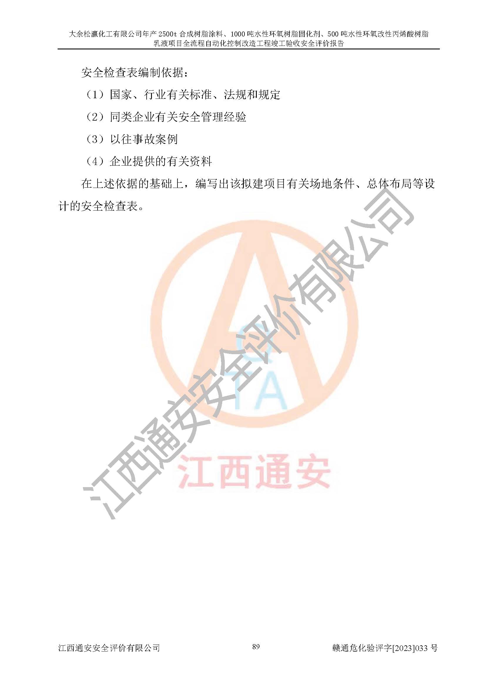 項目名稱 | 大余松瀛化工有限公司年產2500t合成樹脂涂料、1000噸水性環(huán)氧樹脂固化劑、500噸水性環(huán)氧改性丙烯酸樹脂乳液項目全流程自動化控制改造工程竣工驗收安全評價報告 | ||||