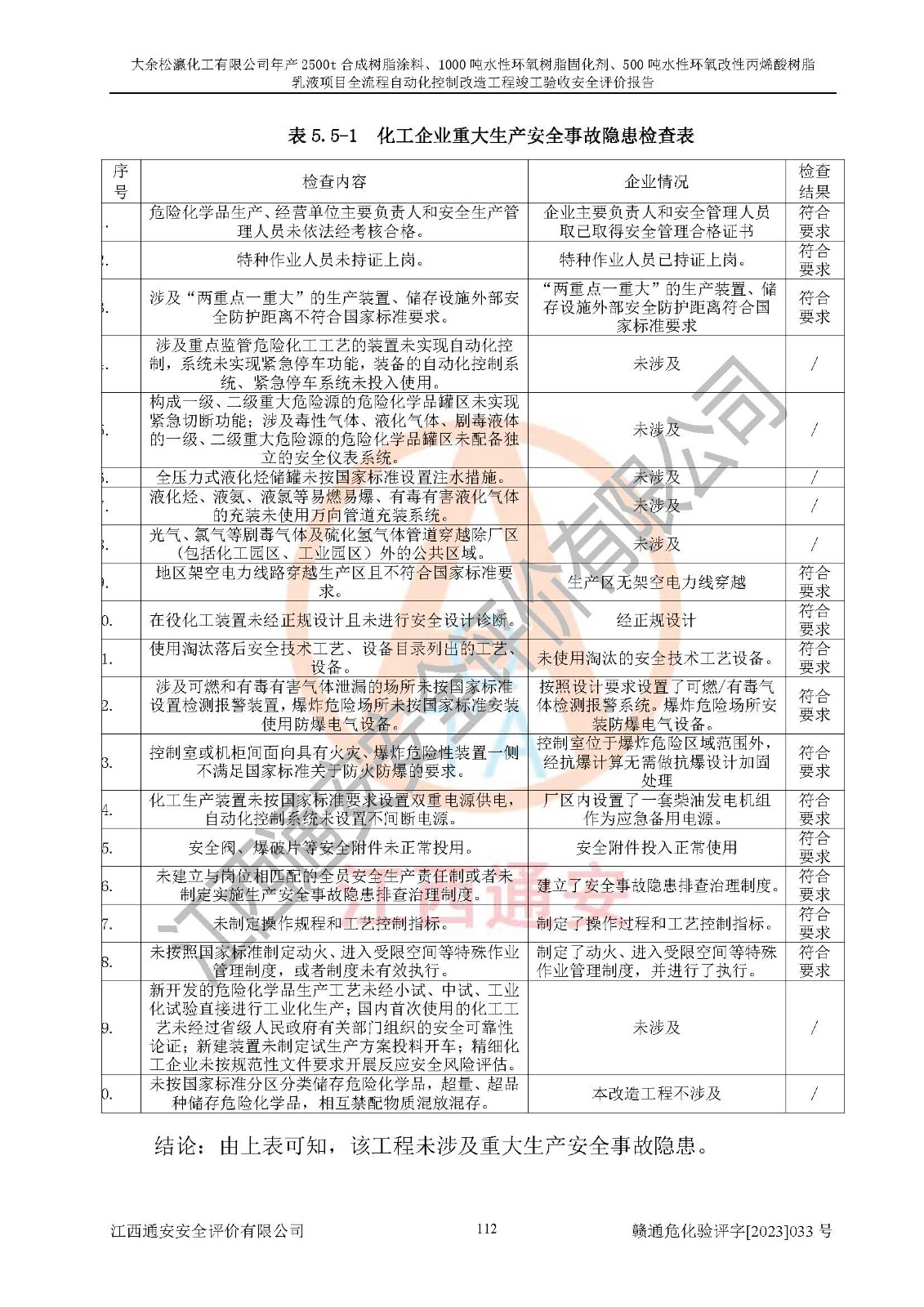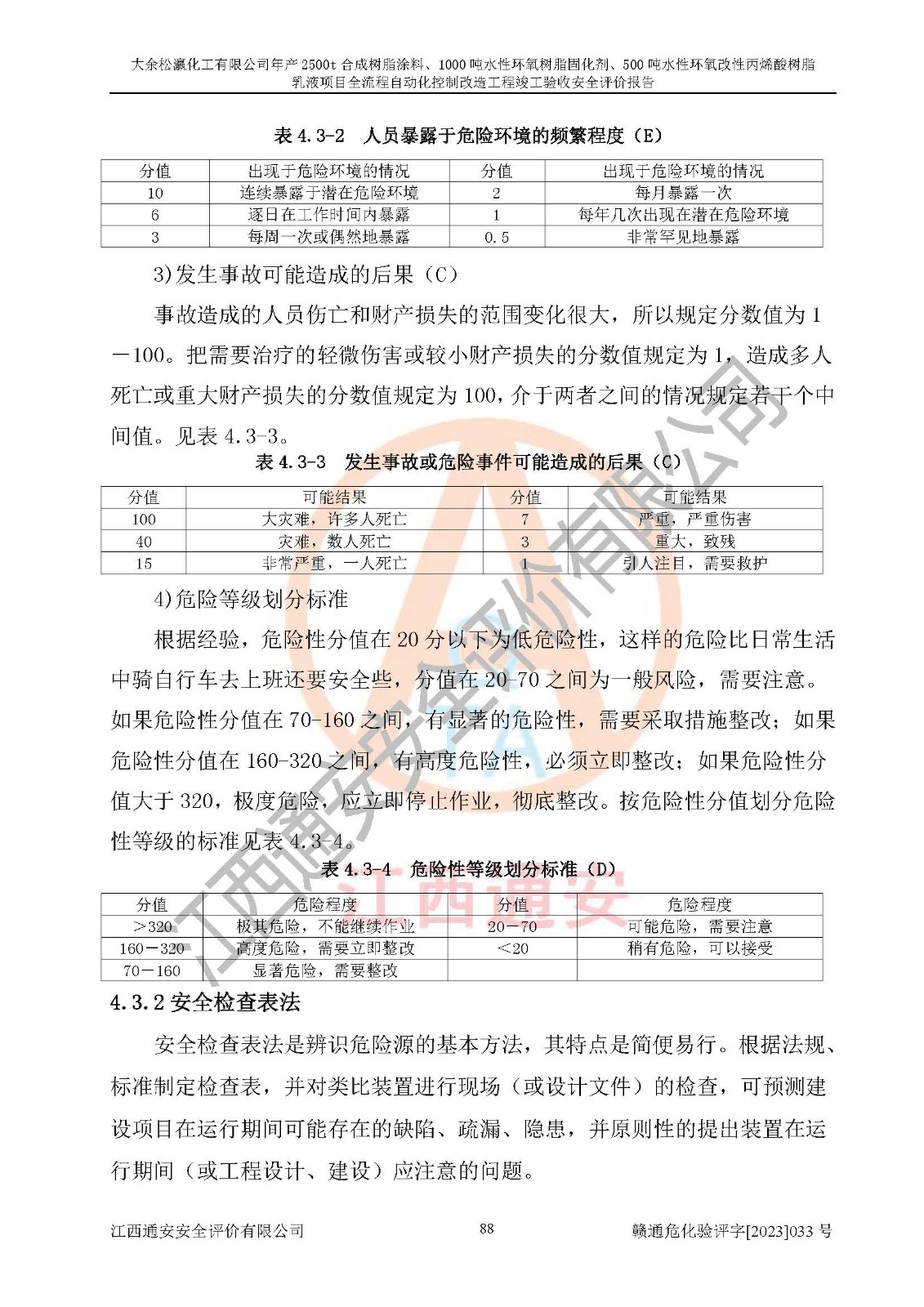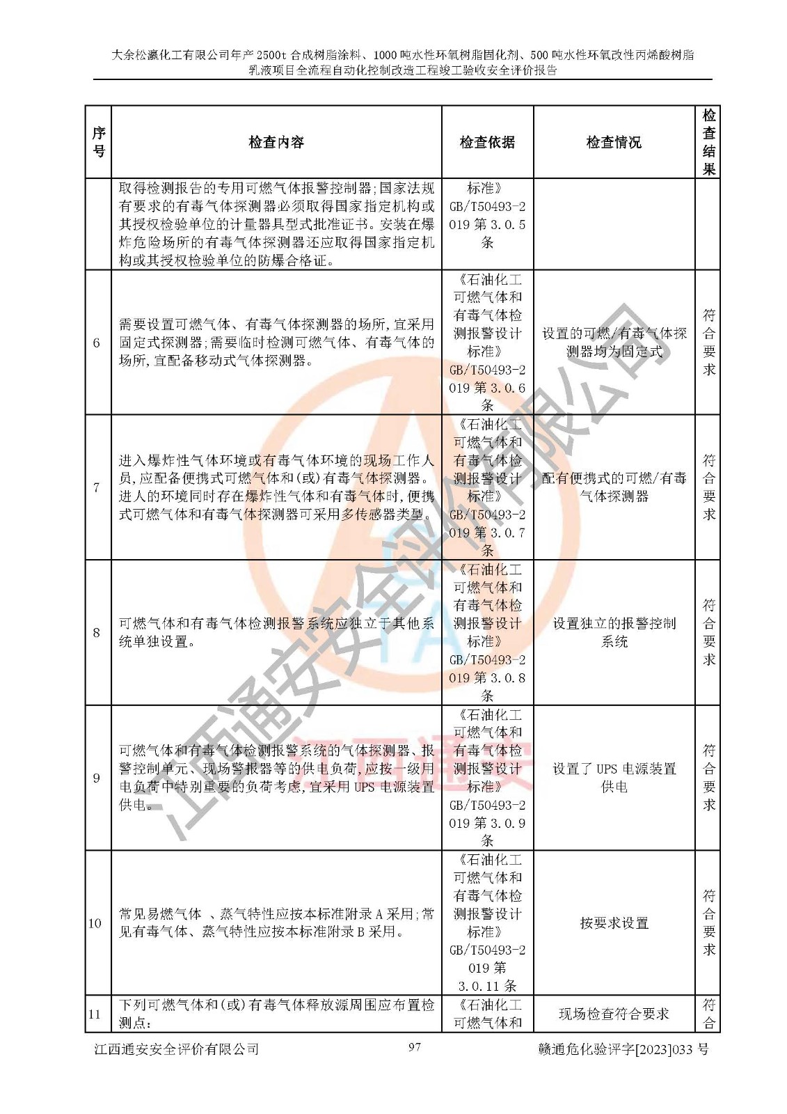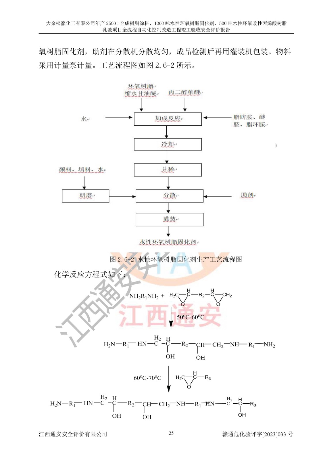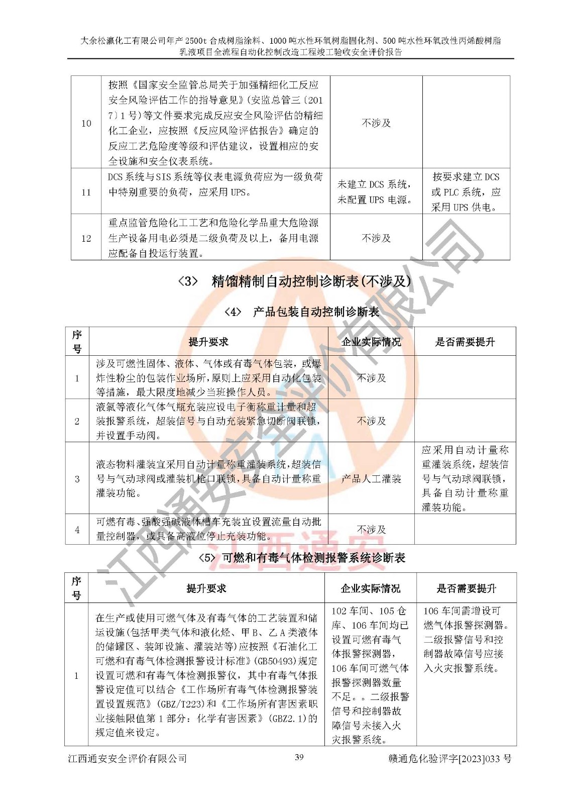 項目名稱 | 大余松瀛化工有限公司年產2500t合成樹脂涂料、1000噸水性環(huán)氧樹脂固化劑、500噸水性環(huán)氧改性丙烯酸樹脂乳液項目全流程自動化控制改造工程竣工驗收安全評價報告 | ||||