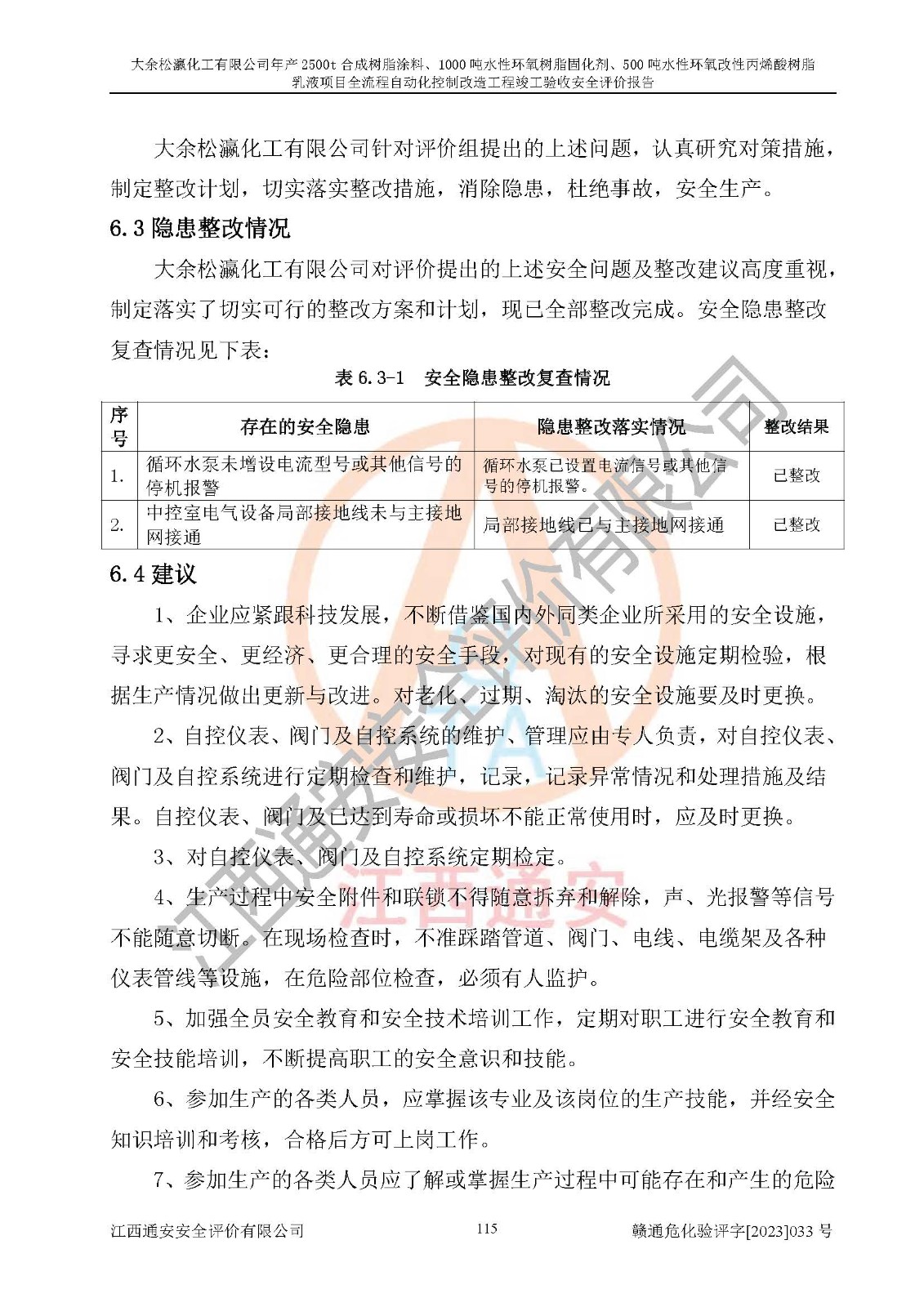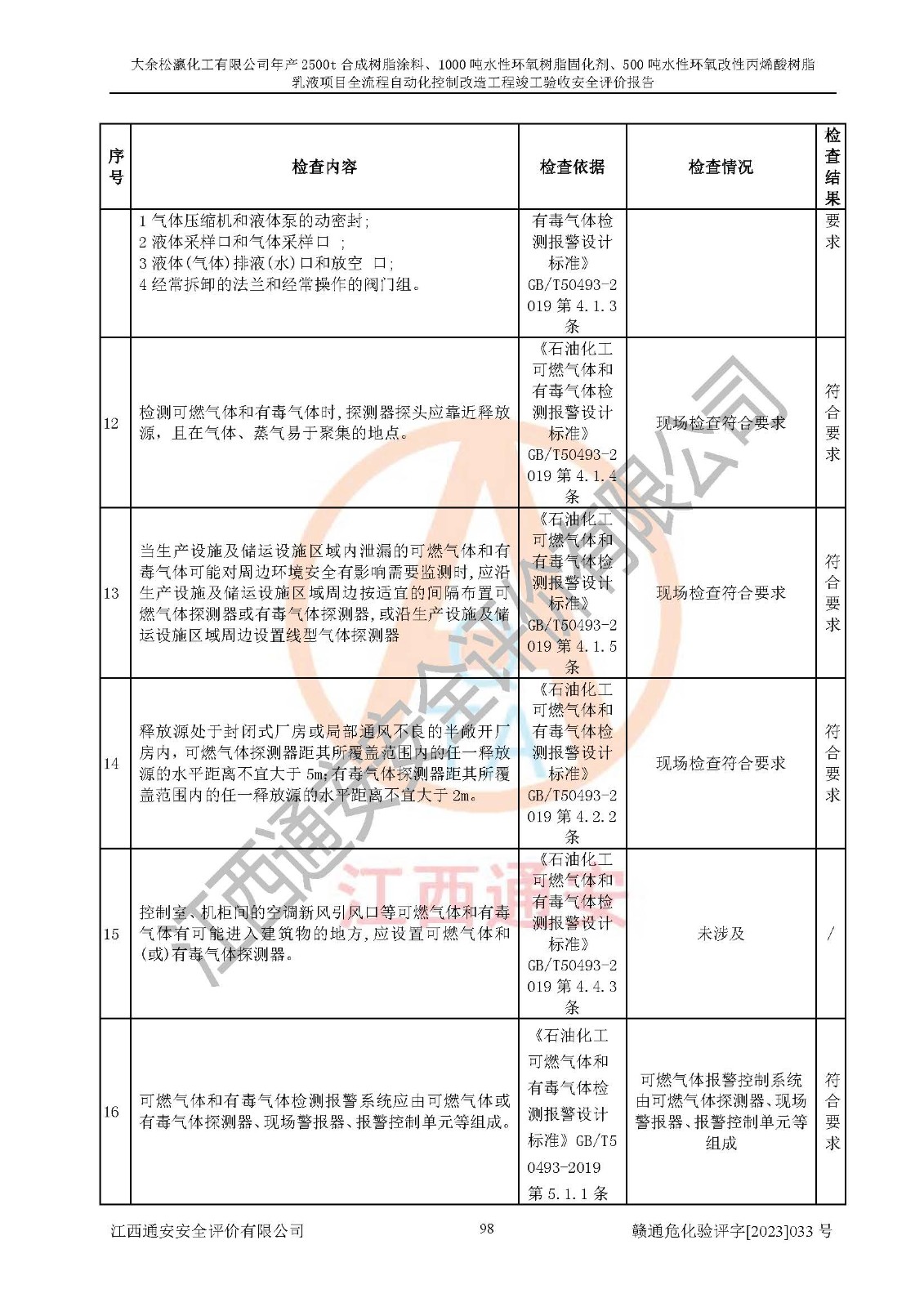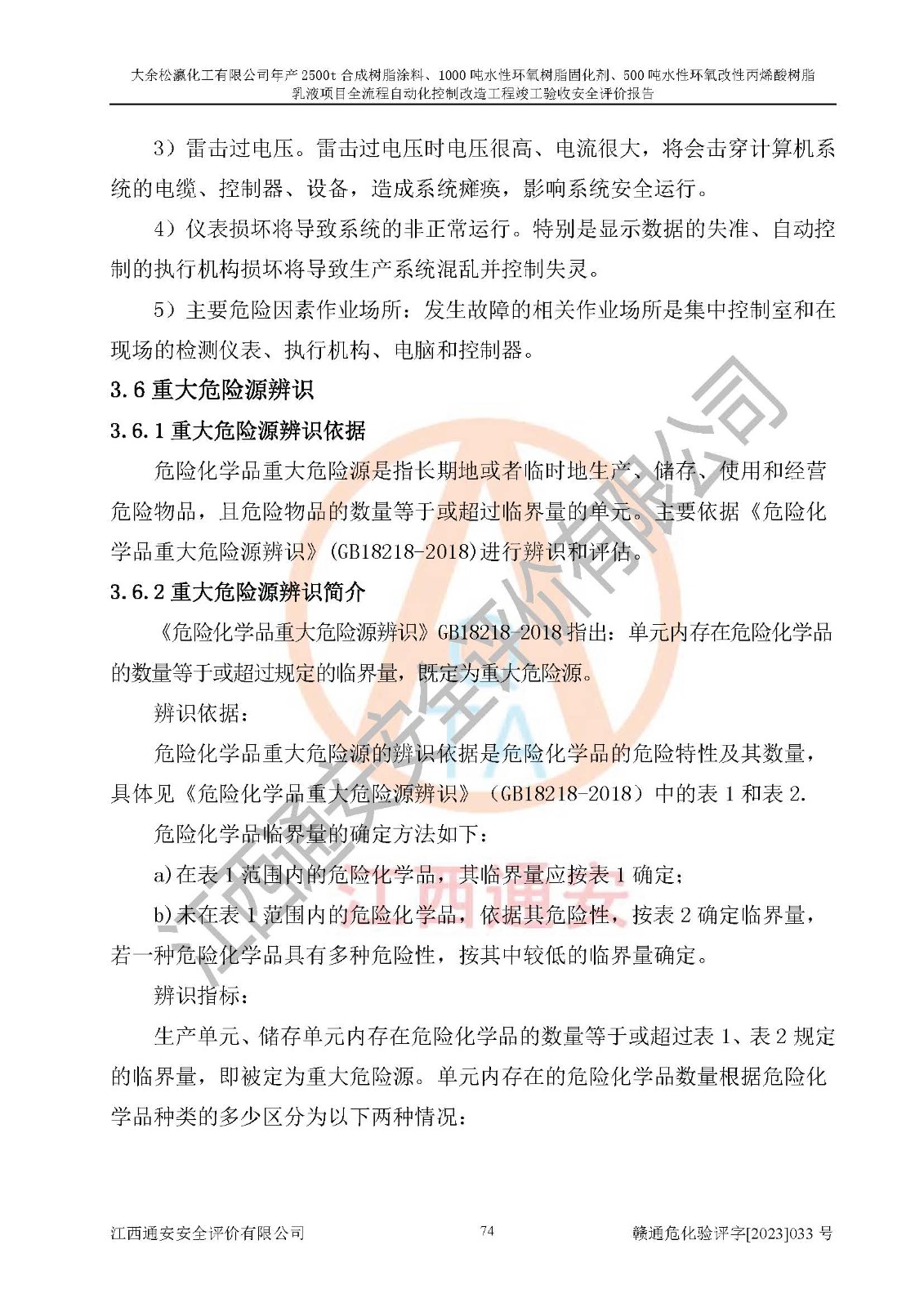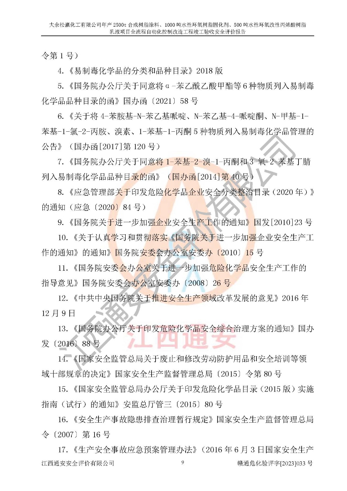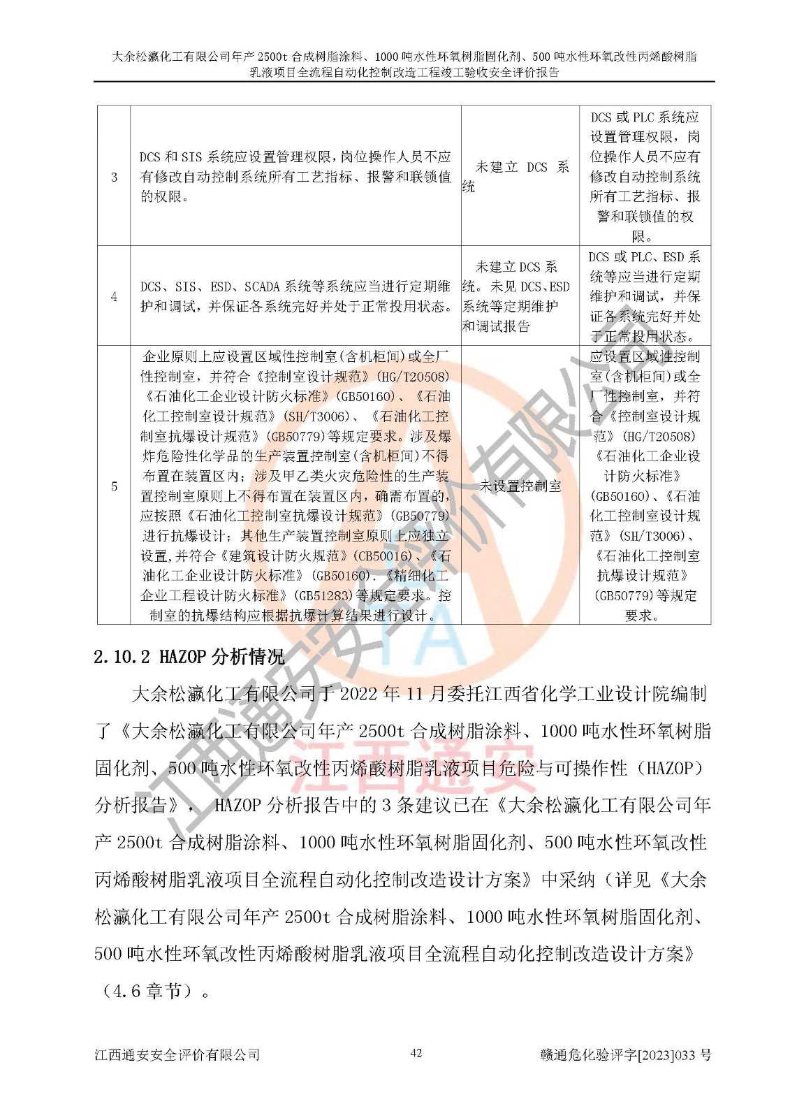 項目名稱 | 大余松瀛化工有限公司年產2500t合成樹脂涂料、1000噸水性環(huán)氧樹脂固化劑、500噸水性環(huán)氧改性丙烯酸樹脂乳液項目全流程自動化控制改造工程竣工驗收安全評價報告 | ||||