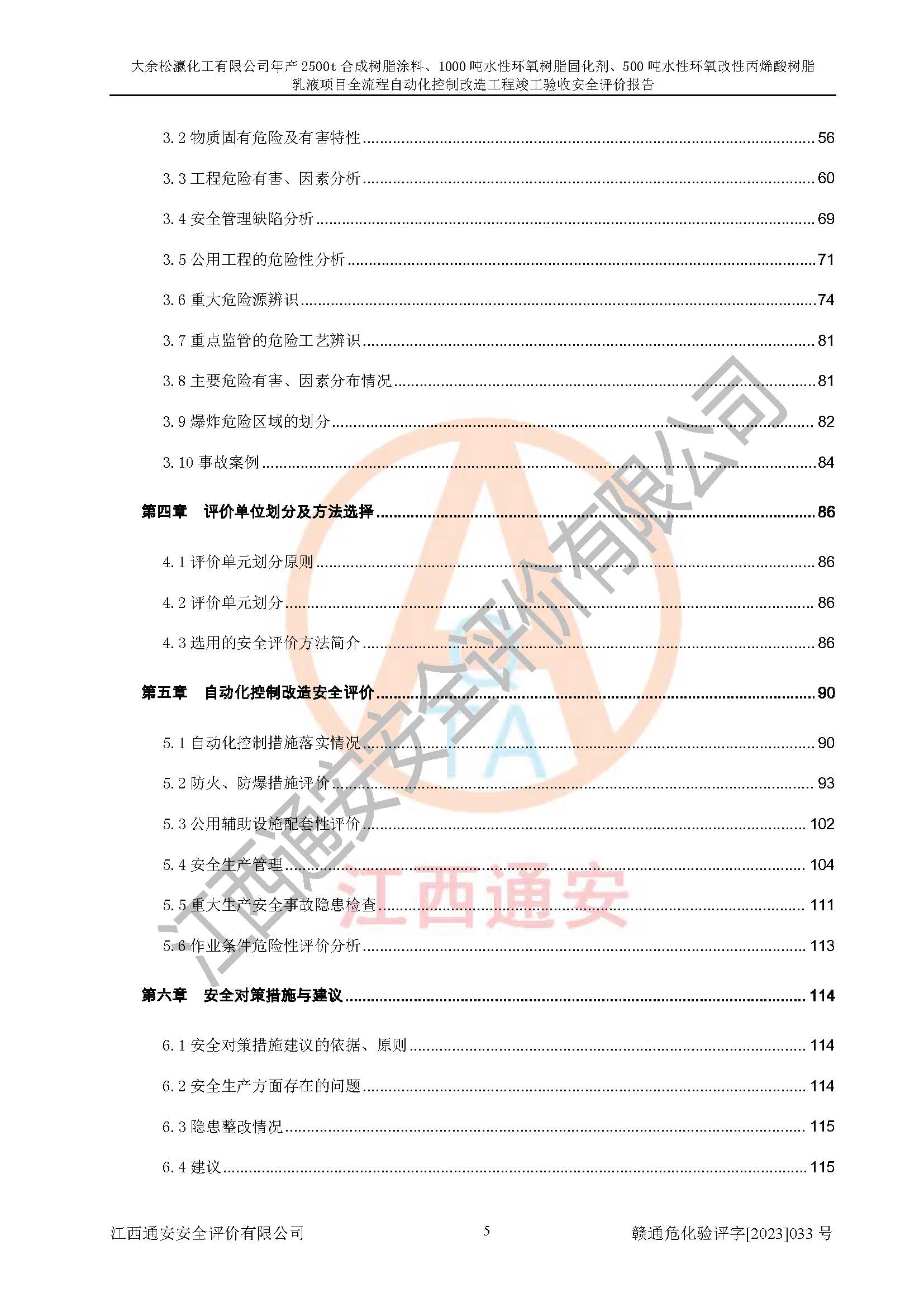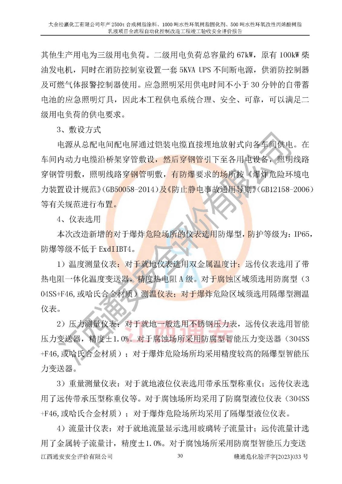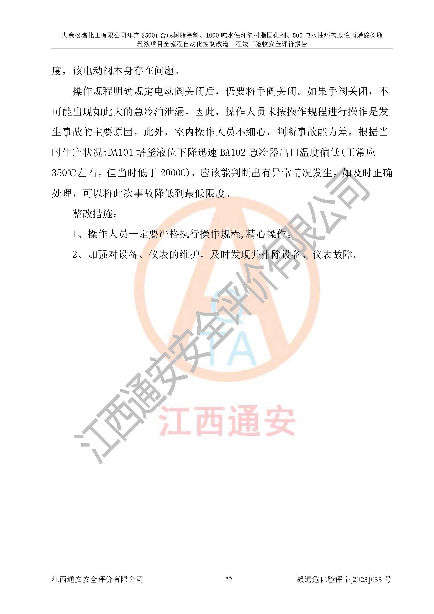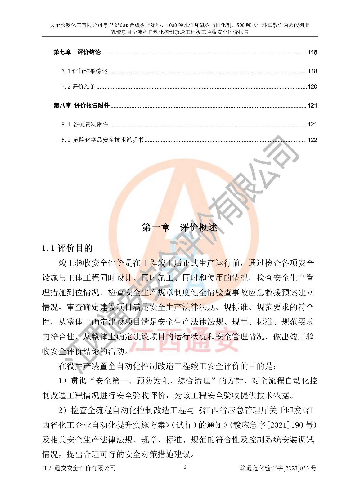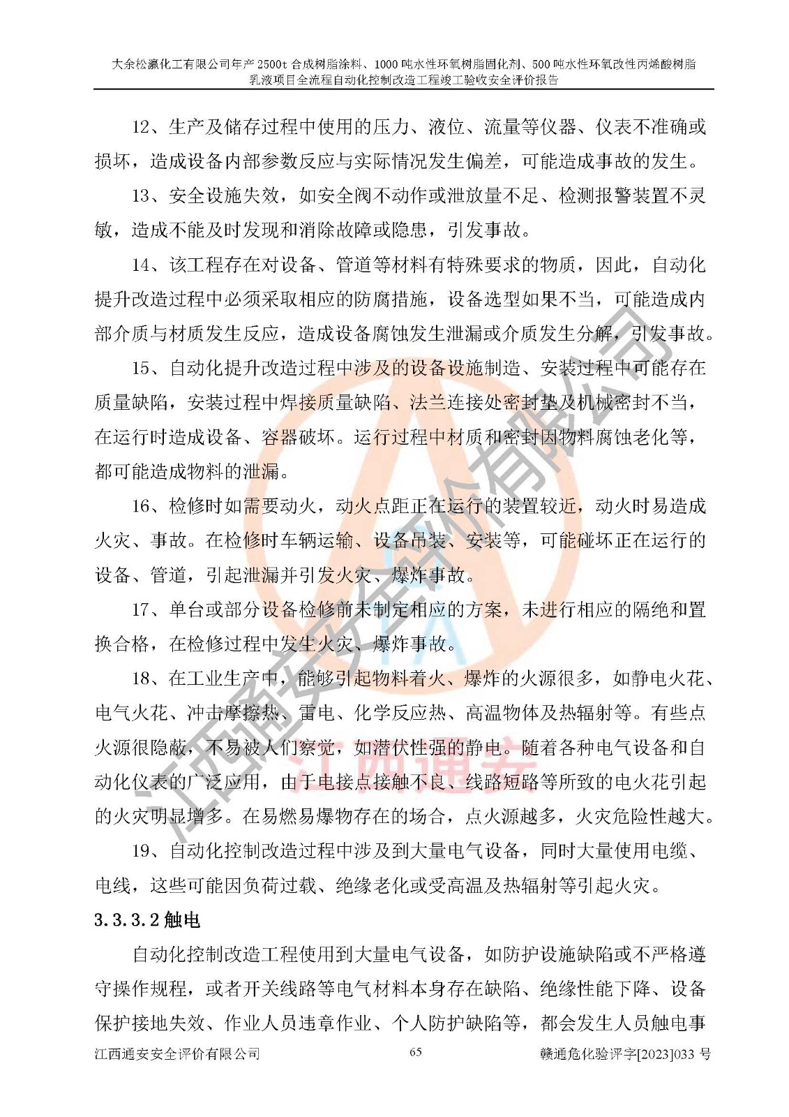 項目名稱 | 大余松瀛化工有限公司年產2500t合成樹脂涂料、1000噸水性環(huán)氧樹脂固化劑、500噸水性環(huán)氧改性丙烯酸樹脂乳液項目全流程自動化控制改造工程竣工驗收安全評價報告 | ||||