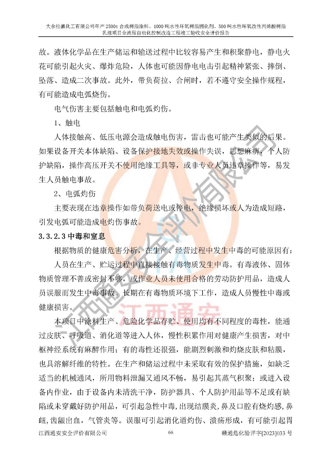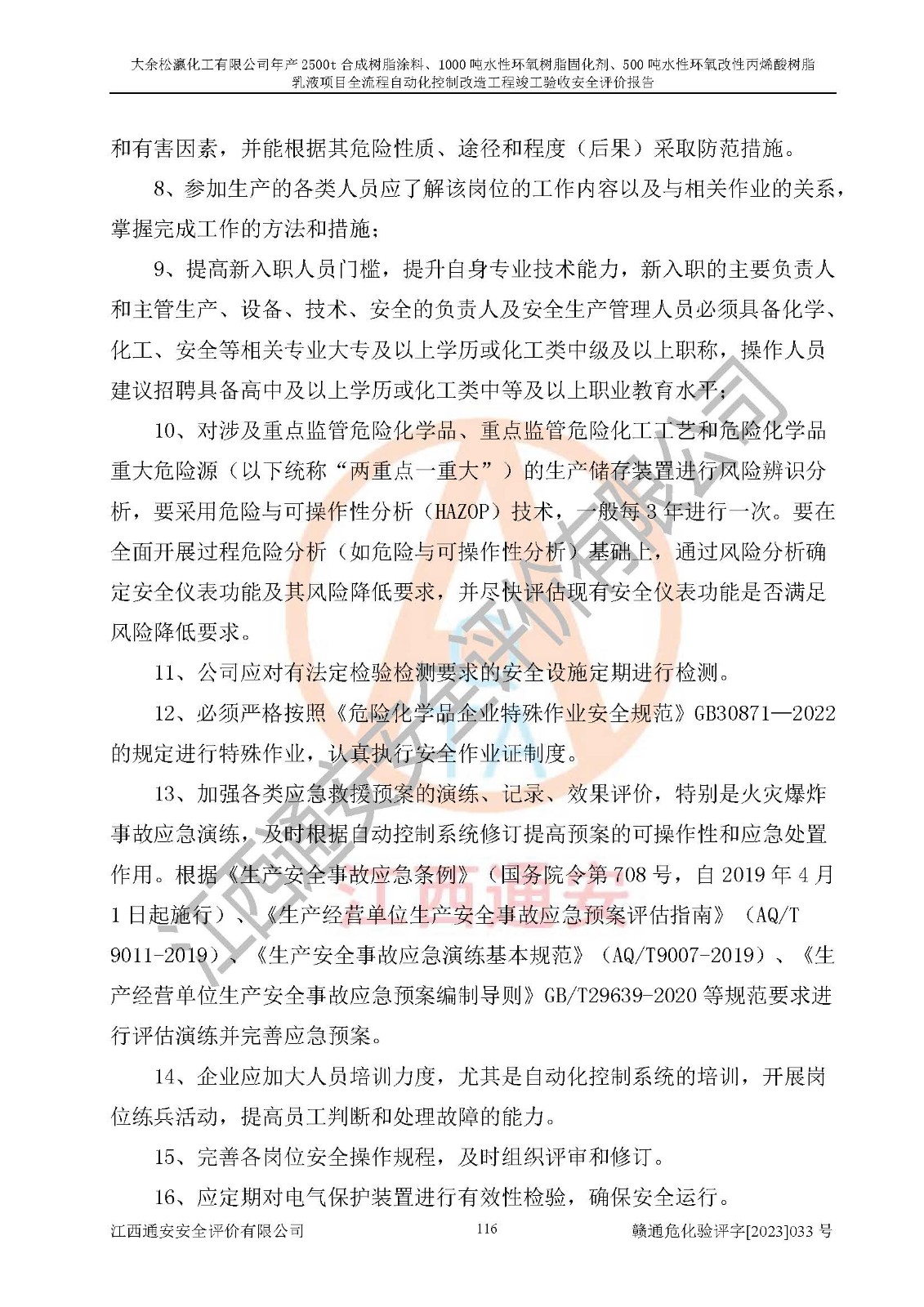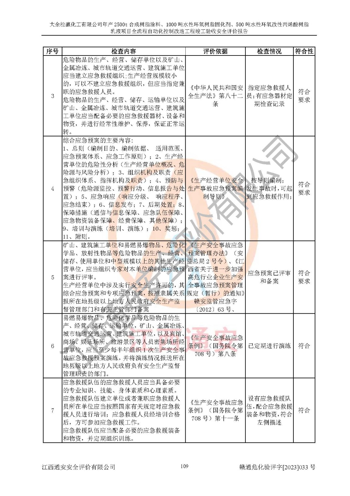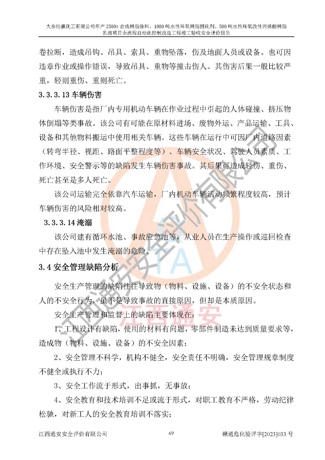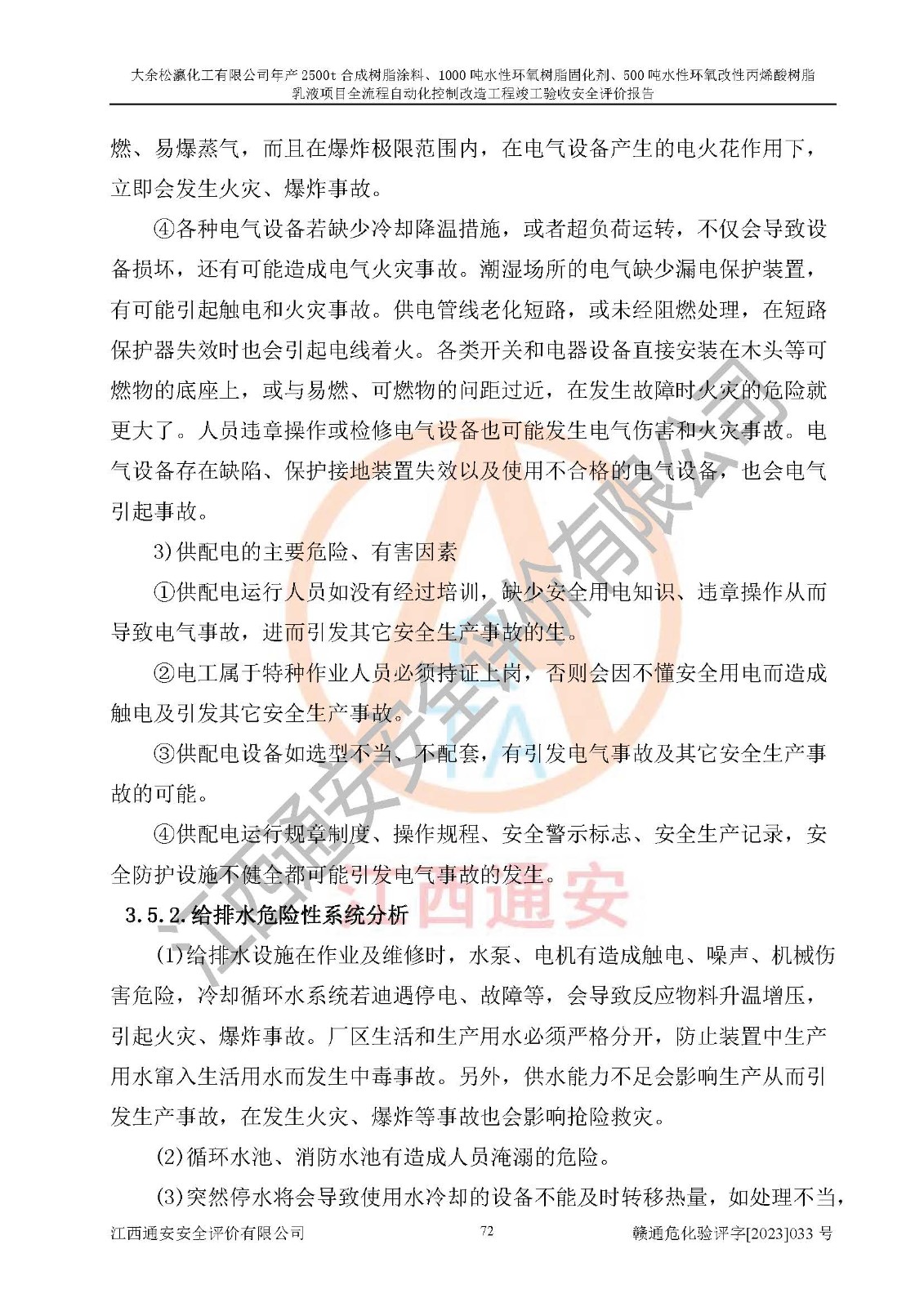 項目名稱 | 大余松瀛化工有限公司年產2500t合成樹脂涂料、1000噸水性環(huán)氧樹脂固化劑、500噸水性環(huán)氧改性丙烯酸樹脂乳液項目全流程自動化控制改造工程竣工驗收安全評價報告 | ||||