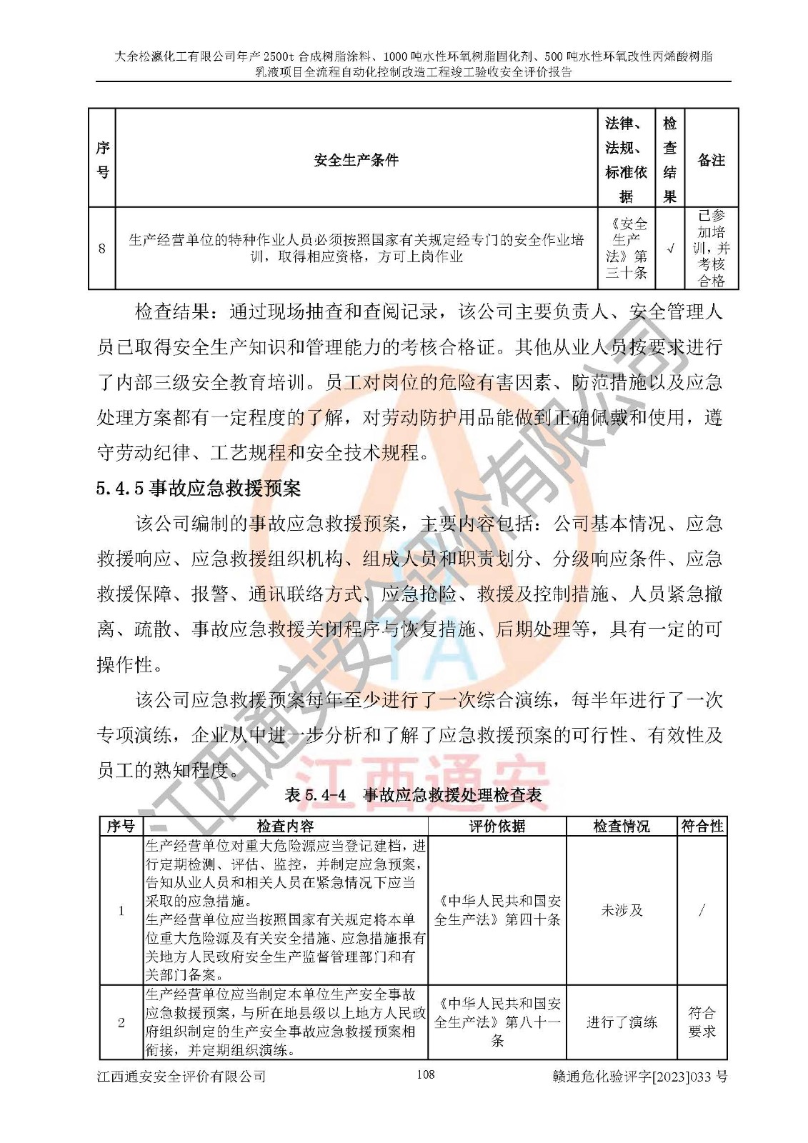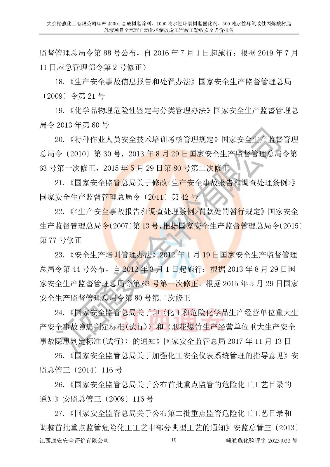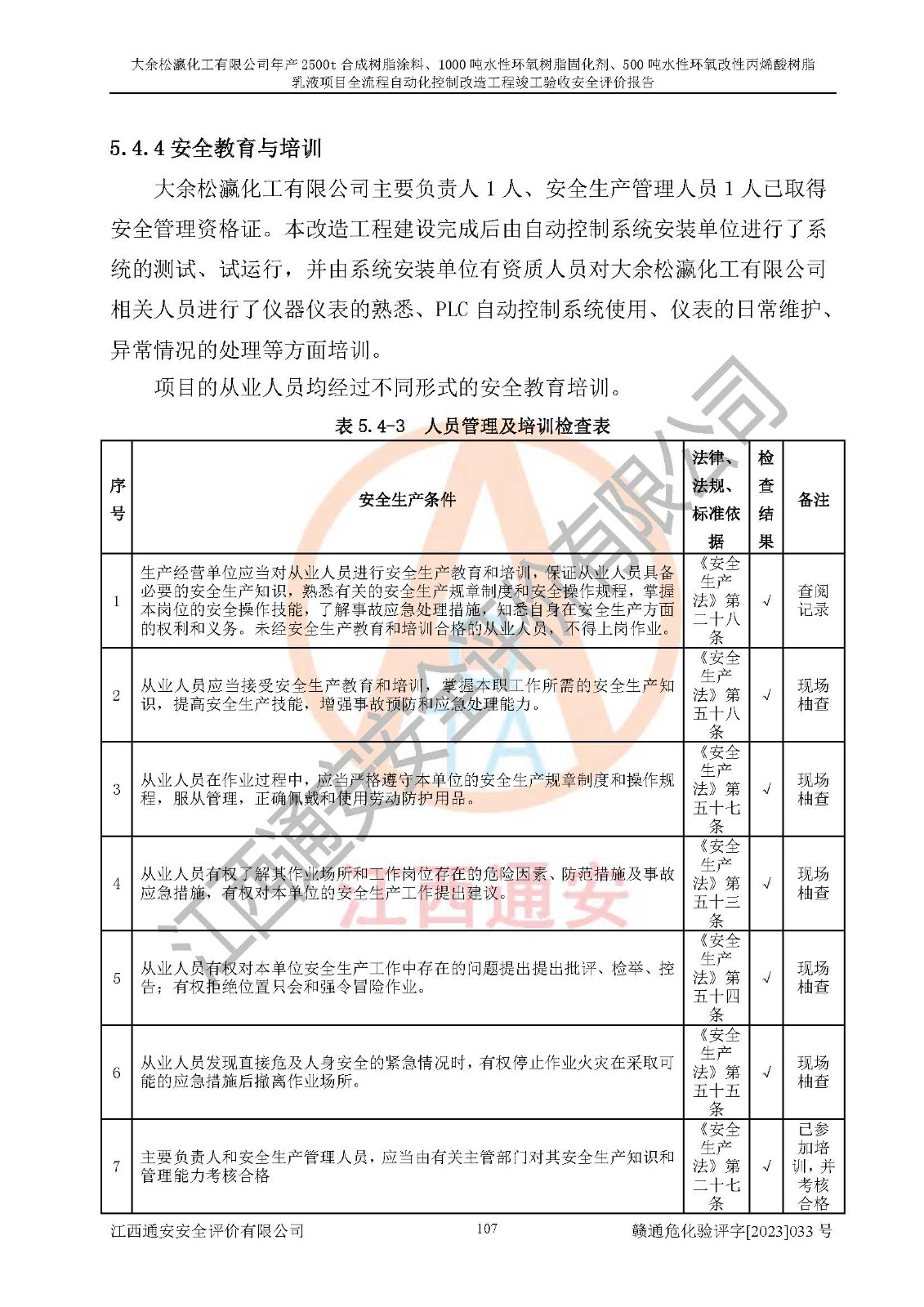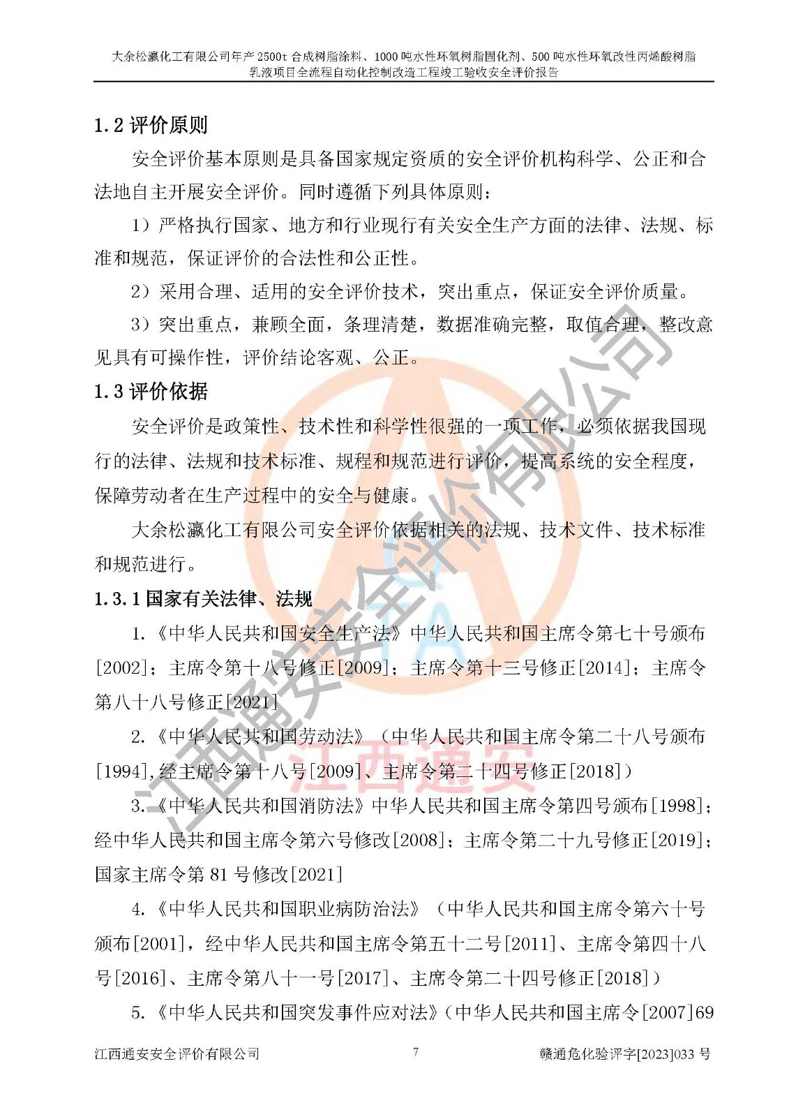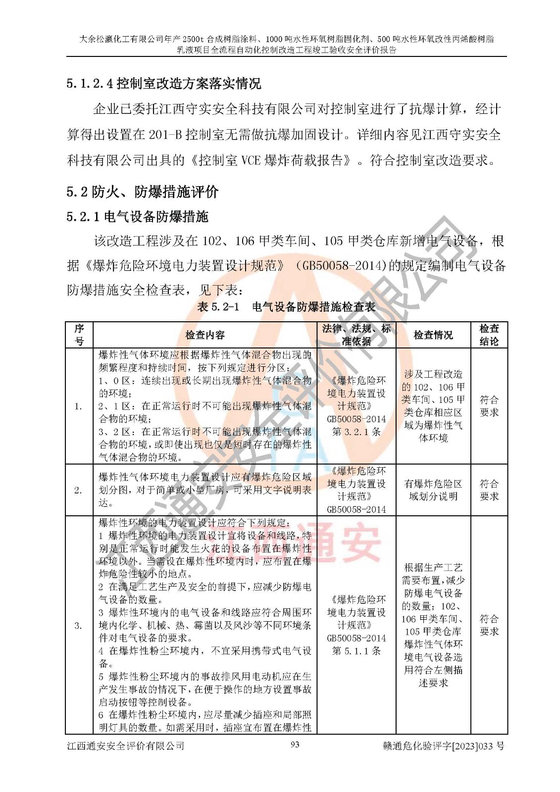項目名稱 | 大余松瀛化工有限公司年產2500t合成樹脂涂料、1000噸水性環(huán)氧樹脂固化劑、500噸水性環(huán)氧改性丙烯酸樹脂乳液項目全流程自動化控制改造工程竣工驗收安全評價報告 | ||||