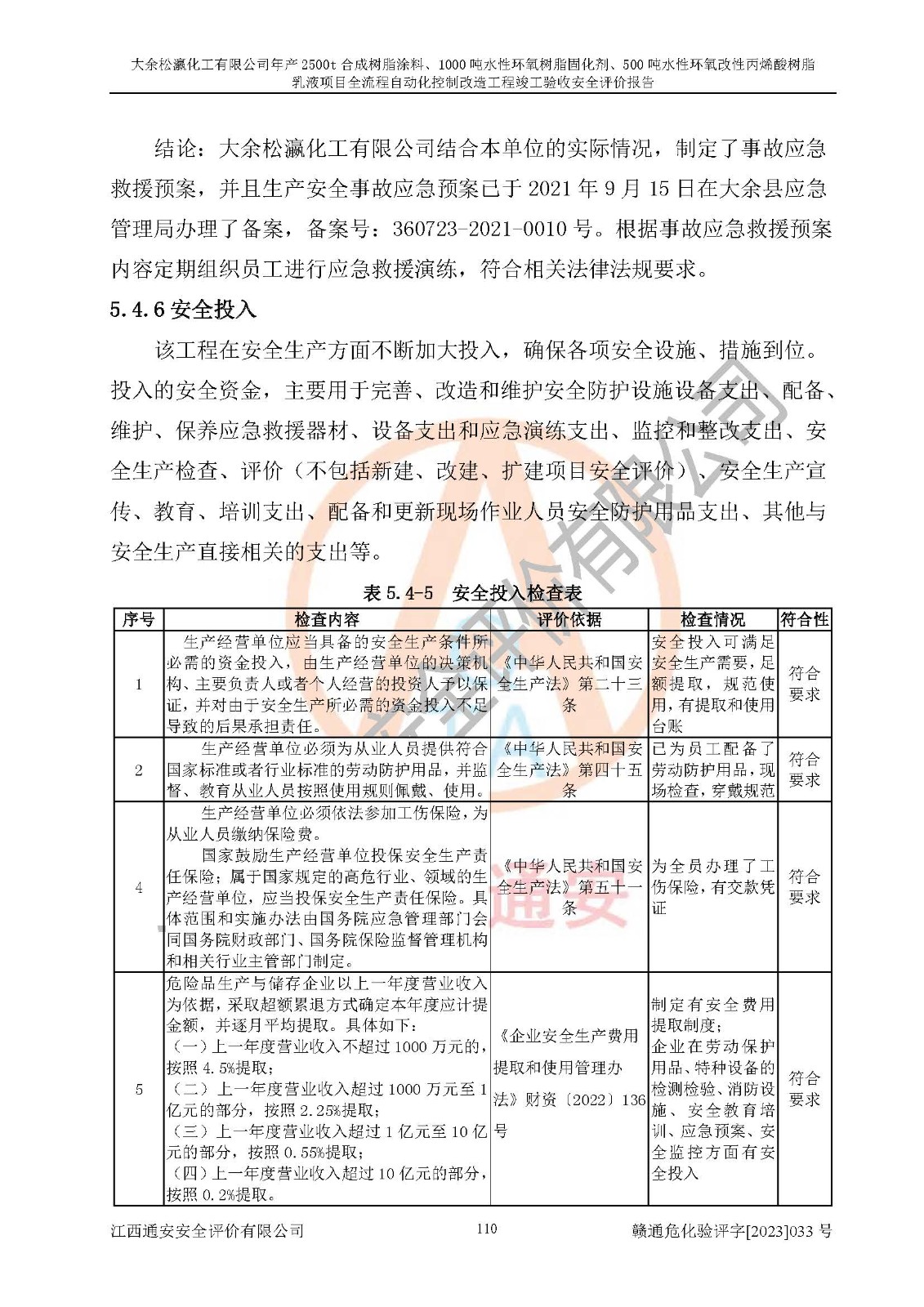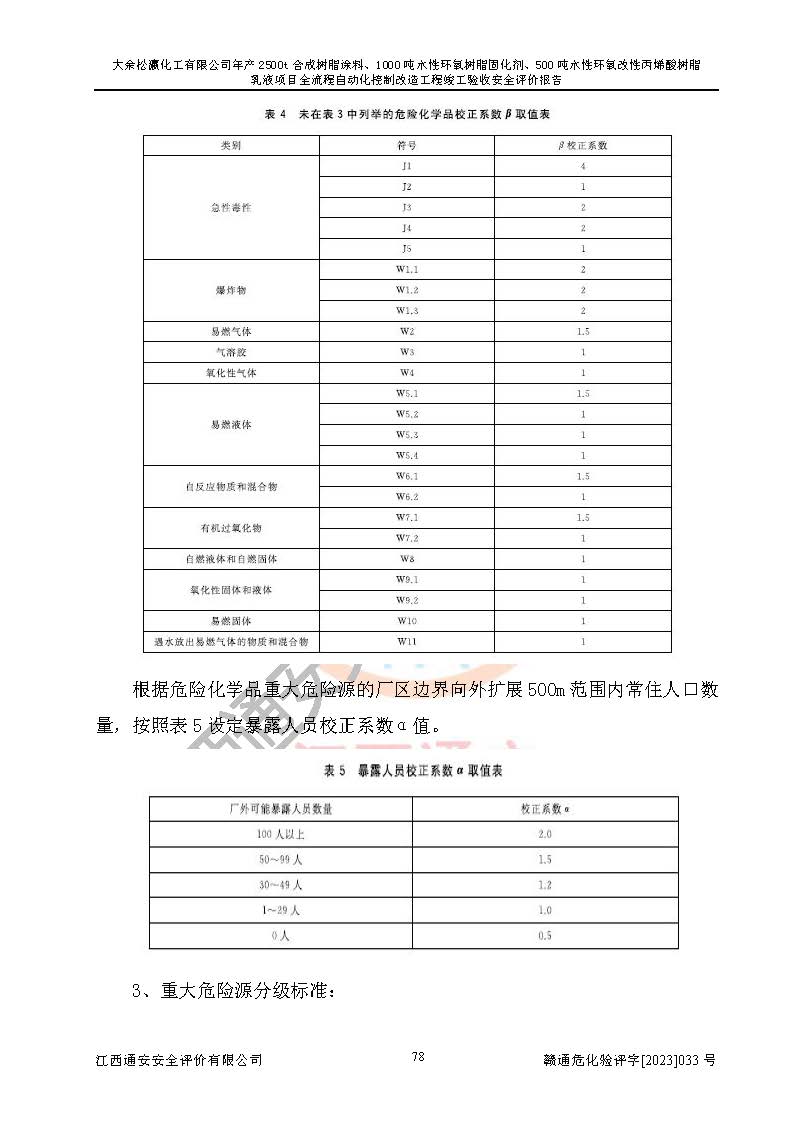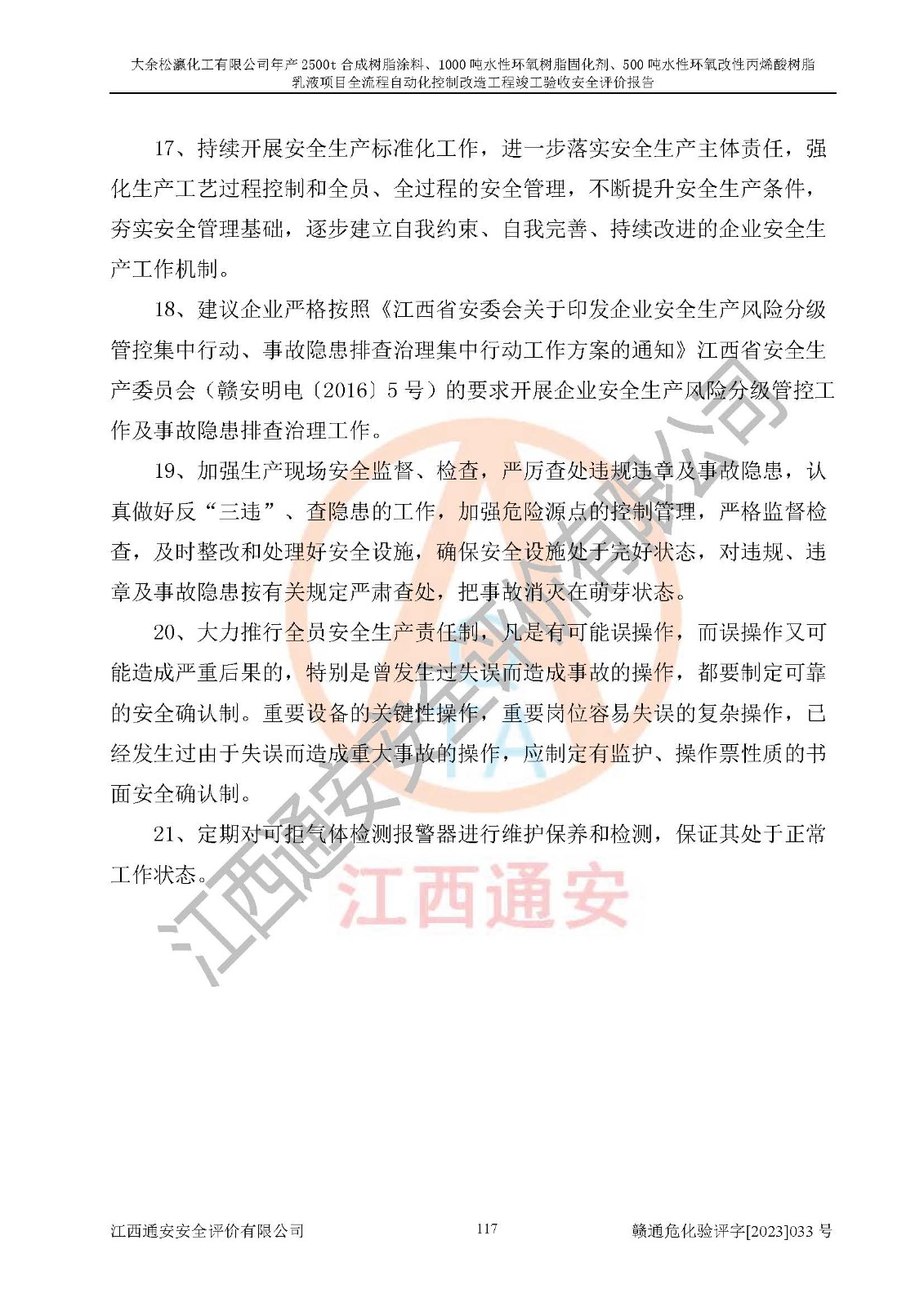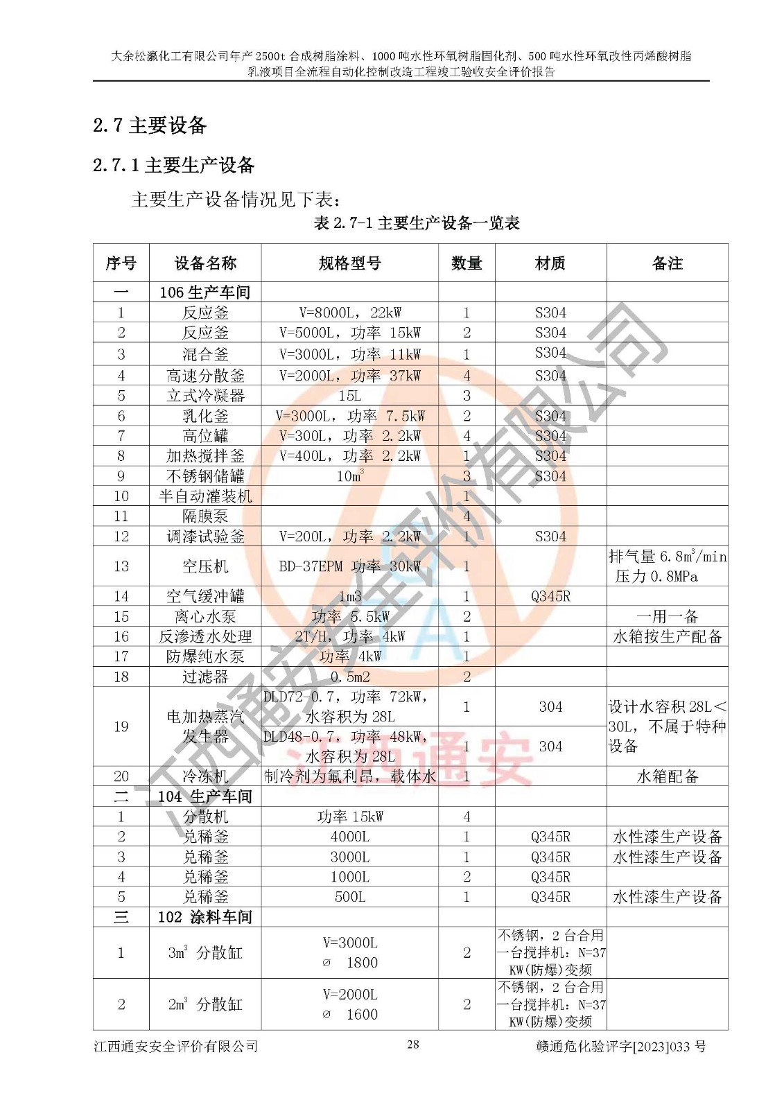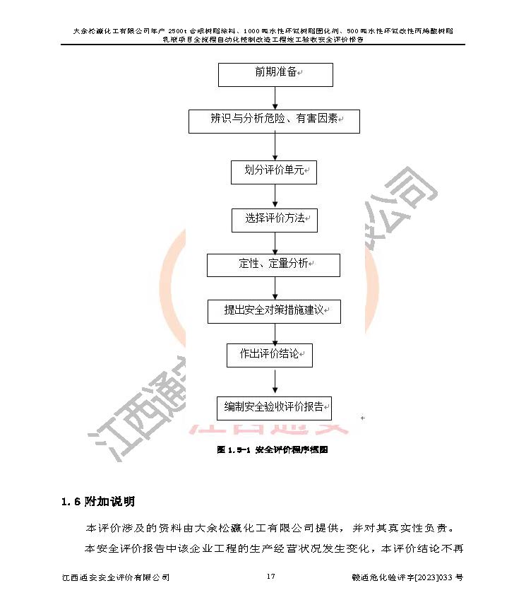 項目名稱 | 大余松瀛化工有限公司年產2500t合成樹脂涂料、1000噸水性環(huán)氧樹脂固化劑、500噸水性環(huán)氧改性丙烯酸樹脂乳液項目全流程自動化控制改造工程竣工驗收安全評價報告 | ||||