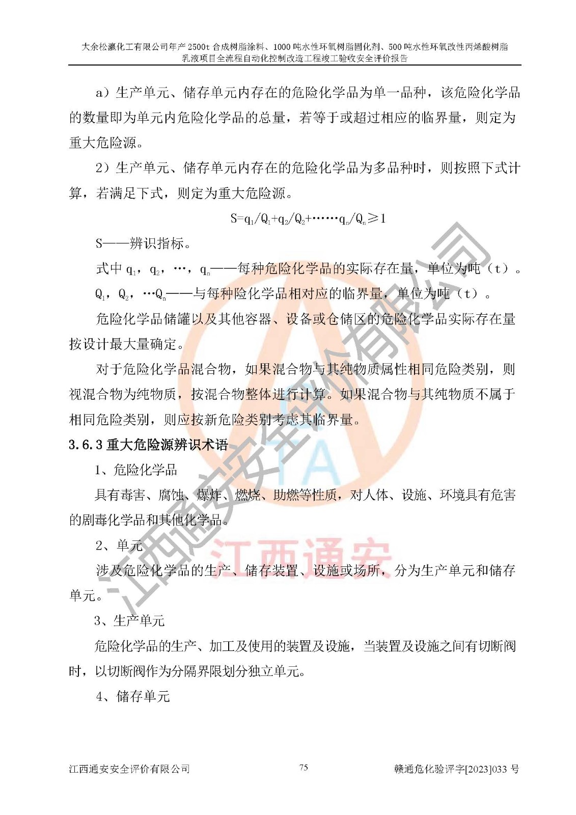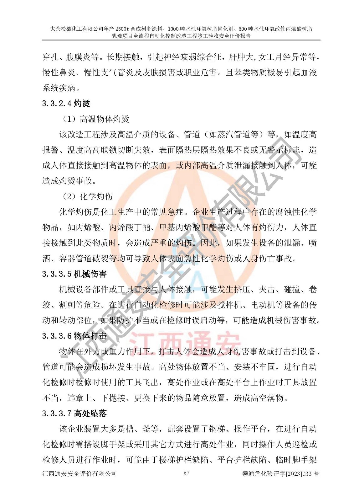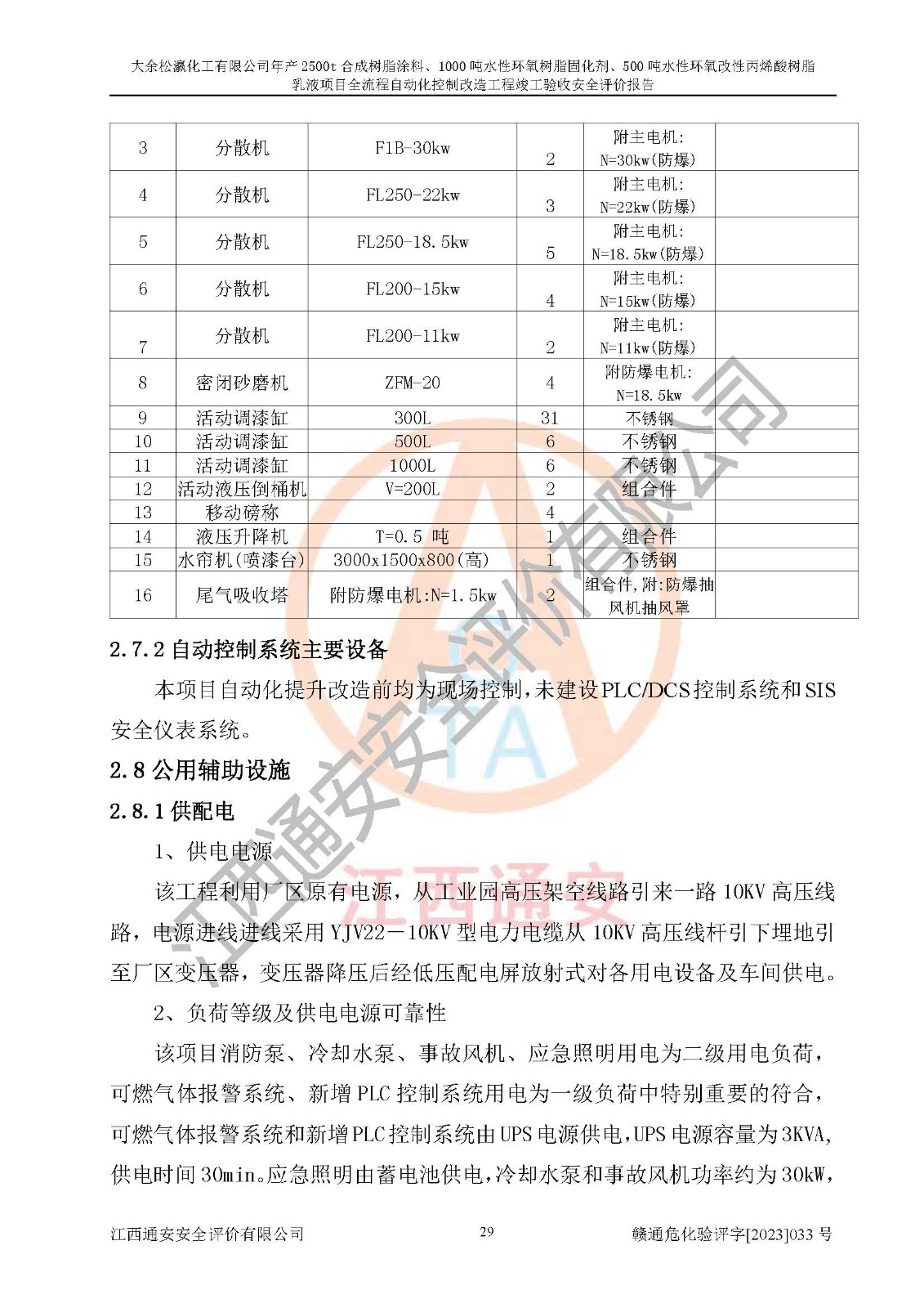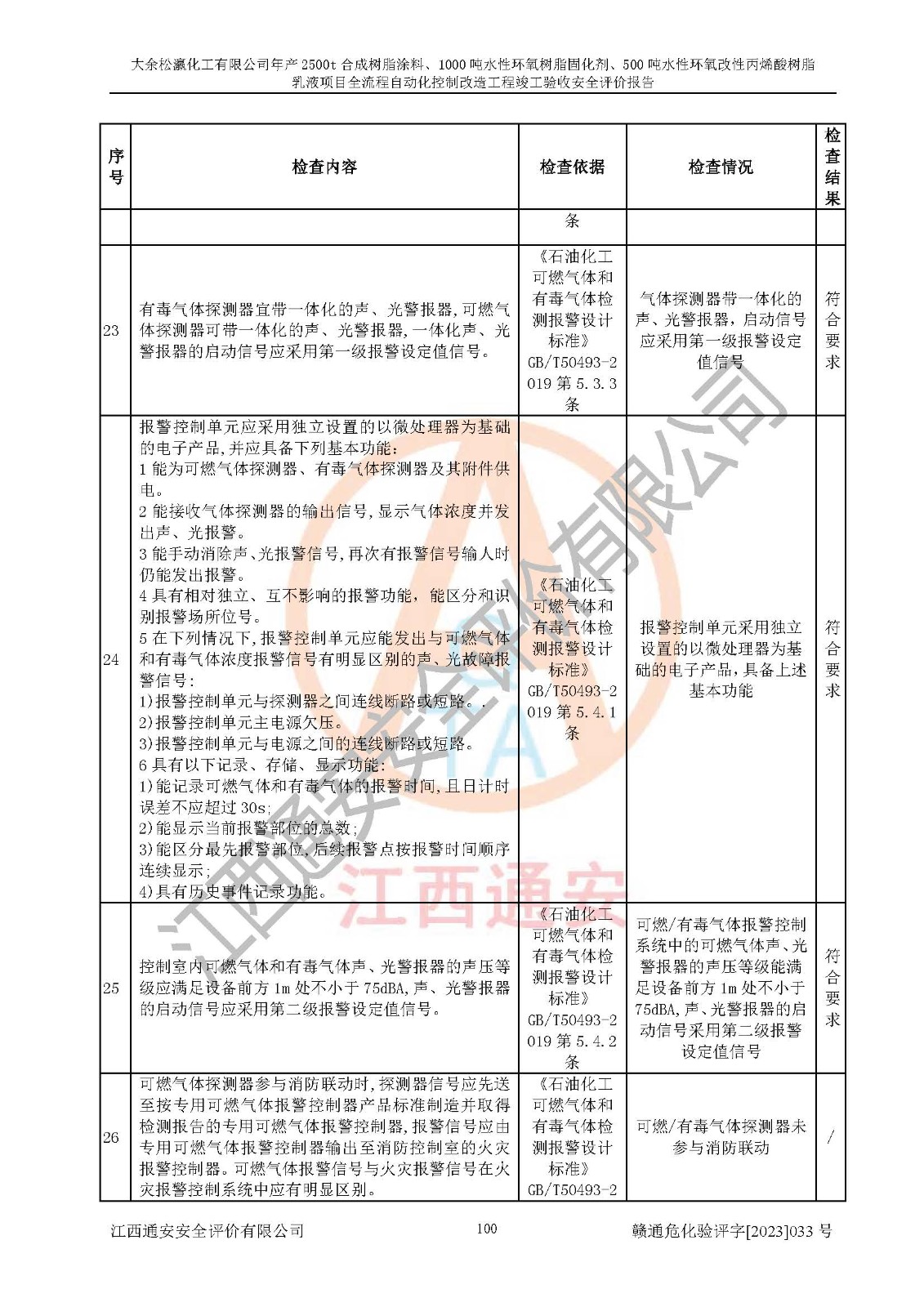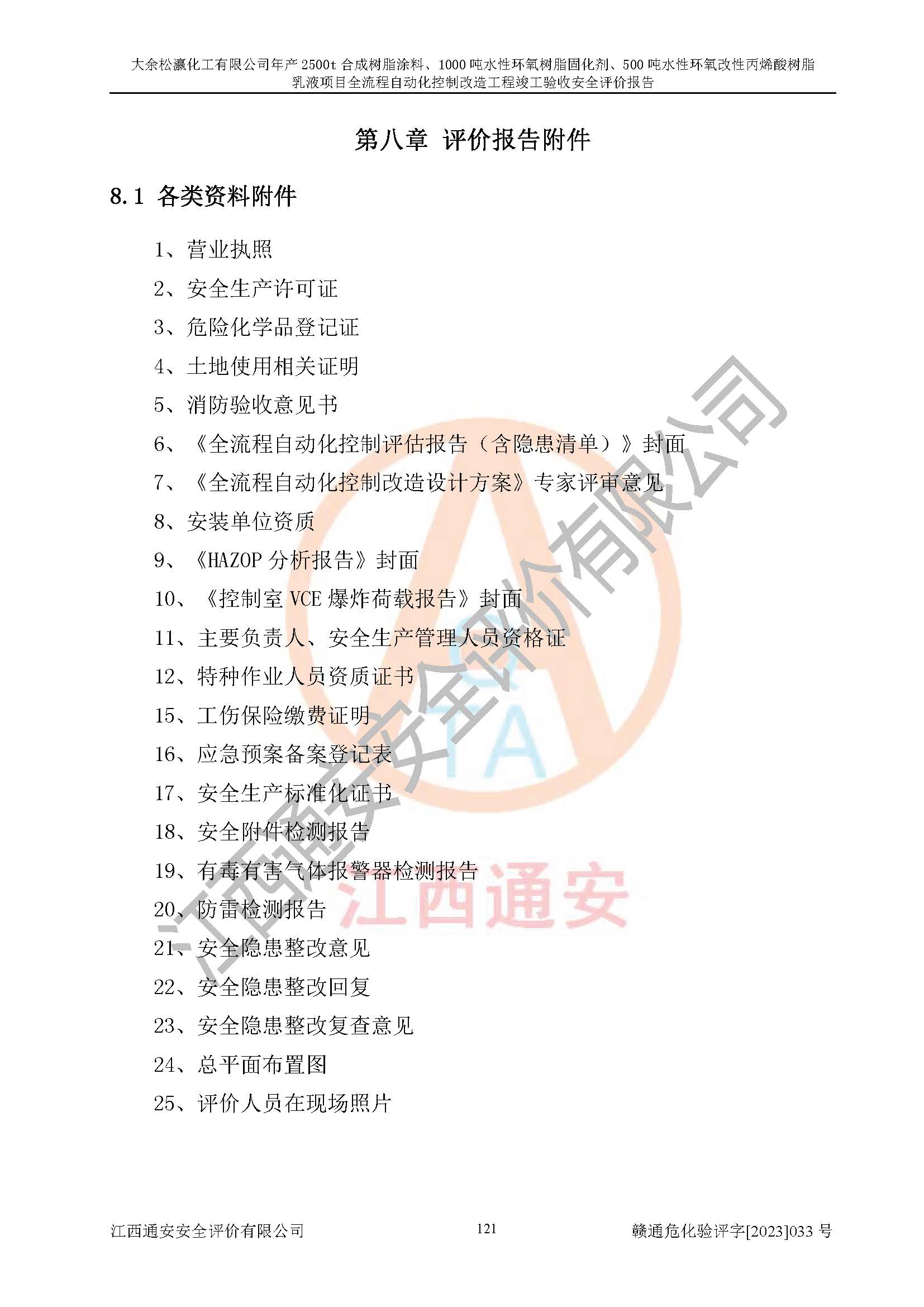 項目名稱 | 大余松瀛化工有限公司年產2500t合成樹脂涂料、1000噸水性環(huán)氧樹脂固化劑、500噸水性環(huán)氧改性丙烯酸樹脂乳液項目全流程自動化控制改造工程竣工驗收安全評價報告 | ||||