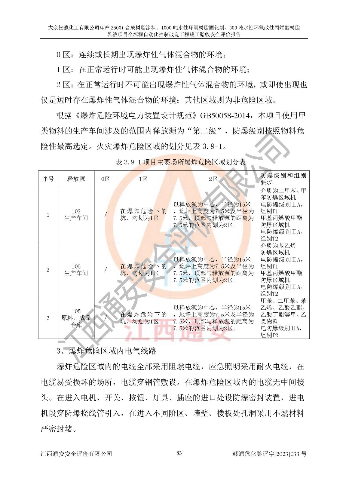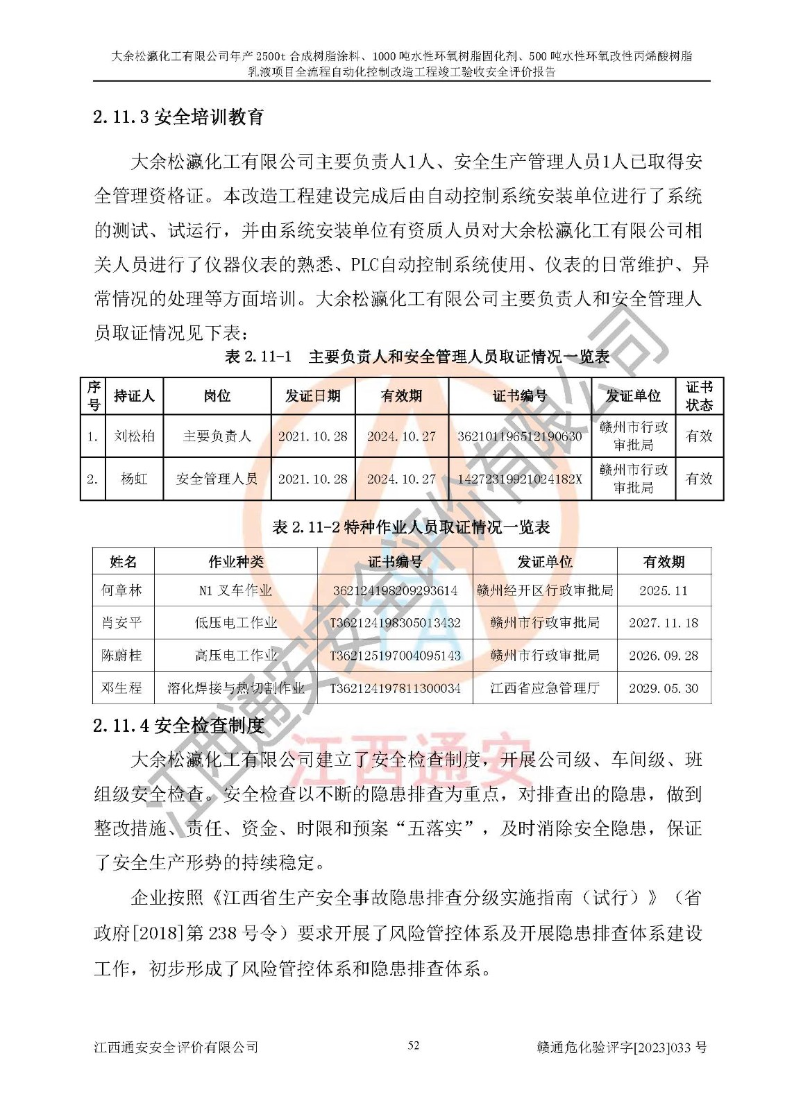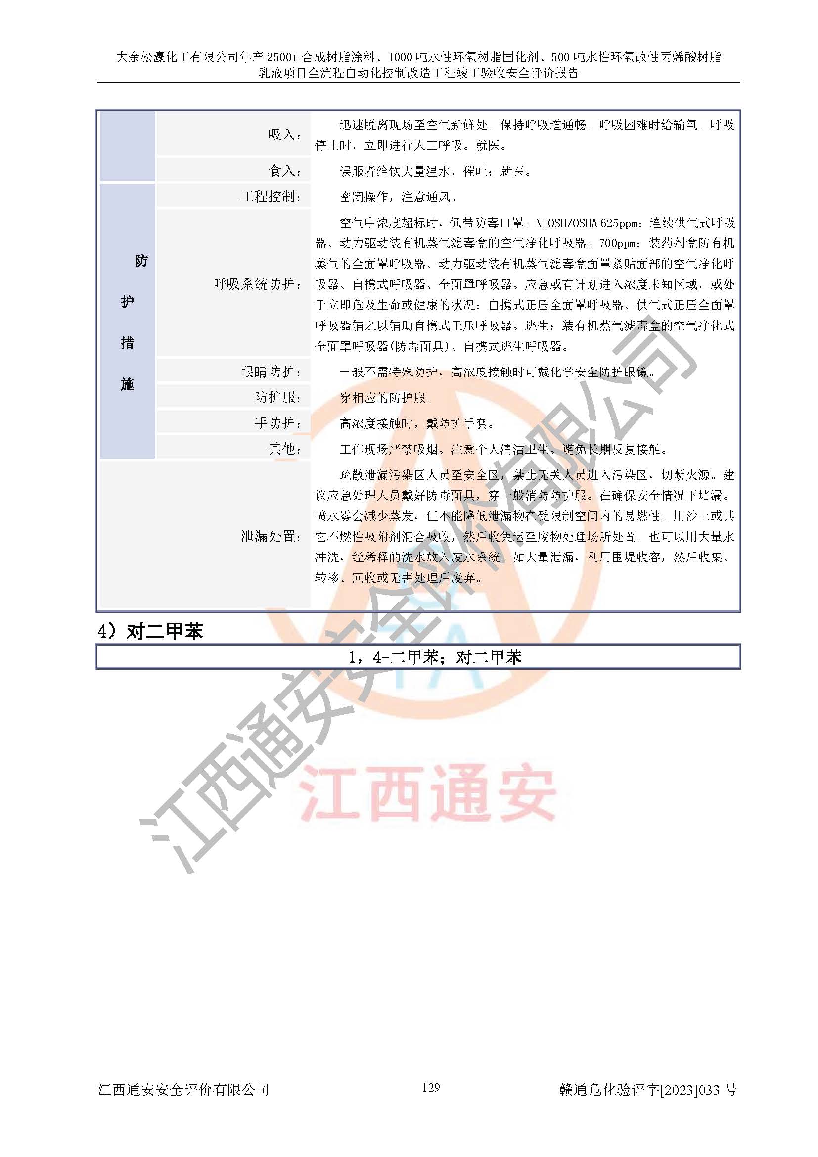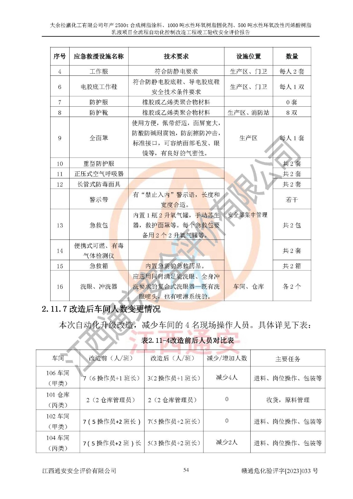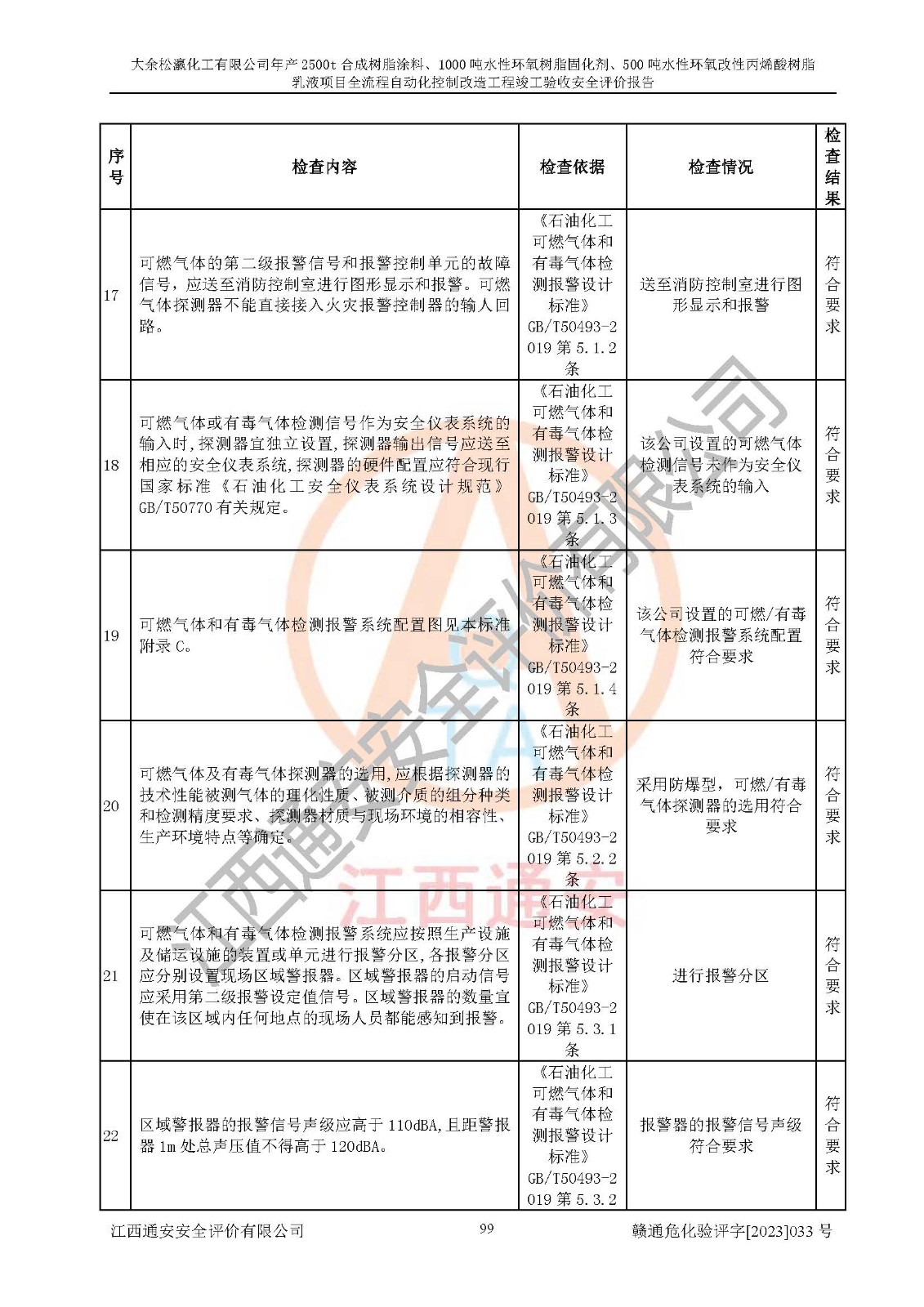 項目名稱 | 大余松瀛化工有限公司年產2500t合成樹脂涂料、1000噸水性環(huán)氧樹脂固化劑、500噸水性環(huán)氧改性丙烯酸樹脂乳液項目全流程自動化控制改造工程竣工驗收安全評價報告 | ||||