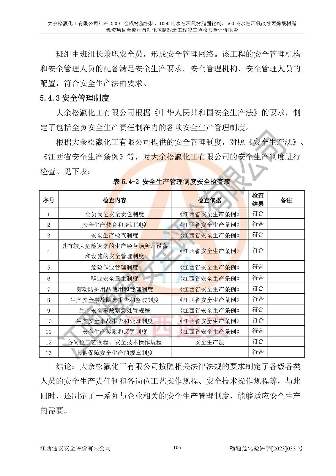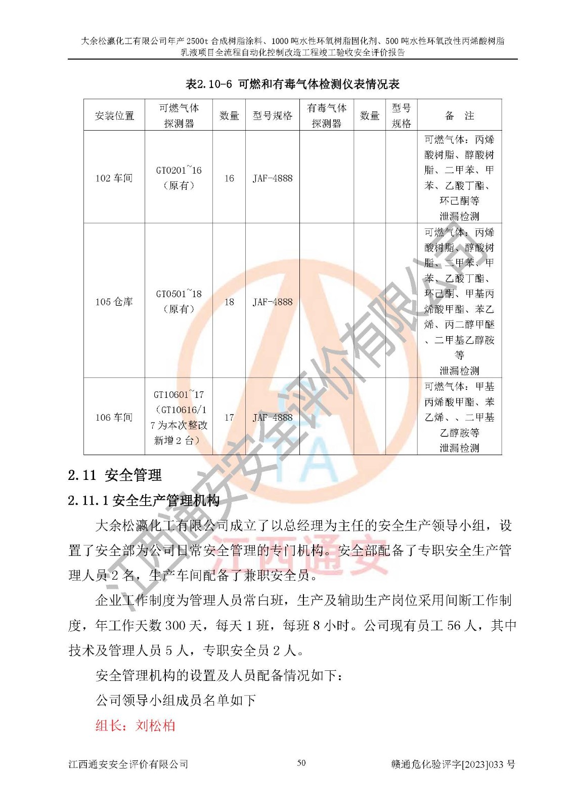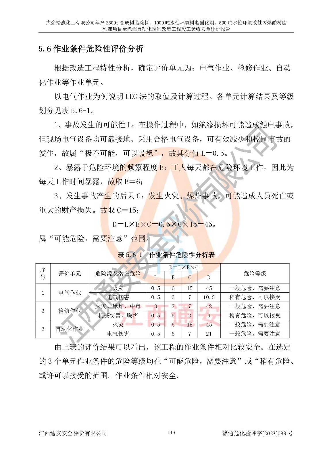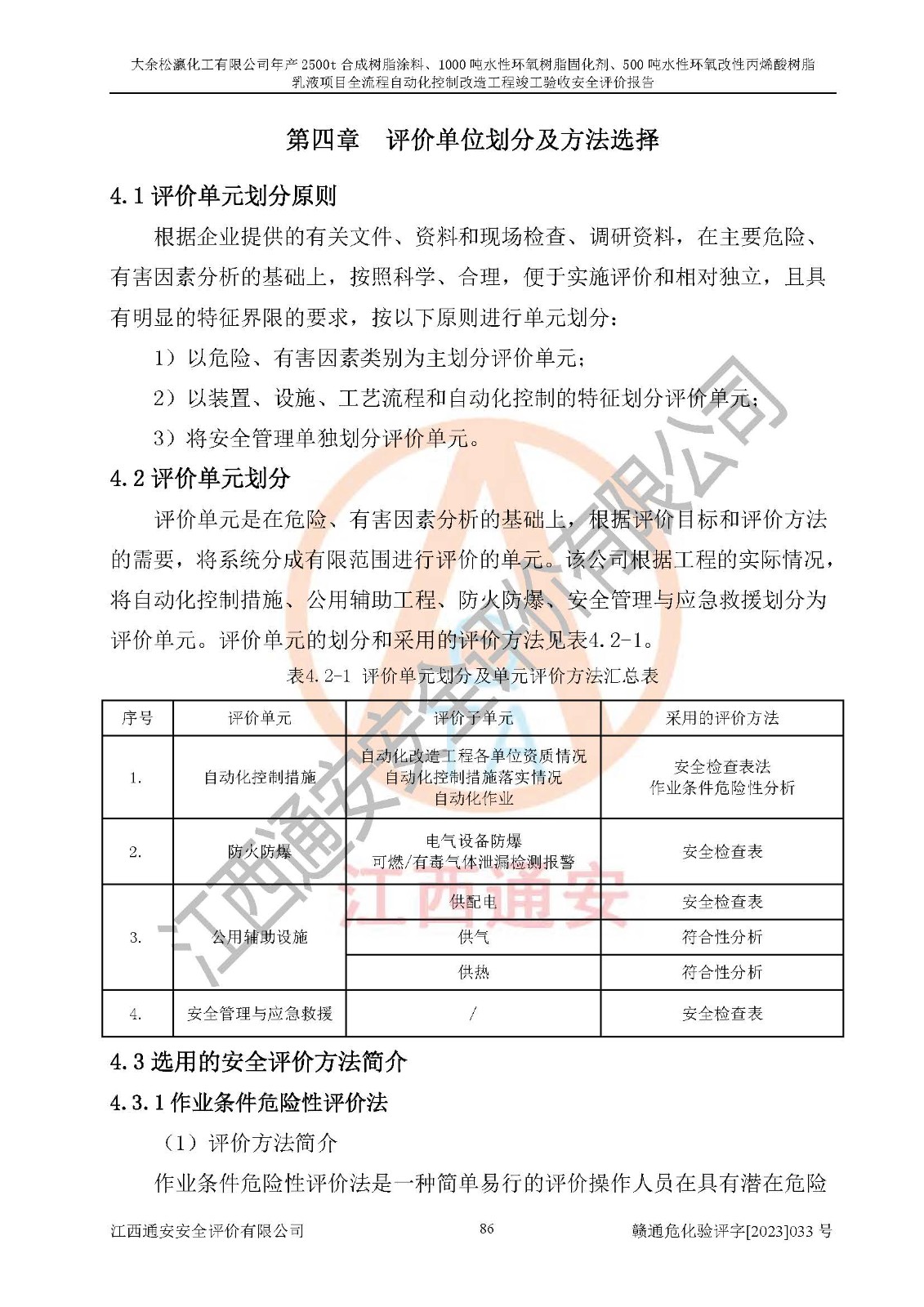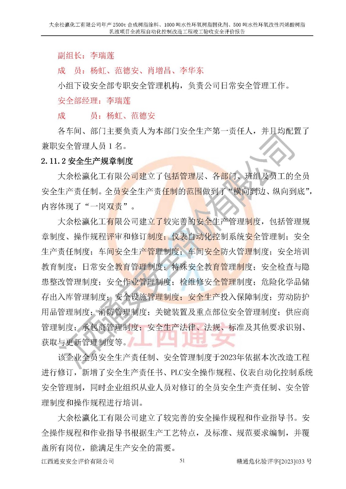 項目名稱 | 大余松瀛化工有限公司年產2500t合成樹脂涂料、1000噸水性環(huán)氧樹脂固化劑、500噸水性環(huán)氧改性丙烯酸樹脂乳液項目全流程自動化控制改造工程竣工驗收安全評價報告 | ||||