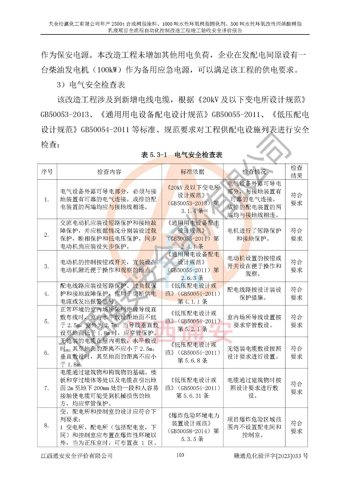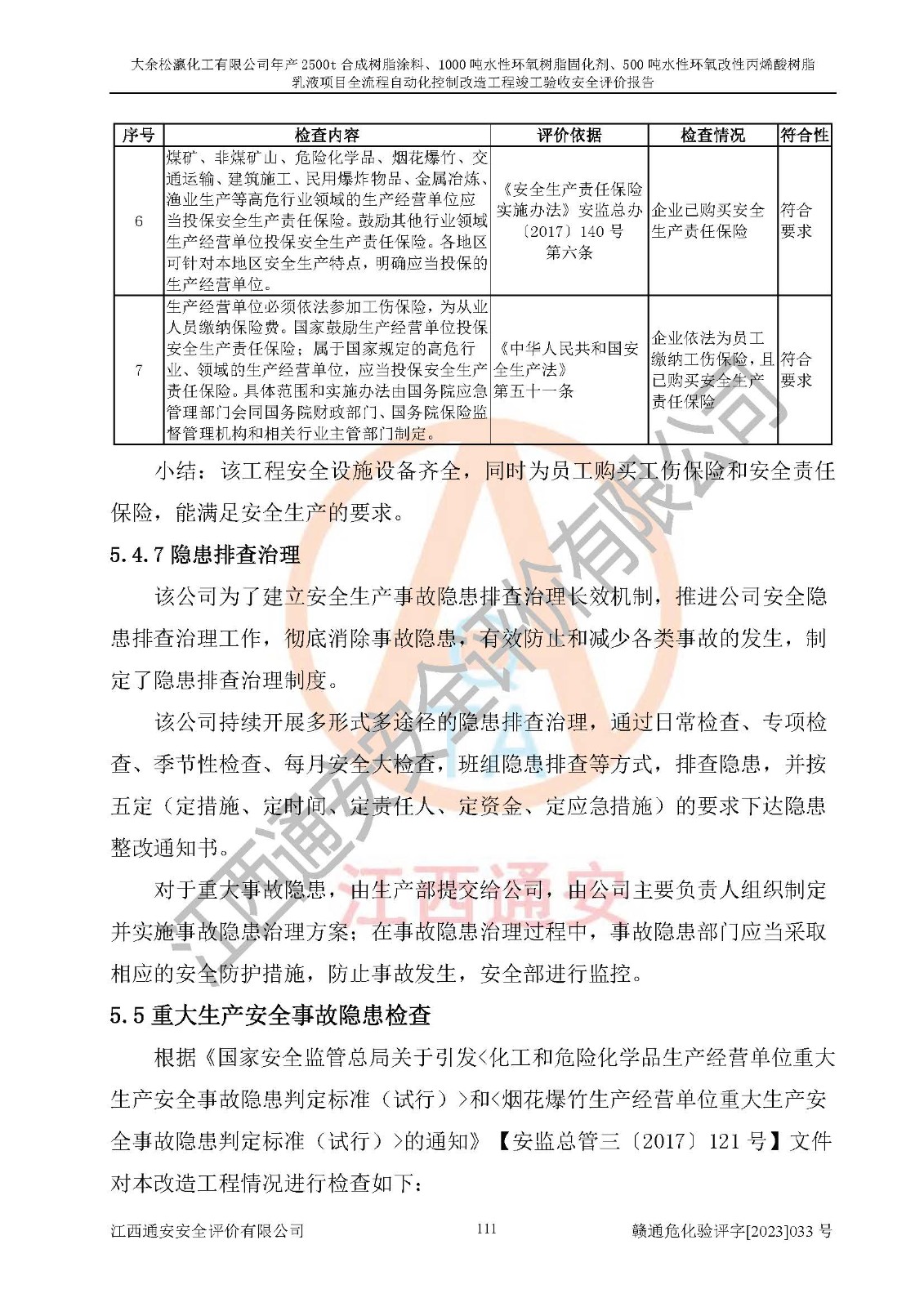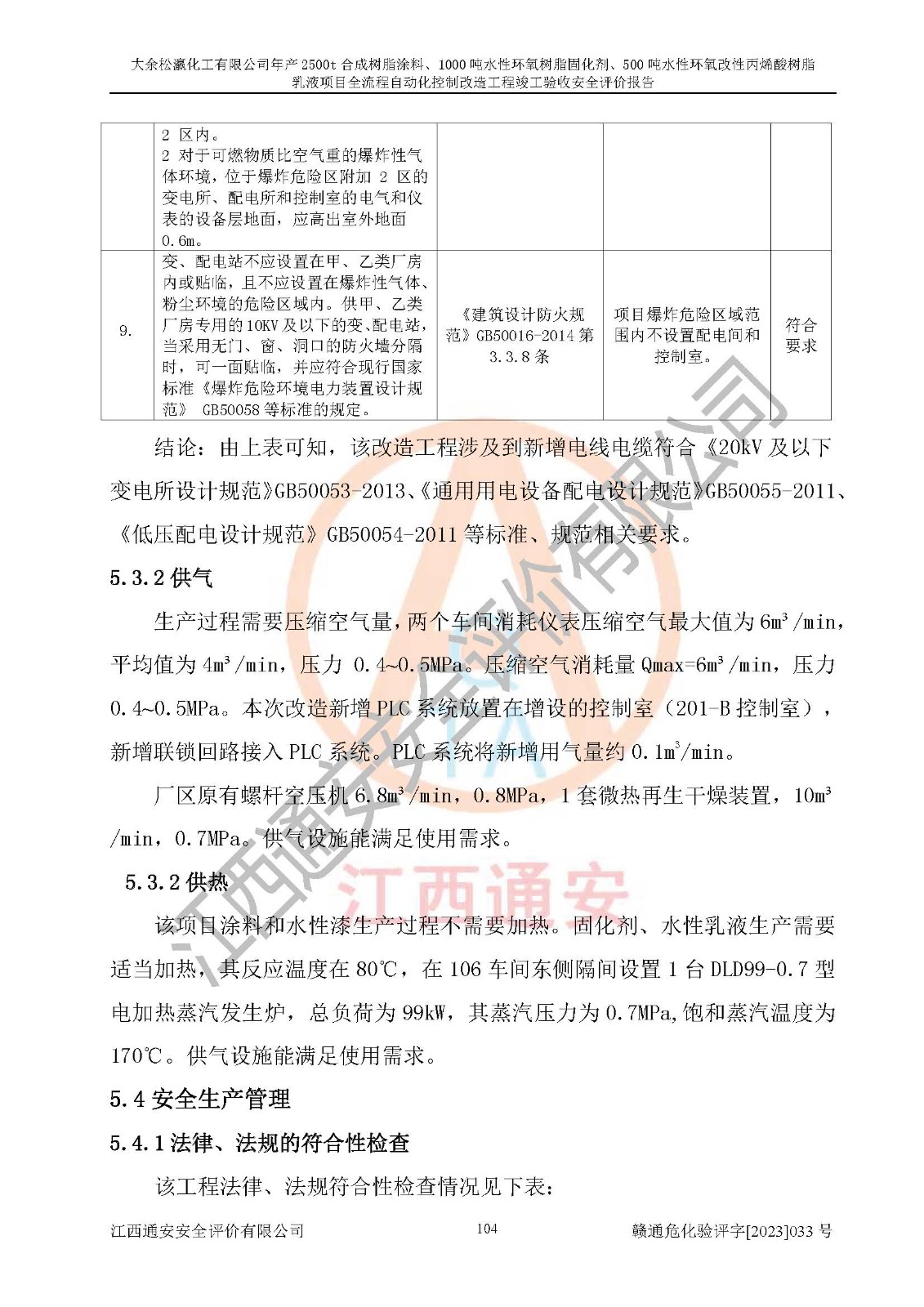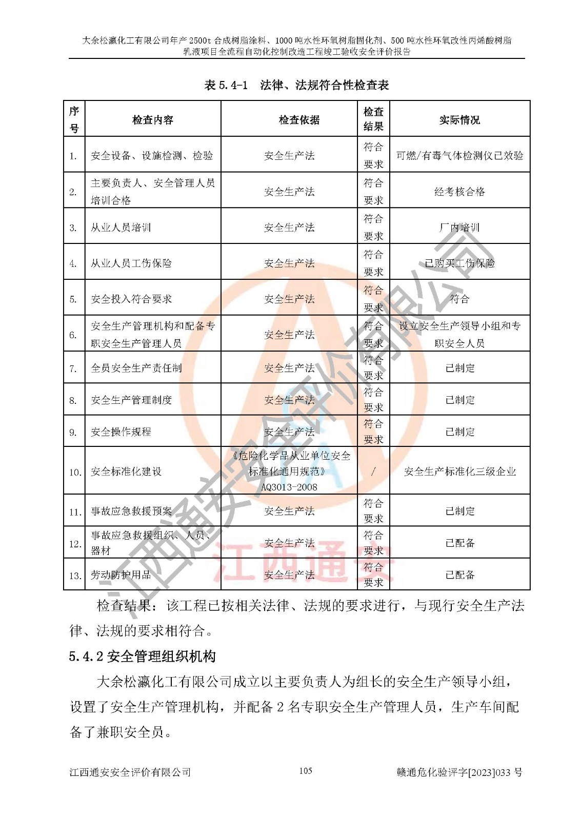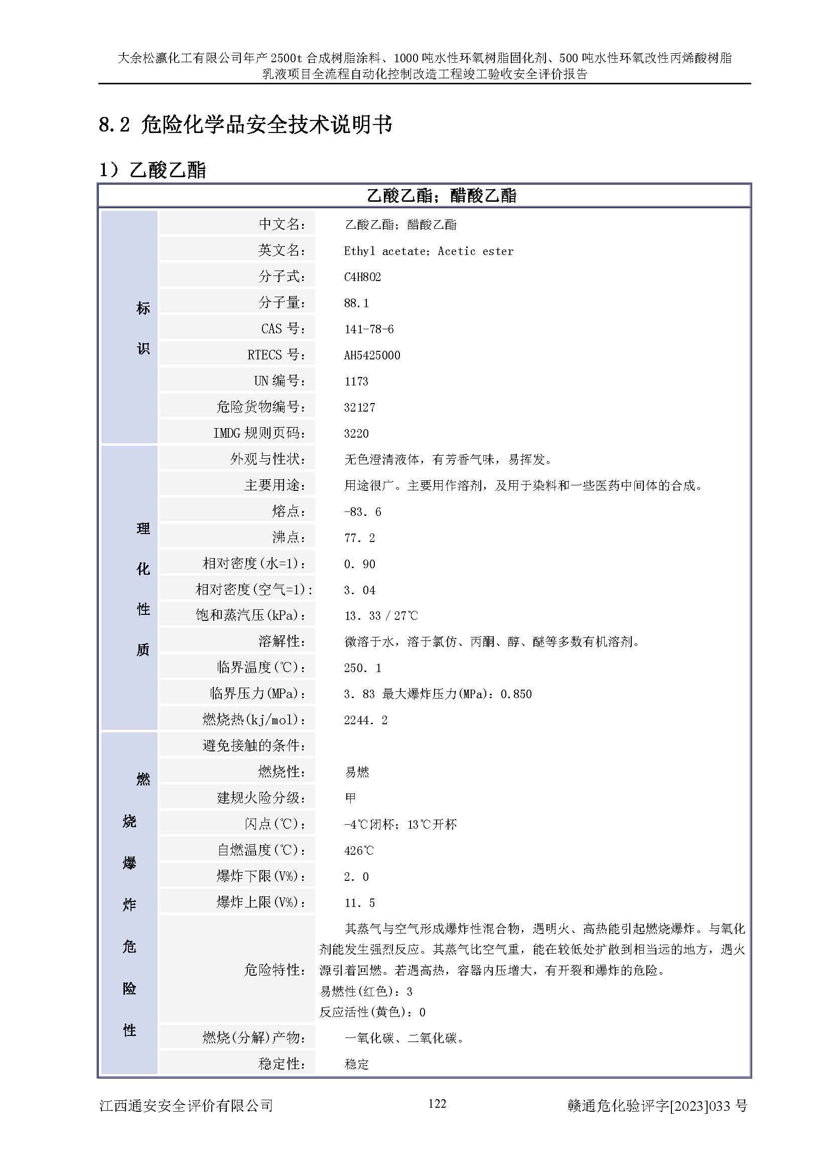 項目名稱 | 大余松瀛化工有限公司年產2500t合成樹脂涂料、1000噸水性環(huán)氧樹脂固化劑、500噸水性環(huán)氧改性丙烯酸樹脂乳液項目全流程自動化控制改造工程竣工驗收安全評價報告 | ||||