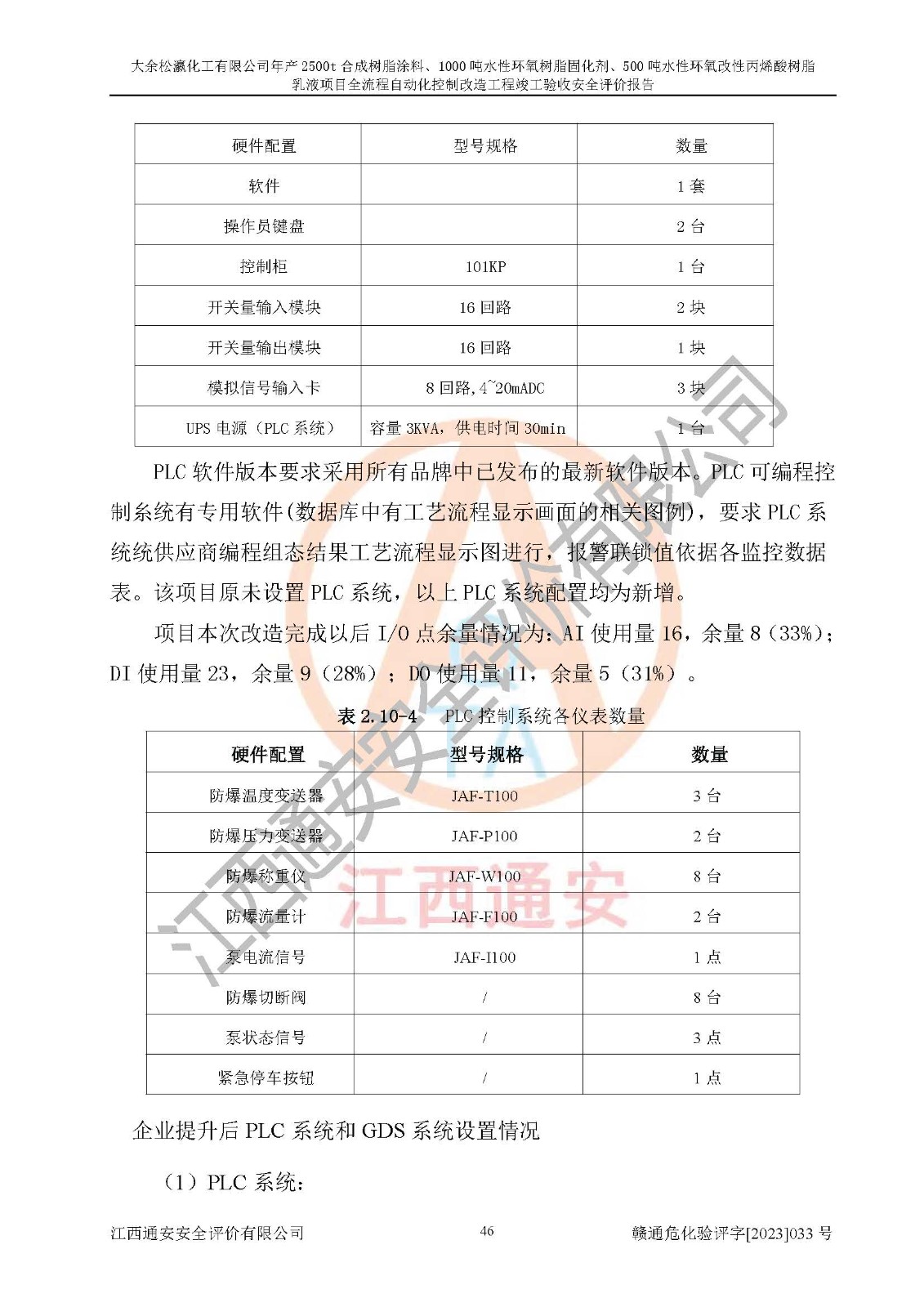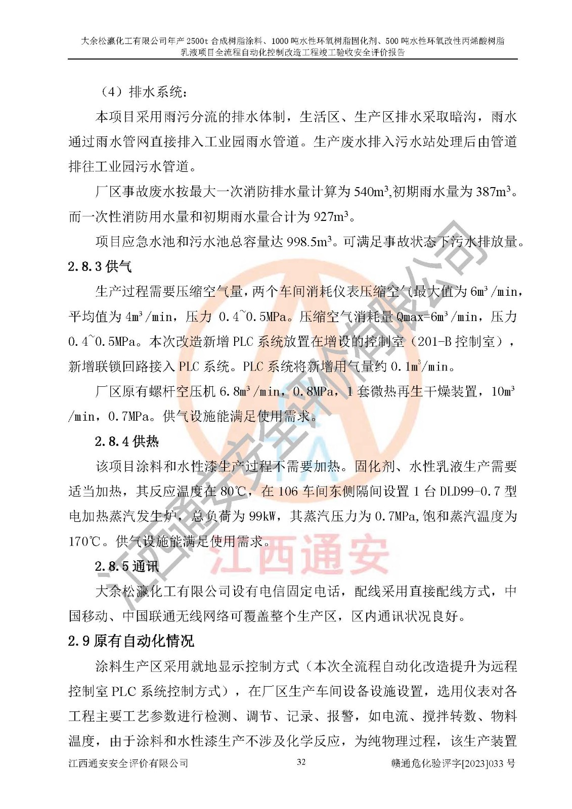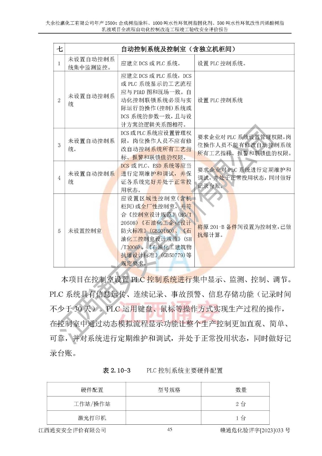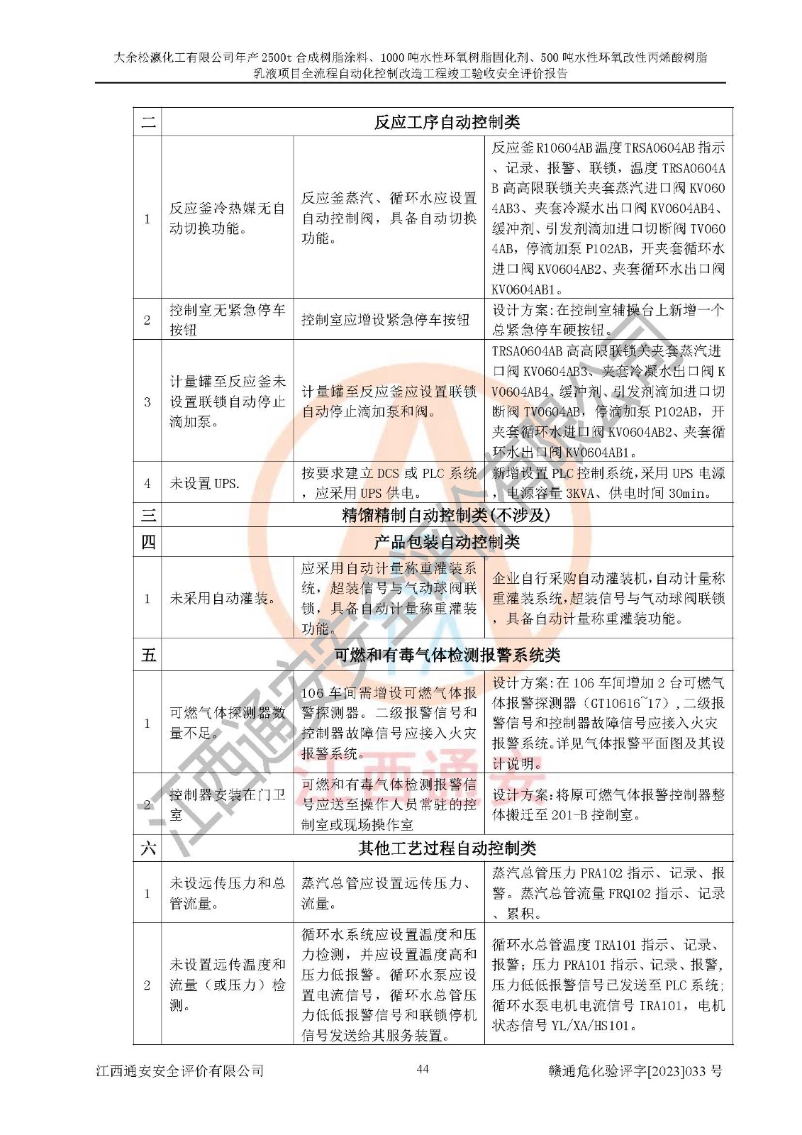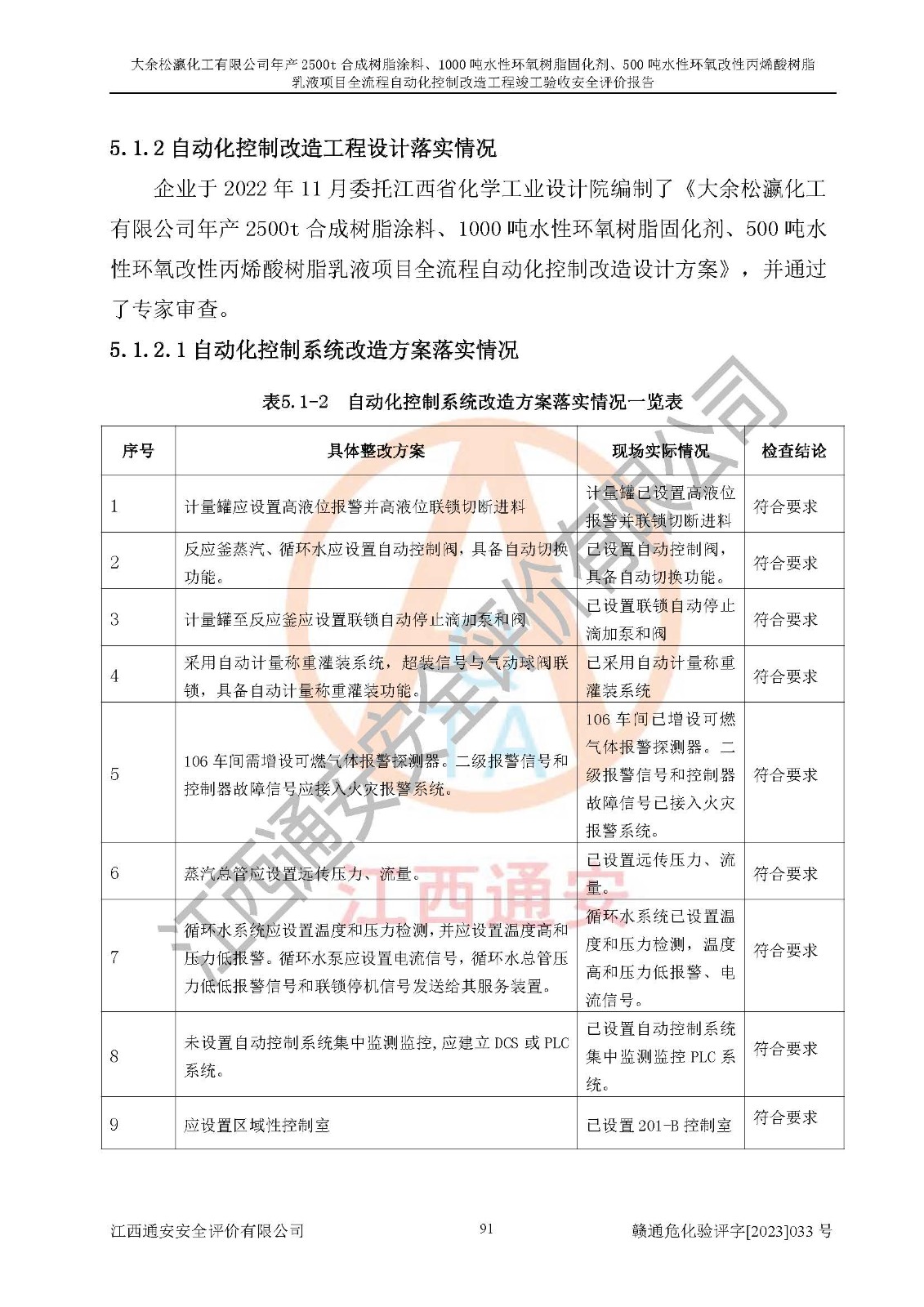 項目簡介 | 大余松瀛化工有限公司(以下簡稱“公司”)位于贛州市大余縣新華工業(yè)園,于2011年6月20日注冊成立,注冊資金貳佰萬元整,統(tǒng)一社會信用代碼:9136072357612791XX,法人**人為劉松柏,屬有限責任公司(自然人投資或控股),經營范圍為許可項目:危險化學品生產;危險化學品倉儲;危險化學品經營。一般項目:涂料制造(不含危險化學品);化工產品生產(不含許可類化工產品);涂料銷售(不含危險化學品)。 大余松瀛化工有限公司2020年在廠區(qū)內投資建設年產水性環(huán)氧樹脂固化劑1000噸、水性環(huán)氧改性丙烯酸樹脂乳液500噸技術改造項目(水性環(huán)氧樹脂固化劑和水性環(huán)氧改性丙烯酸樹脂乳液,不涉及危險化學品生產,只是生產原料使用危險化學品)。2019年取得項目備案通知書,2020年經贛州市行政審批局組織專家進行了安全條件審查和安全設計審查通過,于2020年8月竣工,項目辦理了“三同時”程序。 根據《江西省應急管理廳關于印發(fā)<江西省化工企業(yè)自動化提升實施方案>(試行)的通知》(贛應急字[2021]190號)要求,公司于2022年11月委托江西省化學工業(yè)設計院編制了《大余松瀛化工有限公司年產2500t合成樹脂涂料、1000噸水性環(huán)氧樹脂固化劑、500噸水性環(huán)氧改性丙烯酸樹脂乳液項目全流程自動化控制診斷報告(含隱患清單)》,公司項目未建設PLC/DCS控制系統(tǒng)和SIS安全儀表系統(tǒng),自動化提升改造前均為現場控制,設有獨立的GDS系統(tǒng);已委托江西省化學工業(yè)設計院做了HAZOP分析報告和(LOPA)評估報告,不需做SIL等級論證評估報告以及SIL驗算報告。2022年11月委托江西省化學工業(yè)設計院編制了《大余松瀛化工有限公司年產2500t合成樹脂涂料、1000噸水性環(huán)氧樹脂固化劑、500噸水性環(huán)氧改性丙烯酸樹脂乳液項目全流程自動化控制改造設計方案》,2022年11月23日通過了專家審查。公司全流程自動化控制改造工程由鄭州飛世爾科技有限公司負責安裝、調試,并出具了《車間自動化提升施工總結報告》,調試結論:調試完成、達工程改造的預期要求,具備驗收條件。 | ||||