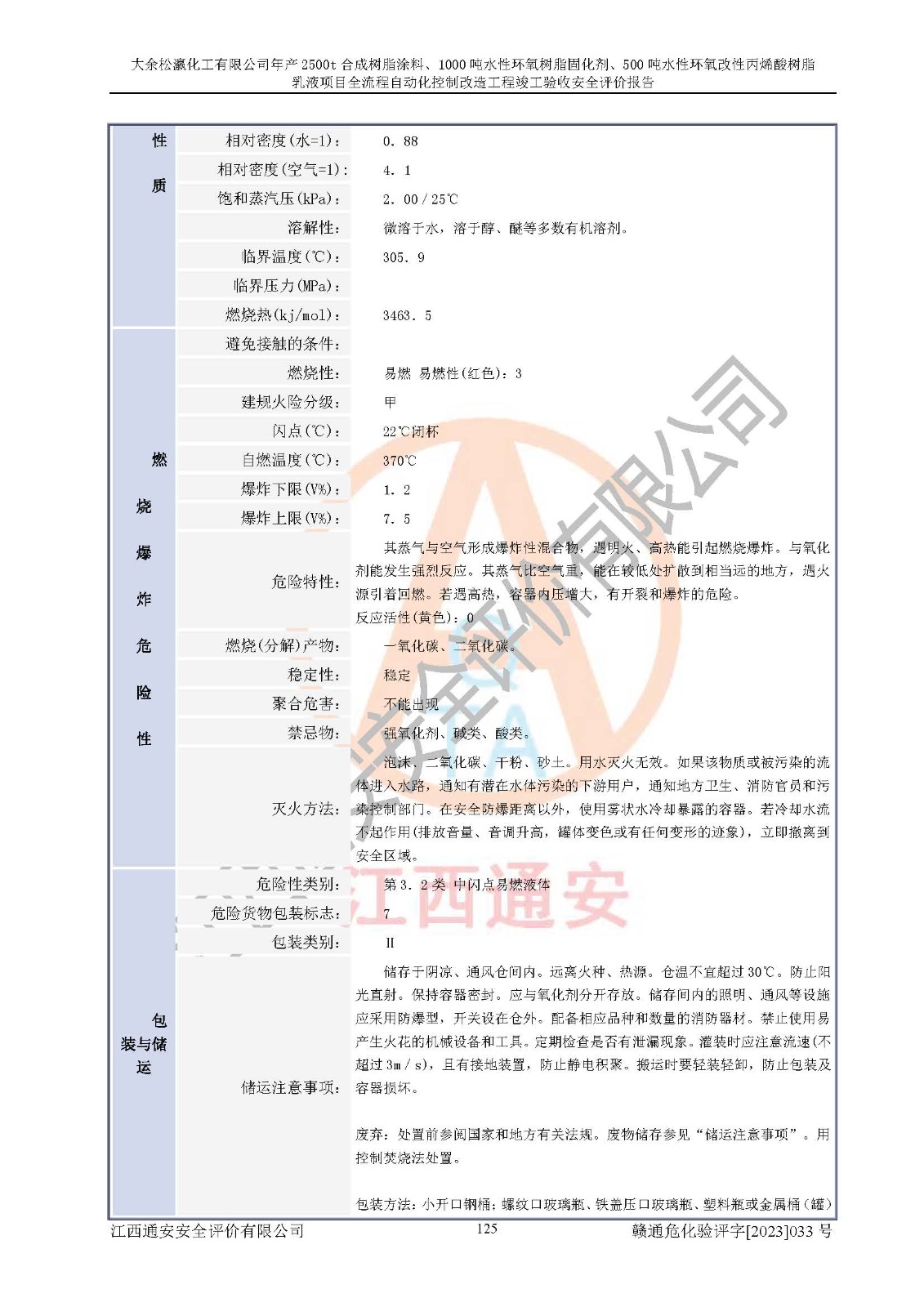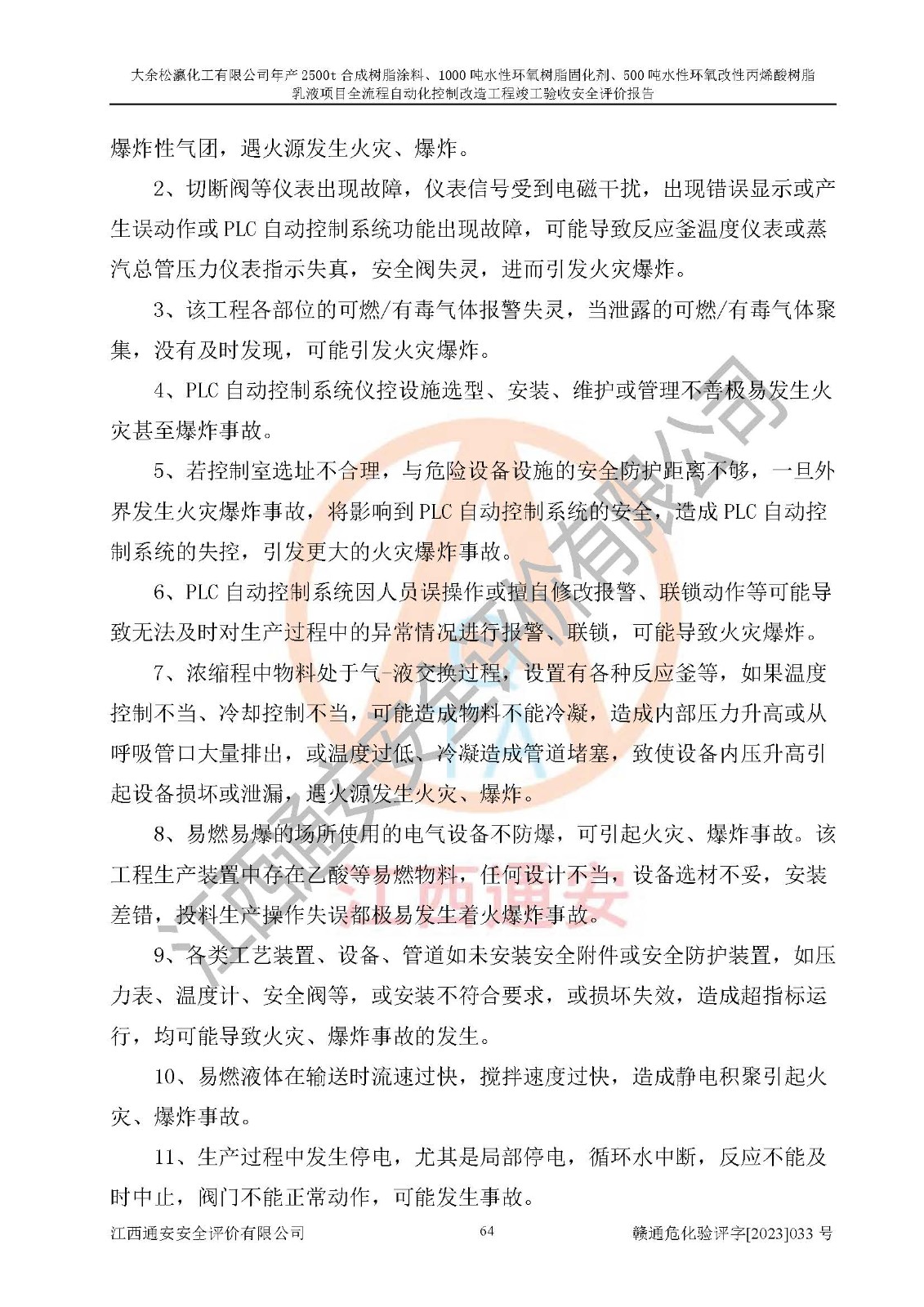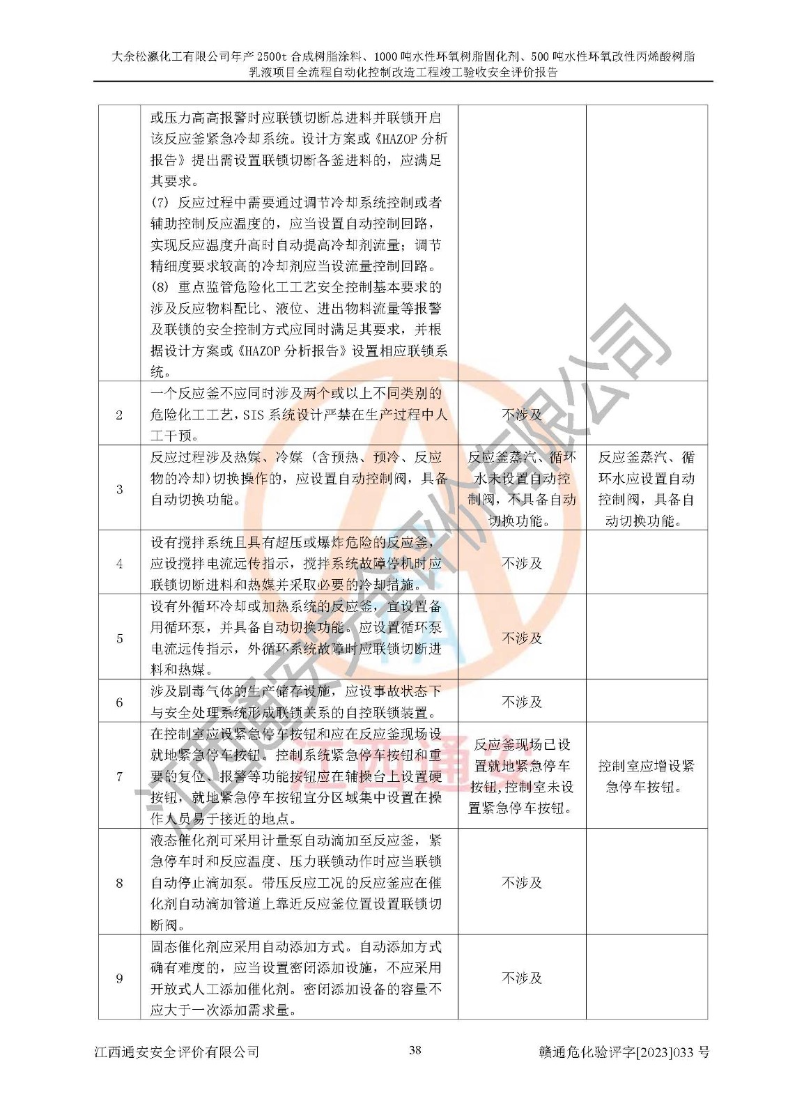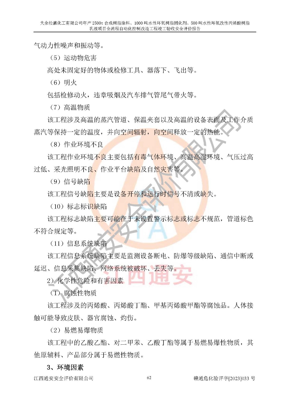其它 | 1、該工程涉及的危險化學品有:乙酸乙酯、乙酸丁酯、二甲苯、甲苯、環(huán)己酮、環(huán)氧樹脂、丙烯酸樹脂等聚合物樹脂、合成樹脂涂料(環(huán)氧樹脂涂料、醇酸樹脂涂料、丙烯酸樹脂涂料),引發(fā)劑(過二硫酸銨)、環(huán)氧稀釋劑、二甲基乙醇胺、丙烯酸、丙烯酸丁酯、苯乙烯、甲基丙烯酸甲酯、柴油(柴油發(fā)電機用)。 2、該工程中存在的主要危險有:火災爆炸、中毒窒息、灼燙、觸電、機械傷害、高處墜落、物體打擊等。其中火災爆炸、中毒和窒息是*主要的危險因素。 3、該工程涉及的各種化學品中,甲苯屬于第三類易制毒危險化學品,不涉及易制爆化學品,甲苯、乙酸乙酯、苯乙烯和丙烯酸屬于重點監(jiān)管危險化學品,不涉及特別管控危險化學品,不涉及高毒物品。 4、該公司生產單元和儲存設施單元不構成危險化學品重大危險源。 5、根據《**安全監(jiān)管總局關于公布首批重點監(jiān)管的危險化工工藝目錄的通知》(安監(jiān)總管三〔2009〕116號)和《**安全監(jiān)管總局關于公布第二批重點監(jiān)管危險化工工藝目錄和調整首批重點監(jiān)管危險化工工藝中部分典型工藝的通知》(安監(jiān)總管三〔2013〕3號)進行危險工藝辨識:該工程不涉及重點監(jiān)管的危險化工工藝。 6、通過作業(yè)條件危險性分析評價結果:在選定的電氣作業(yè)、檢修作業(yè)、自動化作業(yè)的3個單元作業(yè)條件的危險等級均在“可能危險,需要注意”或“稍有危險、或許可以接受的范圍。作業(yè)條件相對安全。 7、全流程自動化控制改造設計方案落實情況:大余松瀛化工有限公司年產2500t合成樹脂涂料、1000噸水性環(huán)氧樹脂固化劑、500噸水性環(huán)氧改性丙烯酸樹脂乳液項目全流程自動化控制改造工程由江西省化學工業(yè)設計院根據《江西省應急管理廳關于印發(fā)<江西省化工企業(yè)自動化提升實施方案>(試行)的通知》(贛應急字[2021]190號)等相關規(guī)范、規(guī)定、標準及文件的要求負責編制了《大余松瀛化工有限公司年產2500t合成樹脂涂料、1000噸水性環(huán)氧樹脂固化劑、500噸水性環(huán)氧改性丙烯酸樹脂乳液項目全流程自動化控制改造設計方案》,并通過了專家審查。該工程由鄭州飛世爾科技有限公司負責安裝、調試,并出具了《大余松瀛化工有限公司PLC自動化控制系統(tǒng)改造項目調試報告》,調試結論:調試完成、達工程改造的預期要求,具備驗收條件。大余松瀛化工有限公司年產2500t合成樹脂涂料、1000噸水性環(huán)氧樹脂固化劑、500噸水性環(huán)氧改性丙烯酸樹脂乳液項目全流程自動化控制改造工程的設計、安裝施工和調試單位的資質均符合要求。 經過企業(yè)整改,該改造工程現場自動化控制已按照《大余松瀛化工有限公司年產2500t合成樹脂涂料、1000噸水性環(huán)氧樹脂固化劑、500噸水性環(huán)氧改性丙烯酸樹脂乳液項目全流程自動化控制改造設計方案》要求落實到位。該公司公用工程、輔助設施能夠滿足該工程安全生產的要求。 8、該公司按要求設置了安全生產管理機構,配備了專職和兼職的安全生產管理人員,形成了***的安全生產管理網絡。 9、企業(yè)建立健全了以全員安全生產責任制為核心的安全生產管理規(guī)章制度,編制了各崗位安全操作規(guī)程和崗位安全技術規(guī)程,并嚴格監(jiān)督執(zhí)行。 10、企業(yè)建立了完善的事故應急救援體系,成立了應急救援指揮中心,編制了事故應急救援預案。對預案進行相關培訓及演練,并建立培訓演練記錄。 11、公司主要負責人、安全管理人員經培訓考核合格,實行持證上崗,其他從業(yè)人員均進行了廠內三級安全教育培訓,具備安全知識與操作技能,配備有1名化工注冊安全工程師;為從業(yè)人員配備了相應的勞動防護用品。 評價結論:項目全流程自動化控制改造設計方案中提出的控制措施已得到落實,企業(yè)控制系統(tǒng)設置情況與設計方案一致,設計、施工和調試單位由有**相應資質的自控系統(tǒng)施工單位進行施工,并對自動控制系統(tǒng)調試合格,出具了竣工圖,安全風險程度是可以接受的,安全風險可控,滿足《江西省應急管理廳關于印發(fā)<江西省化工企業(yè)自動化提升實施方案>(試行)的通知》(贛應急字[2021]190號)的要求,具備全流程自動化控制改造工程竣工驗收條件。 | ||||