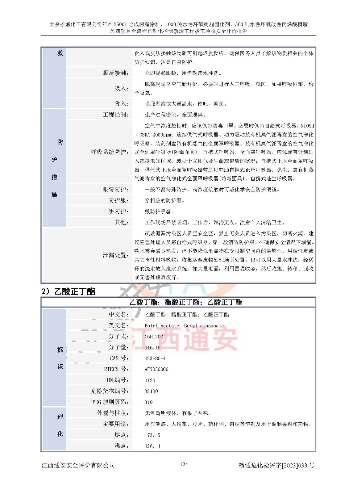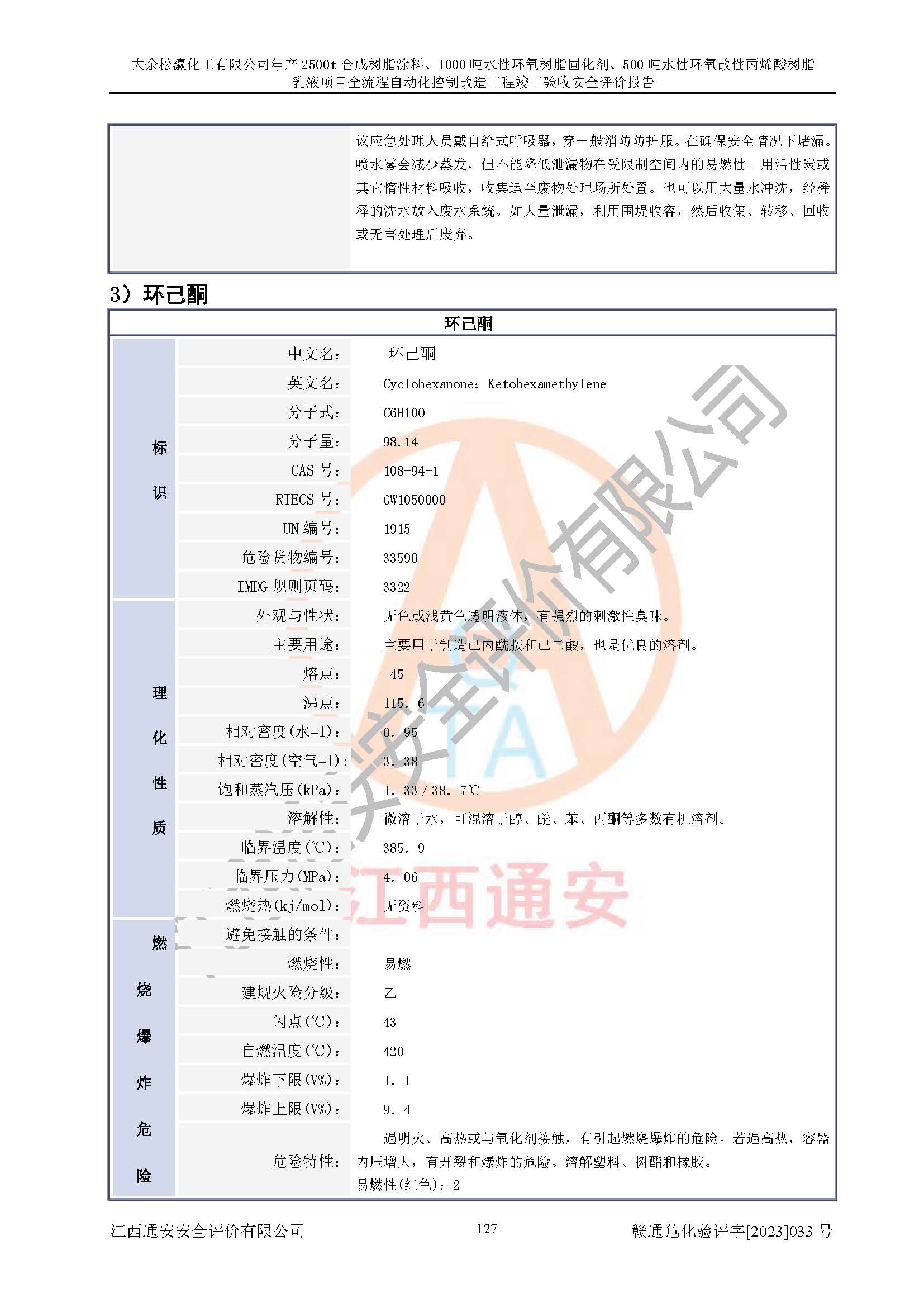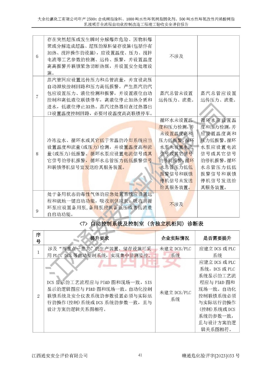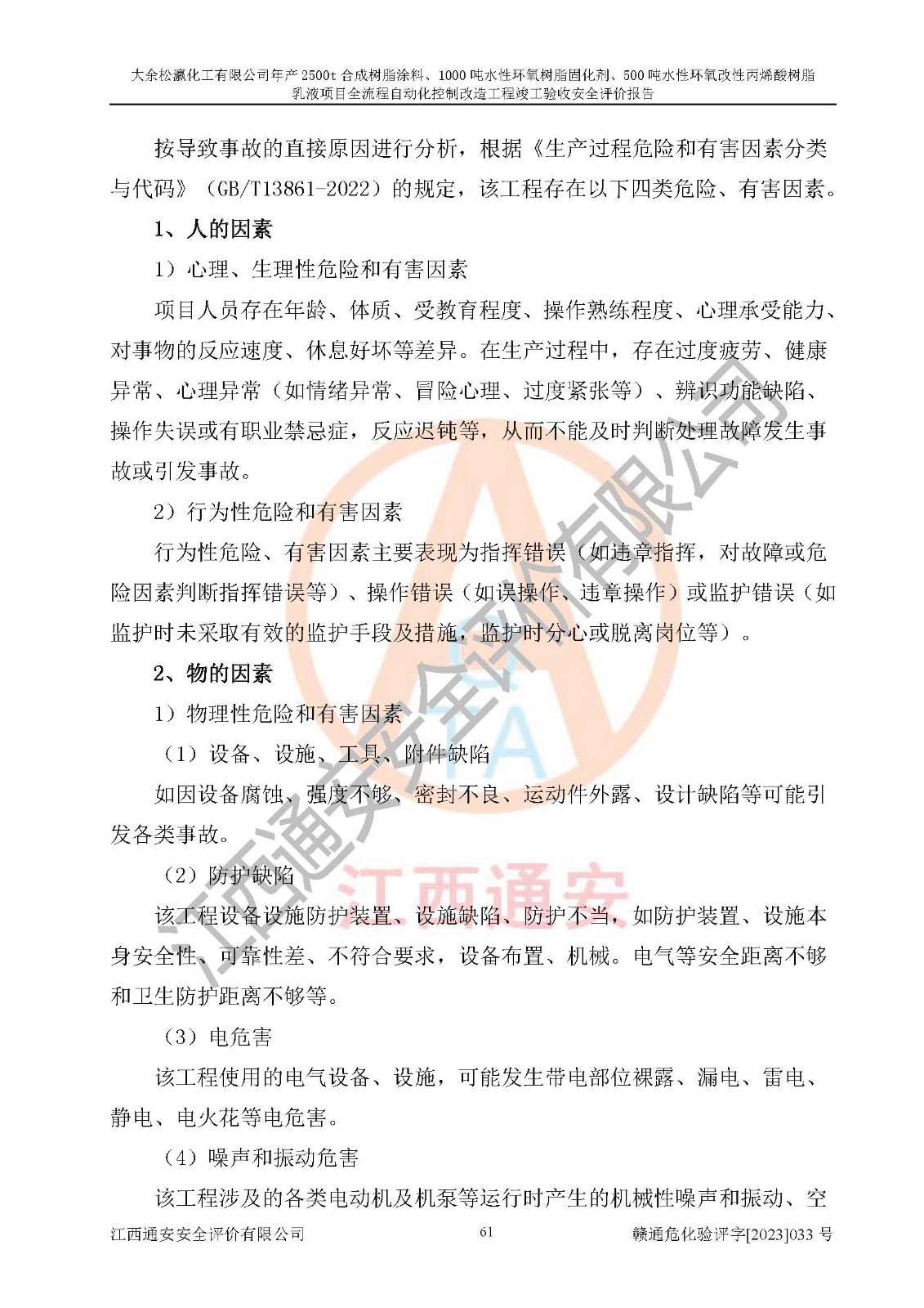 其它 | 1、該工程涉及的危險化學品有:乙酸乙酯、乙酸丁酯、二甲苯、甲苯、環(huán)己酮、環(huán)氧樹脂、丙烯酸樹脂等聚合物樹脂、合成樹脂涂料(環(huán)氧樹脂涂料、醇酸樹脂涂料、丙烯酸樹脂涂料),引發(fā)劑(過二硫酸銨)、環(huán)氧稀釋劑、二甲基乙醇胺、丙烯酸、丙烯酸丁酯、苯乙烯、甲基丙烯酸甲酯、柴油(柴油發(fā)電機用)。 2、該工程中存在的主要危險有:火災爆炸、中毒窒息、灼燙、觸電、機械傷害、高處墜落、物體打擊等。其中火災爆炸、中毒和窒息是*主要的危險因素。 3、該工程涉及的各種化學品中,甲苯屬于第三類易制毒危險化學品,不涉及易制爆化學品,甲苯、乙酸乙酯、苯乙烯和丙烯酸屬于重點監(jiān)管危險化學品,不涉及特別管控危險化學品,不涉及高毒物品。 4、該公司生產單元和儲存設施單元不構成危險化學品重大危險源。 5、根據《**安全監(jiān)管總局關于公布首批重點監(jiān)管的危險化工工藝目錄的通知》(安監(jiān)總管三〔2009〕116號)和《**安全監(jiān)管總局關于公布第二批重點監(jiān)管危險化工工藝目錄和調整首批重點監(jiān)管危險化工工藝中部分典型工藝的通知》(安監(jiān)總管三〔2013〕3號)進行危險工藝辨識:該工程不涉及重點監(jiān)管的危險化工工藝。 6、通過作業(yè)條件危險性分析評價結果:在選定的電氣作業(yè)、檢修作業(yè)、自動化作業(yè)的3個單元作業(yè)條件的危險等級均在“可能危險,需要注意”或“稍有危險、或許可以接受的范圍。作業(yè)條件相對安全。 7、全流程自動化控制改造設計方案落實情況:大余松瀛化工有限公司年產2500t合成樹脂涂料、1000噸水性環(huán)氧樹脂固化劑、500噸水性環(huán)氧改性丙烯酸樹脂乳液項目全流程自動化控制改造工程由江西省化學工業(yè)設計院根據《江西省應急管理廳關于印發(fā)<江西省化工企業(yè)自動化提升實施方案>(試行)的通知》(贛應急字[2021]190號)等相關規(guī)范、規(guī)定、標準及文件的要求負責編制了《大余松瀛化工有限公司年產2500t合成樹脂涂料、1000噸水性環(huán)氧樹脂固化劑、500噸水性環(huán)氧改性丙烯酸樹脂乳液項目全流程自動化控制改造設計方案》,并通過了專家審查。該工程由鄭州飛世爾科技有限公司負責安裝、調試,并出具了《大余松瀛化工有限公司PLC自動化控制系統(tǒng)改造項目調試報告》,調試結論:調試完成、達工程改造的預期要求,具備驗收條件。大余松瀛化工有限公司年產2500t合成樹脂涂料、1000噸水性環(huán)氧樹脂固化劑、500噸水性環(huán)氧改性丙烯酸樹脂乳液項目全流程自動化控制改造工程的設計、安裝施工和調試單位的資質均符合要求。 經過企業(yè)整改,該改造工程現場自動化控制已按照《大余松瀛化工有限公司年產2500t合成樹脂涂料、1000噸水性環(huán)氧樹脂固化劑、500噸水性環(huán)氧改性丙烯酸樹脂乳液項目全流程自動化控制改造設計方案》要求落實到位。該公司公用工程、輔助設施能夠滿足該工程安全生產的要求。 8、該公司按要求設置了安全生產管理機構,配備了專職和兼職的安全生產管理人員,形成了***的安全生產管理網絡。 9、企業(yè)建立健全了以全員安全生產責任制為核心的安全生產管理規(guī)章制度,編制了各崗位安全操作規(guī)程和崗位安全技術規(guī)程,并嚴格監(jiān)督執(zhí)行。 10、企業(yè)建立了完善的事故應急救援體系,成立了應急救援指揮中心,編制了事故應急救援預案。對預案進行相關培訓及演練,并建立培訓演練記錄。 11、公司主要負責人、安全管理人員經培訓考核合格,實行持證上崗,其他從業(yè)人員均進行了廠內三級安全教育培訓,具備安全知識與操作技能,配備有1名化工注冊安全工程師;為從業(yè)人員配備了相應的勞動防護用品。 評價結論:項目全流程自動化控制改造設計方案中提出的控制措施已得到落實,企業(yè)控制系統(tǒng)設置情況與設計方案一致,設計、施工和調試單位由有**相應資質的自控系統(tǒng)施工單位進行施工,并對自動控制系統(tǒng)調試合格,出具了竣工圖,安全風險程度是可以接受的,安全風險可控,滿足《江西省應急管理廳關于印發(fā)<江西省化工企業(yè)自動化提升實施方案>(試行)的通知》(贛應急字[2021]190號)的要求,具備全流程自動化控制改造工程竣工驗收條件。 | ||||