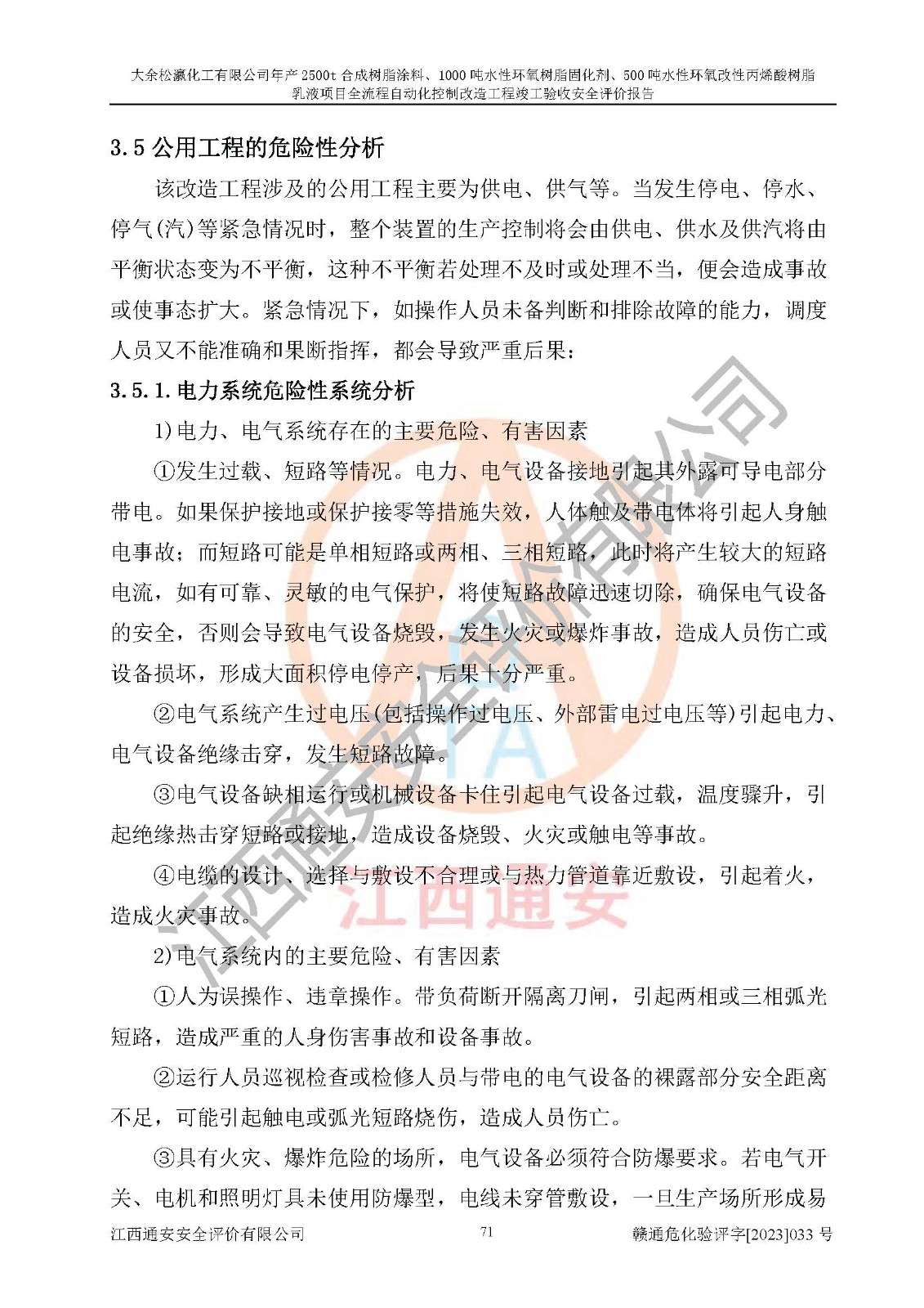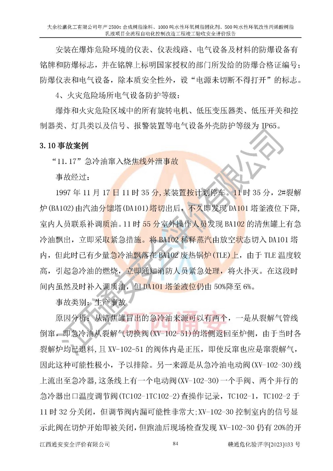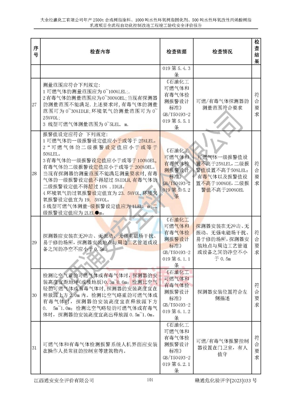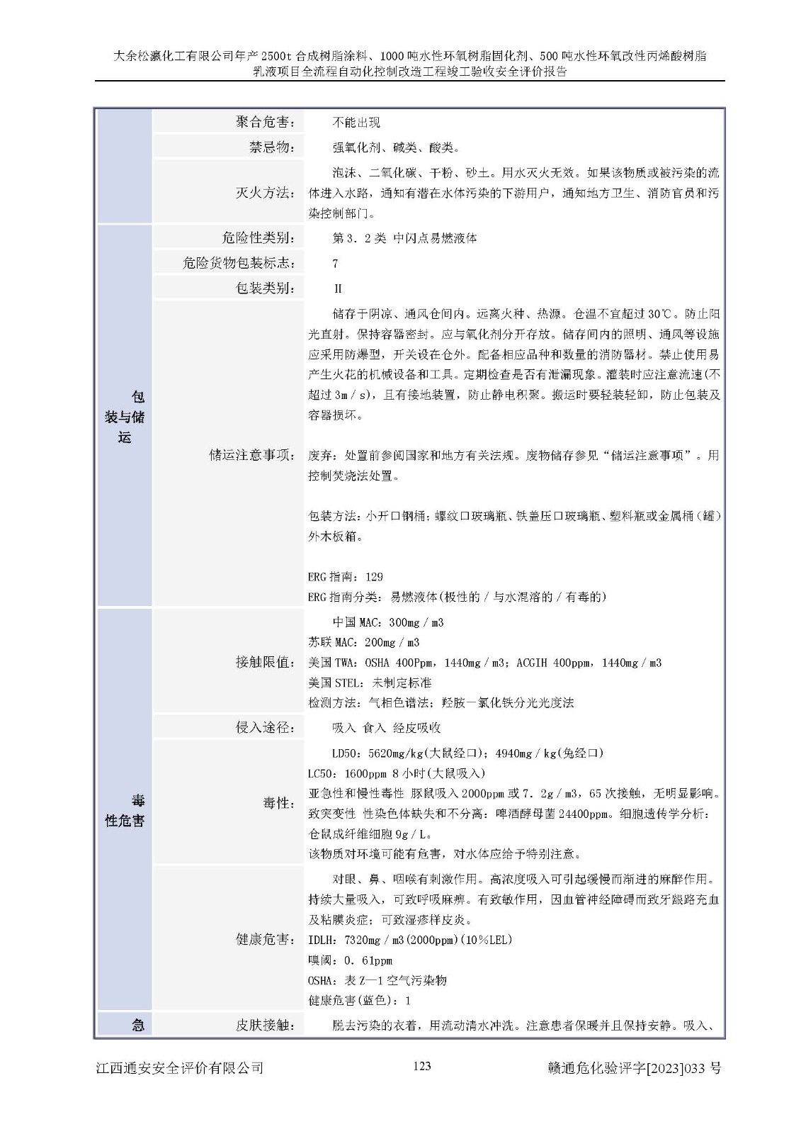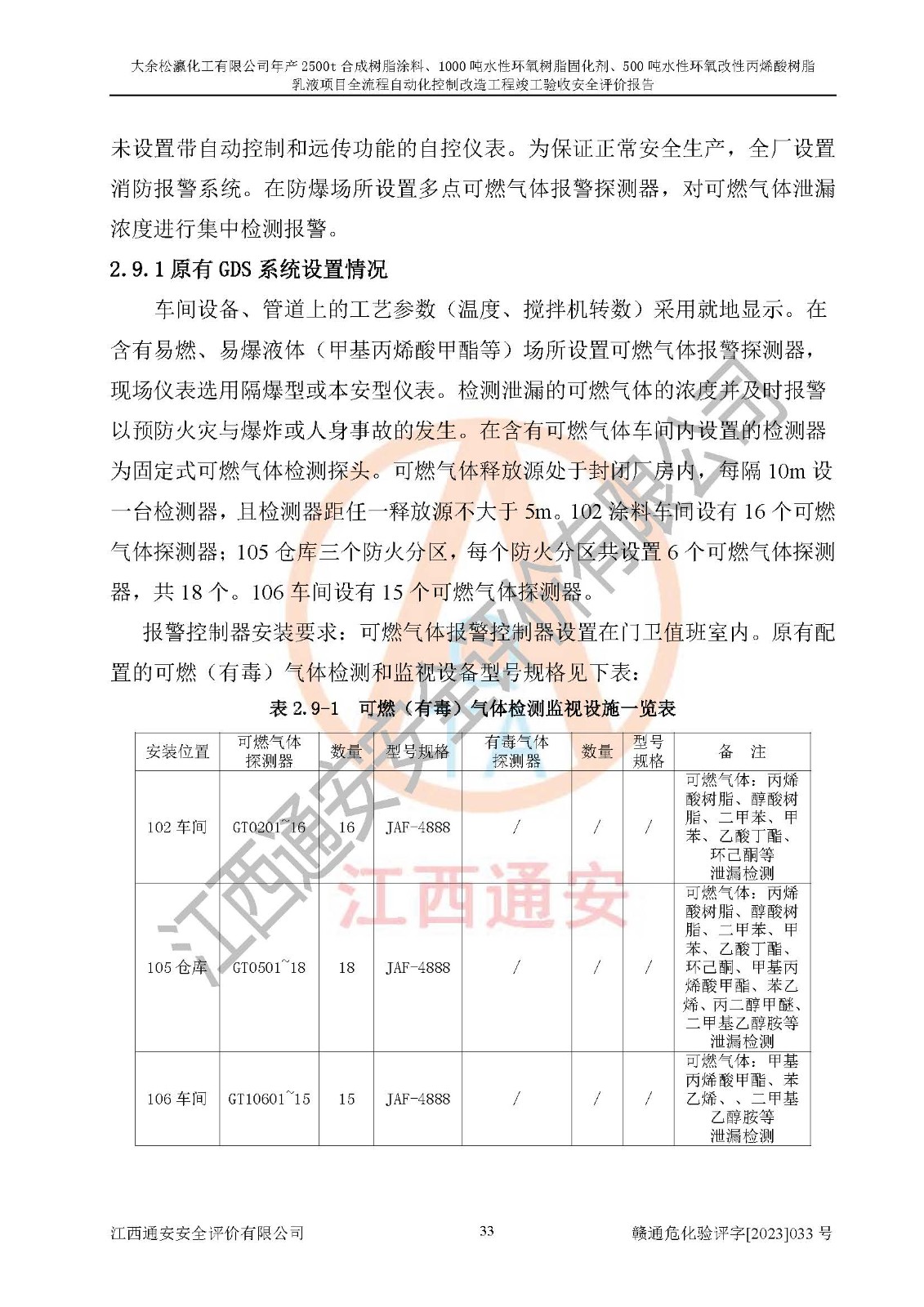 其它 | 1、該工程涉及的危險化學品有:乙酸乙酯、乙酸丁酯、二甲苯、甲苯、環(huán)己酮、環(huán)氧樹脂、丙烯酸樹脂等聚合物樹脂、合成樹脂涂料(環(huán)氧樹脂涂料、醇酸樹脂涂料、丙烯酸樹脂涂料),引發(fā)劑(過二硫酸銨)、環(huán)氧稀釋劑、二甲基乙醇胺、丙烯酸、丙烯酸丁酯、苯乙烯、甲基丙烯酸甲酯、柴油(柴油發(fā)電機用)。 2、該工程中存在的主要危險有:火災爆炸、中毒窒息、灼燙、觸電、機械傷害、高處墜落、物體打擊等。其中火災爆炸、中毒和窒息是*主要的危險因素。 3、該工程涉及的各種化學品中,甲苯屬于第三類易制毒危險化學品,不涉及易制爆化學品,甲苯、乙酸乙酯、苯乙烯和丙烯酸屬于重點監(jiān)管危險化學品,不涉及特別管控危險化學品,不涉及高毒物品。 4、該公司生產單元和儲存設施單元不構成危險化學品重大危險源。 5、根據《**安全監(jiān)管總局關于公布首批重點監(jiān)管的危險化工工藝目錄的通知》(安監(jiān)總管三〔2009〕116號)和《**安全監(jiān)管總局關于公布第二批重點監(jiān)管危險化工工藝目錄和調整首批重點監(jiān)管危險化工工藝中部分典型工藝的通知》(安監(jiān)總管三〔2013〕3號)進行危險工藝辨識:該工程不涉及重點監(jiān)管的危險化工工藝。 6、通過作業(yè)條件危險性分析評價結果:在選定的電氣作業(yè)、檢修作業(yè)、自動化作業(yè)的3個單元作業(yè)條件的危險等級均在“可能危險,需要注意”或“稍有危險、或許可以接受的范圍。作業(yè)條件相對安全。 7、全流程自動化控制改造設計方案落實情況:大余松瀛化工有限公司年產2500t合成樹脂涂料、1000噸水性環(huán)氧樹脂固化劑、500噸水性環(huán)氧改性丙烯酸樹脂乳液項目全流程自動化控制改造工程由江西省化學工業(yè)設計院根據《江西省應急管理廳關于印發(fā)<江西省化工企業(yè)自動化提升實施方案>(試行)的通知》(贛應急字[2021]190號)等相關規(guī)范、規(guī)定、標準及文件的要求負責編制了《大余松瀛化工有限公司年產2500t合成樹脂涂料、1000噸水性環(huán)氧樹脂固化劑、500噸水性環(huán)氧改性丙烯酸樹脂乳液項目全流程自動化控制改造設計方案》,并通過了專家審查。該工程由鄭州飛世爾科技有限公司負責安裝、調試,并出具了《大余松瀛化工有限公司PLC自動化控制系統(tǒng)改造項目調試報告》,調試結論:調試完成、達工程改造的預期要求,具備驗收條件。大余松瀛化工有限公司年產2500t合成樹脂涂料、1000噸水性環(huán)氧樹脂固化劑、500噸水性環(huán)氧改性丙烯酸樹脂乳液項目全流程自動化控制改造工程的設計、安裝施工和調試單位的資質均符合要求。 經過企業(yè)整改,該改造工程現場自動化控制已按照《大余松瀛化工有限公司年產2500t合成樹脂涂料、1000噸水性環(huán)氧樹脂固化劑、500噸水性環(huán)氧改性丙烯酸樹脂乳液項目全流程自動化控制改造設計方案》要求落實到位。該公司公用工程、輔助設施能夠滿足該工程安全生產的要求。 8、該公司按要求設置了安全生產管理機構,配備了專職和兼職的安全生產管理人員,形成了***的安全生產管理網絡。 9、企業(yè)建立健全了以全員安全生產責任制為核心的安全生產管理規(guī)章制度,編制了各崗位安全操作規(guī)程和崗位安全技術規(guī)程,并嚴格監(jiān)督執(zhí)行。 10、企業(yè)建立了完善的事故應急救援體系,成立了應急救援指揮中心,編制了事故應急救援預案。對預案進行相關培訓及演練,并建立培訓演練記錄。 11、公司主要負責人、安全管理人員經培訓考核合格,實行持證上崗,其他從業(yè)人員均進行了廠內三級安全教育培訓,具備安全知識與操作技能,配備有1名化工注冊安全工程師;為從業(yè)人員配備了相應的勞動防護用品。 評價結論:項目全流程自動化控制改造設計方案中提出的控制措施已得到落實,企業(yè)控制系統(tǒng)設置情況與設計方案一致,設計、施工和調試單位由有**相應資質的自控系統(tǒng)施工單位進行施工,并對自動控制系統(tǒng)調試合格,出具了竣工圖,安全風險程度是可以接受的,安全風險可控,滿足《江西省應急管理廳關于印發(fā)<江西省化工企業(yè)自動化提升實施方案>(試行)的通知》(贛應急字[2021]190號)的要求,具備全流程自動化控制改造工程竣工驗收條件。 | ||||