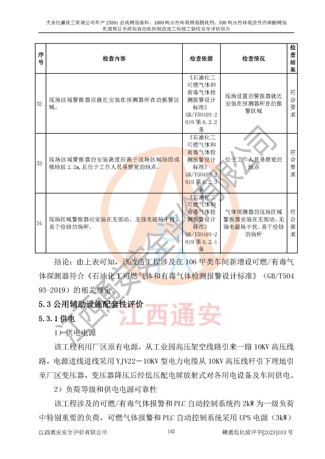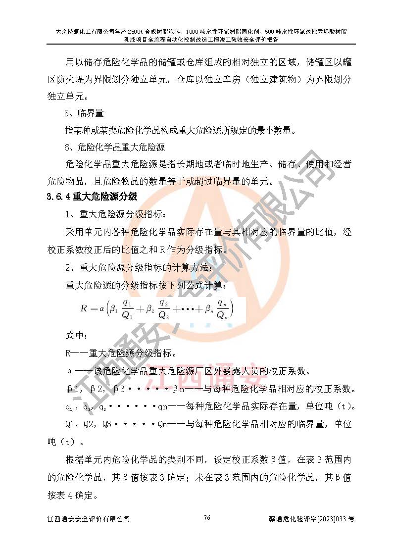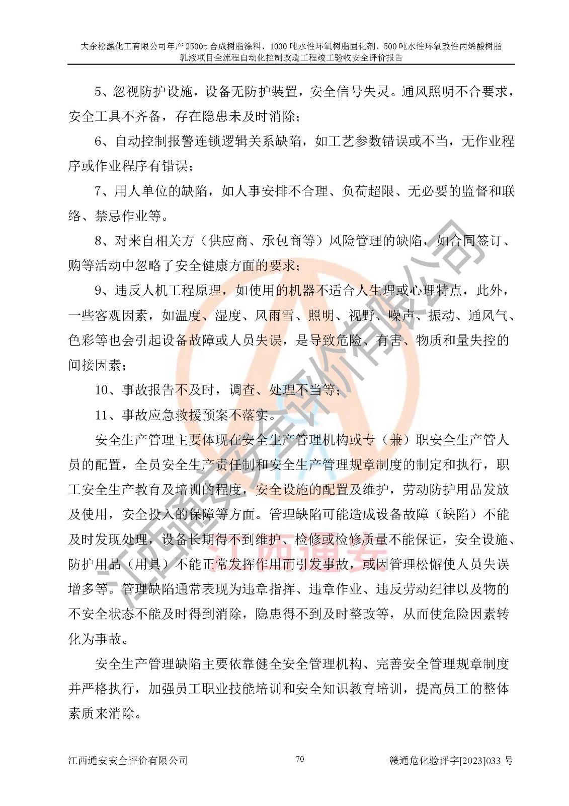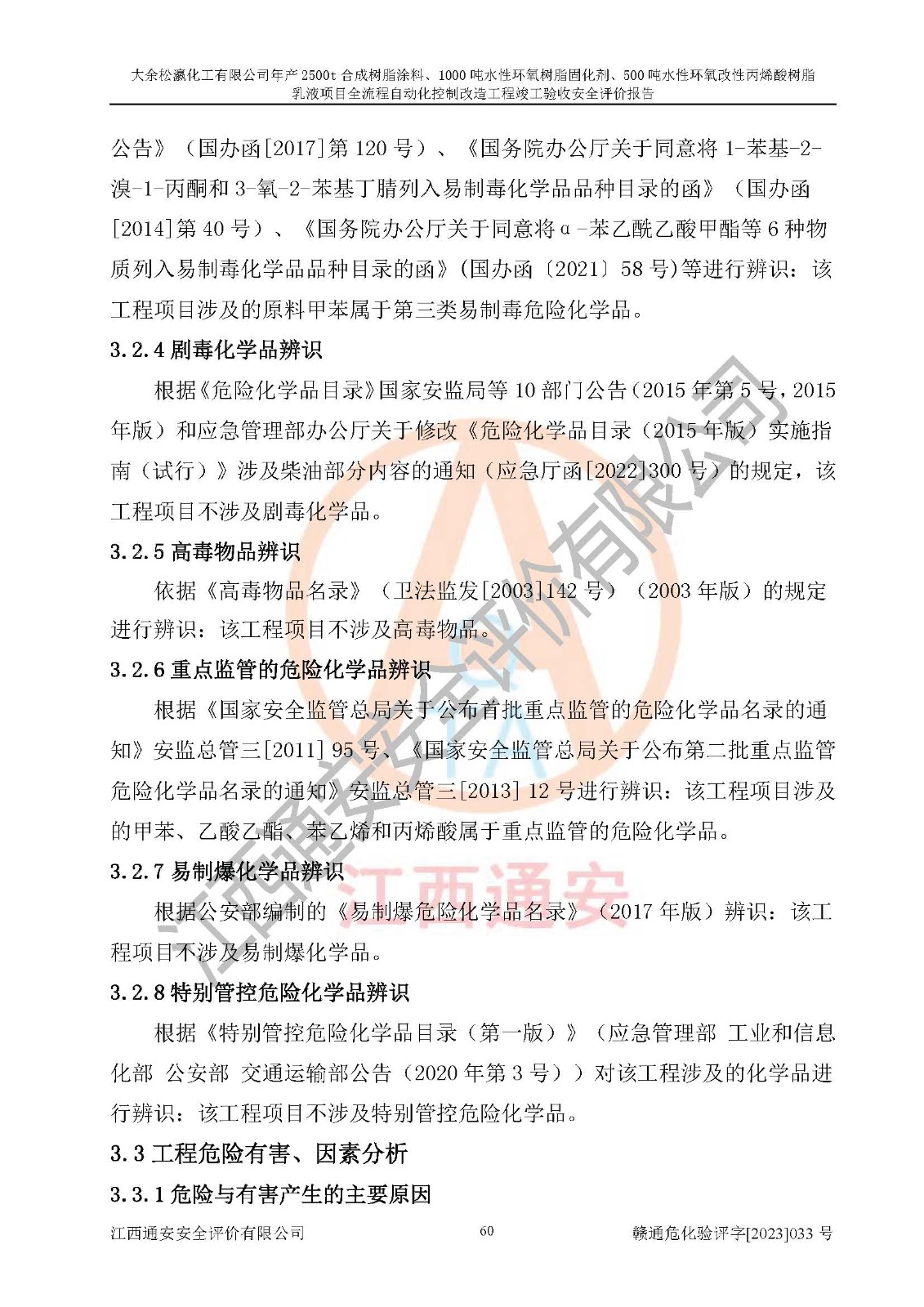 其它 | 1、該工程涉及的危險化學品有:乙酸乙酯、乙酸丁酯、二甲苯、甲苯、環(huán)己酮、環(huán)氧樹脂、丙烯酸樹脂等聚合物樹脂、合成樹脂涂料(環(huán)氧樹脂涂料、醇酸樹脂涂料、丙烯酸樹脂涂料),引發(fā)劑(過二硫酸銨)、環(huán)氧稀釋劑、二甲基乙醇胺、丙烯酸、丙烯酸丁酯、苯乙烯、甲基丙烯酸甲酯、柴油(柴油發(fā)電機用)。 2、該工程中存在的主要危險有:火災爆炸、中毒窒息、灼燙、觸電、機械傷害、高處墜落、物體打擊等。其中火災爆炸、中毒和窒息是*主要的危險因素。 3、該工程涉及的各種化學品中,甲苯屬于第三類易制毒危險化學品,不涉及易制爆化學品,甲苯、乙酸乙酯、苯乙烯和丙烯酸屬于重點監(jiān)管危險化學品,不涉及特別管控危險化學品,不涉及高毒物品。 4、該公司生產單元和儲存設施單元不構成危險化學品重大危險源。 5、根據《**安全監(jiān)管總局關于公布首批重點監(jiān)管的危險化工工藝目錄的通知》(安監(jiān)總管三〔2009〕116號)和《**安全監(jiān)管總局關于公布第二批重點監(jiān)管危險化工工藝目錄和調整首批重點監(jiān)管危險化工工藝中部分典型工藝的通知》(安監(jiān)總管三〔2013〕3號)進行危險工藝辨識:該工程不涉及重點監(jiān)管的危險化工工藝。 6、通過作業(yè)條件危險性分析評價結果:在選定的電氣作業(yè)、檢修作業(yè)、自動化作業(yè)的3個單元作業(yè)條件的危險等級均在“可能危險,需要注意”或“稍有危險、或許可以接受的范圍。作業(yè)條件相對安全。 7、全流程自動化控制改造設計方案落實情況:大余松瀛化工有限公司年產2500t合成樹脂涂料、1000噸水性環(huán)氧樹脂固化劑、500噸水性環(huán)氧改性丙烯酸樹脂乳液項目全流程自動化控制改造工程由江西省化學工業(yè)設計院根據《江西省應急管理廳關于印發(fā)<江西省化工企業(yè)自動化提升實施方案>(試行)的通知》(贛應急字[2021]190號)等相關規(guī)范、規(guī)定、標準及文件的要求負責編制了《大余松瀛化工有限公司年產2500t合成樹脂涂料、1000噸水性環(huán)氧樹脂固化劑、500噸水性環(huán)氧改性丙烯酸樹脂乳液項目全流程自動化控制改造設計方案》,并通過了專家審查。該工程由鄭州飛世爾科技有限公司負責安裝、調試,并出具了《大余松瀛化工有限公司PLC自動化控制系統(tǒng)改造項目調試報告》,調試結論:調試完成、達工程改造的預期要求,具備驗收條件。大余松瀛化工有限公司年產2500t合成樹脂涂料、1000噸水性環(huán)氧樹脂固化劑、500噸水性環(huán)氧改性丙烯酸樹脂乳液項目全流程自動化控制改造工程的設計、安裝施工和調試單位的資質均符合要求。 經過企業(yè)整改,該改造工程現場自動化控制已按照《大余松瀛化工有限公司年產2500t合成樹脂涂料、1000噸水性環(huán)氧樹脂固化劑、500噸水性環(huán)氧改性丙烯酸樹脂乳液項目全流程自動化控制改造設計方案》要求落實到位。該公司公用工程、輔助設施能夠滿足該工程安全生產的要求。 8、該公司按要求設置了安全生產管理機構,配備了專職和兼職的安全生產管理人員,形成了***的安全生產管理網絡。 9、企業(yè)建立健全了以全員安全生產責任制為核心的安全生產管理規(guī)章制度,編制了各崗位安全操作規(guī)程和崗位安全技術規(guī)程,并嚴格監(jiān)督執(zhí)行。 10、企業(yè)建立了完善的事故應急救援體系,成立了應急救援指揮中心,編制了事故應急救援預案。對預案進行相關培訓及演練,并建立培訓演練記錄。 11、公司主要負責人、安全管理人員經培訓考核合格,實行持證上崗,其他從業(yè)人員均進行了廠內三級安全教育培訓,具備安全知識與操作技能,配備有1名化工注冊安全工程師;為從業(yè)人員配備了相應的勞動防護用品。 評價結論:項目全流程自動化控制改造設計方案中提出的控制措施已得到落實,企業(yè)控制系統(tǒng)設置情況與設計方案一致,設計、施工和調試單位由有**相應資質的自控系統(tǒng)施工單位進行施工,并對自動控制系統(tǒng)調試合格,出具了竣工圖,安全風險程度是可以接受的,安全風險可控,滿足《江西省應急管理廳關于印發(fā)<江西省化工企業(yè)自動化提升實施方案>(試行)的通知》(贛應急字[2021]190號)的要求,具備全流程自動化控制改造工程竣工驗收條件。 | ||||