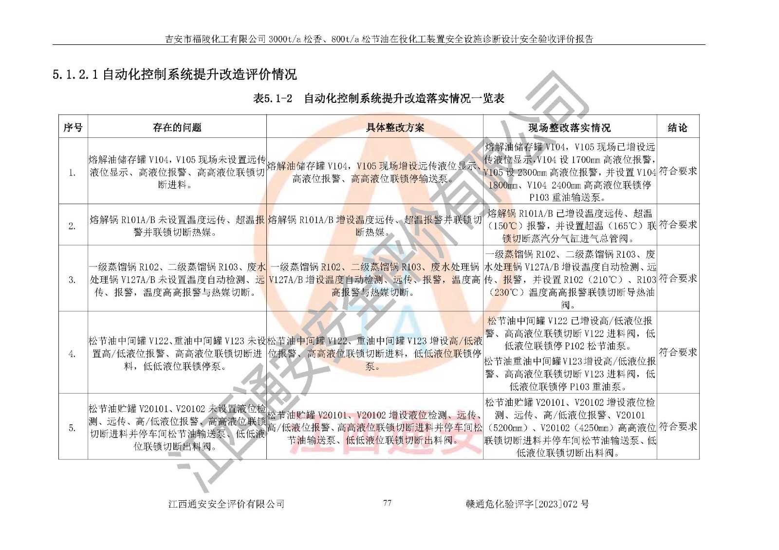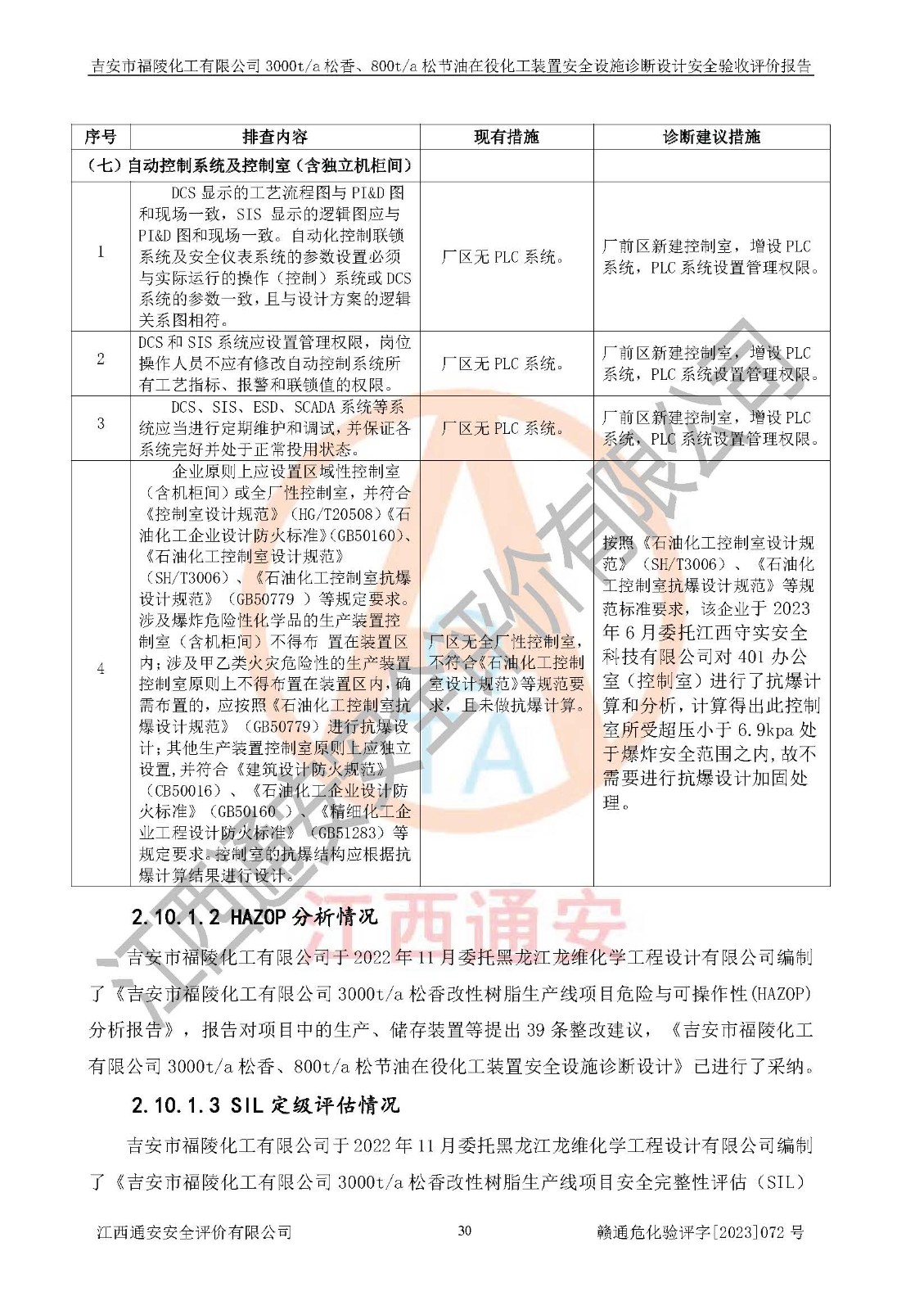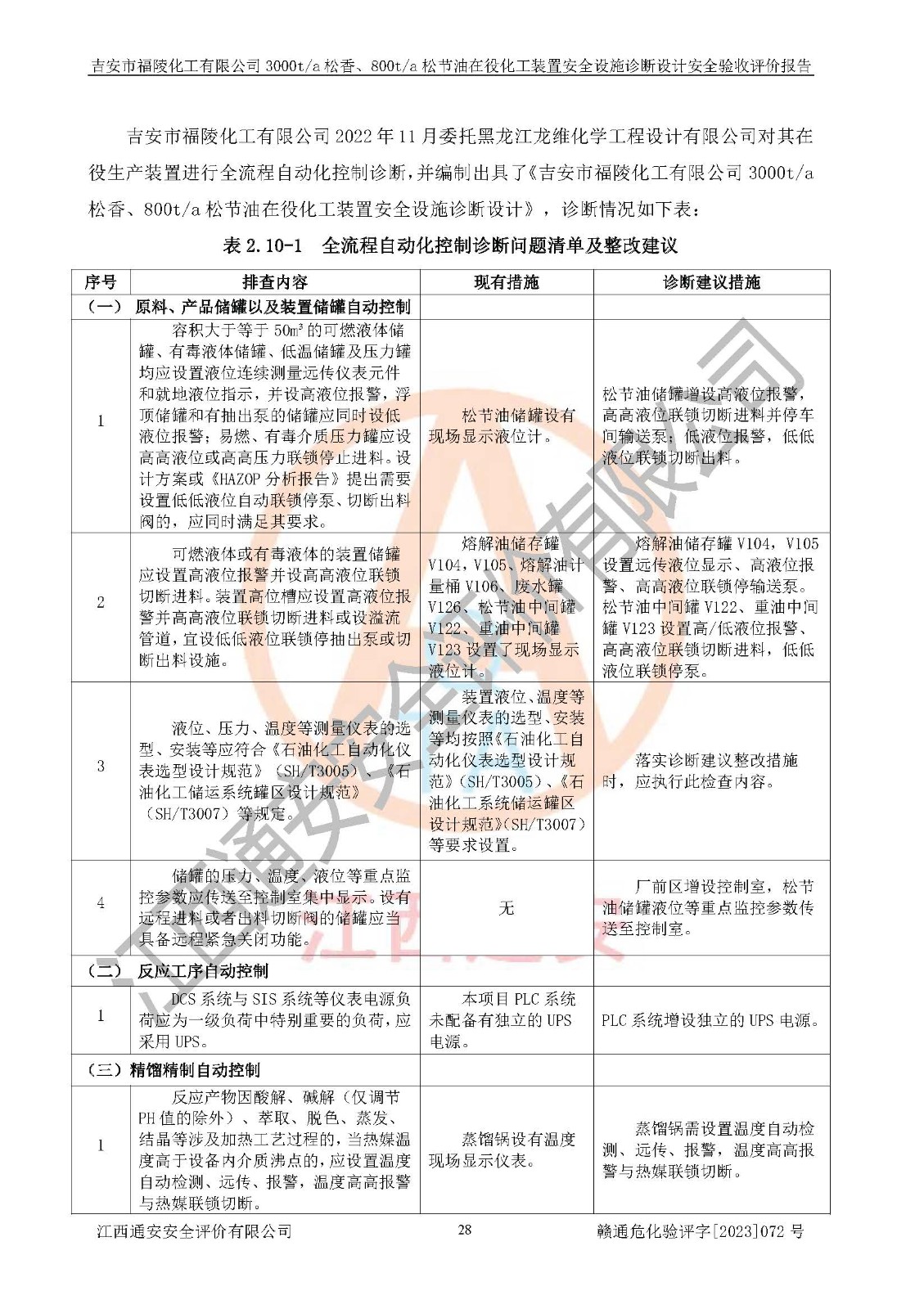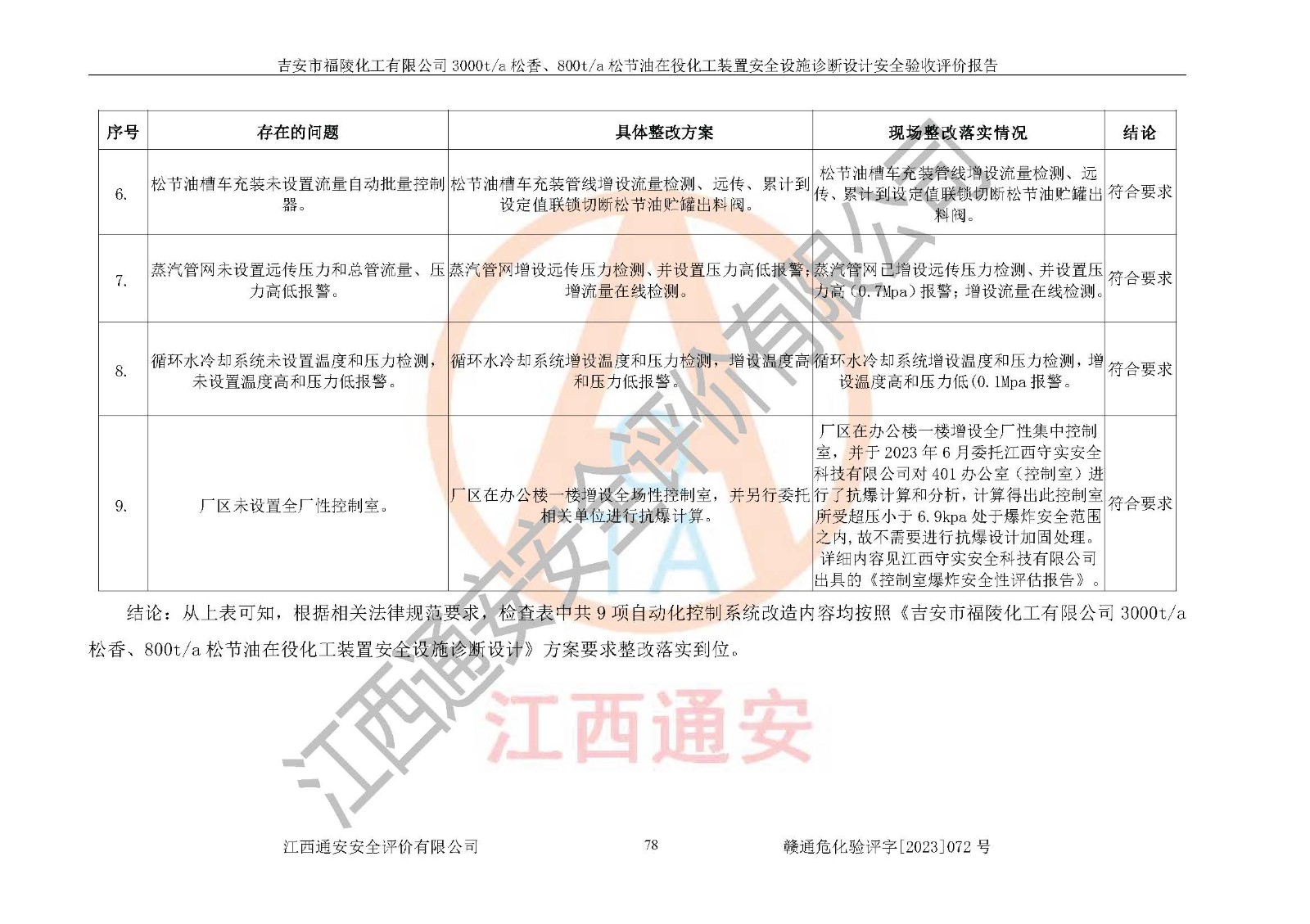 評價結論 | 評價結論:本報告認為,吉安市福陵化工有限公司3000t/a松香、800t/a松節(jié)油在役化工裝置安全設施診斷設計方案中提出的整改和控制措施已得到落實,企業(yè)控制系統設置情況與設計方案一致,由具有**相應資質的單位進行設計、施工,施工單位對自動控制系統調試合格,并出具了竣工圖,安全設施及安全管理符合**及有關部門關于安全生產法律、法規(guī)、標準的要求,安全風險程度是可以接受的,安全風險可控,滿足《江西省應急管理廳關于印發(fā)<江西省化工企業(yè)自動化提升實施方案>(試行)的通知》(贛應急字[2021]190號)的要求,具備安全設計診斷問題整改及全流程自動化控制改造工程竣工驗收條件。 | |||