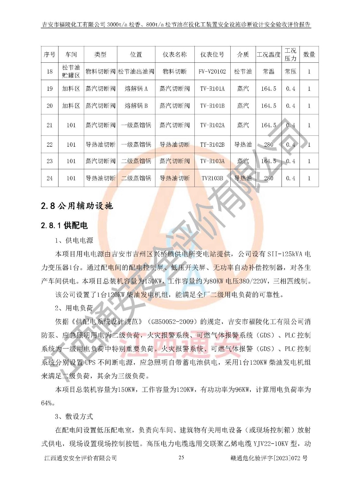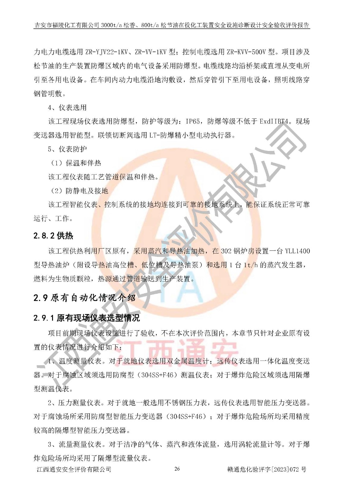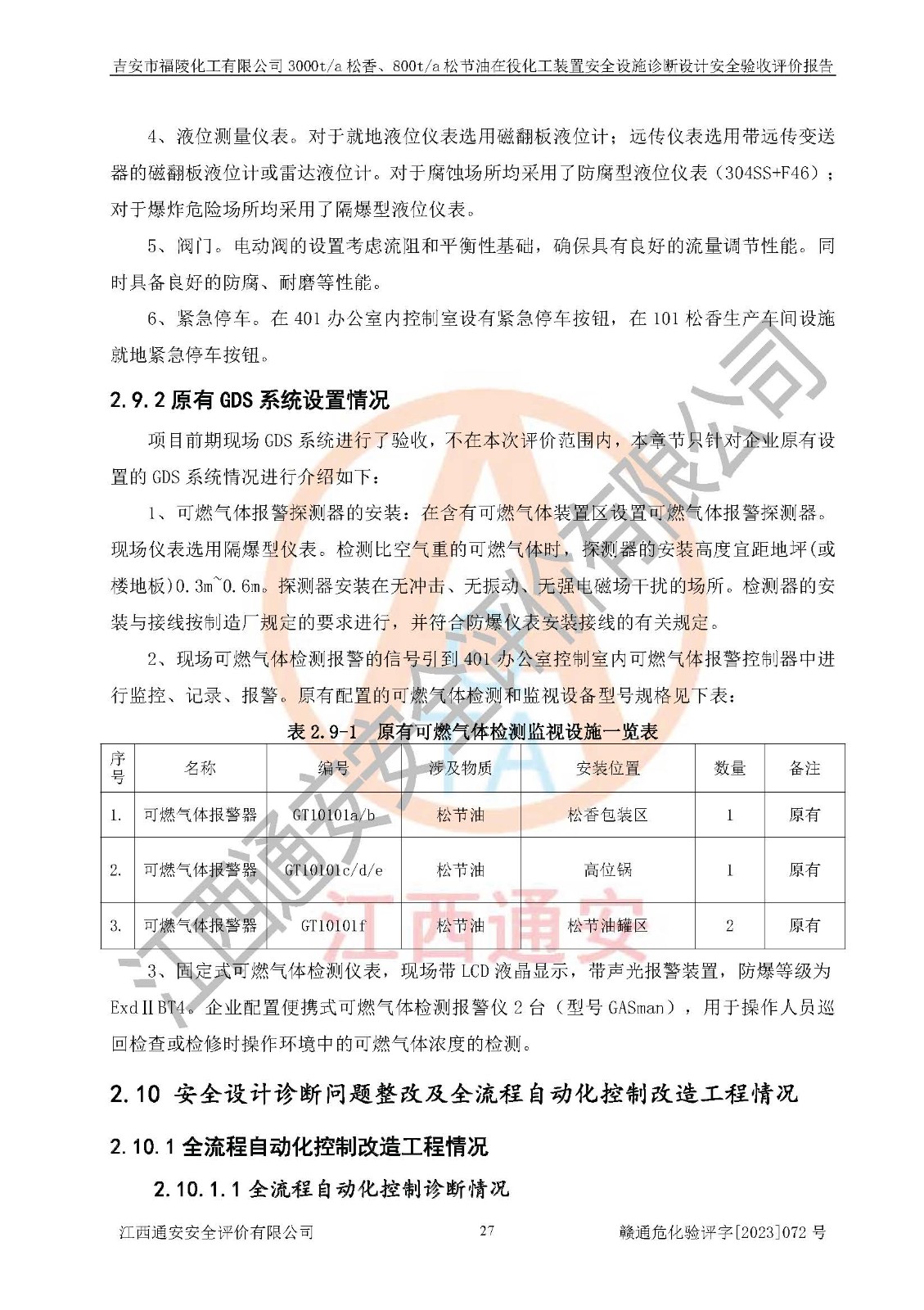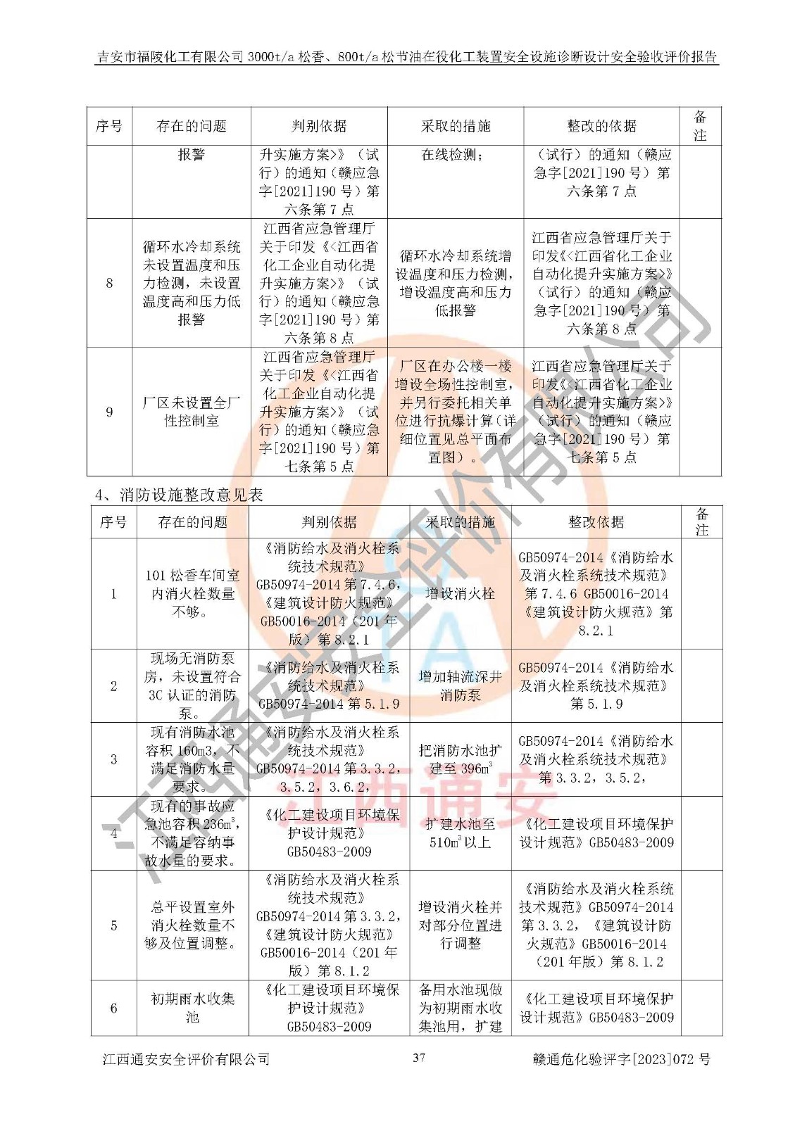 評價結論 | 評價結論:本報告認為,吉安市福陵化工有限公司3000t/a松香、800t/a松節(jié)油在役化工裝置安全設施診斷設計方案中提出的整改和控制措施已得到落實,企業(yè)控制系統設置情況與設計方案一致,由具有**相應資質的單位進行設計、施工,施工單位對自動控制系統調試合格,并出具了竣工圖,安全設施及安全管理符合**及有關部門關于安全生產法律、法規(guī)、標準的要求,安全風險程度是可以接受的,安全風險可控,滿足《江西省應急管理廳關于印發(fā)<江西省化工企業(yè)自動化提升實施方案>(試行)的通知》(贛應急字[2021]190號)的要求,具備安全設計診斷問題整改及全流程自動化控制改造工程竣工驗收條件。 | |||