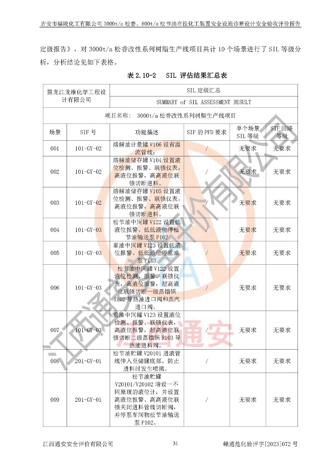 項目簡介 | 吉安市福陵化工有限公司成立于2007年10月19日,注冊地位于江西省吉安市吉州區(qū)興橋鎮(zhèn)秀江村,法定**人為羅桂昌。統一社會信用代碼:913608026674718712,企業(yè)類型:有限責任公司(自然人投資或控股),經營范圍包括改性樹脂、改性松香、林化工產品(不含危險品、劇毒品)、建材加工、生產銷售,附產品松香、松節(jié)油。(以上經營項目涉及**行政許可的憑**行政許可經營)** 。 吉安市福陵化工有限公司于2022年委托黑龍江龍維化學工程設計有限公司對3000t/a松香、800t/a松節(jié)油在役化工裝置進行安全設施診斷設計工作,對所提供的工藝、設備、物料、操作工況及自控聯鎖關系等資料為基礎,編制了《吉安市福陵化工有限公司3000t/a松香、800t/a松節(jié)油在役化工裝置安全設施診斷設計》,并于2022年11月4日經組織有關單位和專家進行了審查合格通過。 2023年11月,吉安市福陵化工有限公司在診斷報告的基礎上,委托黑龍江龍維化學工程設計有限公司編制了《吉安市福陵化工有限公司3000t/a松香改性樹脂生產線項目危險與可操作性(HAZOP)分析報告》和《吉安市福陵化工有限公司3000t/a松香改性樹脂生產線項目安全完整性評估(SIL)定級報告》等資料委托進行自動化控制改造設計。 | |||