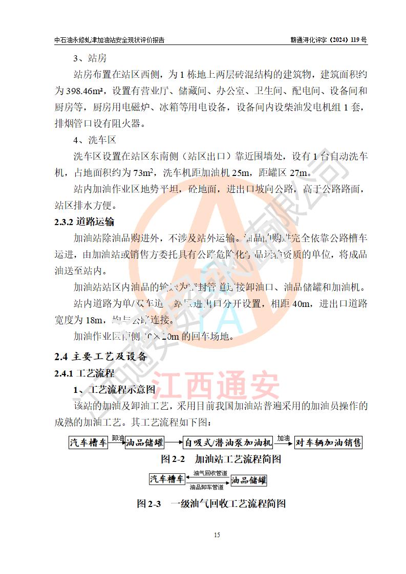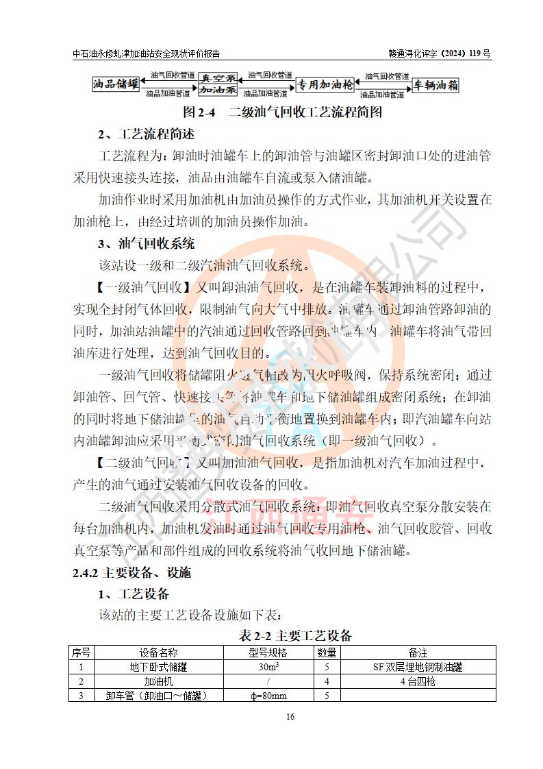 項目簡介 | 中國石油天然氣股份有限公司江西九江永修縣虬津加油站是一家專門從事成品油零售經營的股份有限公司分公司(上市、國有控股),經營場所位于江西省九江市永修縣虬津鎮(zhèn)105國道西側?,F(xiàn)有從業(yè)人員5名,其中安全管理人員1人,加油站負責人楊全榮。 該加油站占地面積4000.74m2,站區(qū)內設置有4臺四槍稅控燃油加油機及配套的工藝管線,設有SF雙層儲罐5臺,其中30m3的92#汽油儲罐2臺、30m3的95#汽油儲罐1臺、30m3的0#柴油儲罐2臺,油品儲罐總容積為150m3(折算成汽油為120m3),按現(xiàn)行《汽車加油加氣加氫站技術標準》對加油站的等級劃分原則,屬二級加油站。 該站由九江市行政審批局換發(fā)《危險化學品經營許可證》(證號:贛九行審經(甲)字[2021]000068號),**期限2021年11月07日至2024年11月06日。 | |||