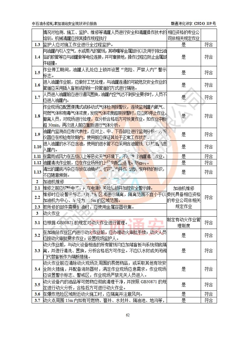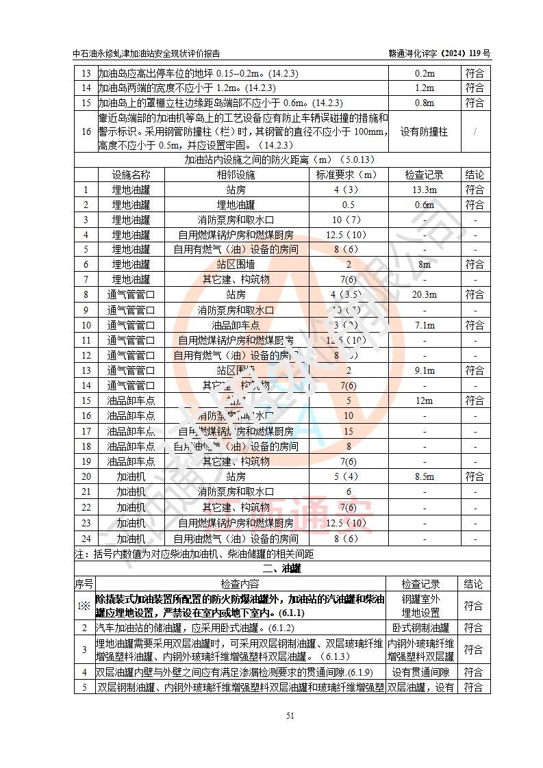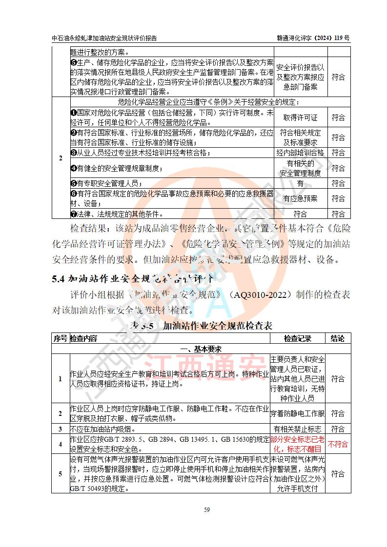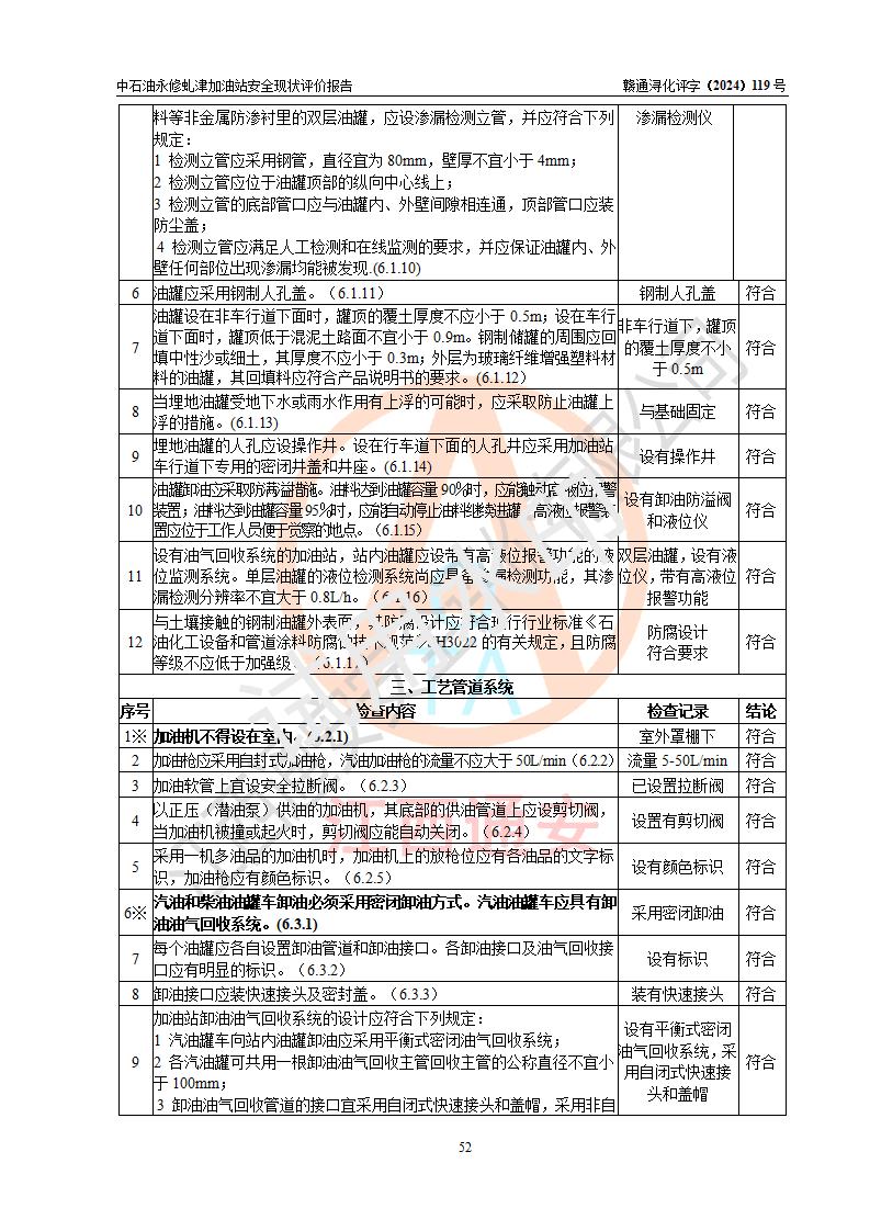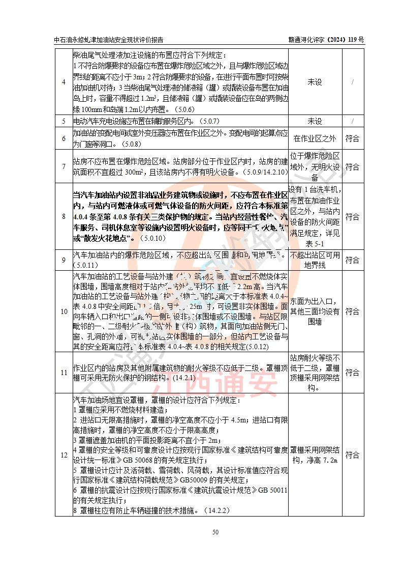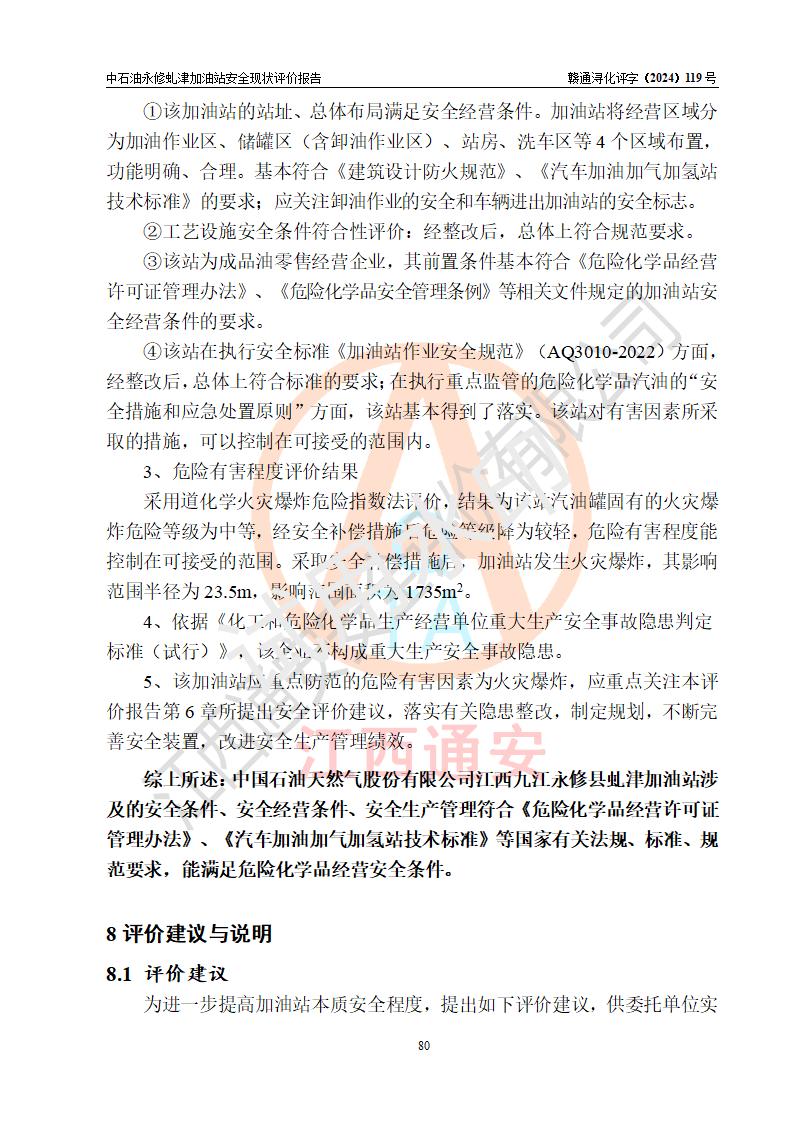 評價結論 | 中國石油天然氣股份有限公司江西九江永修縣虬津加油站涉及的安全條件、安全經營條件、安全生產管理符合《危險化學品經營許可證管理辦法》、《汽車加油加氣加氫站技術標準》等**有關法規(guī)、標準、規(guī)范要求,能滿足危險化學品經營安全條件。 | |||