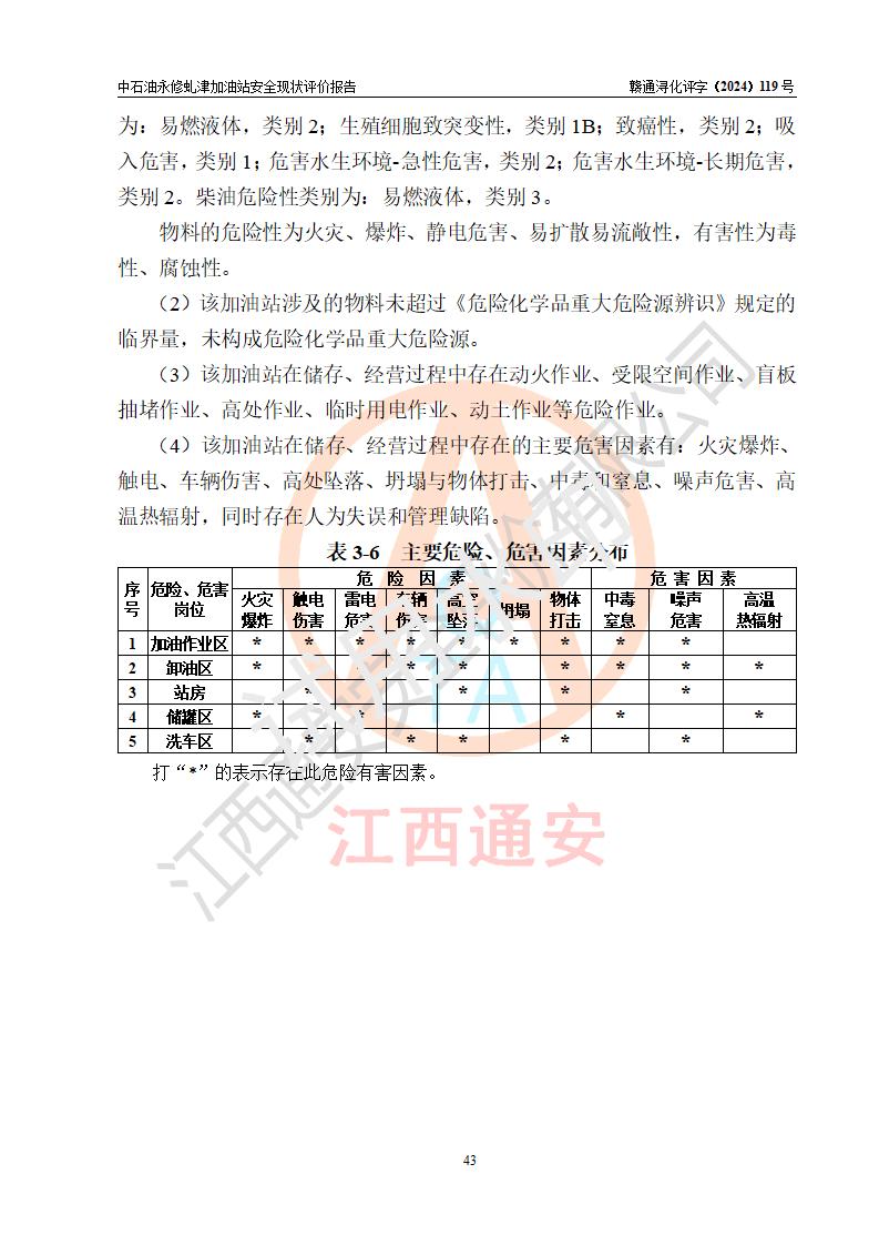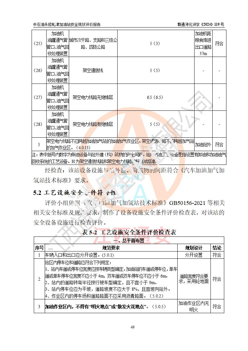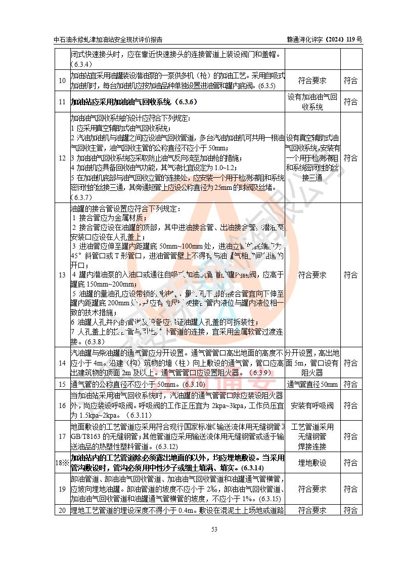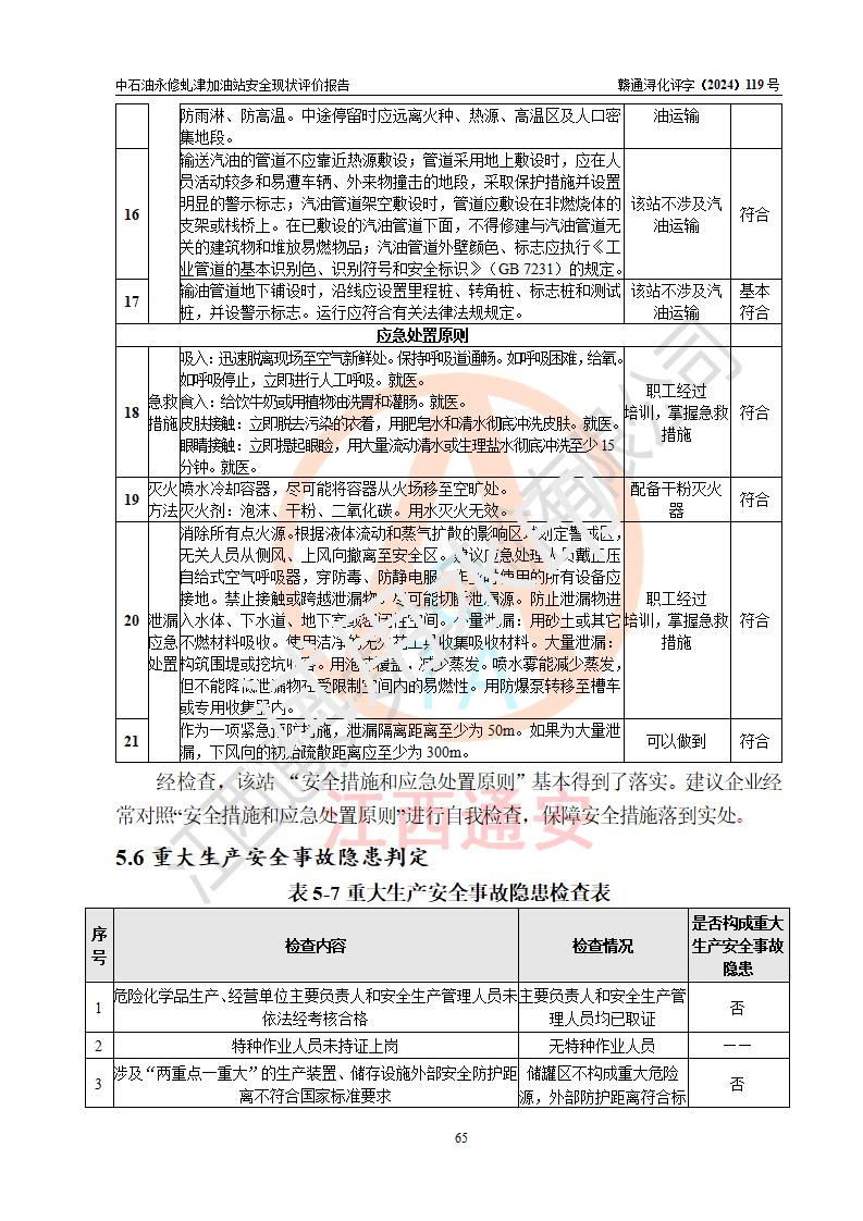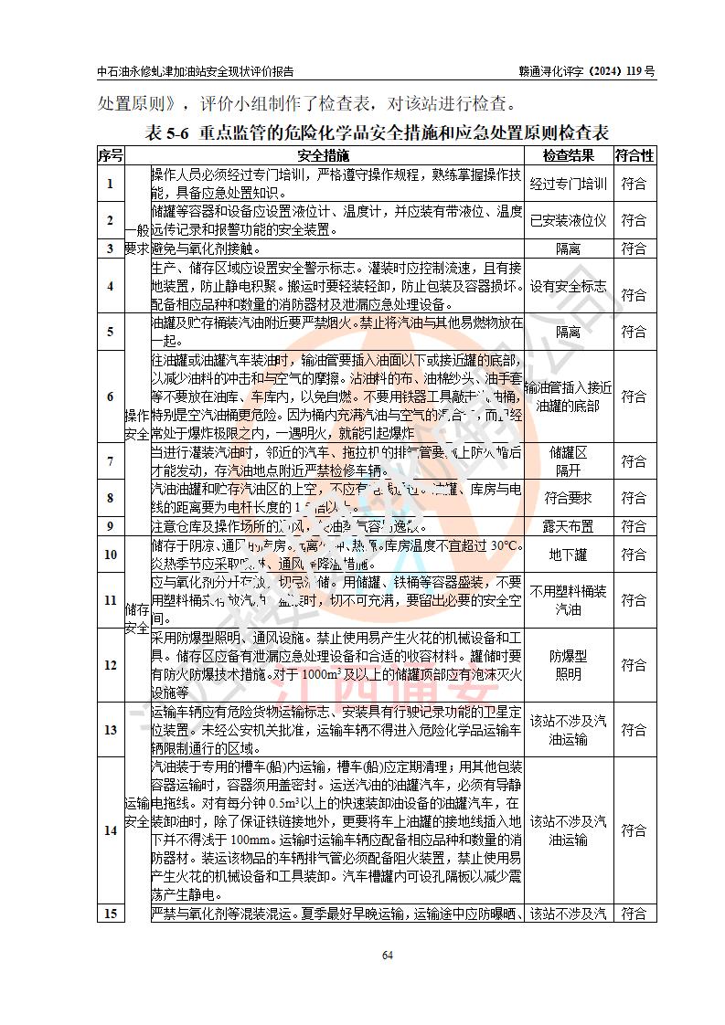 評價結論 | 中國石油天然氣股份有限公司江西九江永修縣虬津加油站涉及的安全條件、安全經營條件、安全生產管理符合《危險化學品經營許可證管理辦法》、《汽車加油加氣加氫站技術標準》等**有關法規(guī)、標準、規(guī)范要求,能滿足危險化學品經營安全條件。 | |||