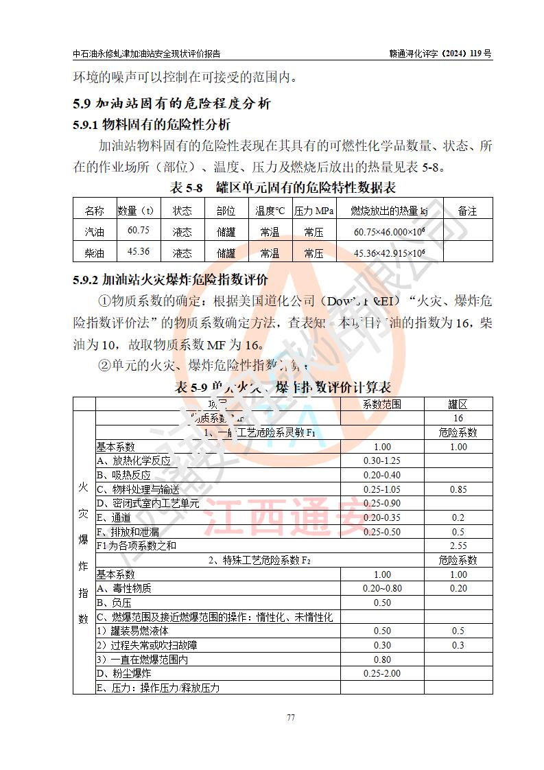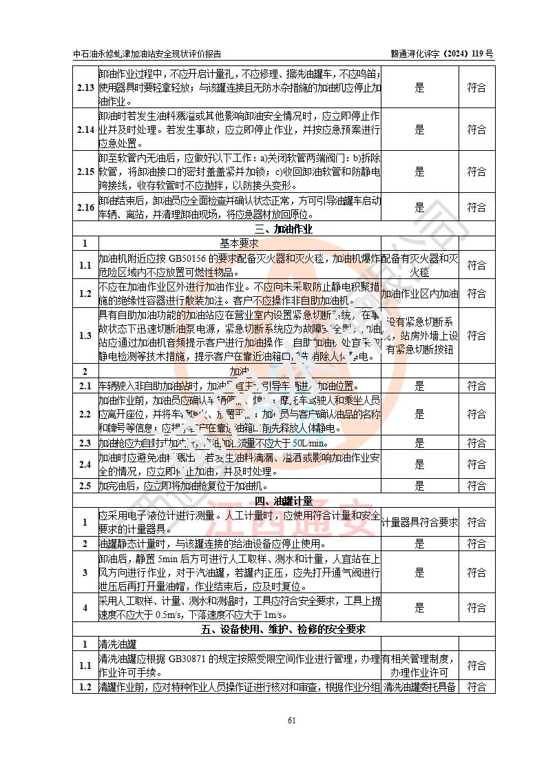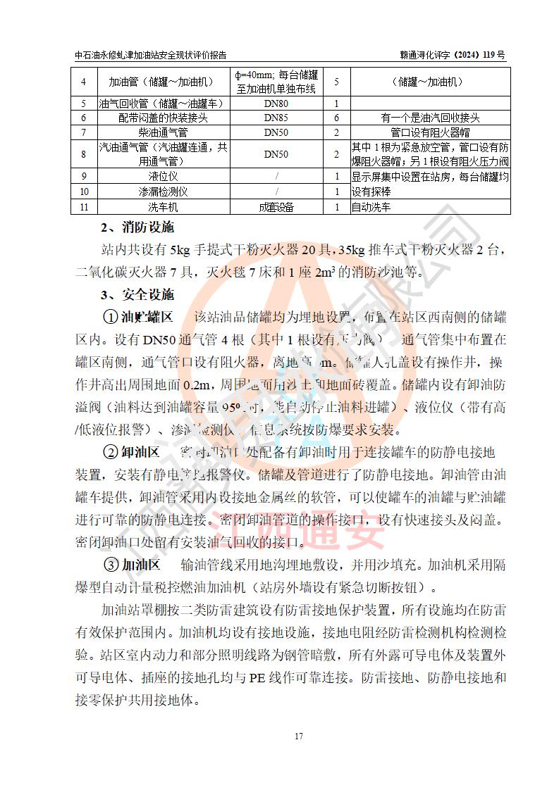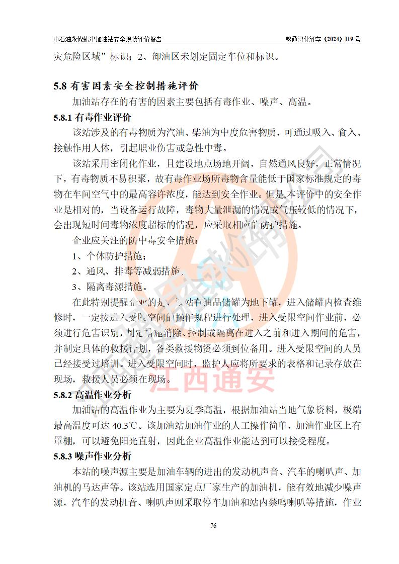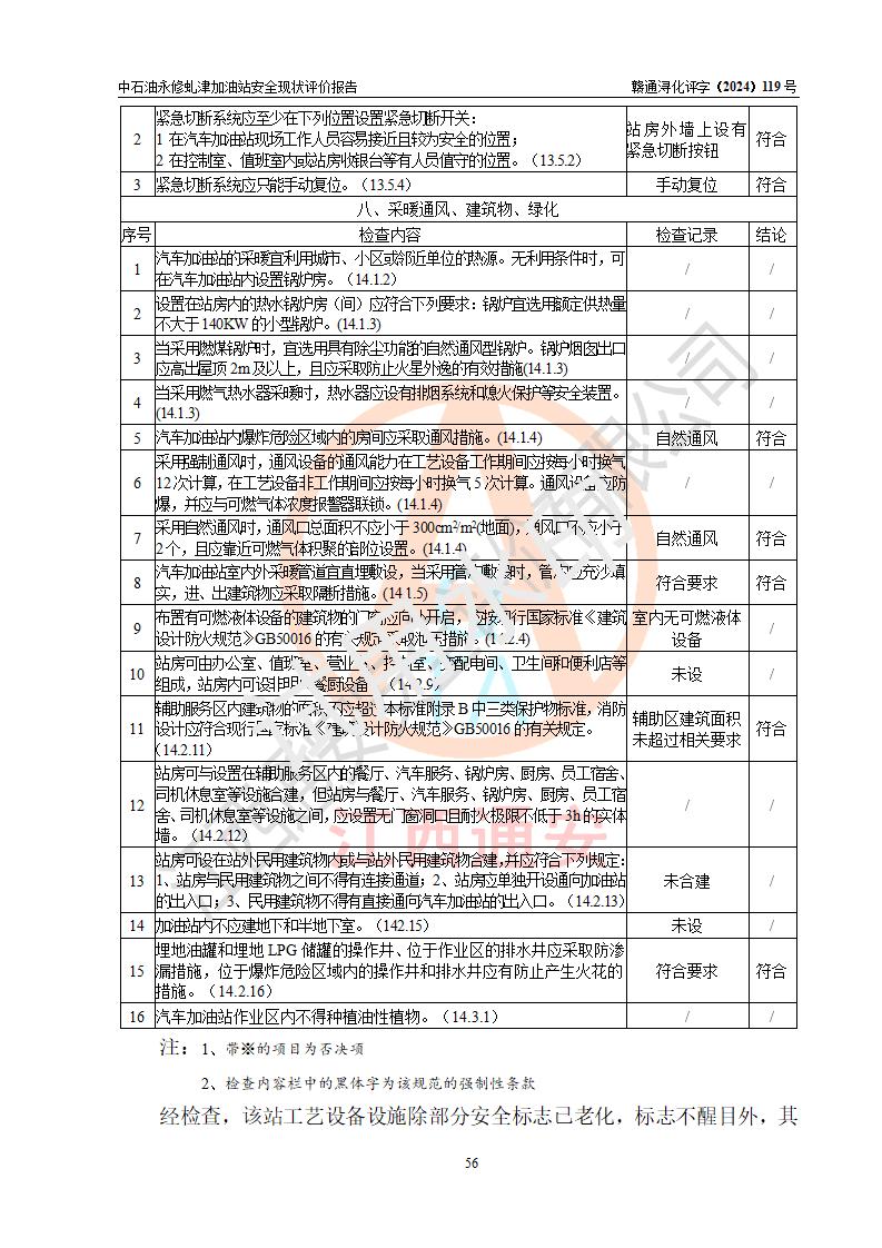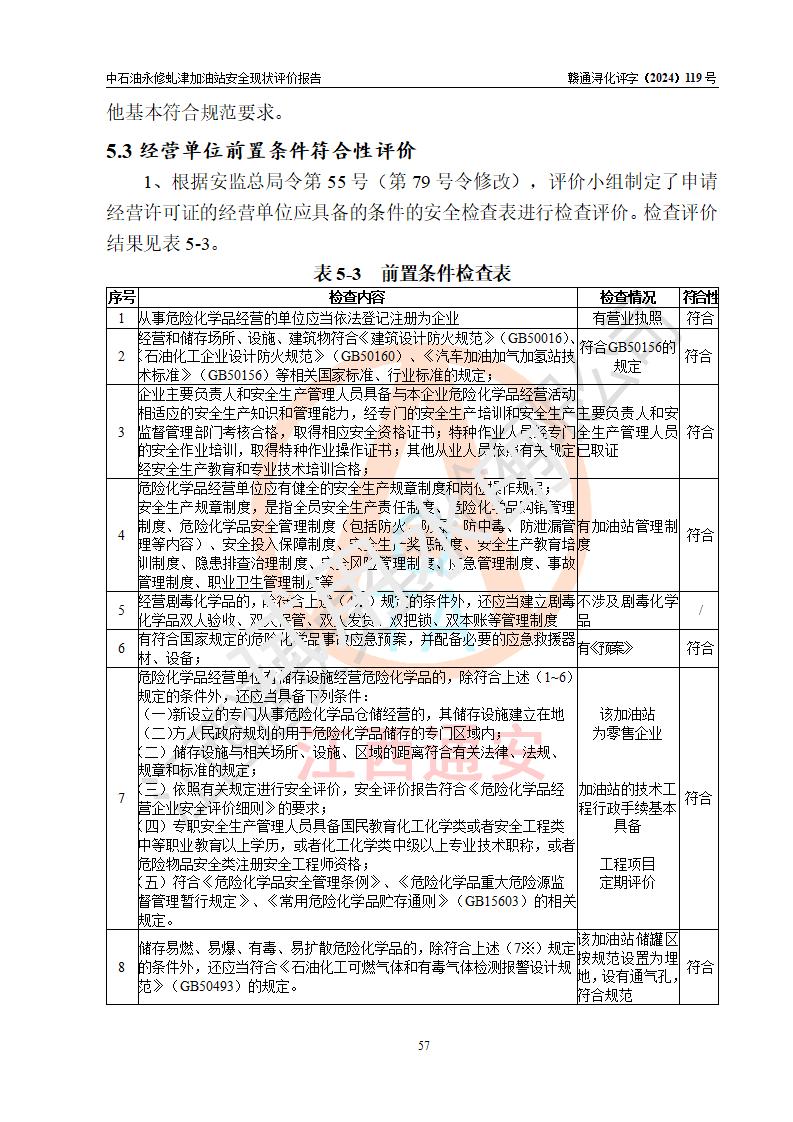 評價結論 | 中國石油天然氣股份有限公司江西九江永修縣虬津加油站涉及的安全條件、安全經營條件、安全生產管理符合《危險化學品經營許可證管理辦法》、《汽車加油加氣加氫站技術標準》等**有關法規(guī)、標準、規(guī)范要求,能滿足危險化學品經營安全條件。 | |||