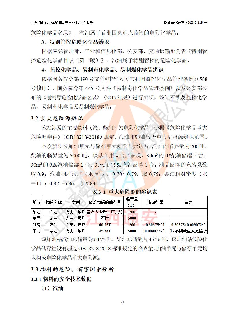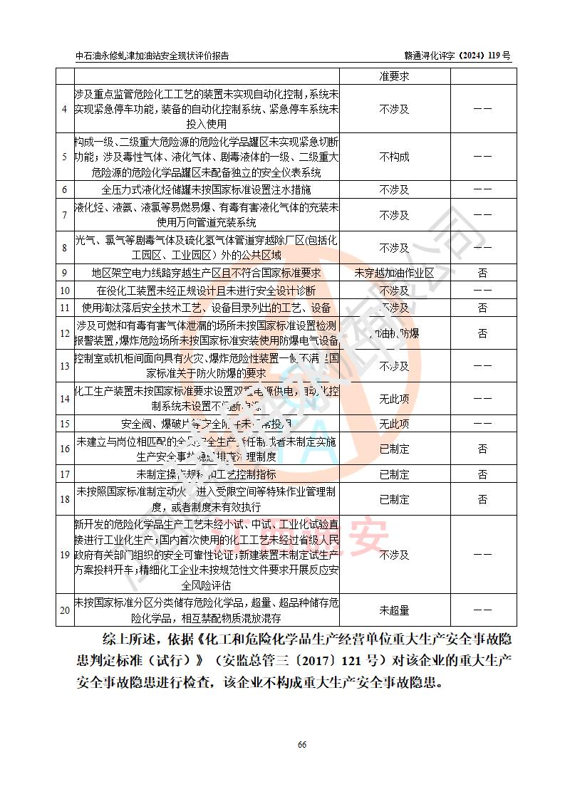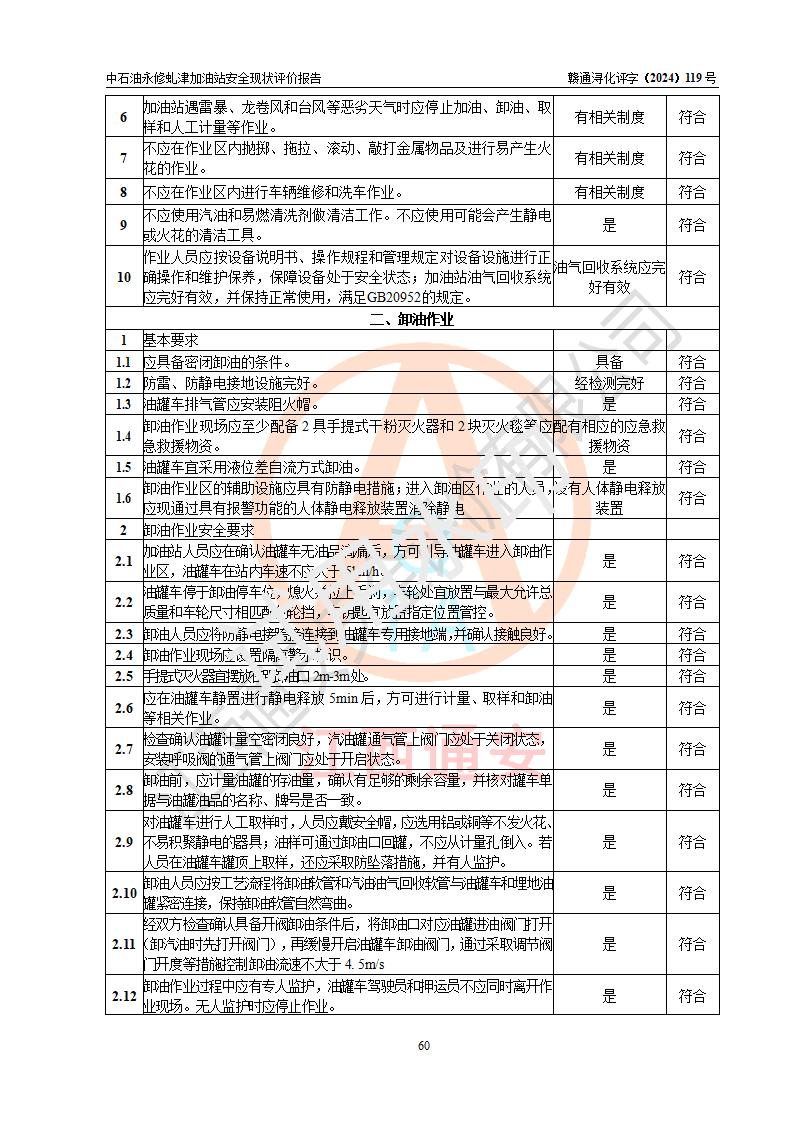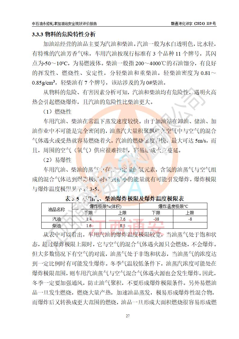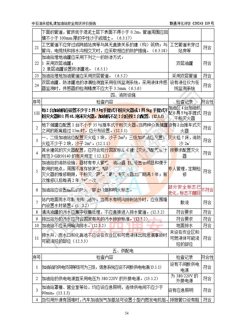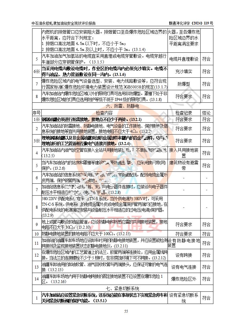 評價結論 | 中國石油天然氣股份有限公司江西九江永修縣虬津加油站涉及的安全條件、安全經營條件、安全生產管理符合《危險化學品經營許可證管理辦法》、《汽車加油加氣加氫站技術標準》等**有關法規(guī)、標準、規(guī)范要求,能滿足危險化學品經營安全條件。 | |||