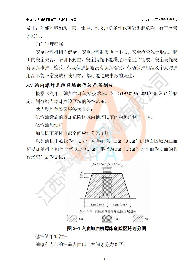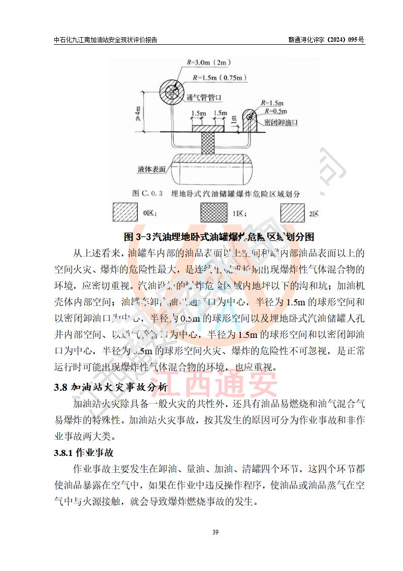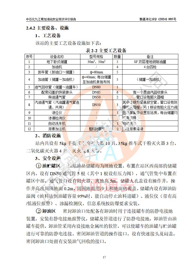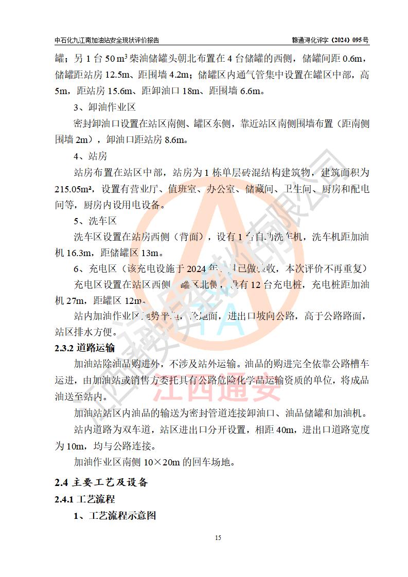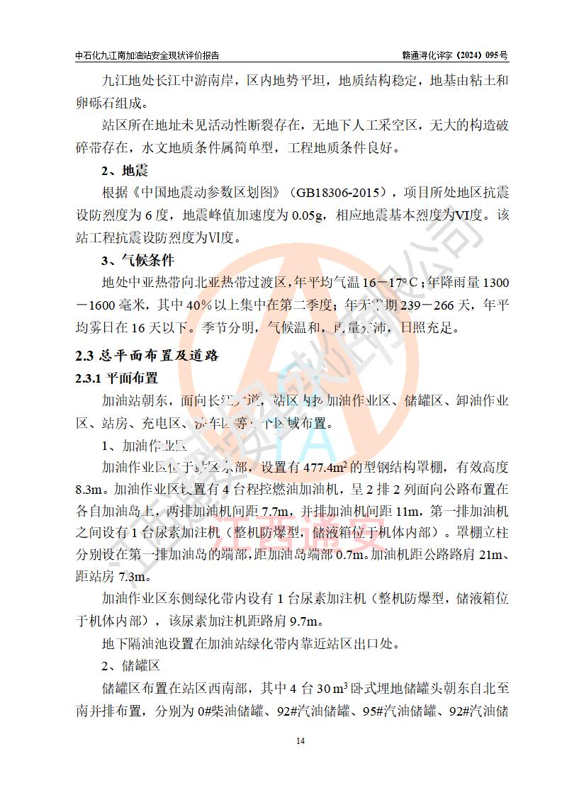 項目簡介 | 中國石化銷售股份有限公司江西九江潯陽石油分公司九江南加油站(以下簡稱“中石化九江南加油站”)是一家專門從事成品油零售經(jīng)營的有限公司分公司(外商投資企業(yè)分公司),經(jīng)營場所位于江西省九江市開發(fā)區(qū)長江大道以西高速公路以南。現(xiàn)有從業(yè)人員9名,其中安全管理人員1人,加油站負(fù)責(zé)人熊瑋。 該加油站占地面積3464.72m2,站區(qū)內(nèi)設(shè)置有4臺四槍稅控燃油加油機(jī)及配套的工藝管線,設(shè)有SF雙層儲罐5臺,其中30m3的92#汽油儲罐2臺、30m3的95#汽油儲罐1臺、30m3和50m3的0#柴油儲罐各1臺,油品儲罐總?cè)莘e為170m3(折算成汽油為130m3),按現(xiàn)行《汽車加油加氣加氫站技術(shù)標(biāo)準(zhǔn)》對加油站的等級劃分原則,屬二級加油站。 該站由九江經(jīng)濟(jì)技術(shù)開發(fā)區(qū)行政審批局換發(fā)《危險化學(xué)品經(jīng)營許可證》(證號:贛九開?;?jīng)字[2021]K00006號),**期限2021年11月23日至2024年11月22日。 | |||