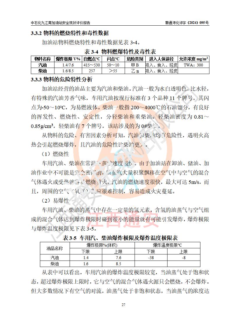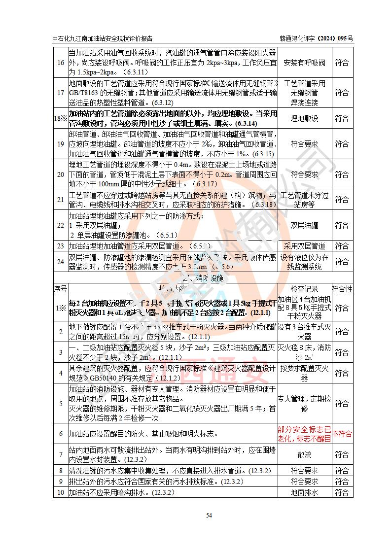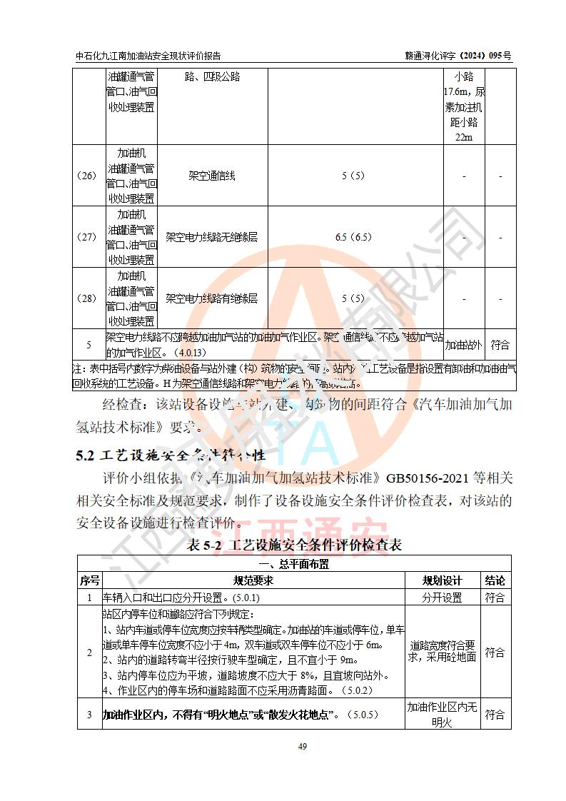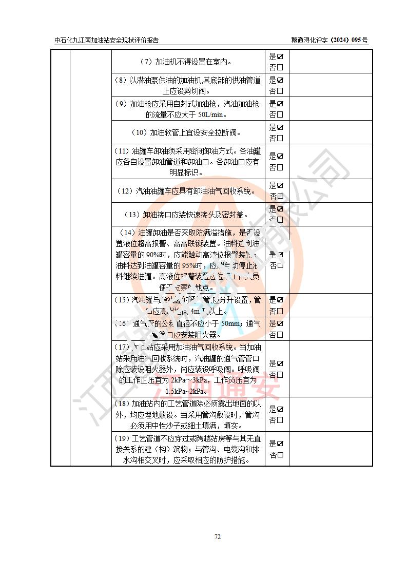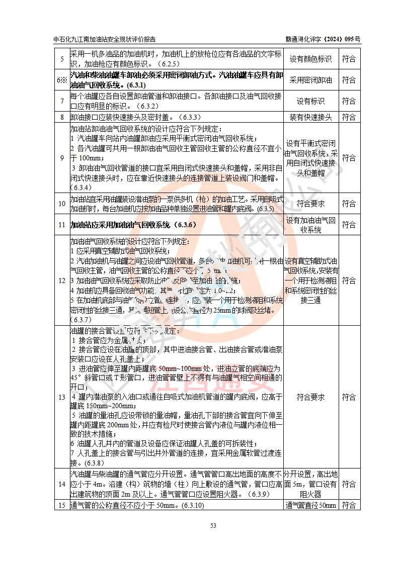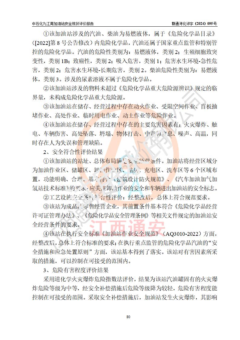 評價結(jié)論 | 中國石化銷售股份有限公司江西九江潯陽石油分公司九江南加油站涉及的安全條件、安全經(jīng)營條件、安全生產(chǎn)管理符合《危險化學(xué)品經(jīng)營許可證管理辦法》、《汽車加油加氣加氫站技術(shù)標(biāo)準(zhǔn)》等**有關(guān)法規(guī)、標(biāo)準(zhǔn)、規(guī)范要求,能滿足危險化學(xué)品經(jīng)營安全條件。 | |||
