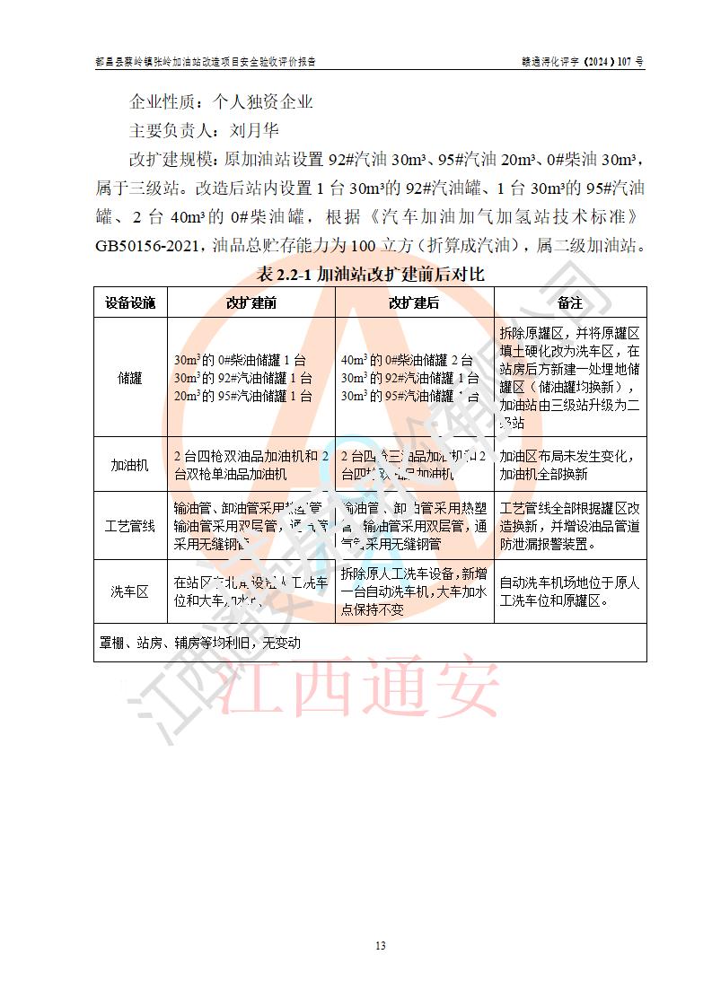 項目簡介 | 都昌縣蔡嶺鎮(zhèn)張嶺加油站是一家專門從事成品油(汽油、柴油)零售經(jīng)營的個人獨資企業(yè),注冊成立日期2014年11月05日,投資人:曾文平,主要負責(zé)人:劉月華,經(jīng)營場所位于江西省九江市都昌縣蔡嶺鎮(zhèn)張嶺曹便港橋南邊。經(jīng)營范圍:成品油(汽油、柴油等)、機油零售(依法須經(jīng)批準(zhǔn)的項目,經(jīng)相關(guān)部門批準(zhǔn)后方可開展經(jīng)營活動);該站屬于中化石油加盟站,對外宣傳名為“中化石油”。 該站由九江市行政審批局換發(fā)《危險化學(xué)品經(jīng)營許可證》(編號:贛九?;?jīng)字[2024]000005),**期限2021年09月05日至2024年09月04日;于2024年02月04日取得九江市商務(wù)局頒發(fā)的《成品油零售經(jīng)營批準(zhǔn)證書》(油零售證書第潯0362號)**期至2029年02月03日。 都昌縣蔡嶺鎮(zhèn)張嶺加油站占地面積約1889.5m2,站內(nèi)原設(shè)置有2臺四槍和2臺雙槍潛油泵程控燃油加油機及配套的工藝管線,原設(shè)埋地臥式雙層油罐3臺,其中30m3的0#柴油儲罐1臺、30m3的92#汽油儲罐1臺,20m3的95#汽油儲罐1臺,油品儲罐總?cè)莘e為65m3(柴油折半),屬三級加油站。 因加油站經(jīng)營發(fā)展需要,都昌縣蔡嶺鎮(zhèn)張嶺加油站進行加油站罐區(qū)改造,將站內(nèi)現(xiàn)有罐區(qū)及配套設(shè)施拆除,在站房后方新建一處罐區(qū),并改造相關(guān)配套設(shè)施;改造后站內(nèi)設(shè)置有4臺四槍潛油泵程控燃油加油機及配套的工藝管線,設(shè)埋地臥式雙層油罐4臺,其中40m3的0#柴油儲罐2臺、30m3的92#汽油儲罐1臺,30m3的95#汽油儲罐1臺,油品儲罐總?cè)莘e為100m3(柴油折半),按現(xiàn)行《汽車加油加氣加氫站技術(shù)標(biāo)準(zhǔn)》對加油站的等級劃分原則,屬二級加油站。 | |||