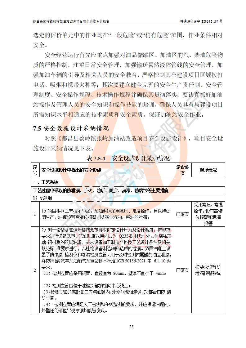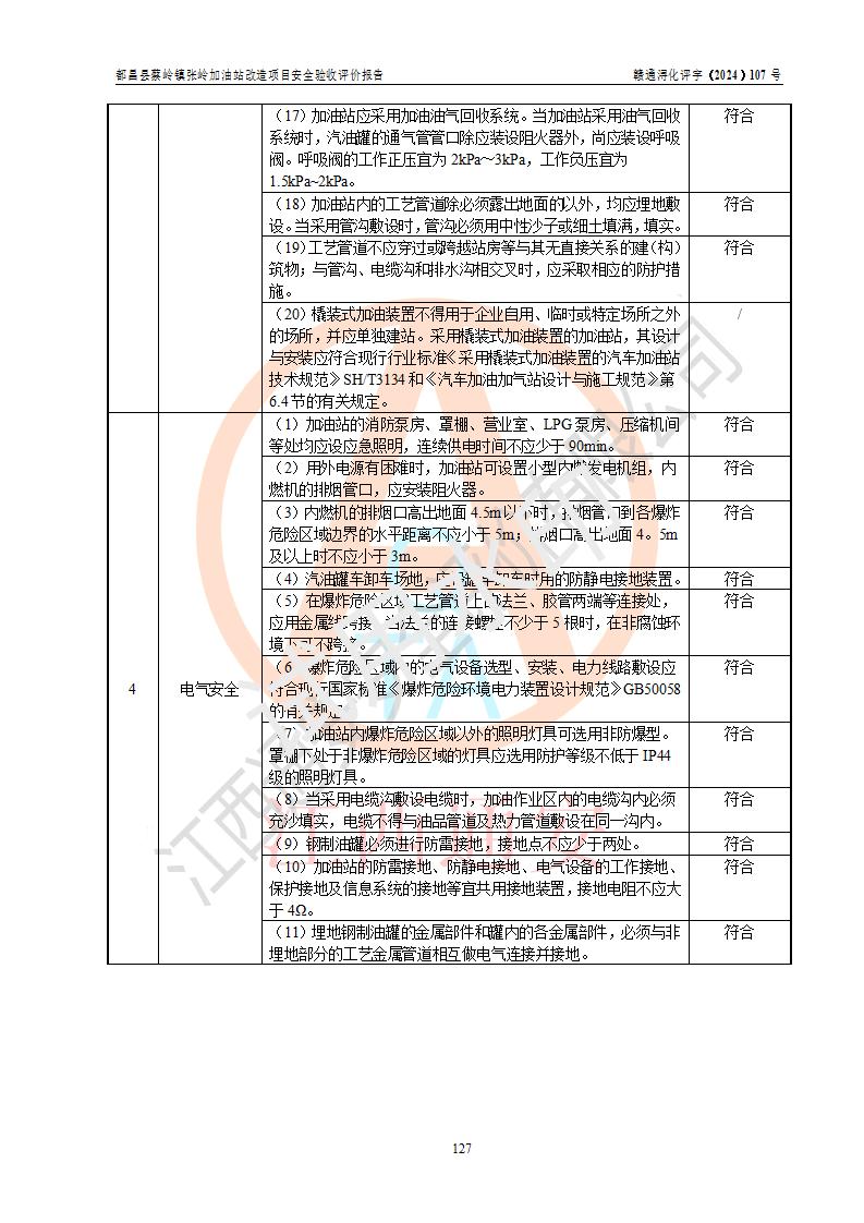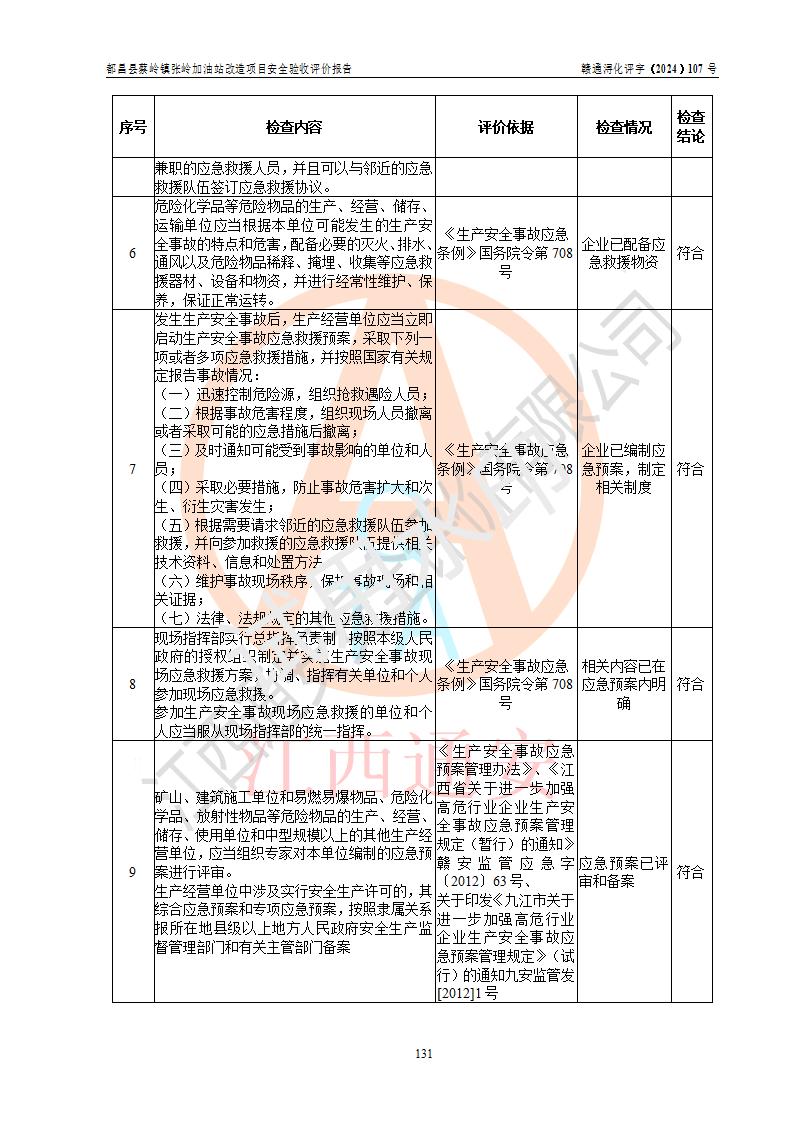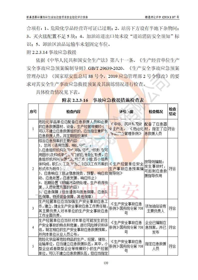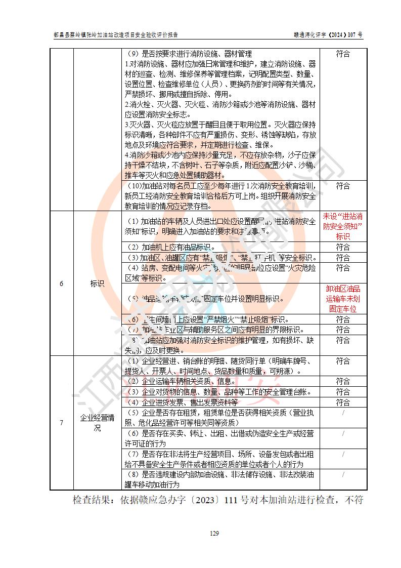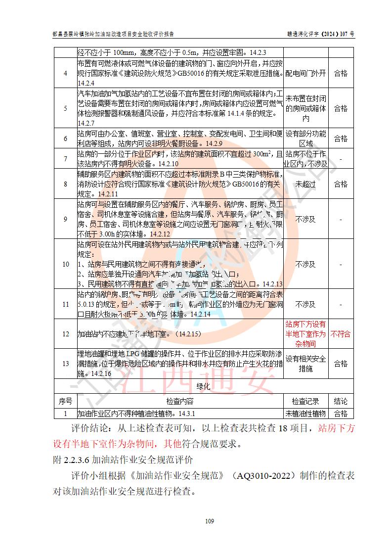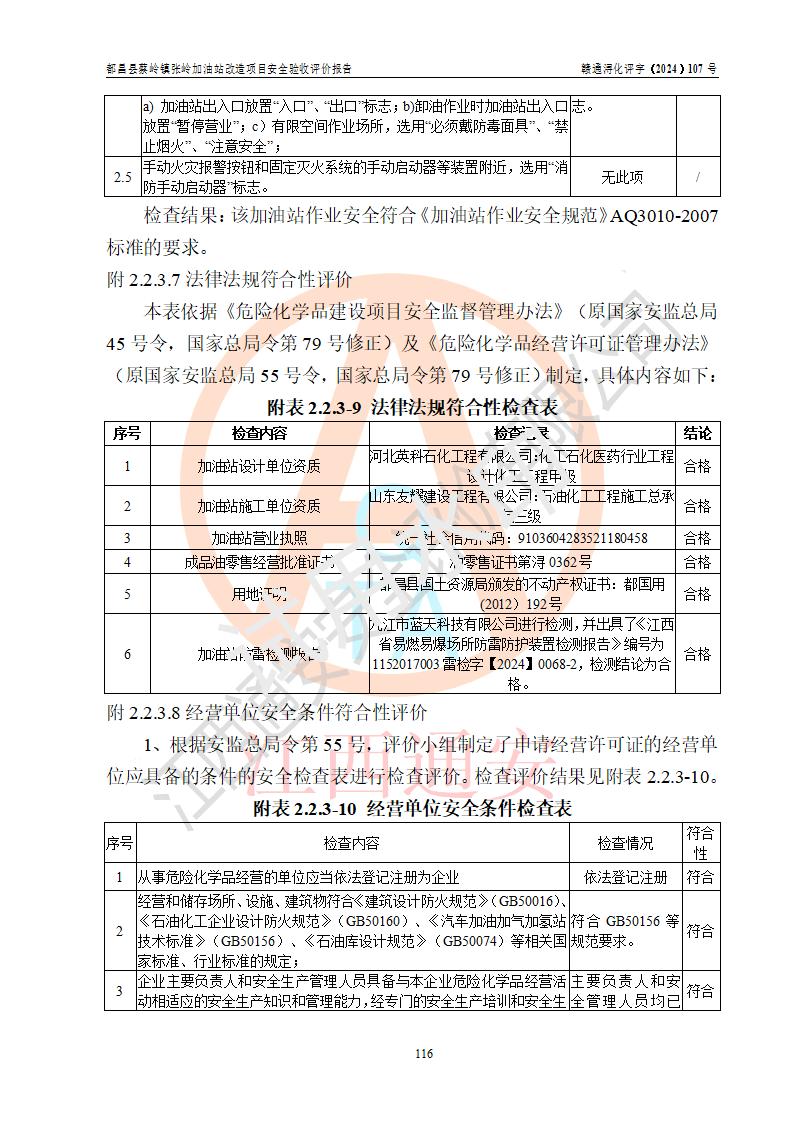 評價結(jié)論 | 都昌縣蔡嶺鎮(zhèn)張嶺加油站改造項目涉及的安全條件、安全生產(chǎn)條件、安全生產(chǎn)管理符合《危險化學(xué)品經(jīng)營許可證管理辦法》、《汽車加油加氣加氫站技術(shù)標(biāo)準(zhǔn)》等**有關(guān)法規(guī)、標(biāo)準(zhǔn)、規(guī)范要求,能滿足成品油零售經(jīng)營單位的安全條件,具備項目竣工驗收的條件。 | |||