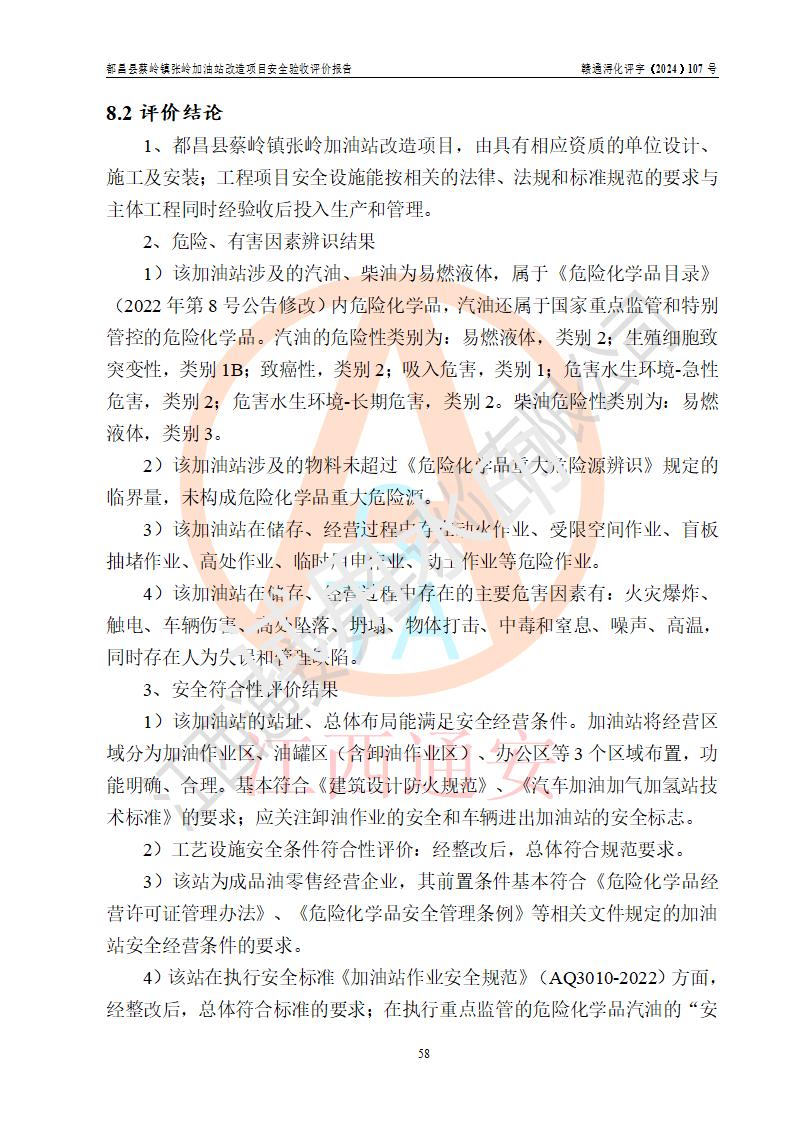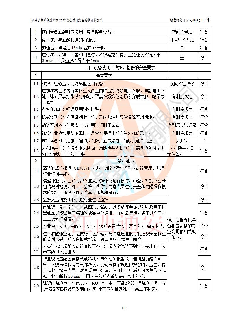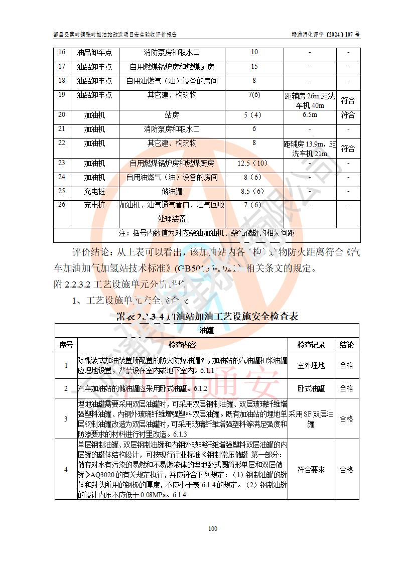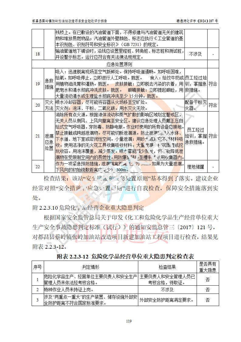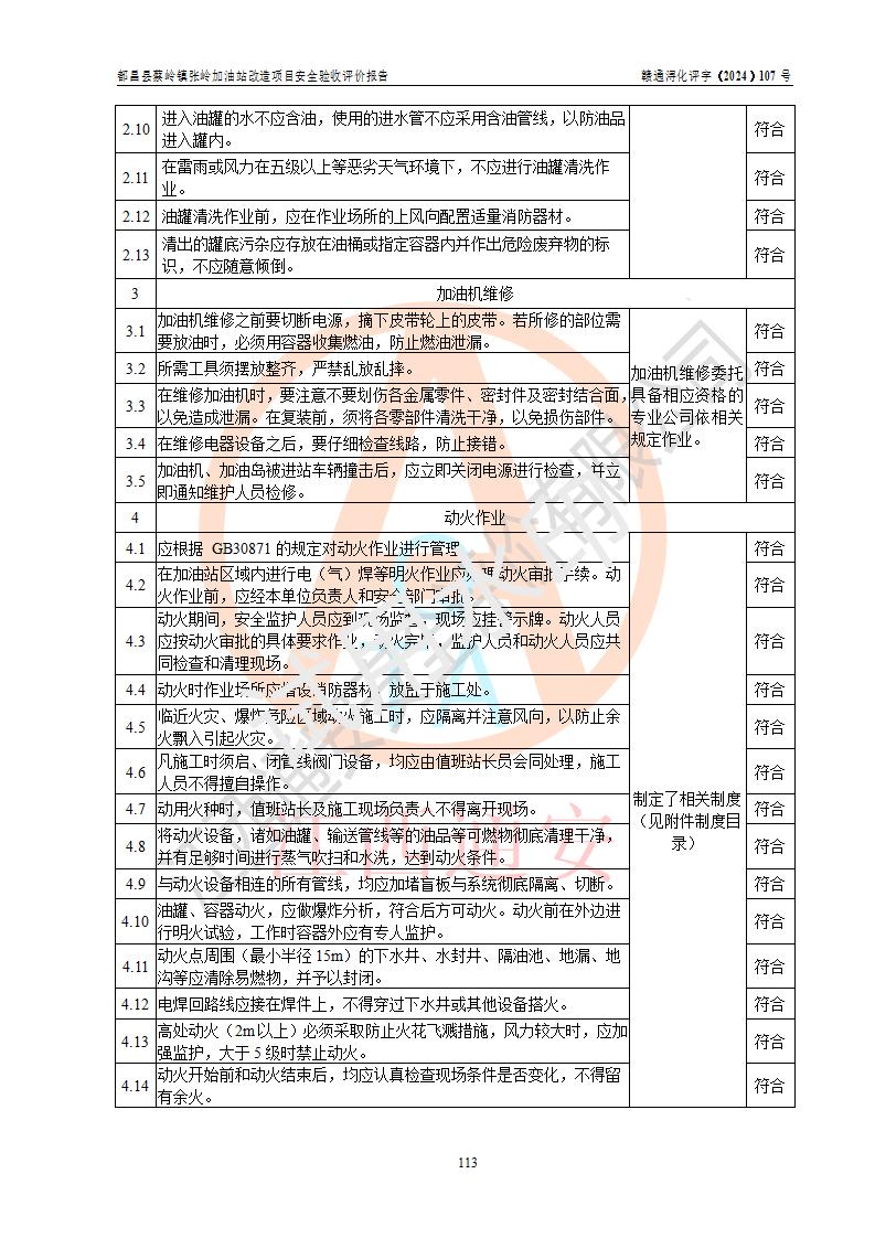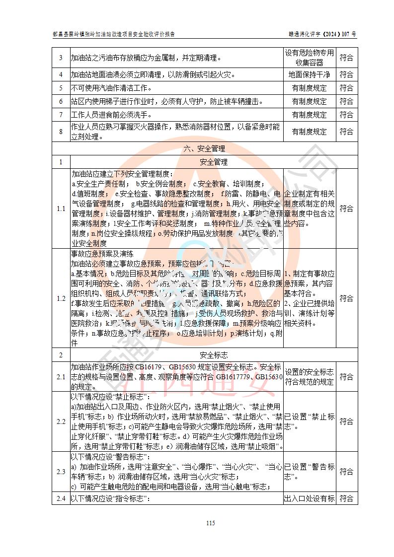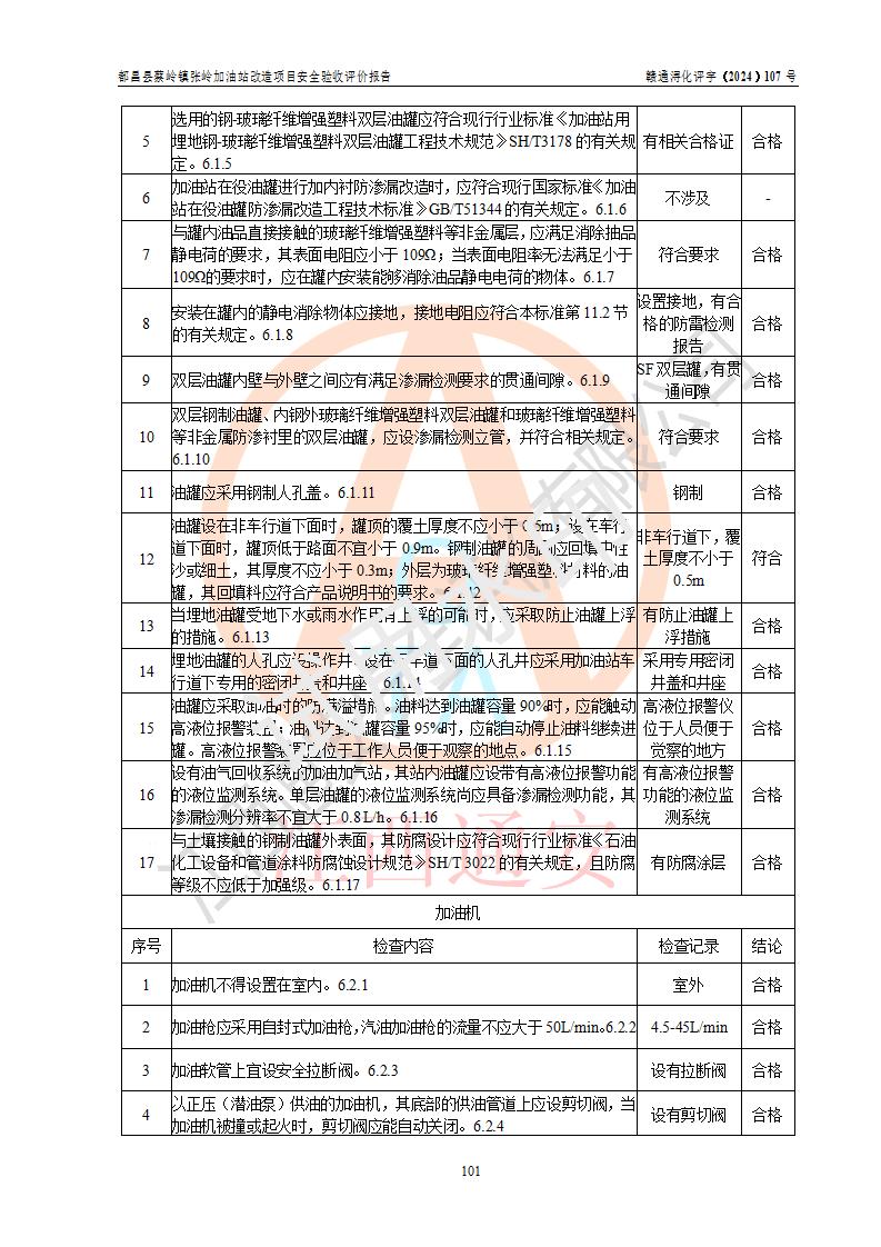 評價結(jié)論 | 都昌縣蔡嶺鎮(zhèn)張嶺加油站改造項目涉及的安全條件、安全生產(chǎn)條件、安全生產(chǎn)管理符合《危險化學(xué)品經(jīng)營許可證管理辦法》、《汽車加油加氣加氫站技術(shù)標(biāo)準(zhǔn)》等**有關(guān)法規(guī)、標(biāo)準(zhǔn)、規(guī)范要求,能滿足成品油零售經(jīng)營單位的安全條件,具備項目竣工驗收的條件。 | |||