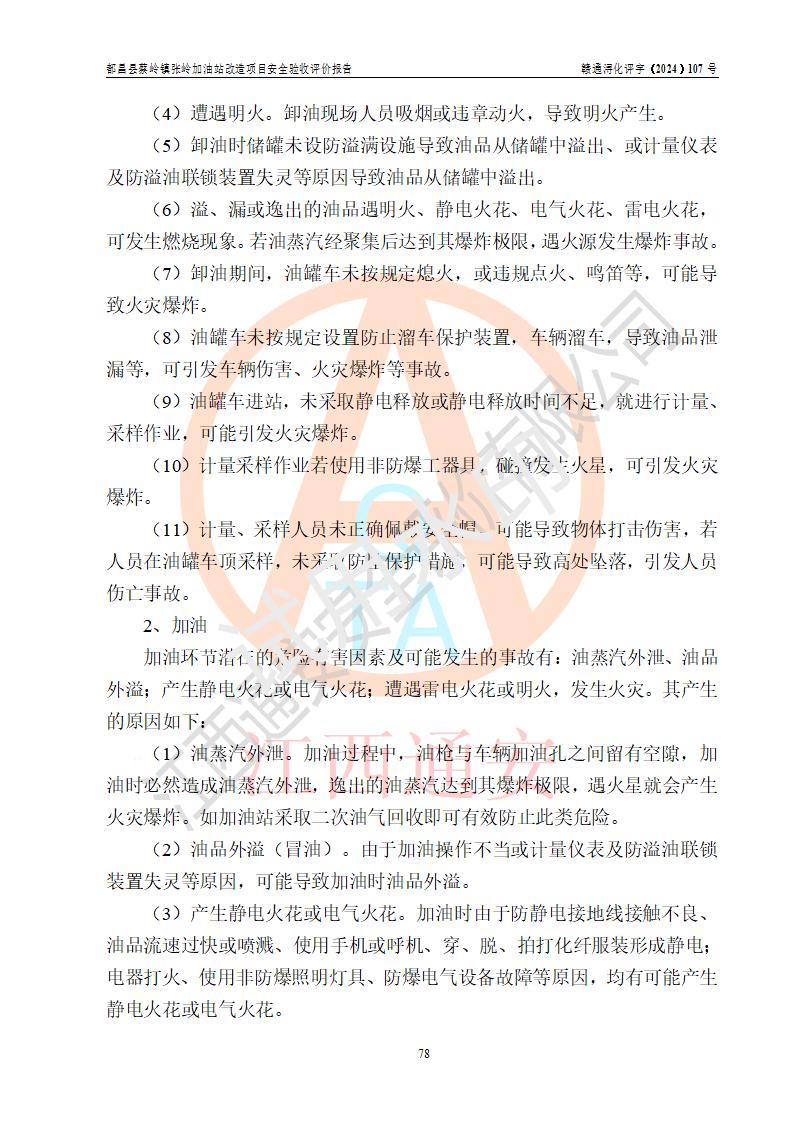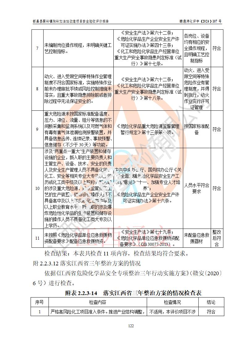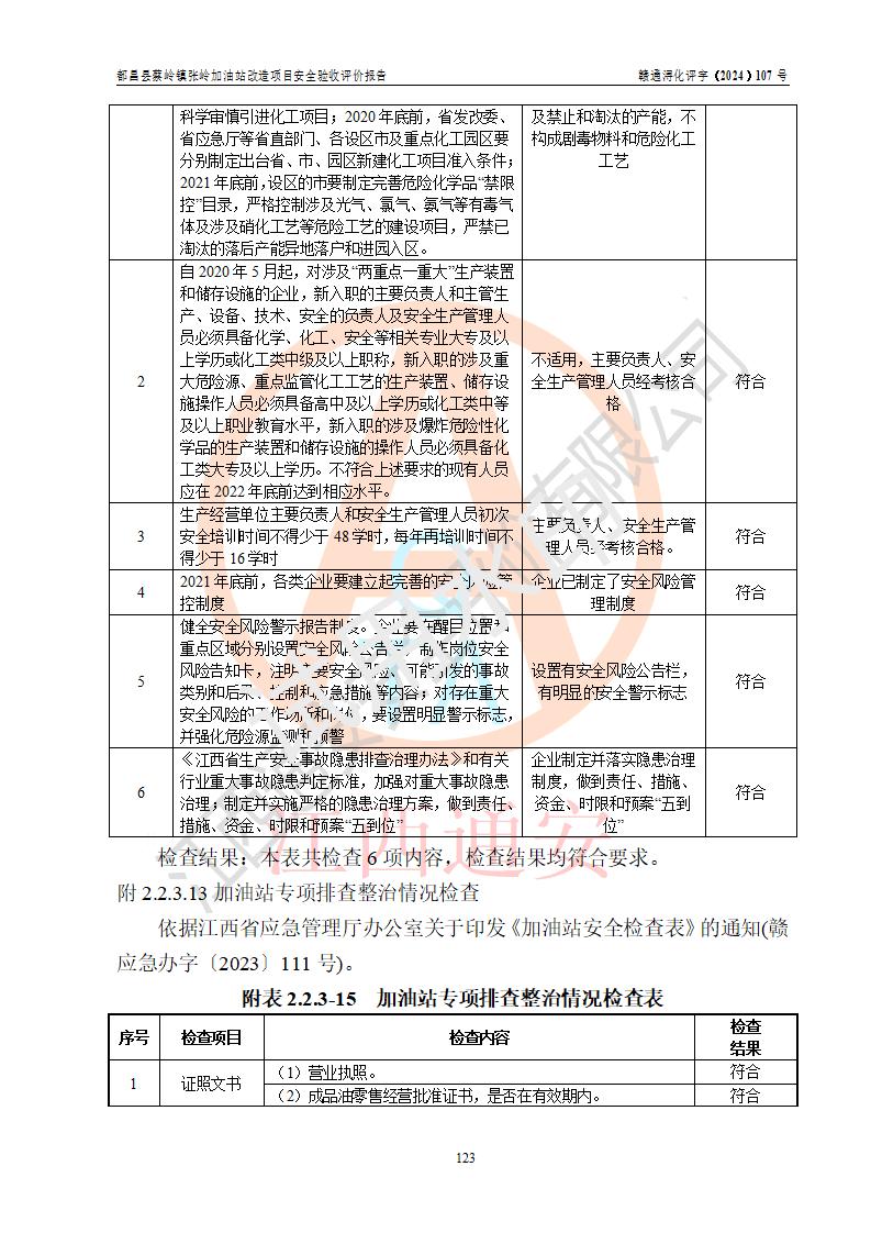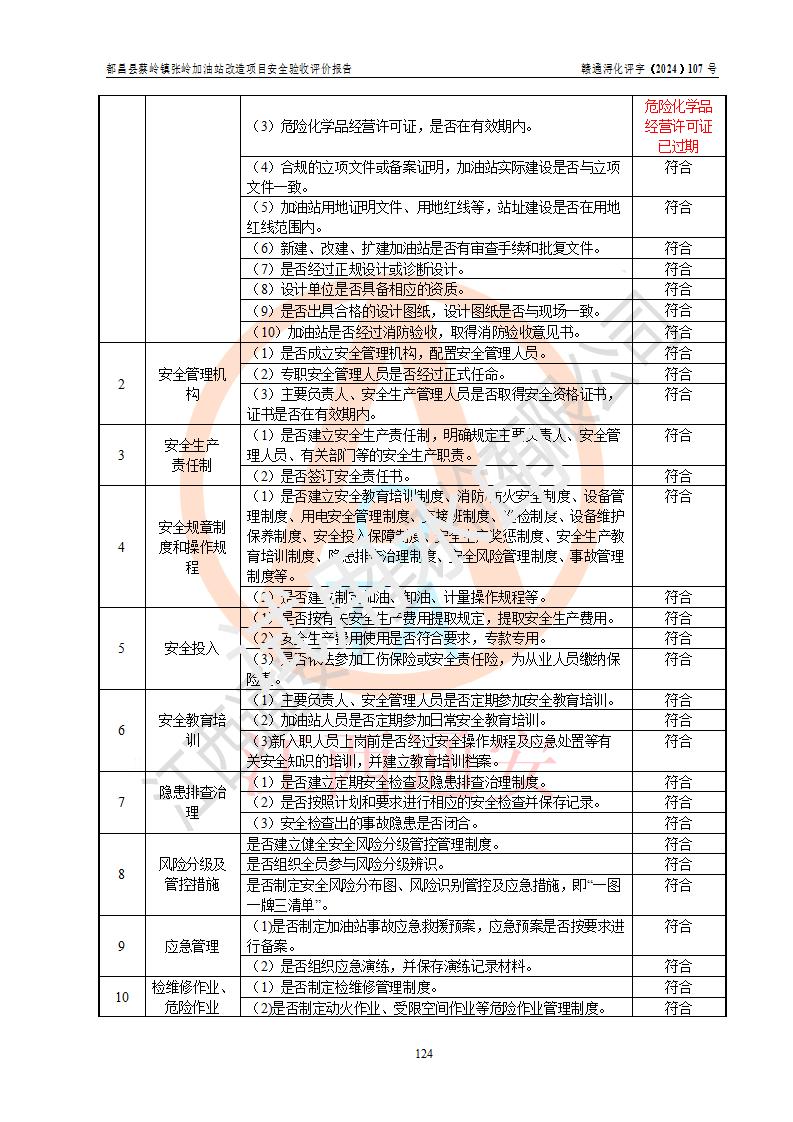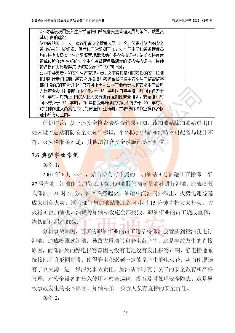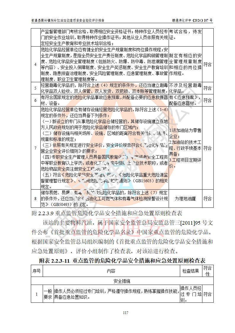 評價結(jié)論 | 都昌縣蔡嶺鎮(zhèn)張嶺加油站改造項目涉及的安全條件、安全生產(chǎn)條件、安全生產(chǎn)管理符合《危險化學(xué)品經(jīng)營許可證管理辦法》、《汽車加油加氣加氫站技術(shù)標(biāo)準(zhǔn)》等**有關(guān)法規(guī)、標(biāo)準(zhǔn)、規(guī)范要求,能滿足成品油零售經(jīng)營單位的安全條件,具備項目竣工驗收的條件。 | |||