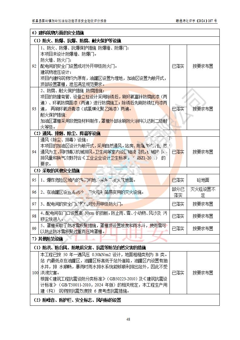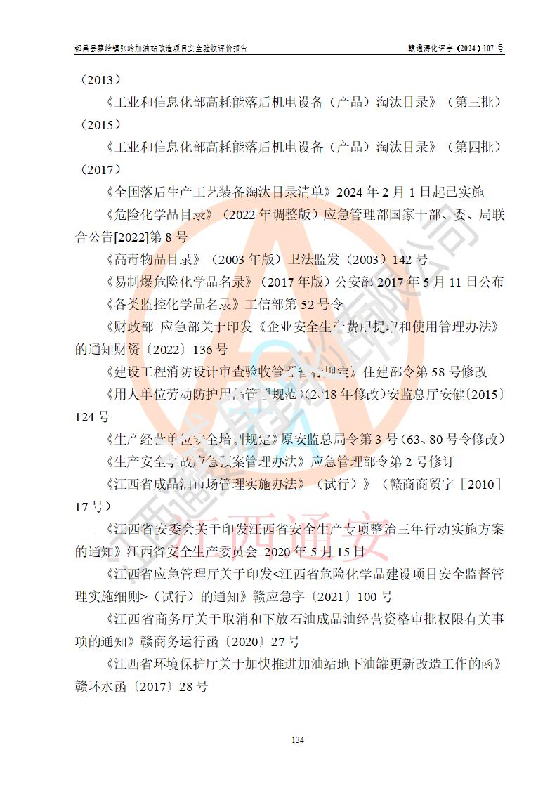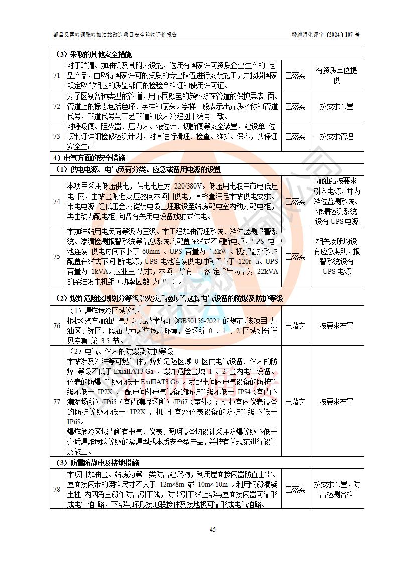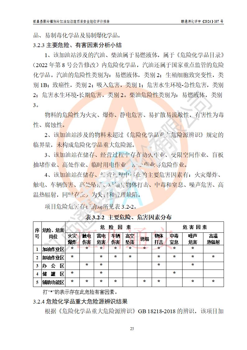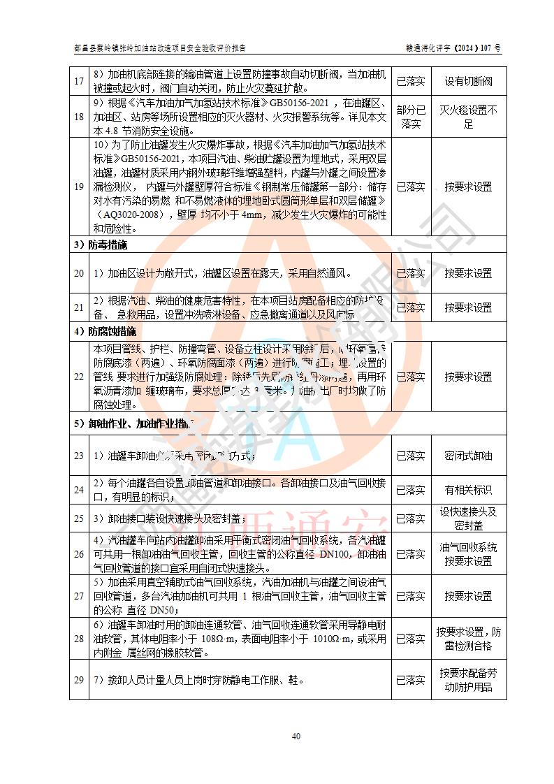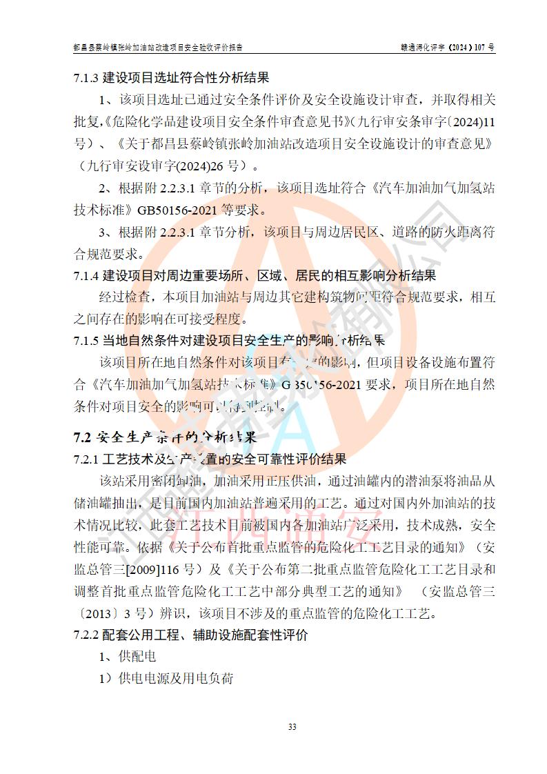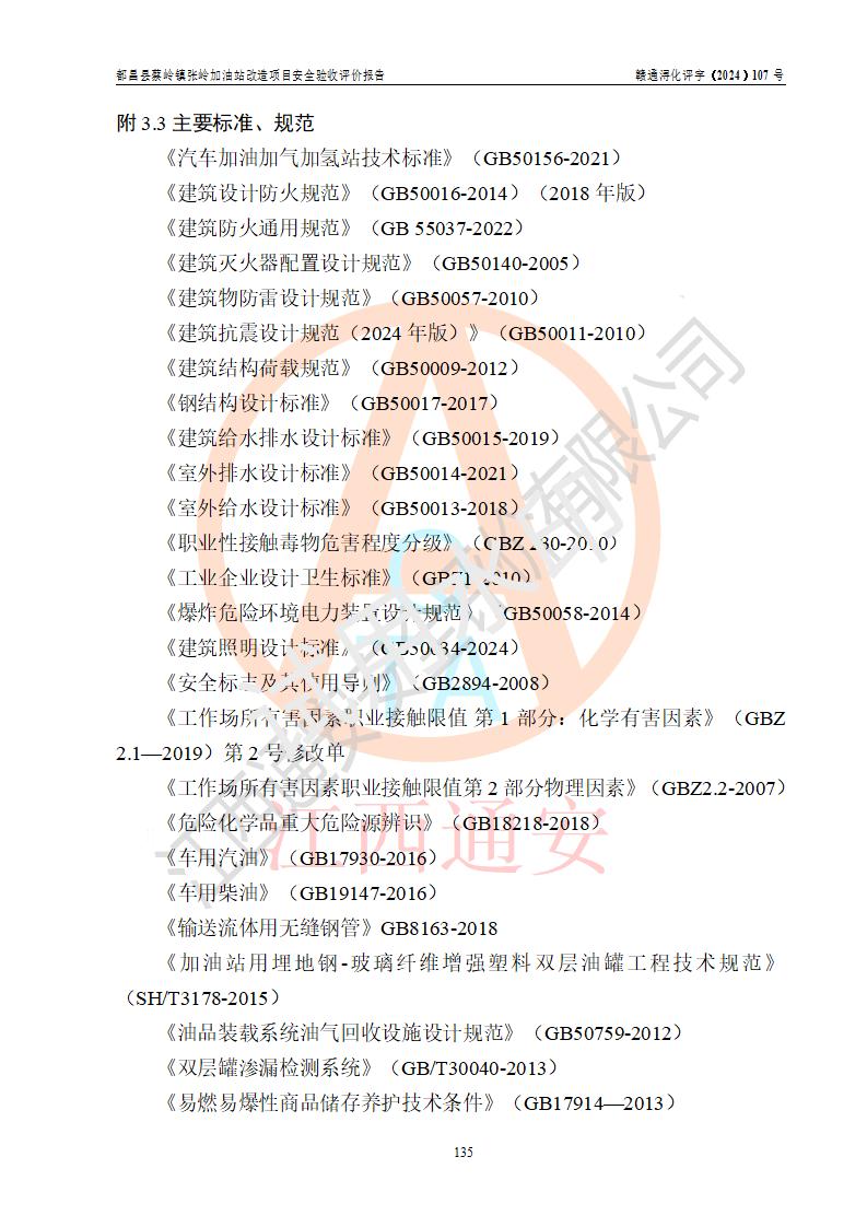 評價結(jié)論 | 都昌縣蔡嶺鎮(zhèn)張嶺加油站改造項目涉及的安全條件、安全生產(chǎn)條件、安全生產(chǎn)管理符合《危險化學(xué)品經(jīng)營許可證管理辦法》、《汽車加油加氣加氫站技術(shù)標(biāo)準(zhǔn)》等**有關(guān)法規(guī)、標(biāo)準(zhǔn)、規(guī)范要求,能滿足成品油零售經(jīng)營單位的安全條件,具備項目竣工驗收的條件。 | |||