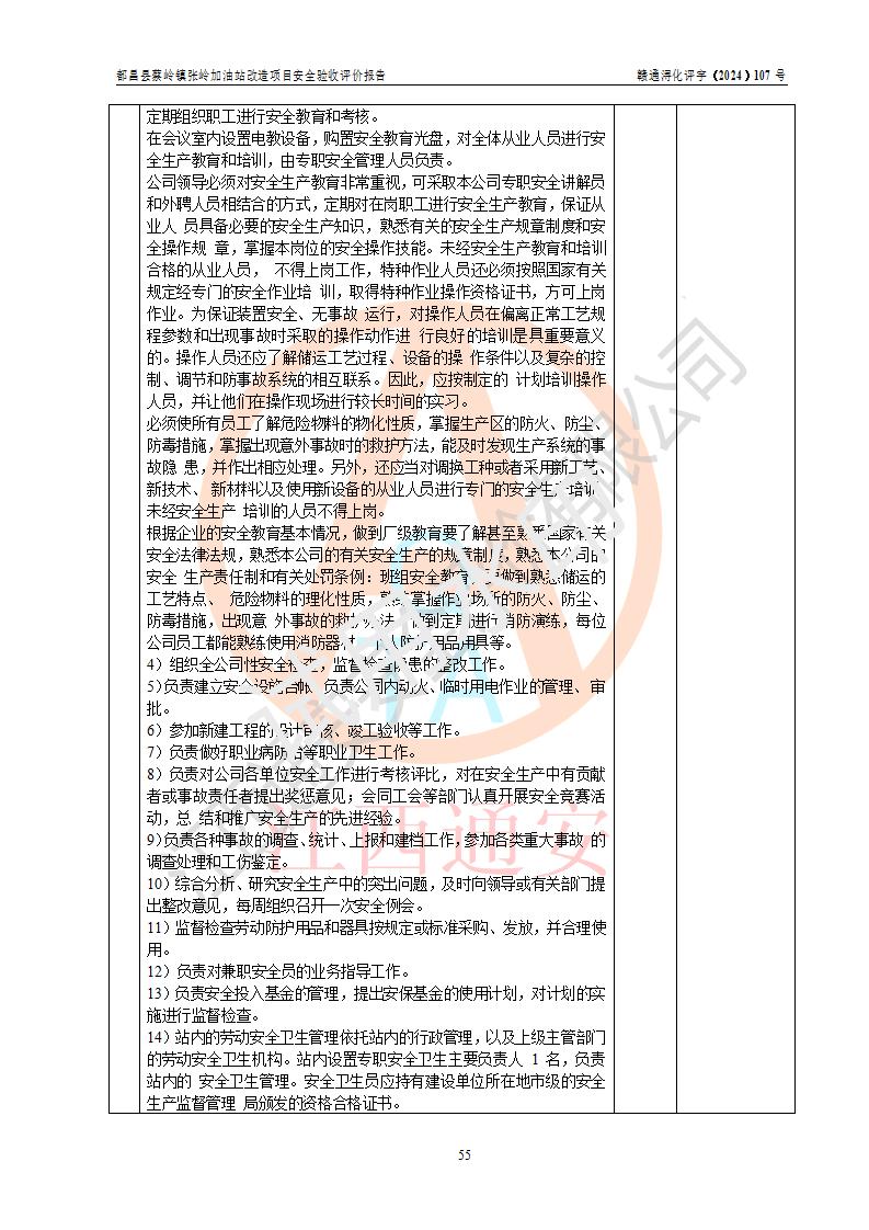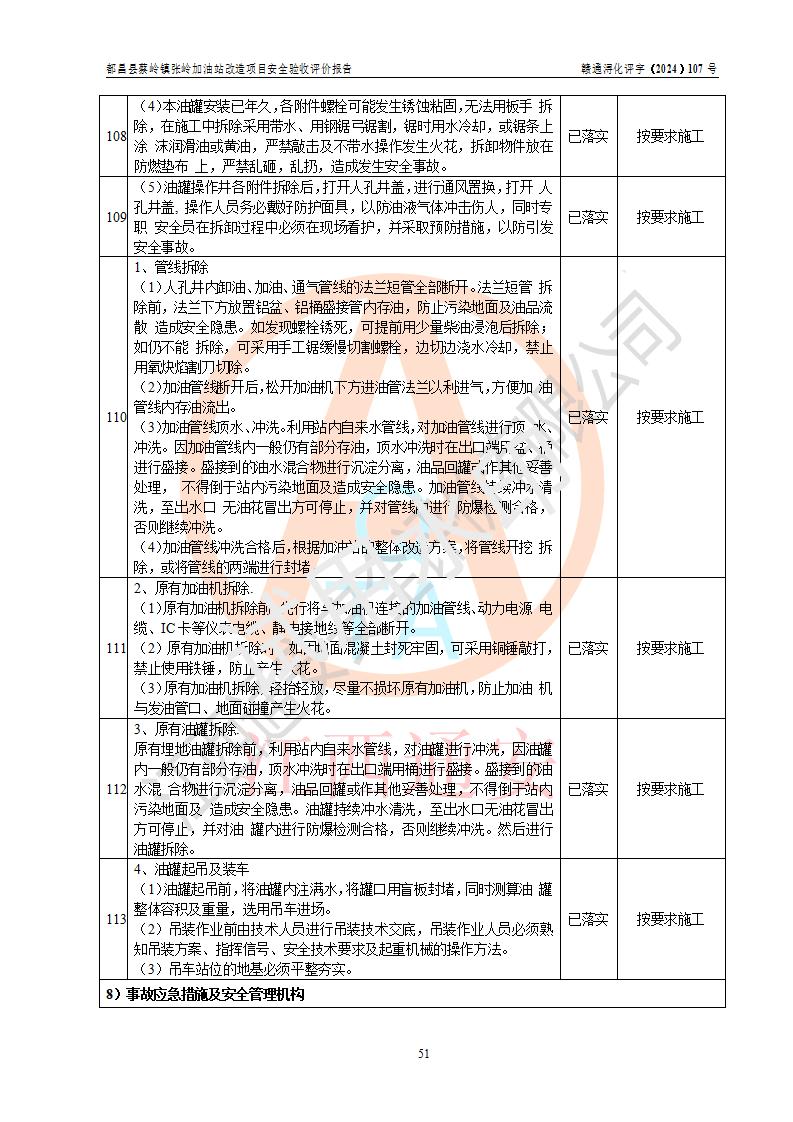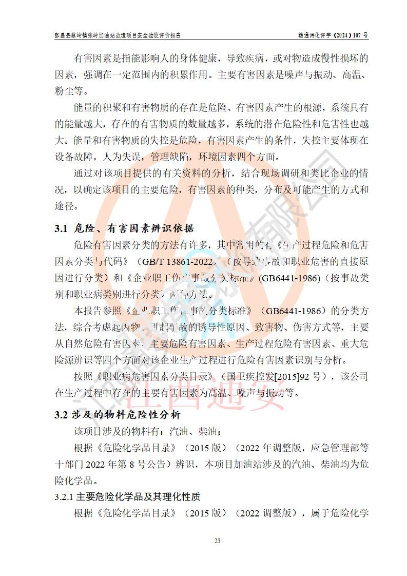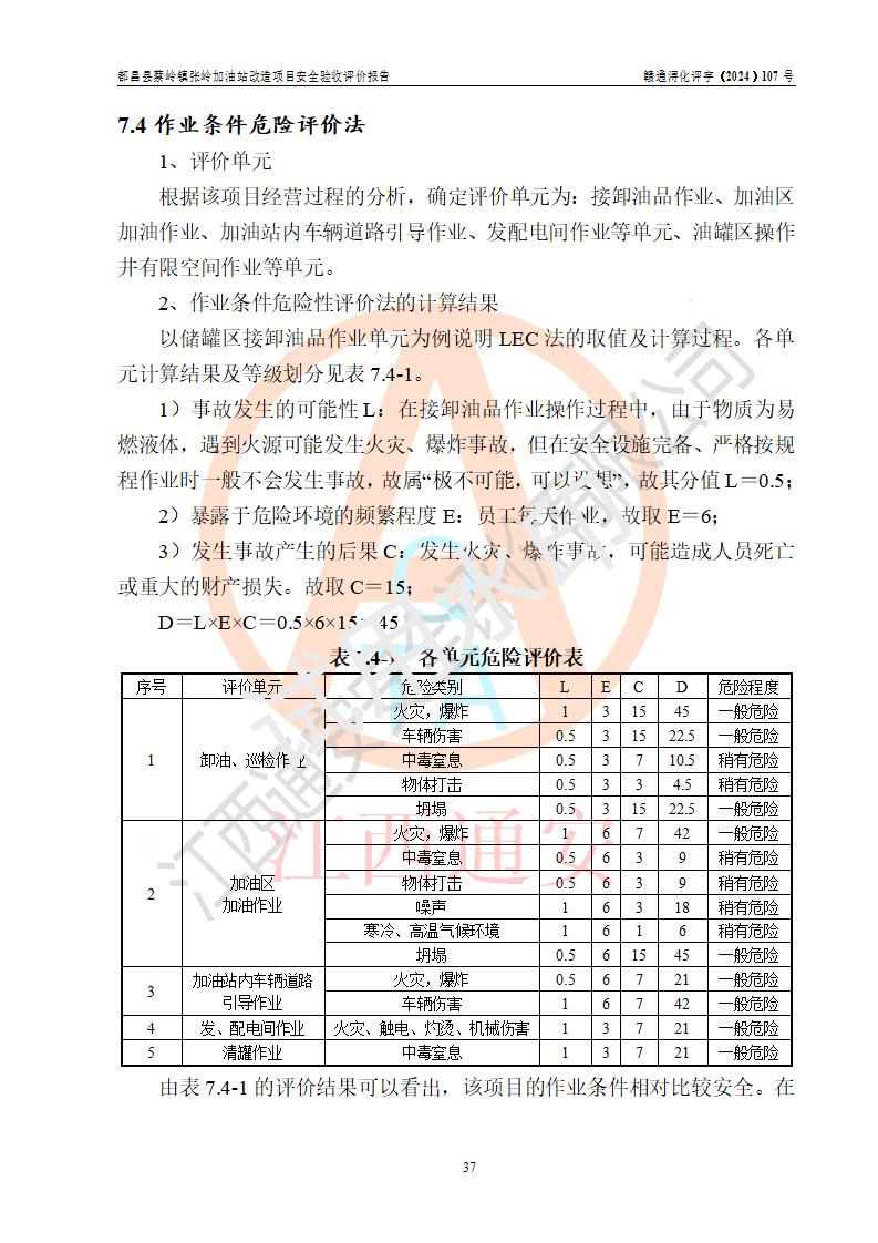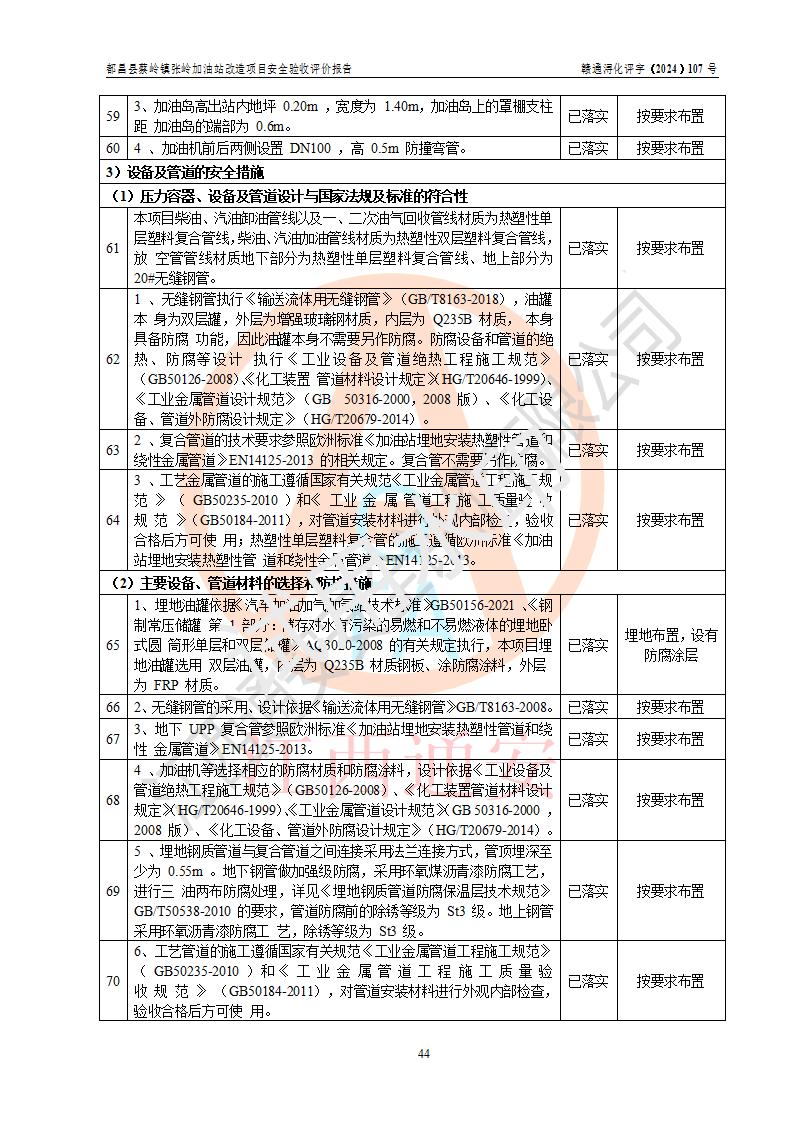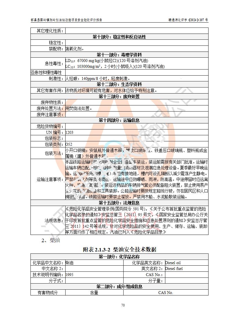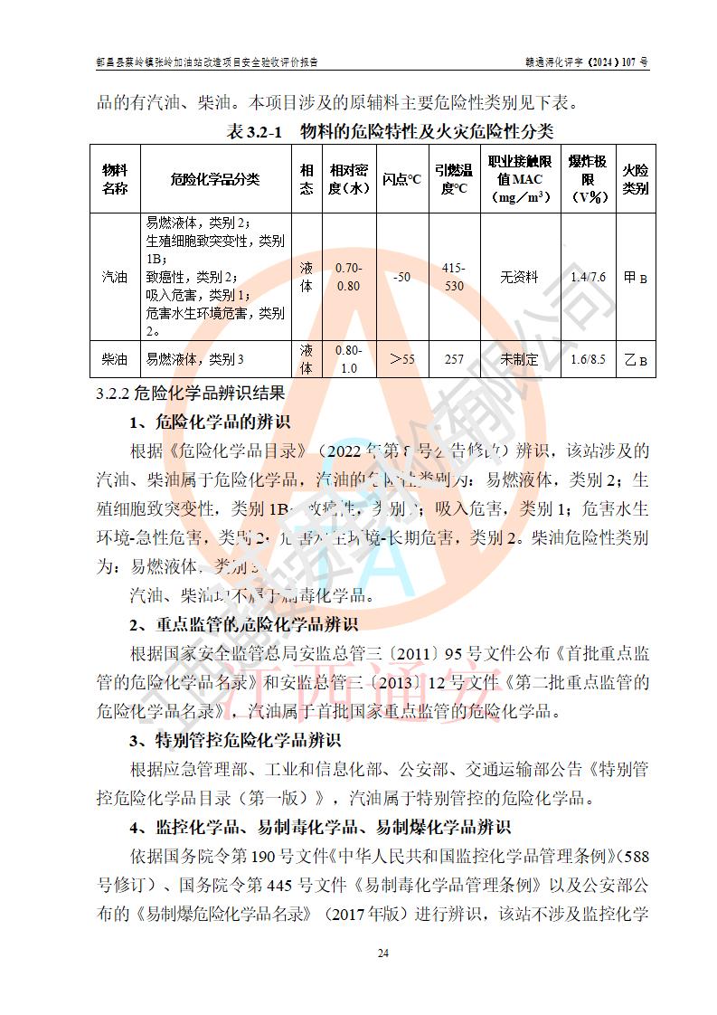 評價結(jié)論 | 都昌縣蔡嶺鎮(zhèn)張嶺加油站改造項目涉及的安全條件、安全生產(chǎn)條件、安全生產(chǎn)管理符合《危險化學(xué)品經(jīng)營許可證管理辦法》、《汽車加油加氣加氫站技術(shù)標(biāo)準(zhǔn)》等**有關(guān)法規(guī)、標(biāo)準(zhǔn)、規(guī)范要求,能滿足成品油零售經(jīng)營單位的安全條件,具備項目竣工驗收的條件。 | |||