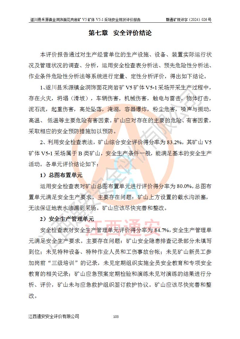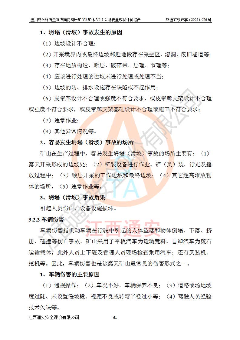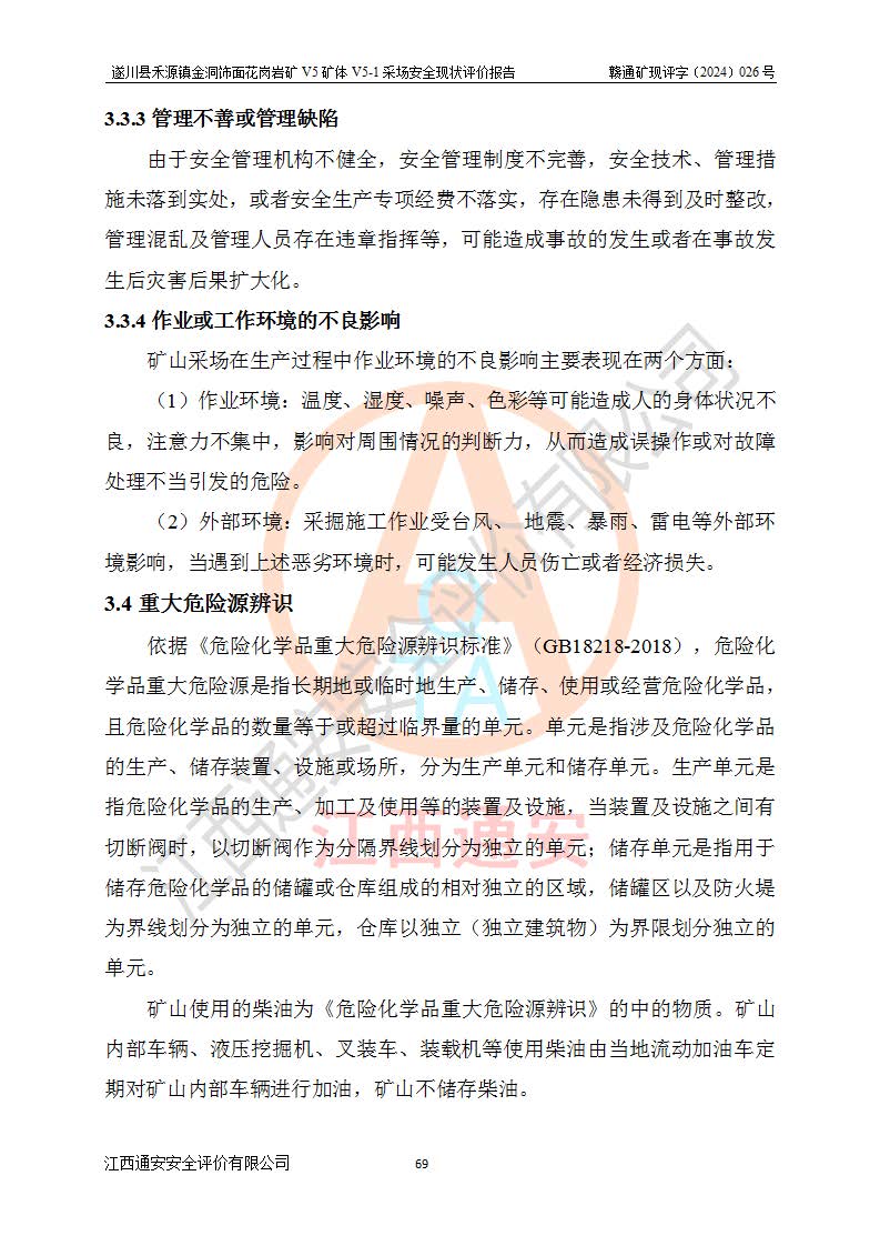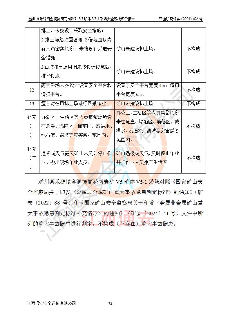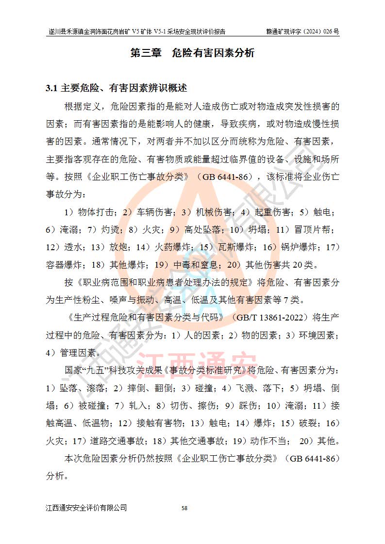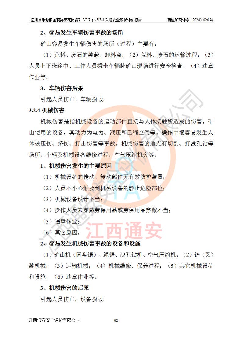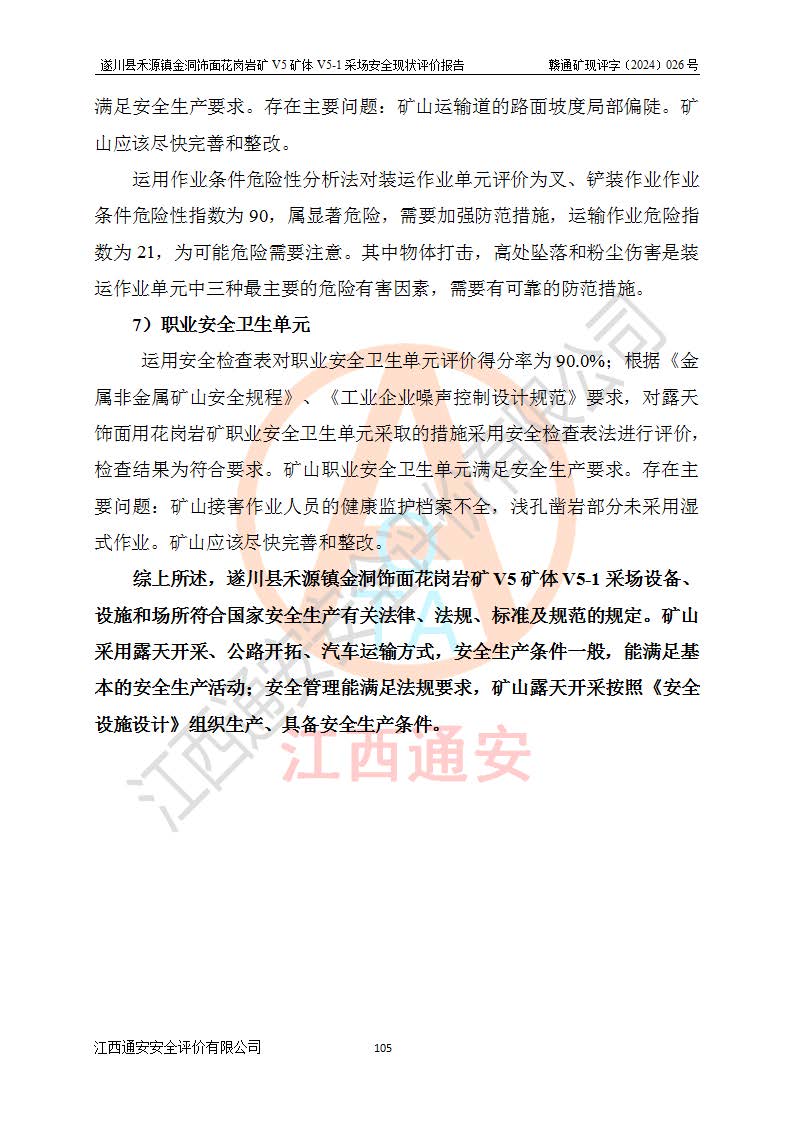 1、該評價項目中存在的主要危險因素:火災,坍塌(滑坡),**傷害,機械傷害,觸電與雷擊,物體打擊,泥石流,起重傷害,高處墜落,淹溺,容器爆炸等危險有害因素。 2、該評價項目中存在的有害因素包括:粉塵、噪聲與振動、不良作業(yè)環(huán)境,如高溫、雷擊對礦山人員的傷害和其他不利的環(huán)境因素等。 3、該評價項目為非金屬露天礦山,無瓦斯和自燃發(fā)火危險,礦區(qū)范圍內(nèi)及周邊無較大水系,礦區(qū)水文地質(zhì)條件簡單。該礦山只是對飾面用石料進行機械開采,不使用有毒有害危險化學品藥劑。該評價項目使用的壓力容器為空壓機儲氣罐,其工作介質(zhì)為空氣,屬**性、非易燃介質(zhì)。綜合上述分析,本評價項目不存在重大危險源。 上述主要危險、有害因素在采取本報告第六章中提出的安全對策措施及建議后,能得到**控制。遂川縣禾源鎮(zhèn)金洞飾面花崗巖礦V5礦體V5-1采場設備、設施和場所符合**安全生產(chǎn)有關法律、法規(guī)、標準及規(guī)范的規(guī)定。礦山采用露天開采、公路開拓、汽車運輸方式,安全生產(chǎn)條件一般,能滿足基本的安全生產(chǎn)活動;安全管理能滿足法規(guī)要求,礦山露天開采按照《安全設施設計》組織生產(chǎn)、具備安全生產(chǎn)條件。 |