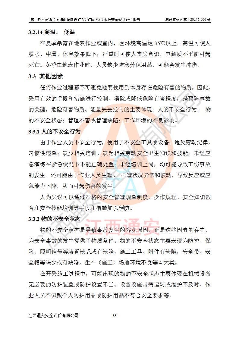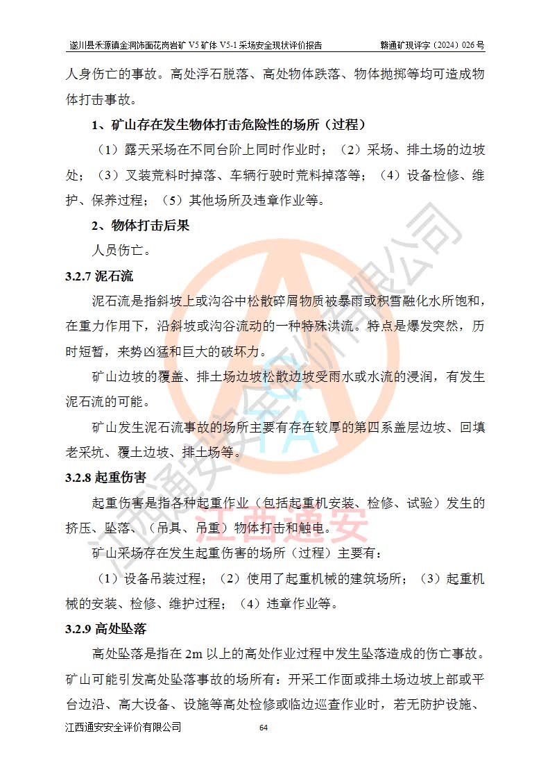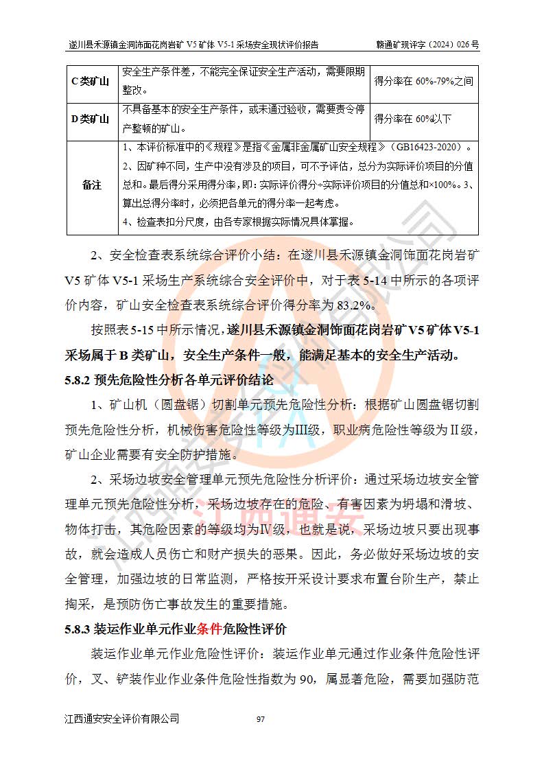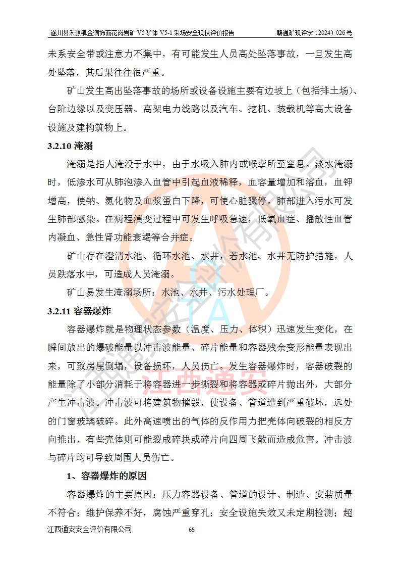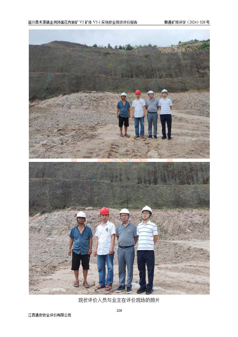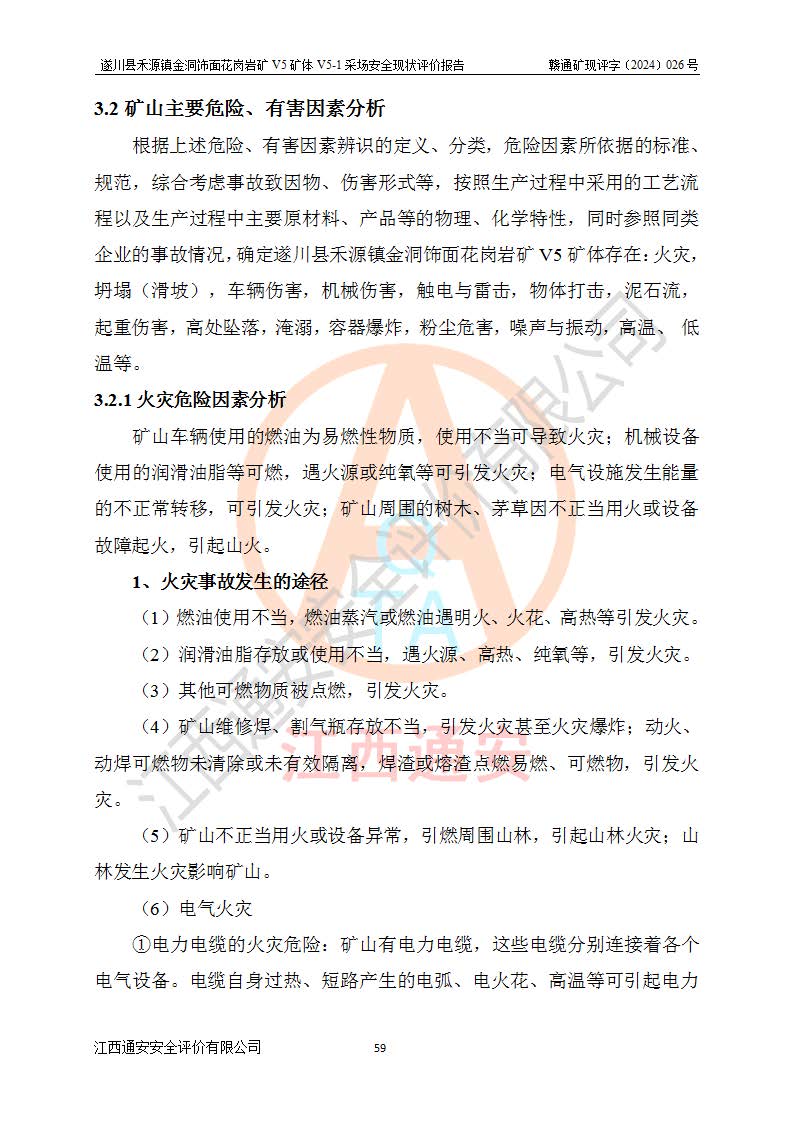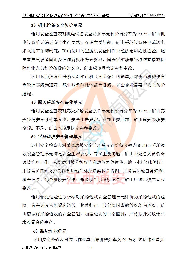 1、該評價項目中存在的主要危險因素:火災,坍塌(滑坡),**傷害,機械傷害,觸電與雷擊,物體打擊,泥石流,起重傷害,高處墜落,淹溺,容器爆炸等危險有害因素。 2、該評價項目中存在的有害因素包括:粉塵、噪聲與振動、不良作業(yè)環(huán)境,如高溫、雷擊對礦山人員的傷害和其他不利的環(huán)境因素等。 3、該評價項目為非金屬露天礦山,無瓦斯和自燃發(fā)火危險,礦區(qū)范圍內(nèi)及周邊無較大水系,礦區(qū)水文地質(zhì)條件簡單。該礦山只是對飾面用石料進行機械開采,不使用有毒有害危險化學品藥劑。該評價項目使用的壓力容器為空壓機儲氣罐,其工作介質(zhì)為空氣,屬**性、非易燃介質(zhì)。綜合上述分析,本評價項目不存在重大危險源。 上述主要危險、有害因素在采取本報告第六章中提出的安全對策措施及建議后,能得到**控制。遂川縣禾源鎮(zhèn)金洞飾面花崗巖礦V5礦體V5-1采場設備、設施和場所符合**安全生產(chǎn)有關法律、法規(guī)、標準及規(guī)范的規(guī)定。礦山采用露天開采、公路開拓、汽車運輸方式,安全生產(chǎn)條件一般,能滿足基本的安全生產(chǎn)活動;安全管理能滿足法規(guī)要求,礦山露天開采按照《安全設施設計》組織生產(chǎn)、具備安全生產(chǎn)條件。 |