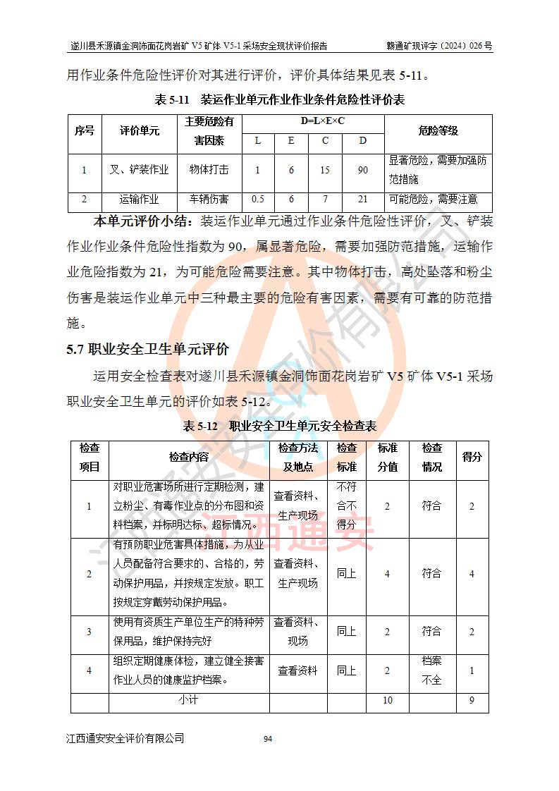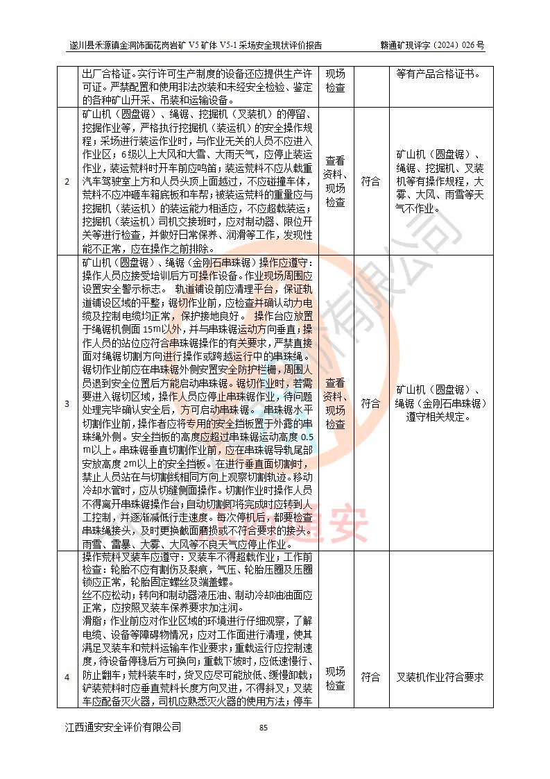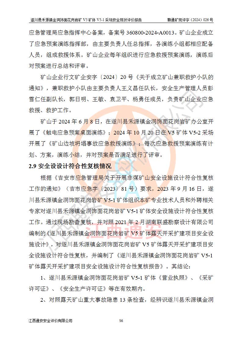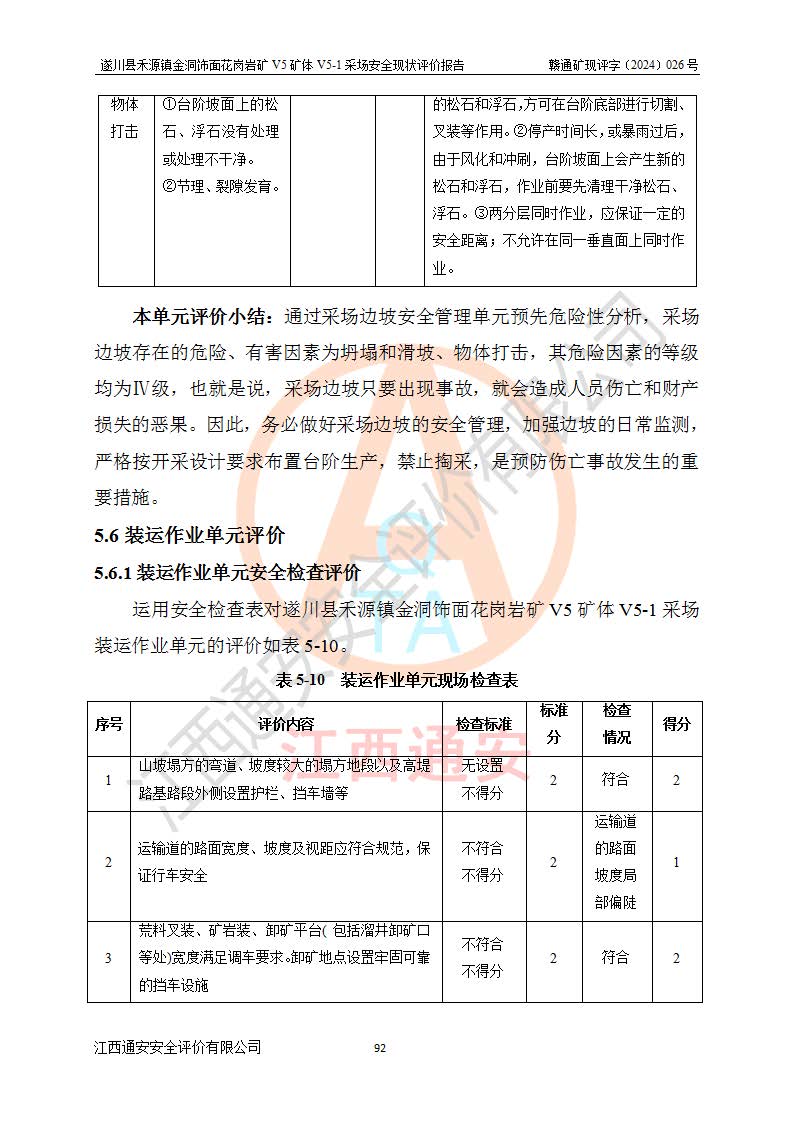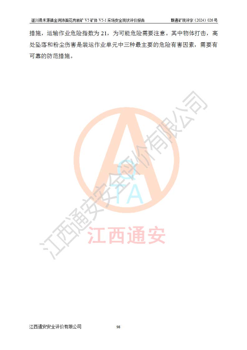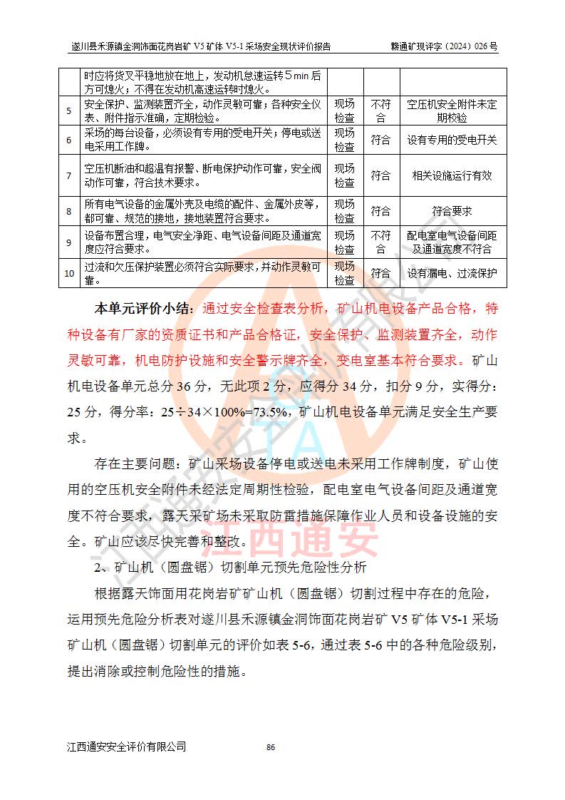 1、該評價項目中存在的主要危險因素:火災,坍塌(滑坡),**傷害,機械傷害,觸電與雷擊,物體打擊,泥石流,起重傷害,高處墜落,淹溺,容器爆炸等危險有害因素。 2、該評價項目中存在的有害因素包括:粉塵、噪聲與振動、不良作業(yè)環(huán)境,如高溫、雷擊對礦山人員的傷害和其他不利的環(huán)境因素等。 3、該評價項目為非金屬露天礦山,無瓦斯和自燃發(fā)火危險,礦區(qū)范圍內(nèi)及周邊無較大水系,礦區(qū)水文地質(zhì)條件簡單。該礦山只是對飾面用石料進行機械開采,不使用有毒有害危險化學品藥劑。該評價項目使用的壓力容器為空壓機儲氣罐,其工作介質(zhì)為空氣,屬**性、非易燃介質(zhì)。綜合上述分析,本評價項目不存在重大危險源。 上述主要危險、有害因素在采取本報告第六章中提出的安全對策措施及建議后,能得到**控制。遂川縣禾源鎮(zhèn)金洞飾面花崗巖礦V5礦體V5-1采場設備、設施和場所符合**安全生產(chǎn)有關法律、法規(guī)、標準及規(guī)范的規(guī)定。礦山采用露天開采、公路開拓、汽車運輸方式,安全生產(chǎn)條件一般,能滿足基本的安全生產(chǎn)活動;安全管理能滿足法規(guī)要求,礦山露天開采按照《安全設施設計》組織生產(chǎn)、具備安全生產(chǎn)條件。 |