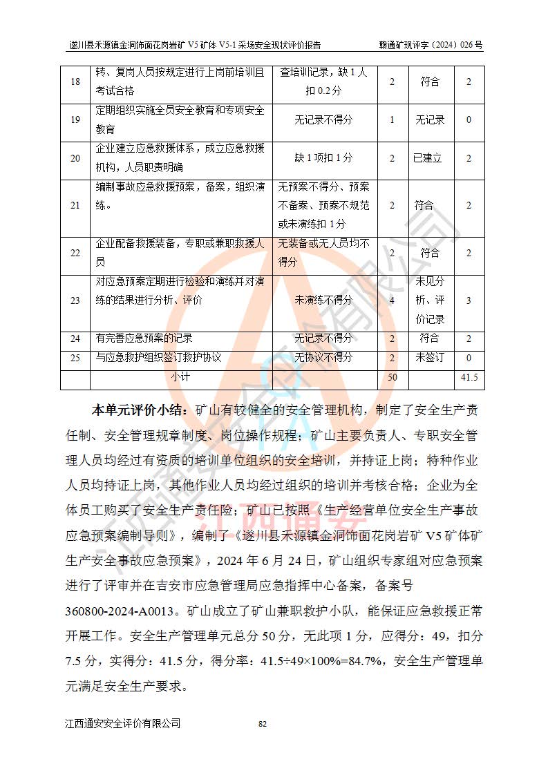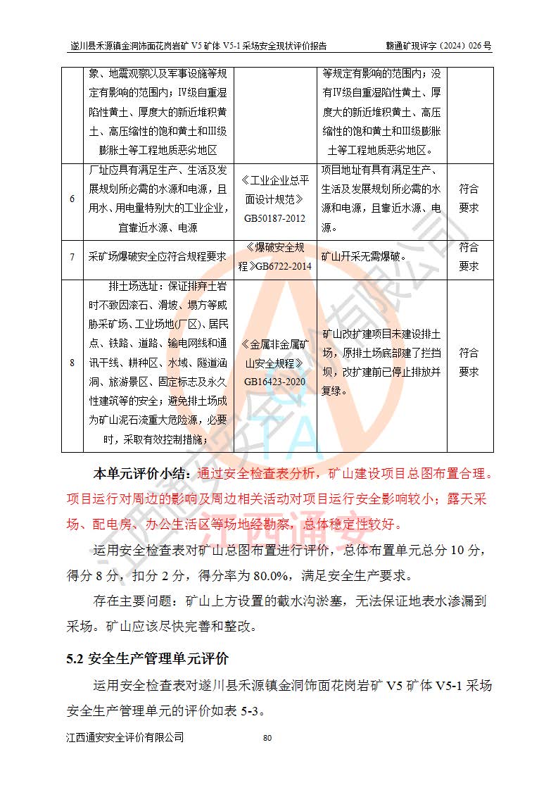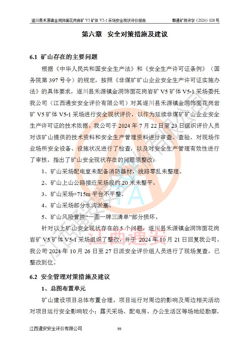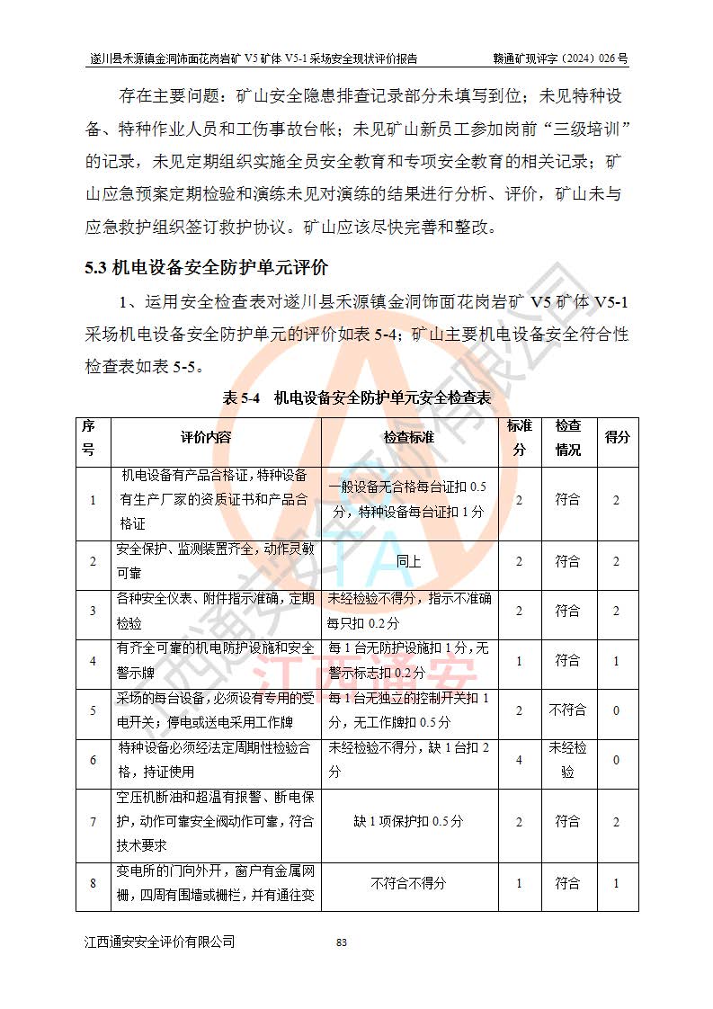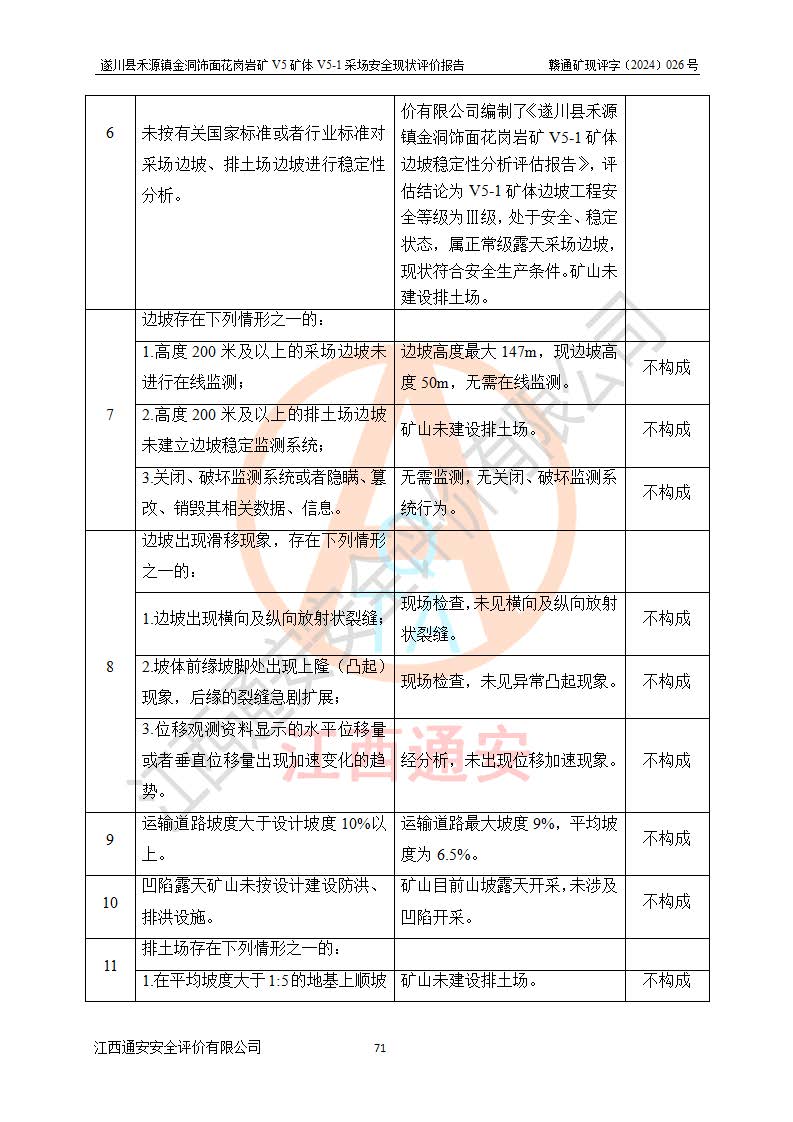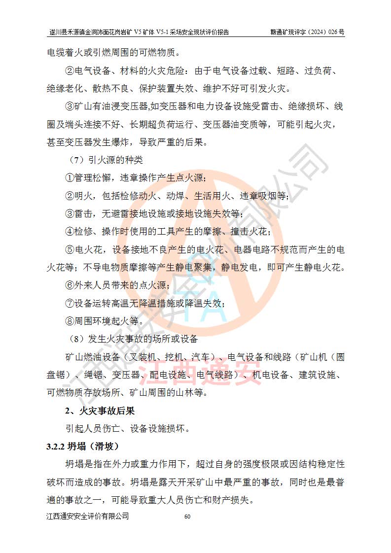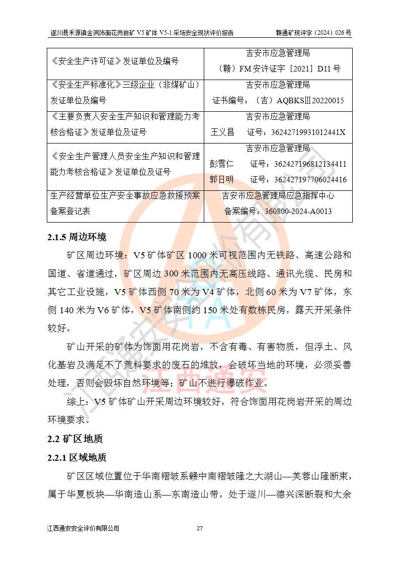 1、該評價項目中存在的主要危險因素:火災,坍塌(滑坡),**傷害,機械傷害,觸電與雷擊,物體打擊,泥石流,起重傷害,高處墜落,淹溺,容器爆炸等危險有害因素。 2、該評價項目中存在的有害因素包括:粉塵、噪聲與振動、不良作業(yè)環(huán)境,如高溫、雷擊對礦山人員的傷害和其他不利的環(huán)境因素等。 3、該評價項目為非金屬露天礦山,無瓦斯和自燃發(fā)火危險,礦區(qū)范圍內(nèi)及周邊無較大水系,礦區(qū)水文地質(zhì)條件簡單。該礦山只是對飾面用石料進行機械開采,不使用有毒有害危險化學品藥劑。該評價項目使用的壓力容器為空壓機儲氣罐,其工作介質(zhì)為空氣,屬**性、非易燃介質(zhì)。綜合上述分析,本評價項目不存在重大危險源。 上述主要危險、有害因素在采取本報告第六章中提出的安全對策措施及建議后,能得到**控制。遂川縣禾源鎮(zhèn)金洞飾面花崗巖礦V5礦體V5-1采場設備、設施和場所符合**安全生產(chǎn)有關法律、法規(guī)、標準及規(guī)范的規(guī)定。礦山采用露天開采、公路開拓、汽車運輸方式,安全生產(chǎn)條件一般,能滿足基本的安全生產(chǎn)活動;安全管理能滿足法規(guī)要求,礦山露天開采按照《安全設施設計》組織生產(chǎn)、具備安全生產(chǎn)條件。 |