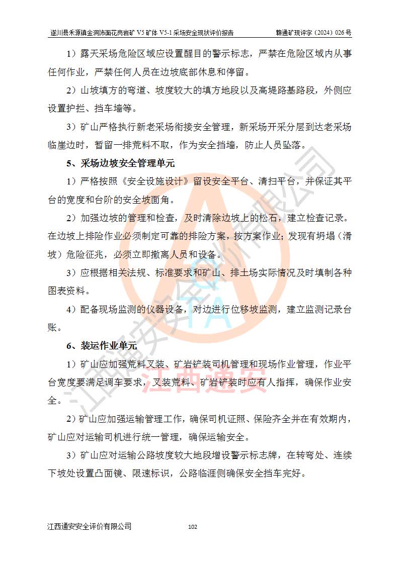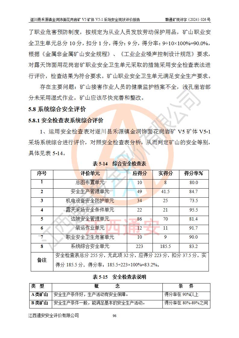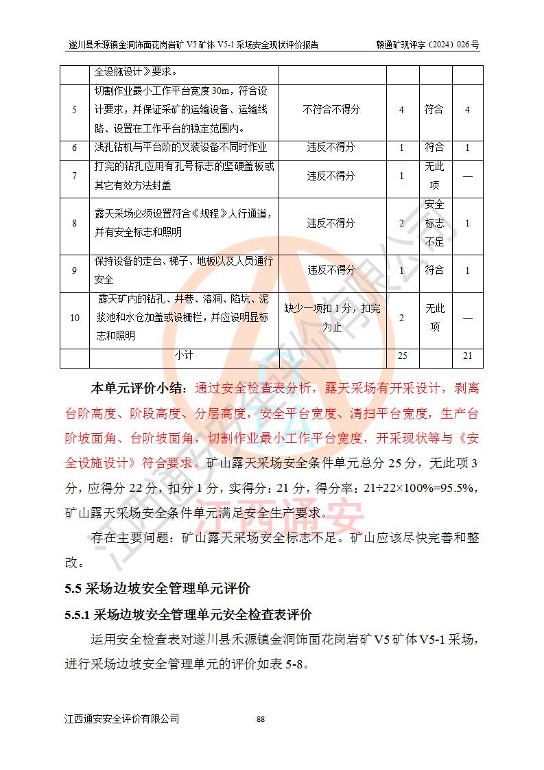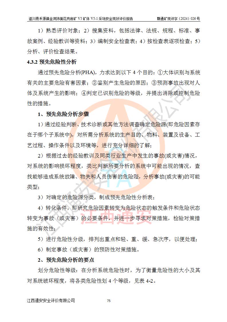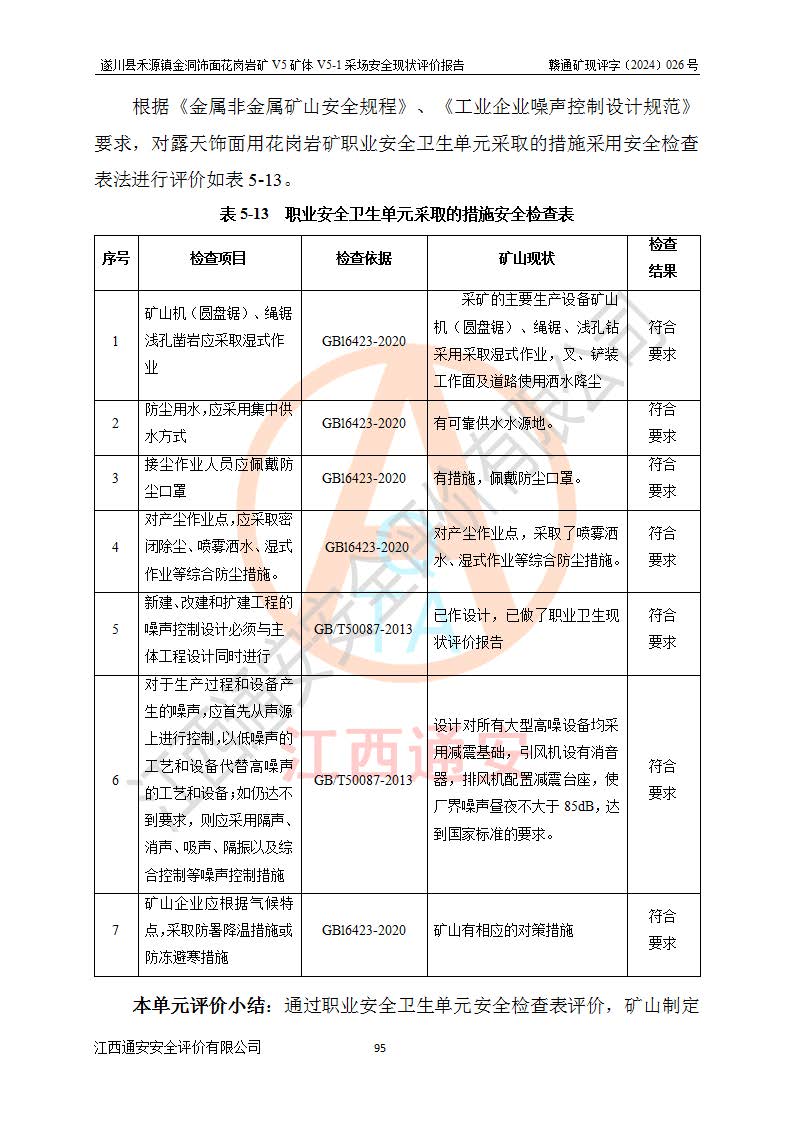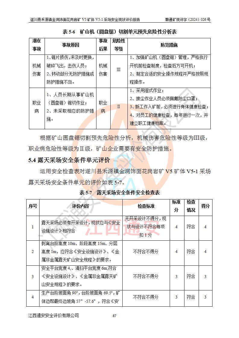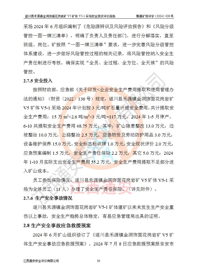 1、該評價項目中存在的主要危險因素:火災,坍塌(滑坡),**傷害,機械傷害,觸電與雷擊,物體打擊,泥石流,起重傷害,高處墜落,淹溺,容器爆炸等危險有害因素。 2、該評價項目中存在的有害因素包括:粉塵、噪聲與振動、不良作業(yè)環(huán)境,如高溫、雷擊對礦山人員的傷害和其他不利的環(huán)境因素等。 3、該評價項目為非金屬露天礦山,無瓦斯和自燃發(fā)火危險,礦區(qū)范圍內(nèi)及周邊無較大水系,礦區(qū)水文地質(zhì)條件簡單。該礦山只是對飾面用石料進行機械開采,不使用有毒有害危險化學品藥劑。該評價項目使用的壓力容器為空壓機儲氣罐,其工作介質(zhì)為空氣,屬**性、非易燃介質(zhì)。綜合上述分析,本評價項目不存在重大危險源。 上述主要危險、有害因素在采取本報告第六章中提出的安全對策措施及建議后,能得到**控制。遂川縣禾源鎮(zhèn)金洞飾面花崗巖礦V5礦體V5-1采場設備、設施和場所符合**安全生產(chǎn)有關法律、法規(guī)、標準及規(guī)范的規(guī)定。礦山采用露天開采、公路開拓、汽車運輸方式,安全生產(chǎn)條件一般,能滿足基本的安全生產(chǎn)活動;安全管理能滿足法規(guī)要求,礦山露天開采按照《安全設施設計》組織生產(chǎn)、具備安全生產(chǎn)條件。 |