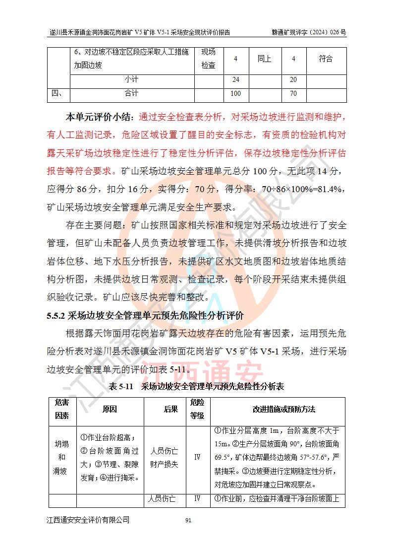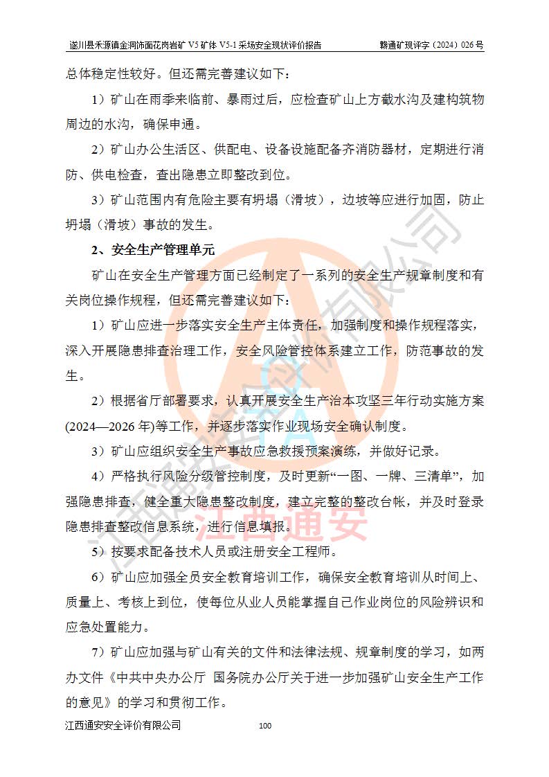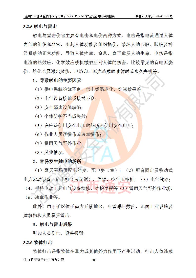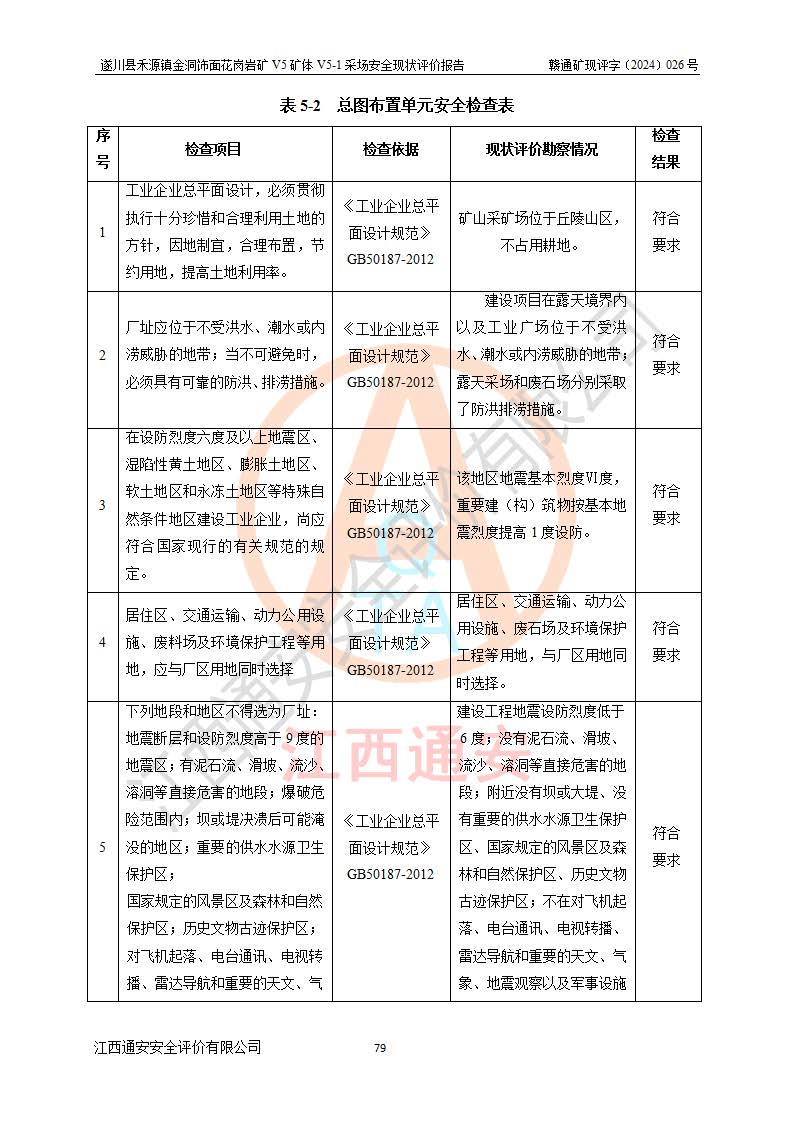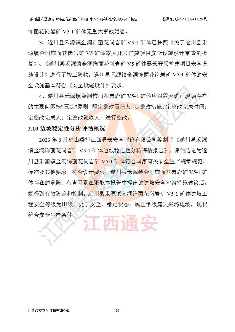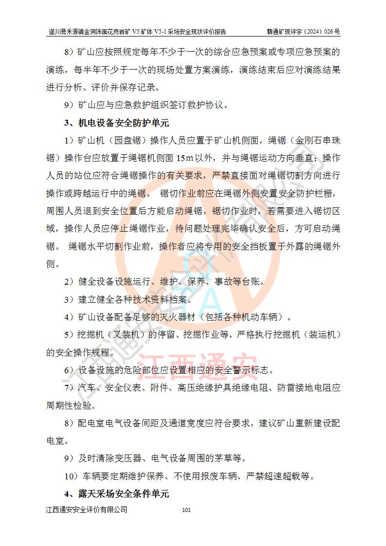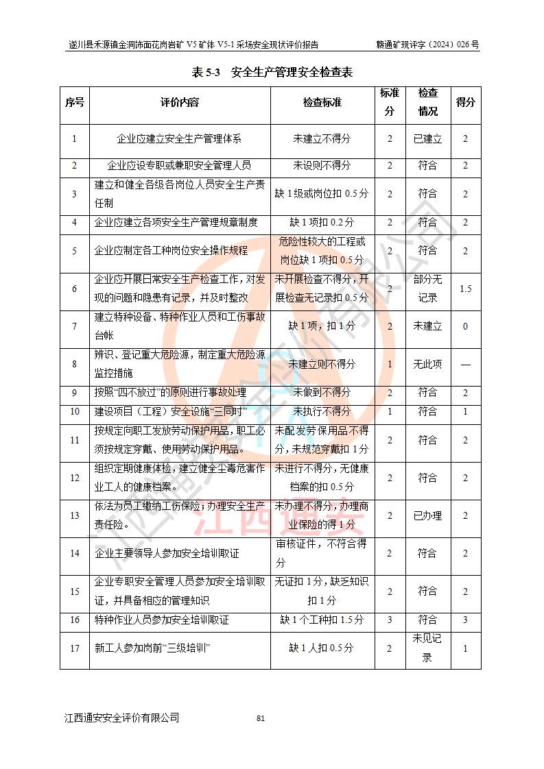1、該評價項目中存在的主要危險因素:火災,坍塌(滑坡),**傷害,機械傷害,觸電與雷擊,物體打擊,泥石流,起重傷害,高處墜落,淹溺,容器爆炸等危險有害因素。 2、該評價項目中存在的有害因素包括:粉塵、噪聲與振動、不良作業(yè)環(huán)境,如高溫、雷擊對礦山人員的傷害和其他不利的環(huán)境因素等。 3、該評價項目為非金屬露天礦山,無瓦斯和自燃發(fā)火危險,礦區(qū)范圍內(nèi)及周邊無較大水系,礦區(qū)水文地質(zhì)條件簡單。該礦山只是對飾面用石料進行機械開采,不使用有毒有害危險化學品藥劑。該評價項目使用的壓力容器為空壓機儲氣罐,其工作介質(zhì)為空氣,屬**性、非易燃介質(zhì)。綜合上述分析,本評價項目不存在重大危險源。 上述主要危險、有害因素在采取本報告第六章中提出的安全對策措施及建議后,能得到**控制。遂川縣禾源鎮(zhèn)金洞飾面花崗巖礦V5礦體V5-1采場設備、設施和場所符合**安全生產(chǎn)有關法律、法規(guī)、標準及規(guī)范的規(guī)定。礦山采用露天開采、公路開拓、汽車運輸方式,安全生產(chǎn)條件一般,能滿足基本的安全生產(chǎn)活動;安全管理能滿足法規(guī)要求,礦山露天開采按照《安全設施設計》組織生產(chǎn)、具備安全生產(chǎn)條件。 |