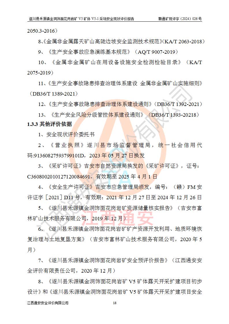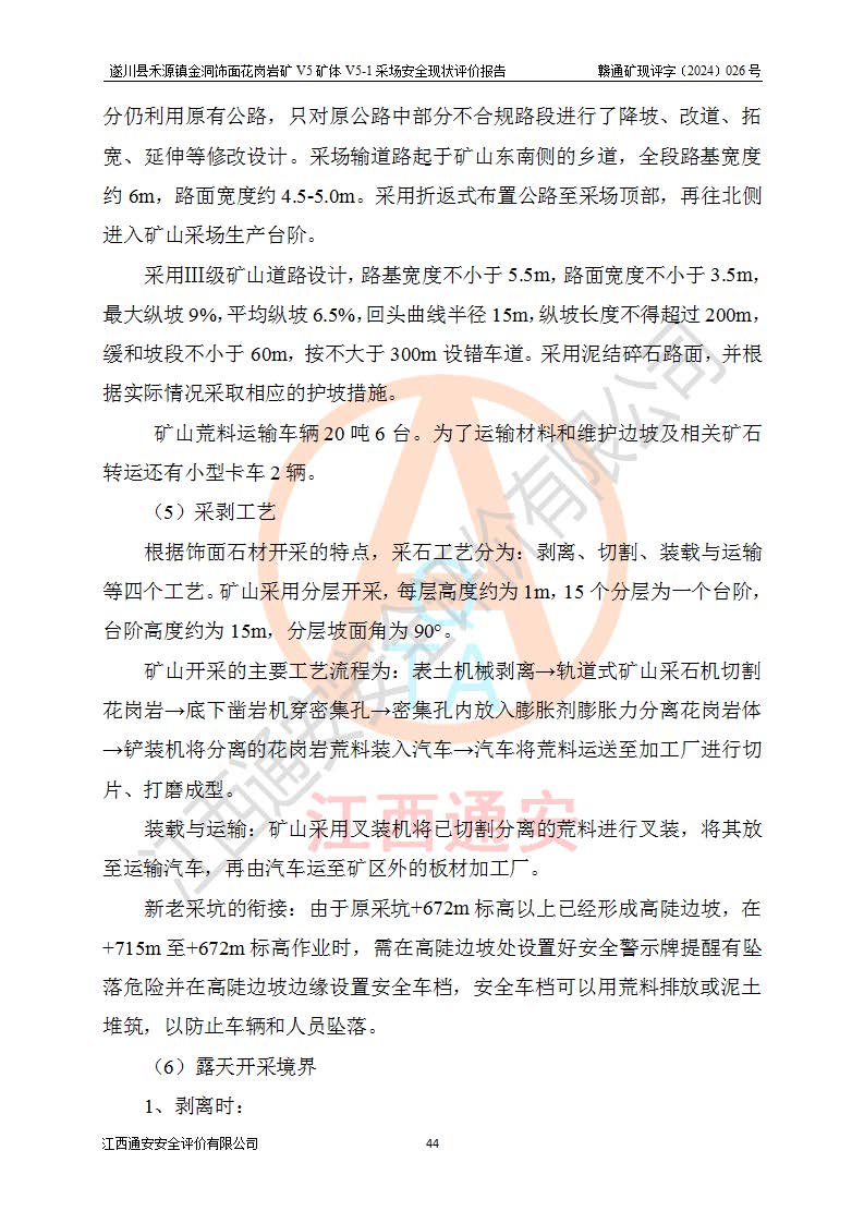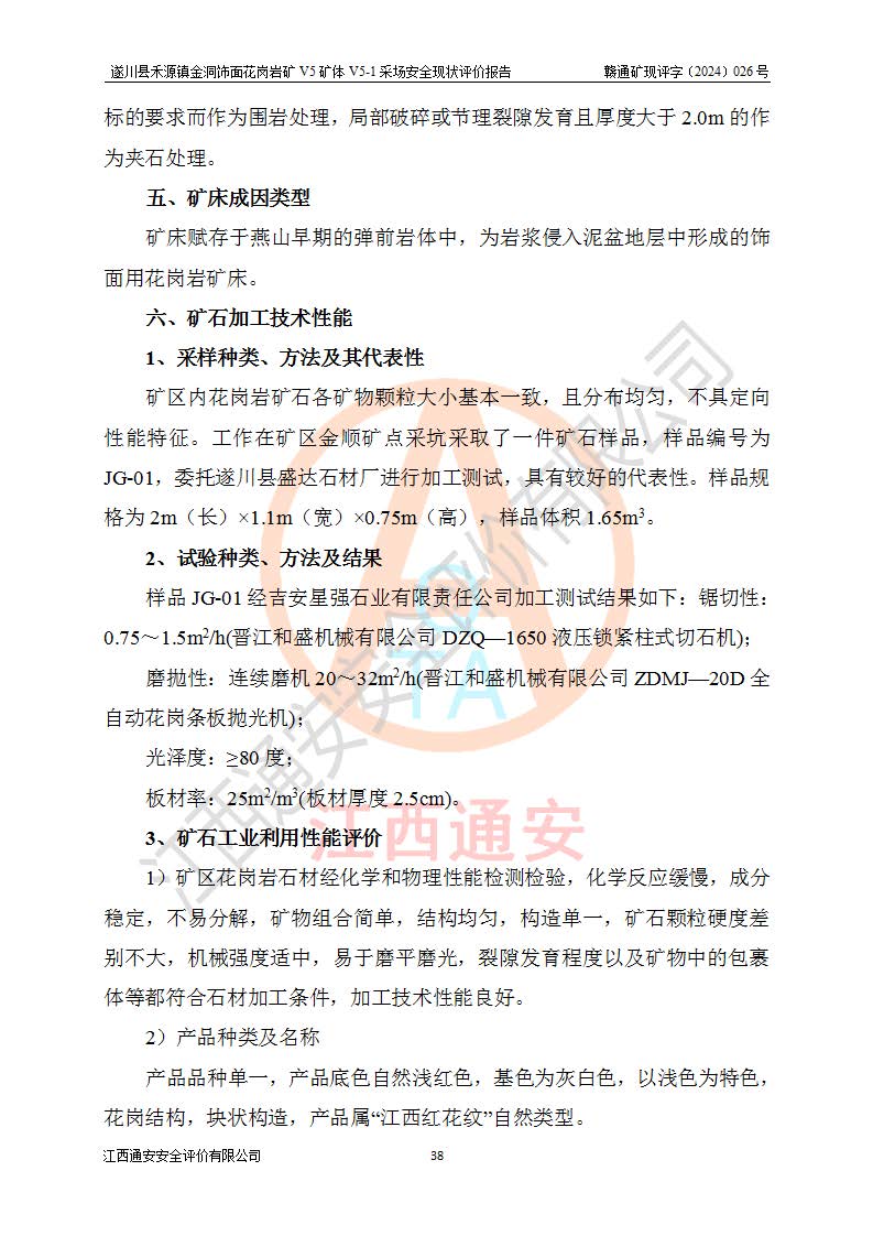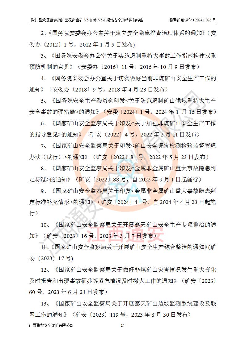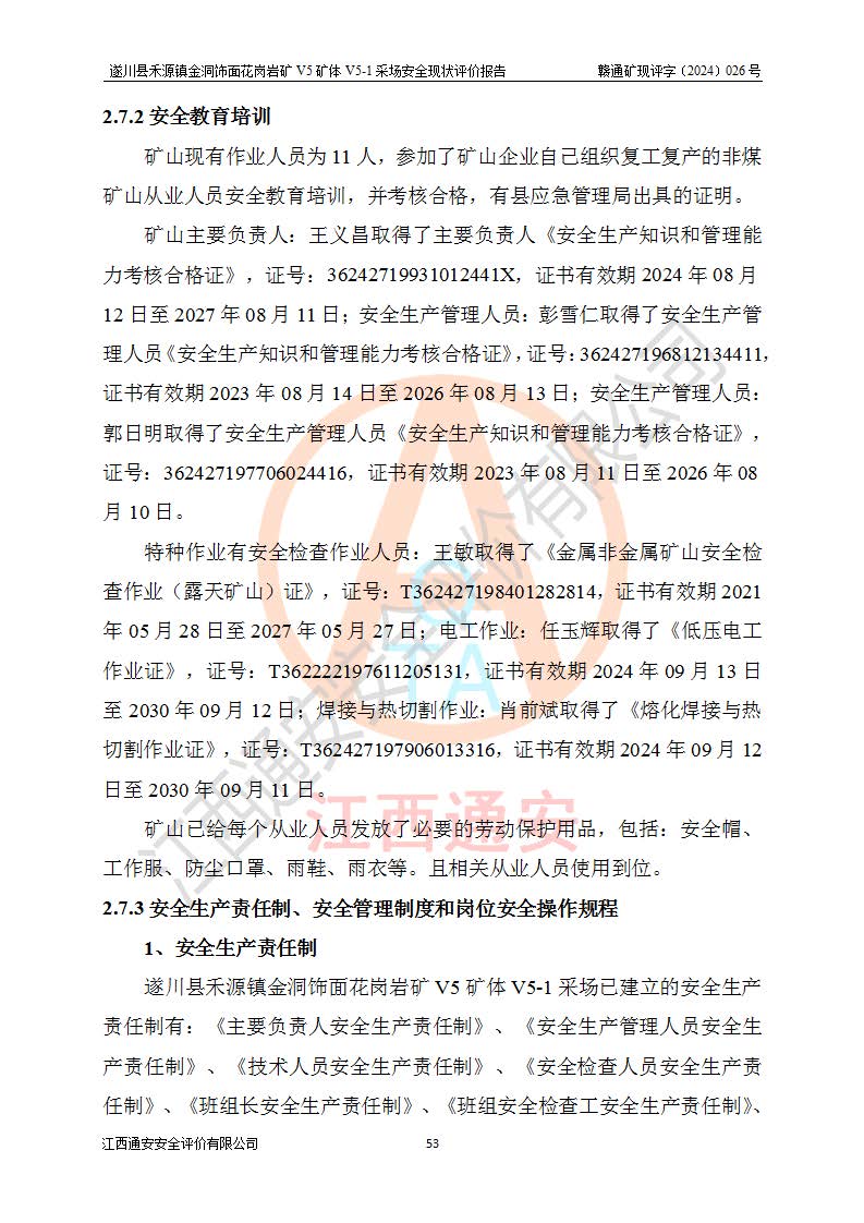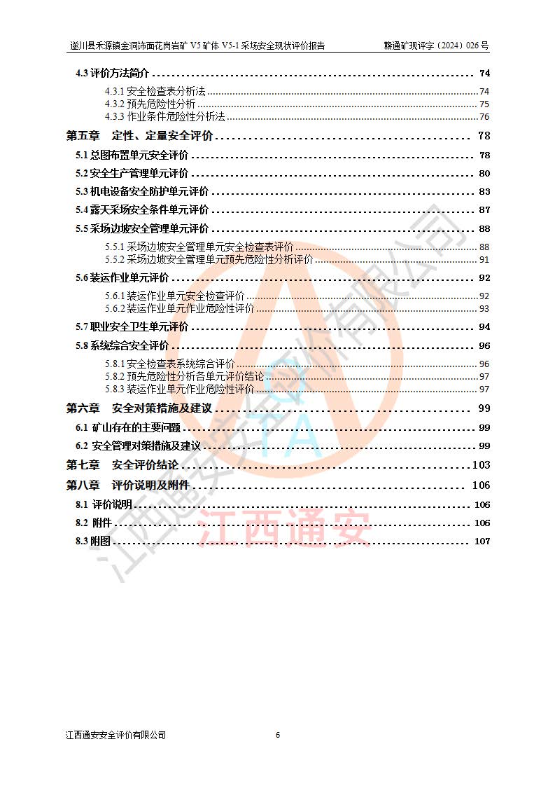 1、該評價項目中存在的主要危險因素:火災,坍塌(滑坡),**傷害,機械傷害,觸電與雷擊,物體打擊,泥石流,起重傷害,高處墜落,淹溺,容器爆炸等危險有害因素。 2、該評價項目中存在的有害因素包括:粉塵、噪聲與振動、不良作業(yè)環(huán)境,如高溫、雷擊對礦山人員的傷害和其他不利的環(huán)境因素等。 3、該評價項目為非金屬露天礦山,無瓦斯和自燃發(fā)火危險,礦區(qū)范圍內(nèi)及周邊無較大水系,礦區(qū)水文地質(zhì)條件簡單。該礦山只是對飾面用石料進行機械開采,不使用有毒有害危險化學品藥劑。該評價項目使用的壓力容器為空壓機儲氣罐,其工作介質(zhì)為空氣,屬**性、非易燃介質(zhì)。綜合上述分析,本評價項目不存在重大危險源。 上述主要危險、有害因素在采取本報告第六章中提出的安全對策措施及建議后,能得到**控制。遂川縣禾源鎮(zhèn)金洞飾面花崗巖礦V5礦體V5-1采場設備、設施和場所符合**安全生產(chǎn)有關法律、法規(guī)、標準及規(guī)范的規(guī)定。礦山采用露天開采、公路開拓、汽車運輸方式,安全生產(chǎn)條件一般,能滿足基本的安全生產(chǎn)活動;安全管理能滿足法規(guī)要求,礦山露天開采按照《安全設施設計》組織生產(chǎn)、具備安全生產(chǎn)條件。 |