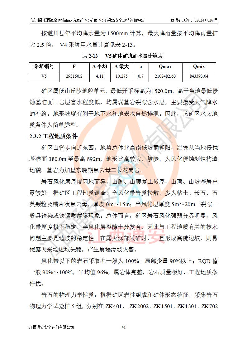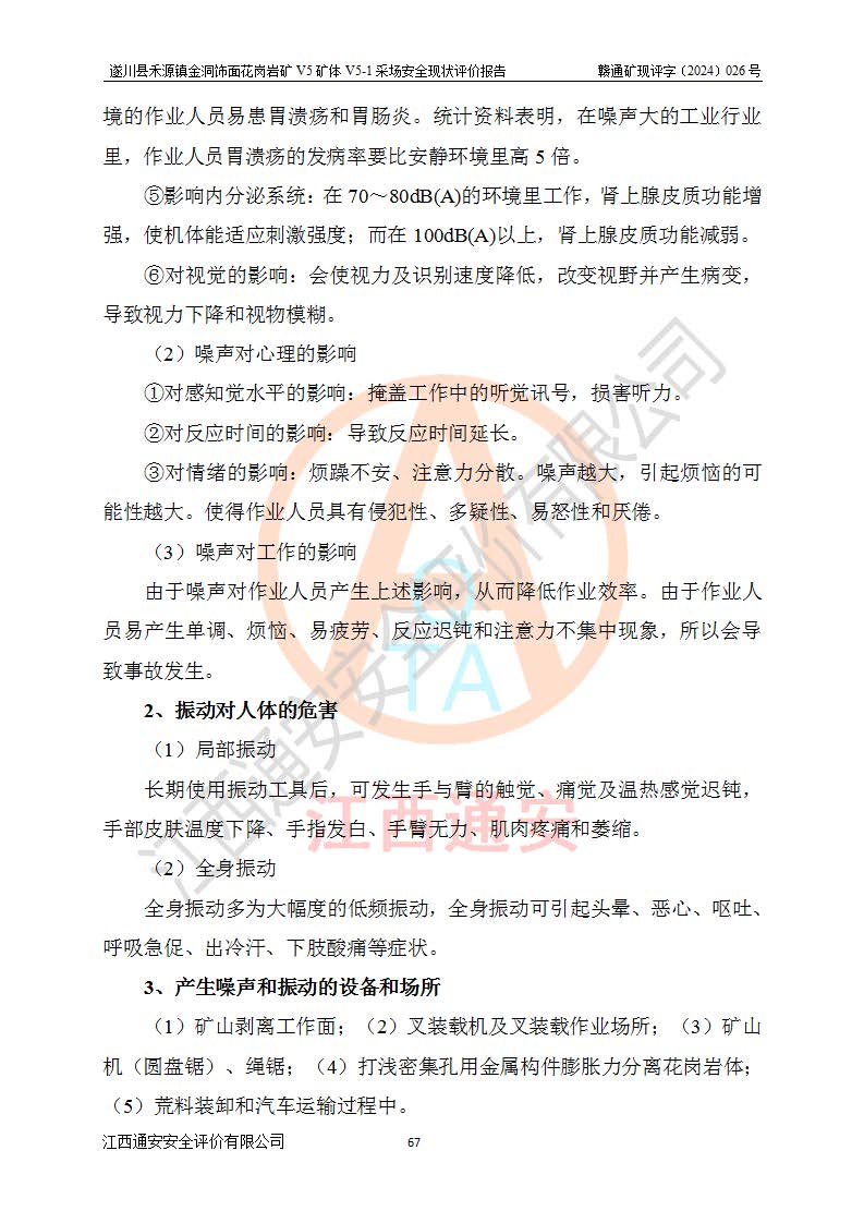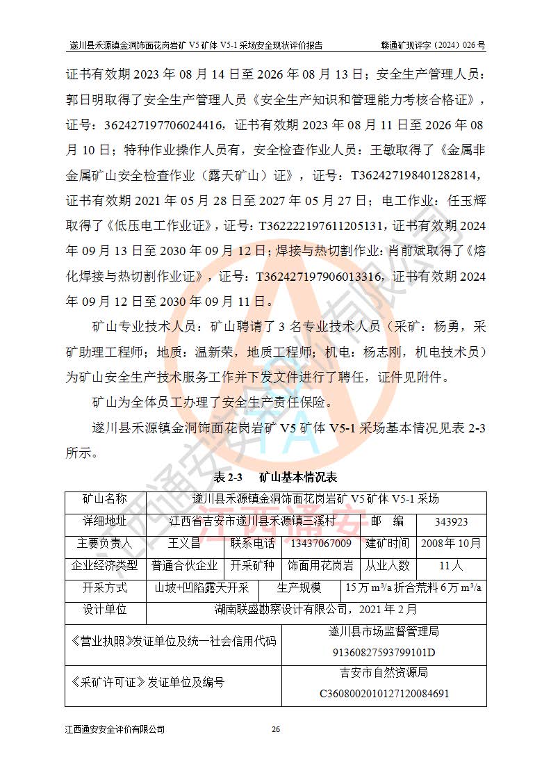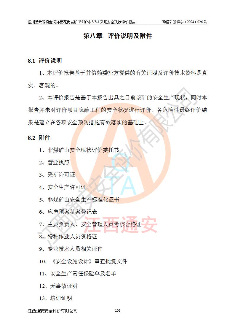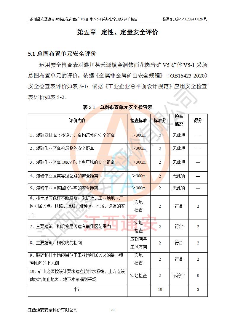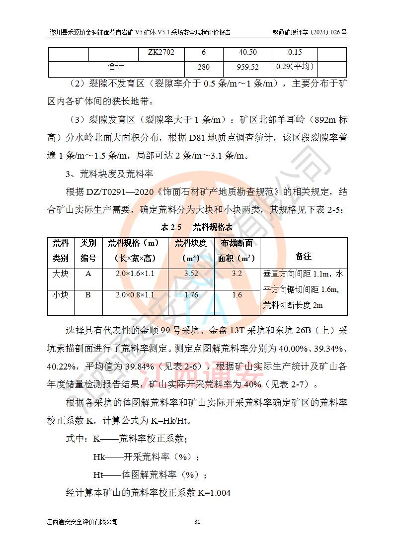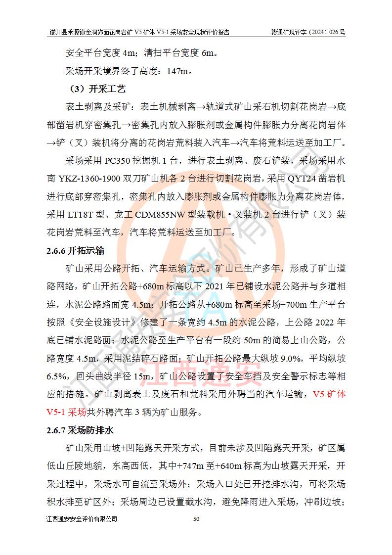1、該評價項目中存在的主要危險因素:火災,坍塌(滑坡),**傷害,機械傷害,觸電與雷擊,物體打擊,泥石流,起重傷害,高處墜落,淹溺,容器爆炸等危險有害因素。 2、該評價項目中存在的有害因素包括:粉塵、噪聲與振動、不良作業(yè)環(huán)境,如高溫、雷擊對礦山人員的傷害和其他不利的環(huán)境因素等。 3、該評價項目為非金屬露天礦山,無瓦斯和自燃發(fā)火危險,礦區(qū)范圍內(nèi)及周邊無較大水系,礦區(qū)水文地質(zhì)條件簡單。該礦山只是對飾面用石料進行機械開采,不使用有毒有害危險化學品藥劑。該評價項目使用的壓力容器為空壓機儲氣罐,其工作介質(zhì)為空氣,屬**性、非易燃介質(zhì)。綜合上述分析,本評價項目不存在重大危險源。 上述主要危險、有害因素在采取本報告第六章中提出的安全對策措施及建議后,能得到**控制。遂川縣禾源鎮(zhèn)金洞飾面花崗巖礦V5礦體V5-1采場設備、設施和場所符合**安全生產(chǎn)有關法律、法規(guī)、標準及規(guī)范的規(guī)定。礦山采用露天開采、公路開拓、汽車運輸方式,安全生產(chǎn)條件一般,能滿足基本的安全生產(chǎn)活動;安全管理能滿足法規(guī)要求,礦山露天開采按照《安全設施設計》組織生產(chǎn)、具備安全生產(chǎn)條件。 |