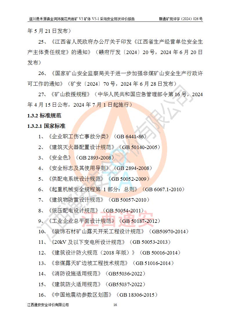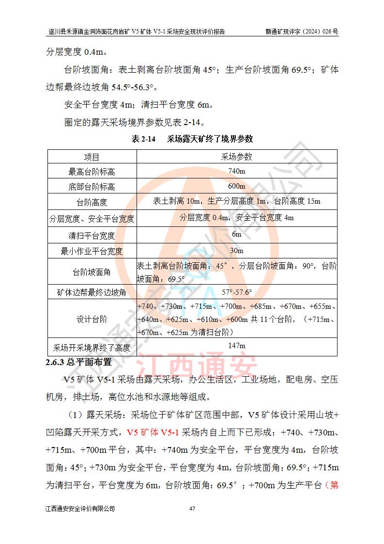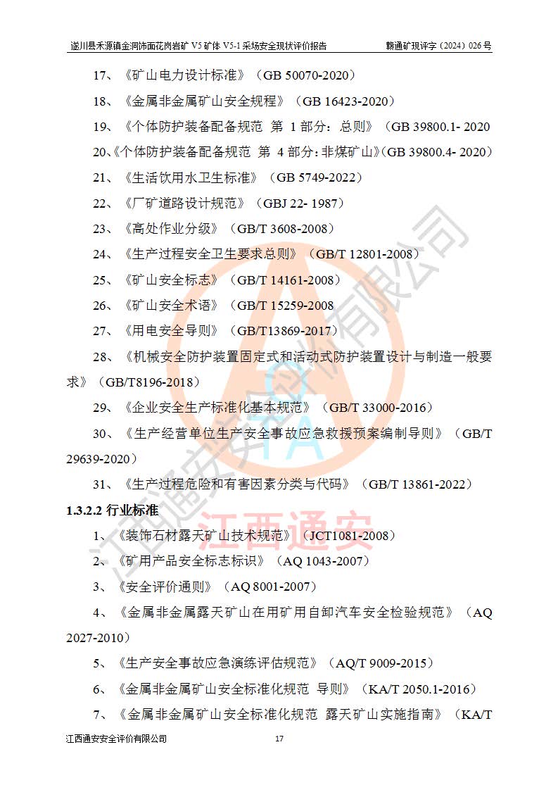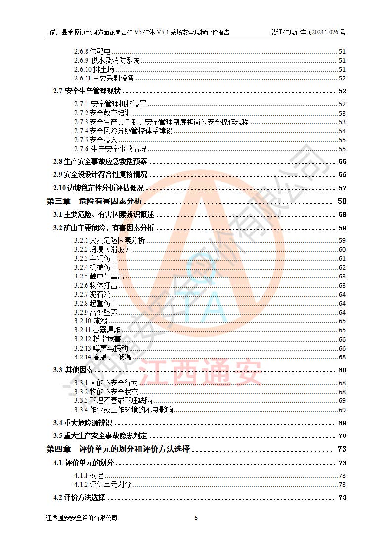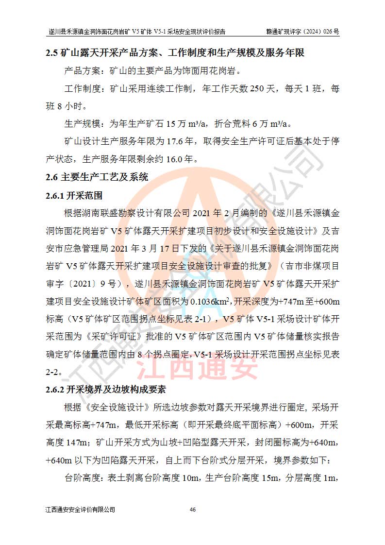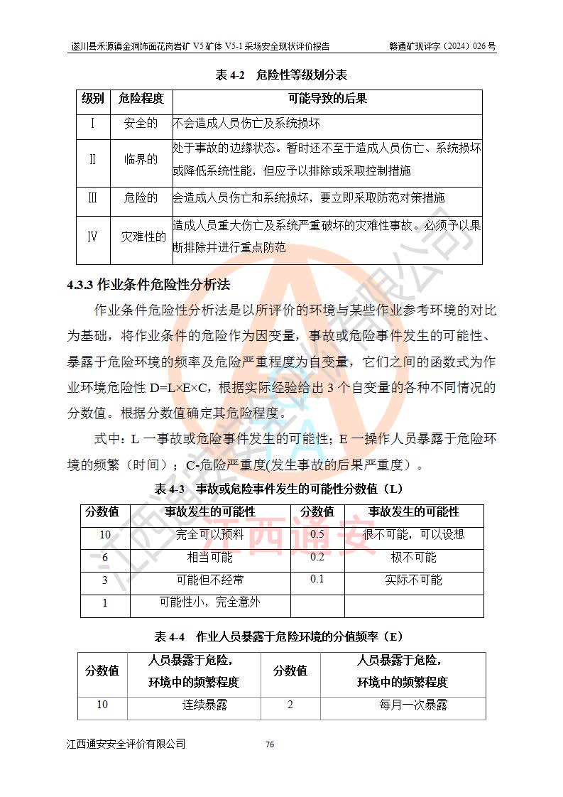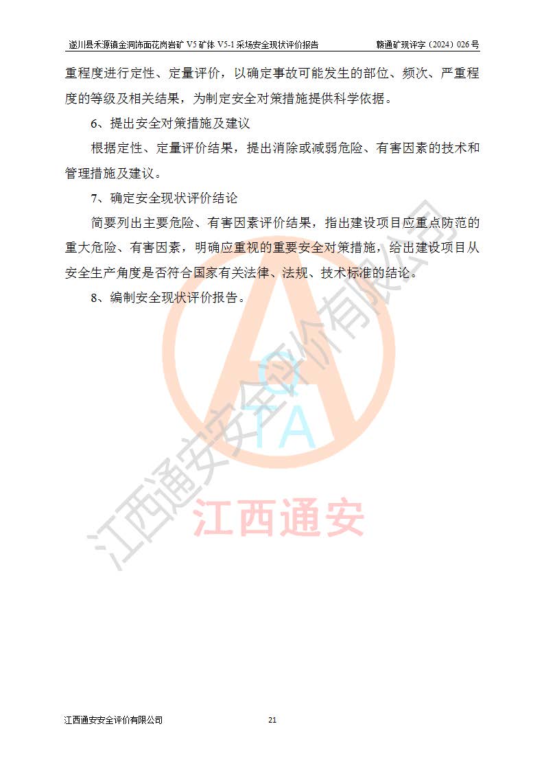 1、該評價項目中存在的主要危險因素:火災,坍塌(滑坡),**傷害,機械傷害,觸電與雷擊,物體打擊,泥石流,起重傷害,高處墜落,淹溺,容器爆炸等危險有害因素。 2、該評價項目中存在的有害因素包括:粉塵、噪聲與振動、不良作業(yè)環(huán)境,如高溫、雷擊對礦山人員的傷害和其他不利的環(huán)境因素等。 3、該評價項目為非金屬露天礦山,無瓦斯和自燃發(fā)火危險,礦區(qū)范圍內(nèi)及周邊無較大水系,礦區(qū)水文地質(zhì)條件簡單。該礦山只是對飾面用石料進行機械開采,不使用有毒有害危險化學品藥劑。該評價項目使用的壓力容器為空壓機儲氣罐,其工作介質(zhì)為空氣,屬**性、非易燃介質(zhì)。綜合上述分析,本評價項目不存在重大危險源。 上述主要危險、有害因素在采取本報告第六章中提出的安全對策措施及建議后,能得到**控制。遂川縣禾源鎮(zhèn)金洞飾面花崗巖礦V5礦體V5-1采場設備、設施和場所符合**安全生產(chǎn)有關法律、法規(guī)、標準及規(guī)范的規(guī)定。礦山采用露天開采、公路開拓、汽車運輸方式,安全生產(chǎn)條件一般,能滿足基本的安全生產(chǎn)活動;安全管理能滿足法規(guī)要求,礦山露天開采按照《安全設施設計》組織生產(chǎn)、具備安全生產(chǎn)條件。 |