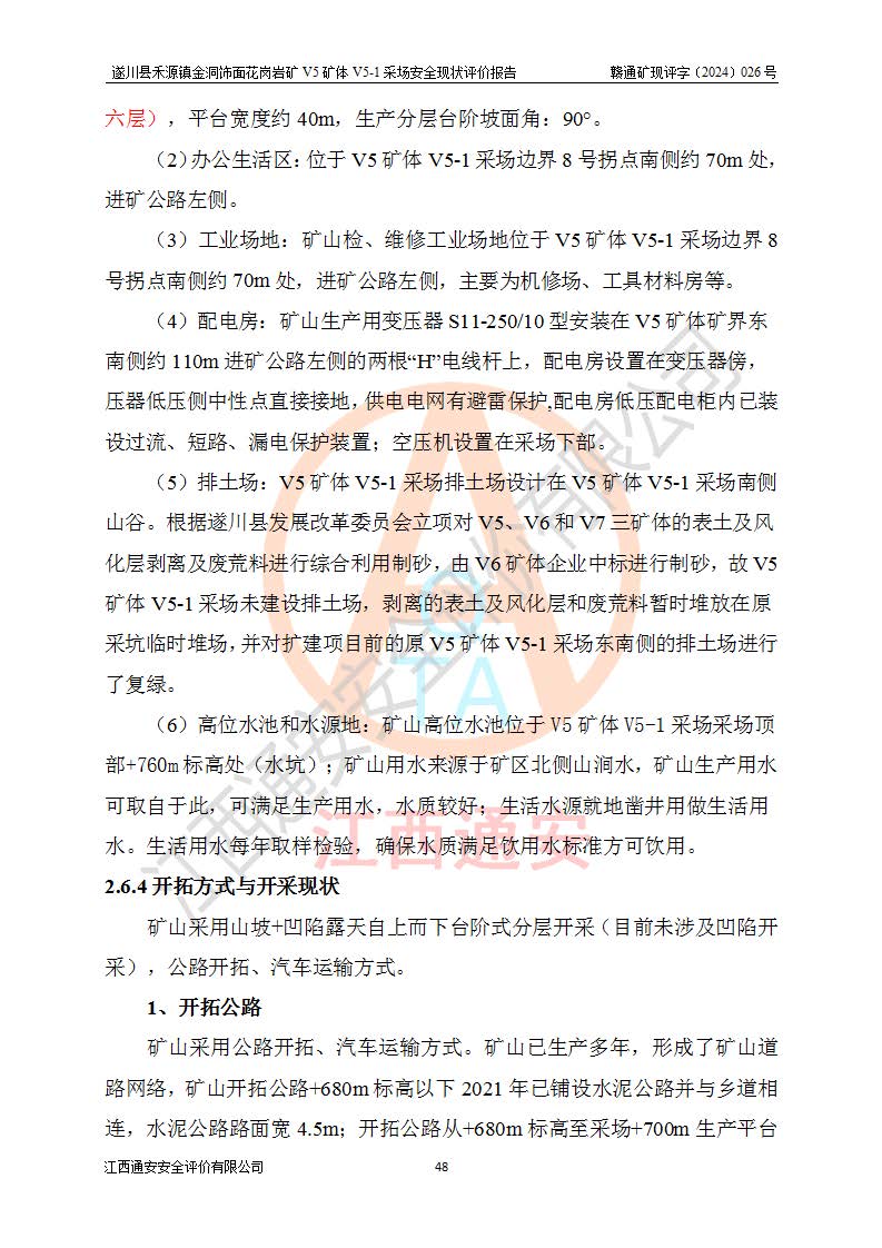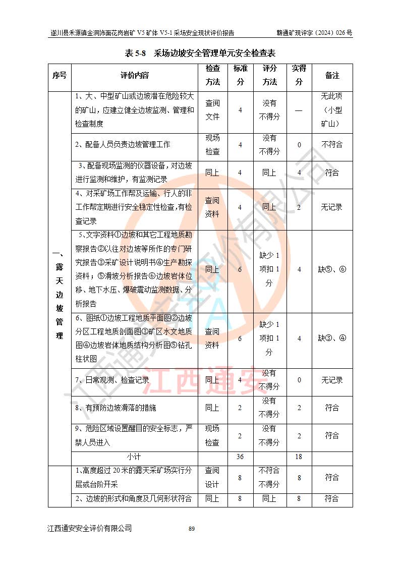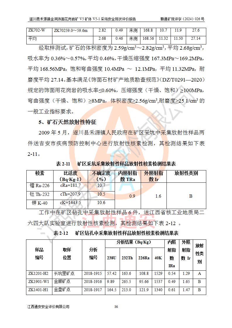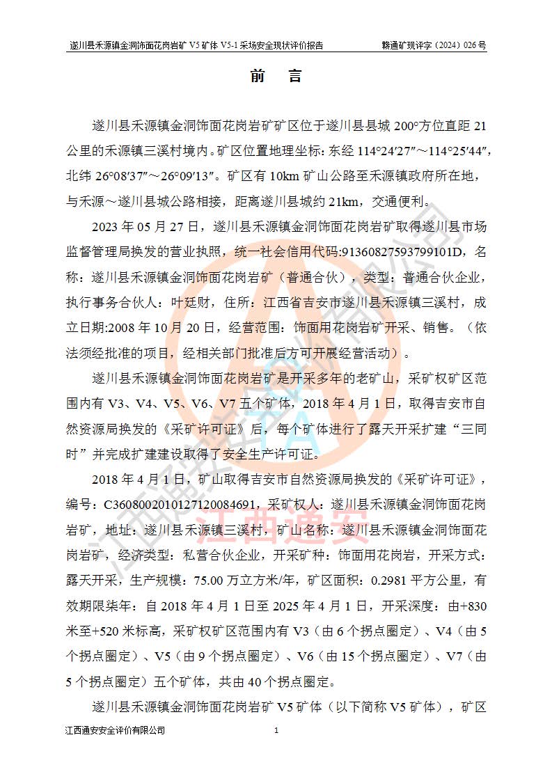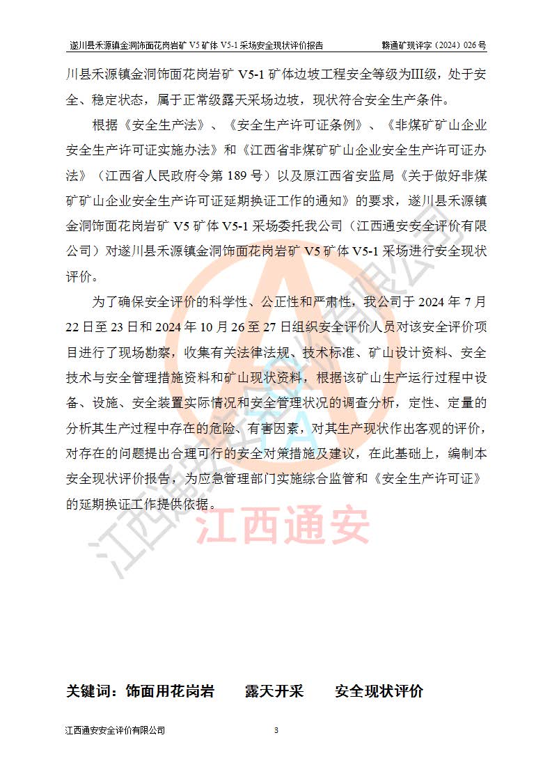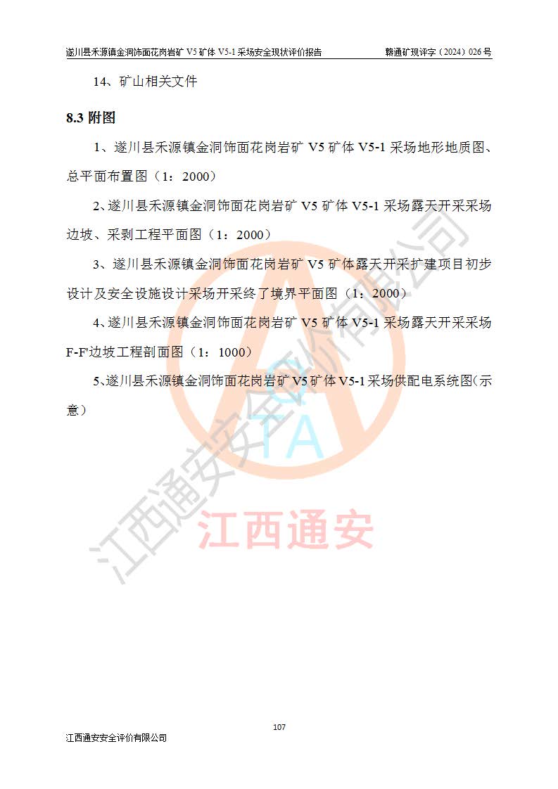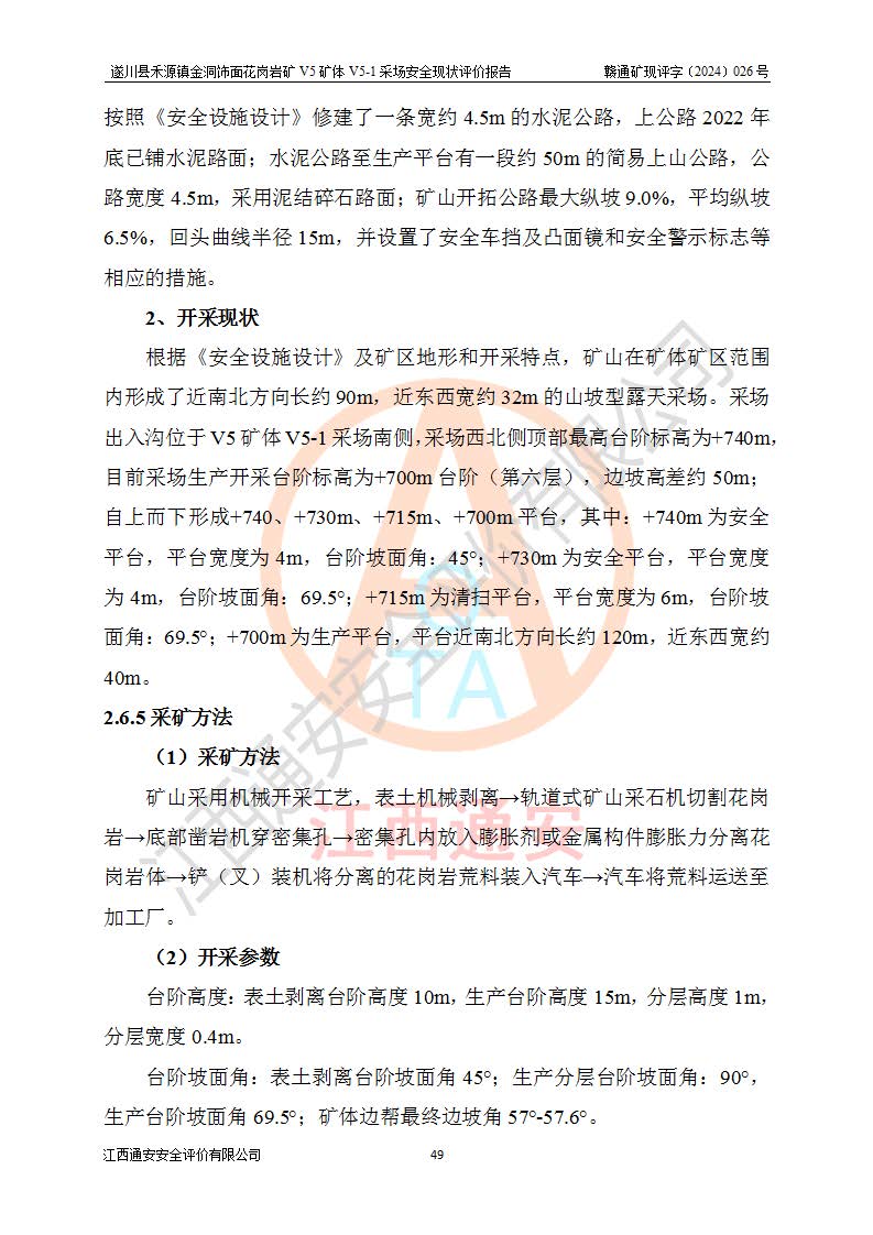 1、該評價項目中存在的主要危險因素:火災,坍塌(滑坡),**傷害,機械傷害,觸電與雷擊,物體打擊,泥石流,起重傷害,高處墜落,淹溺,容器爆炸等危險有害因素。 2、該評價項目中存在的有害因素包括:粉塵、噪聲與振動、不良作業(yè)環(huán)境,如高溫、雷擊對礦山人員的傷害和其他不利的環(huán)境因素等。 3、該評價項目為非金屬露天礦山,無瓦斯和自燃發(fā)火危險,礦區(qū)范圍內(nèi)及周邊無較大水系,礦區(qū)水文地質(zhì)條件簡單。該礦山只是對飾面用石料進行機械開采,不使用有毒有害危險化學品藥劑。該評價項目使用的壓力容器為空壓機儲氣罐,其工作介質(zhì)為空氣,屬**性、非易燃介質(zhì)。綜合上述分析,本評價項目不存在重大危險源。 上述主要危險、有害因素在采取本報告第六章中提出的安全對策措施及建議后,能得到**控制。遂川縣禾源鎮(zhèn)金洞飾面花崗巖礦V5礦體V5-1采場設備、設施和場所符合**安全生產(chǎn)有關法律、法規(guī)、標準及規(guī)范的規(guī)定。礦山采用露天開采、公路開拓、汽車運輸方式,安全生產(chǎn)條件一般,能滿足基本的安全生產(chǎn)活動;安全管理能滿足法規(guī)要求,礦山露天開采按照《安全設施設計》組織生產(chǎn)、具備安全生產(chǎn)條件。 |