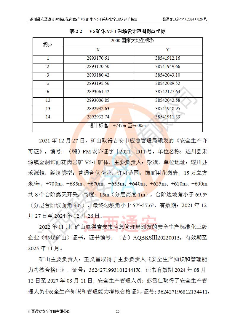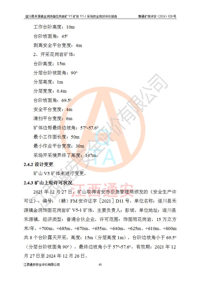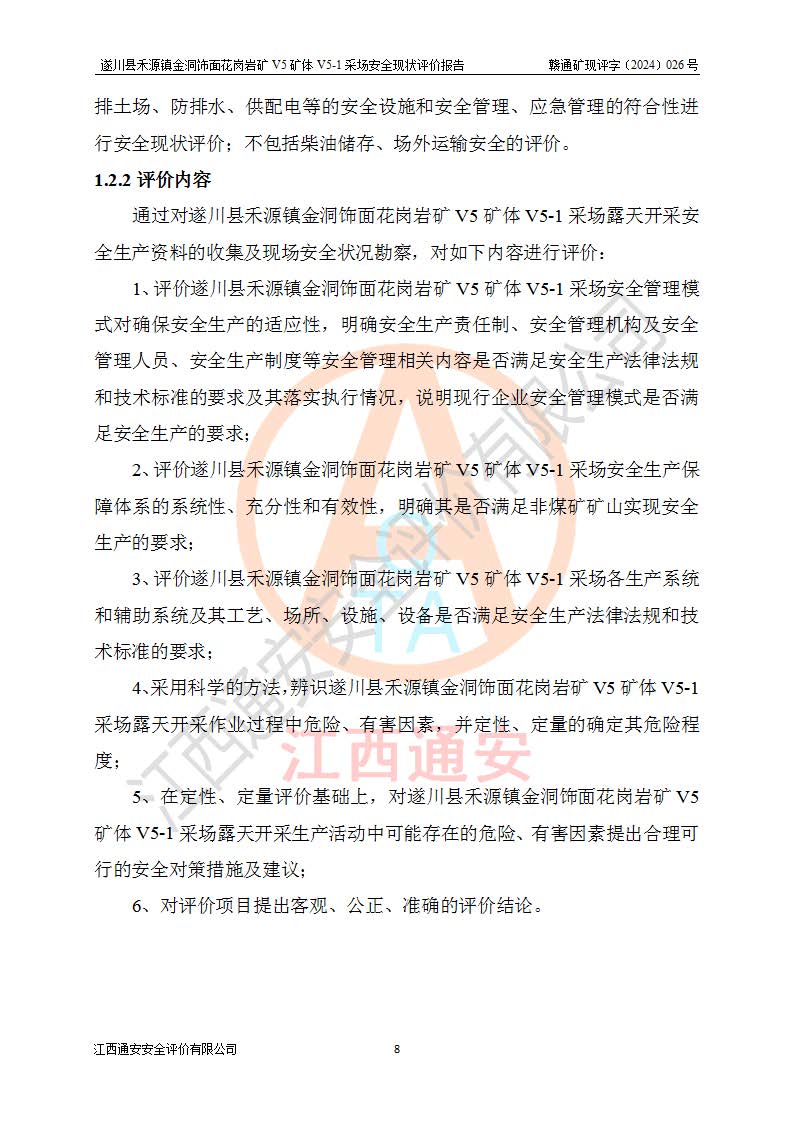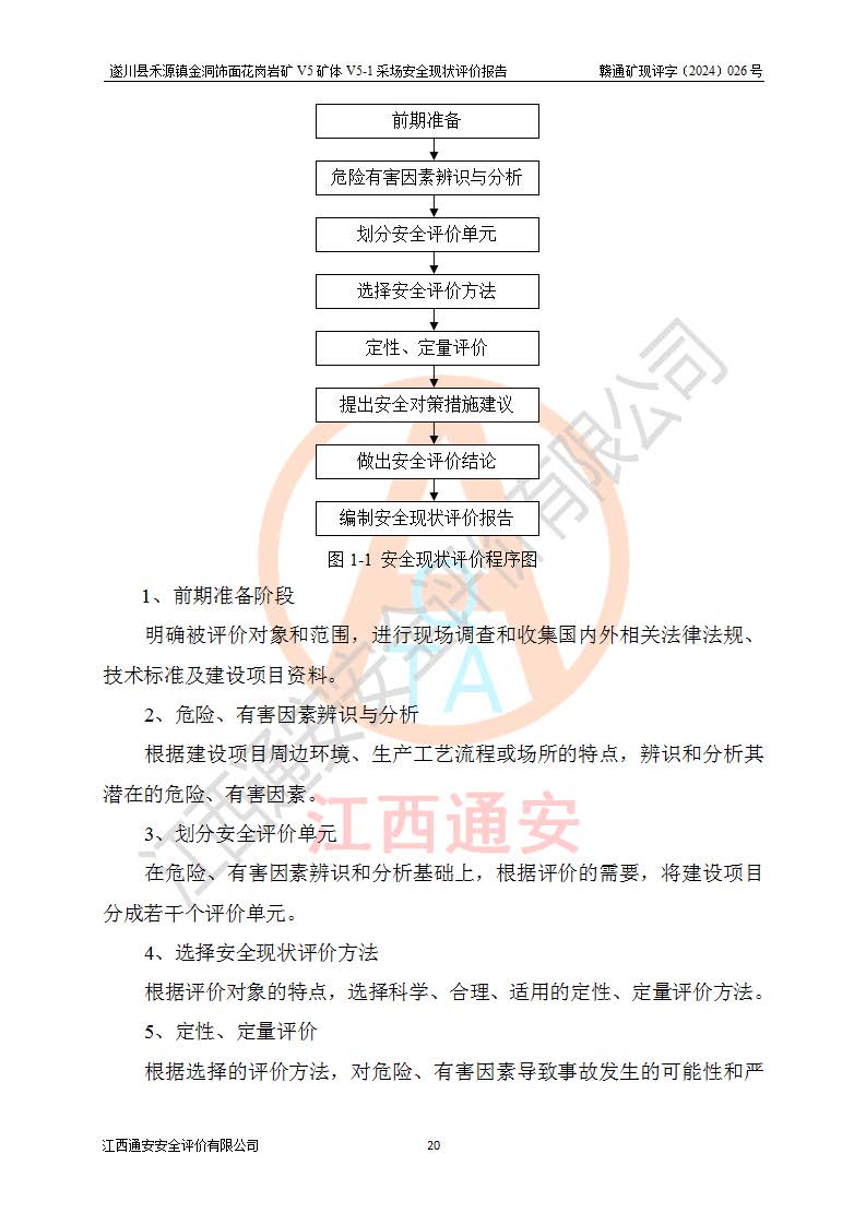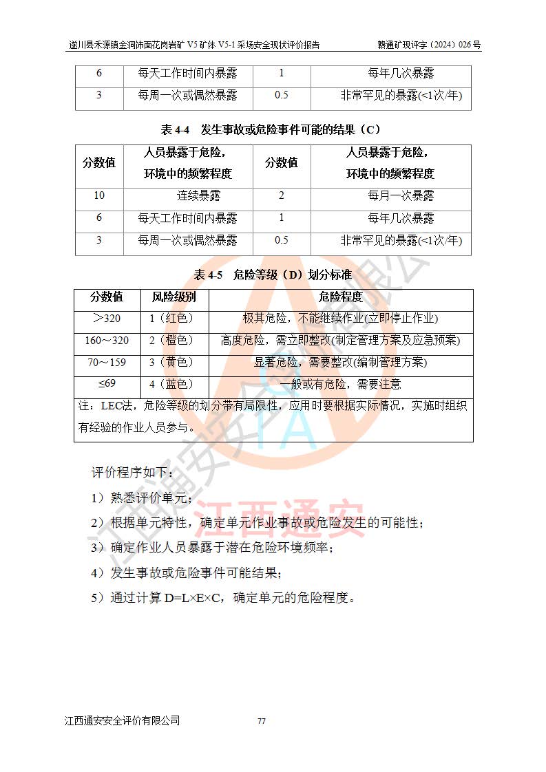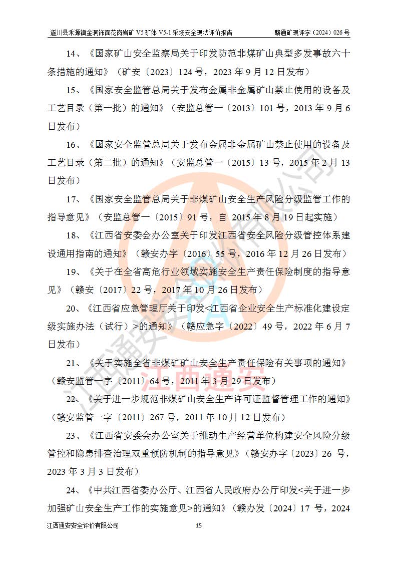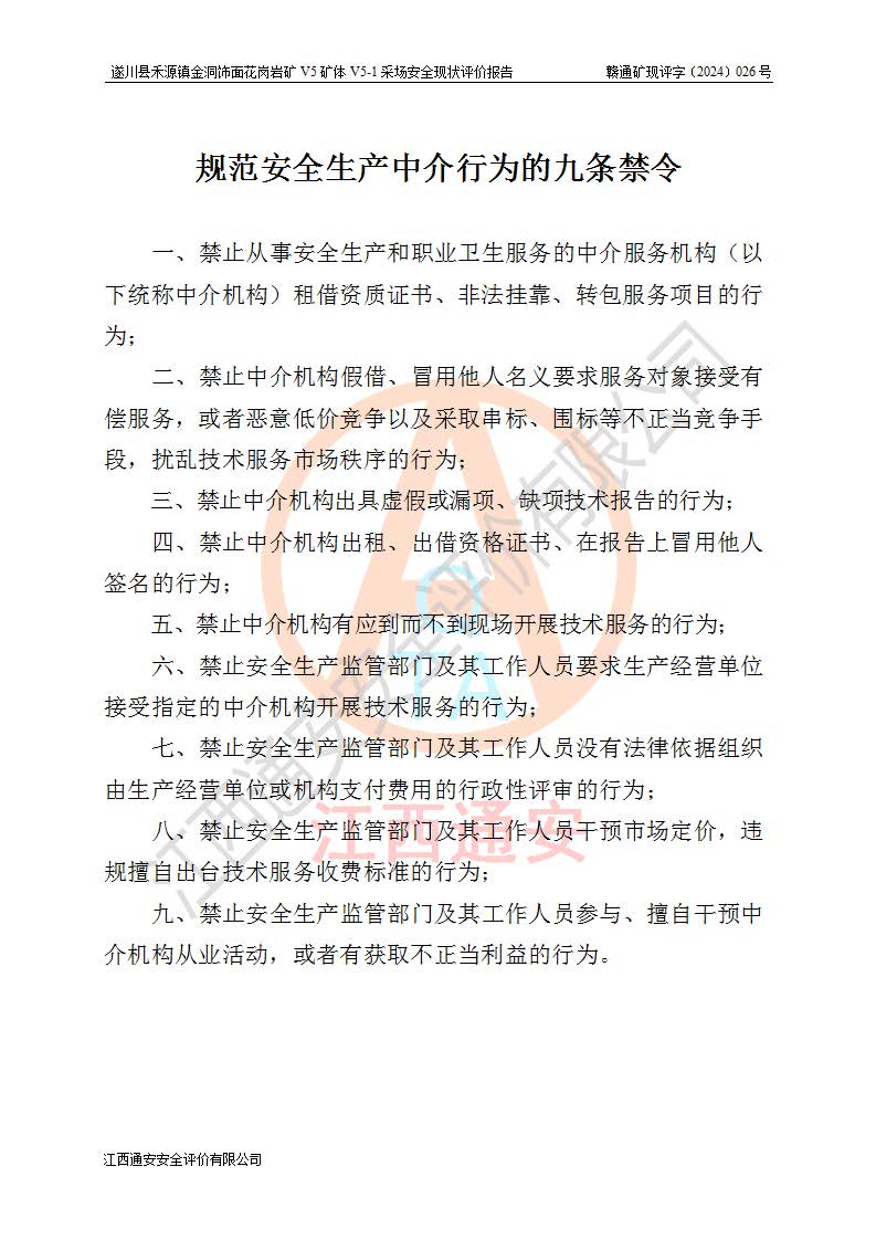 1、該評價項目中存在的主要危險因素:火災,坍塌(滑坡),**傷害,機械傷害,觸電與雷擊,物體打擊,泥石流,起重傷害,高處墜落,淹溺,容器爆炸等危險有害因素。 2、該評價項目中存在的有害因素包括:粉塵、噪聲與振動、不良作業(yè)環(huán)境,如高溫、雷擊對礦山人員的傷害和其他不利的環(huán)境因素等。 3、該評價項目為非金屬露天礦山,無瓦斯和自燃發(fā)火危險,礦區(qū)范圍內(nèi)及周邊無較大水系,礦區(qū)水文地質(zhì)條件簡單。該礦山只是對飾面用石料進行機械開采,不使用有毒有害危險化學品藥劑。該評價項目使用的壓力容器為空壓機儲氣罐,其工作介質(zhì)為空氣,屬**性、非易燃介質(zhì)。綜合上述分析,本評價項目不存在重大危險源。 上述主要危險、有害因素在采取本報告第六章中提出的安全對策措施及建議后,能得到**控制。遂川縣禾源鎮(zhèn)金洞飾面花崗巖礦V5礦體V5-1采場設備、設施和場所符合**安全生產(chǎn)有關法律、法規(guī)、標準及規(guī)范的規(guī)定。礦山采用露天開采、公路開拓、汽車運輸方式,安全生產(chǎn)條件一般,能滿足基本的安全生產(chǎn)活動;安全管理能滿足法規(guī)要求,礦山露天開采按照《安全設施設計》組織生產(chǎn)、具備安全生產(chǎn)條件。 |