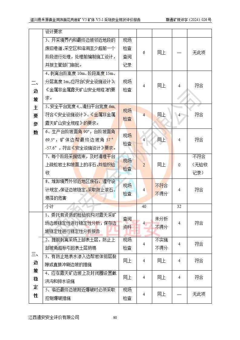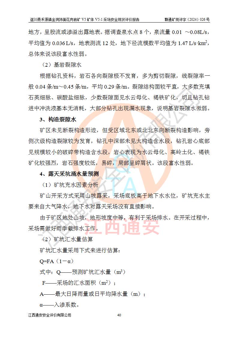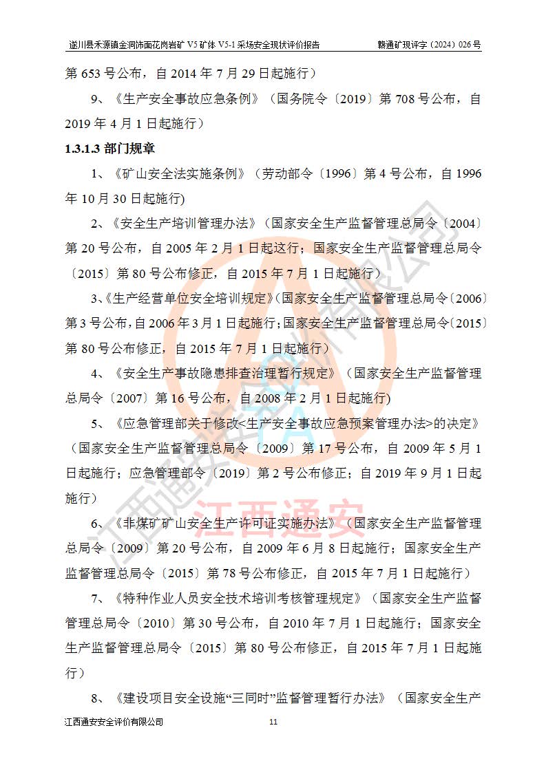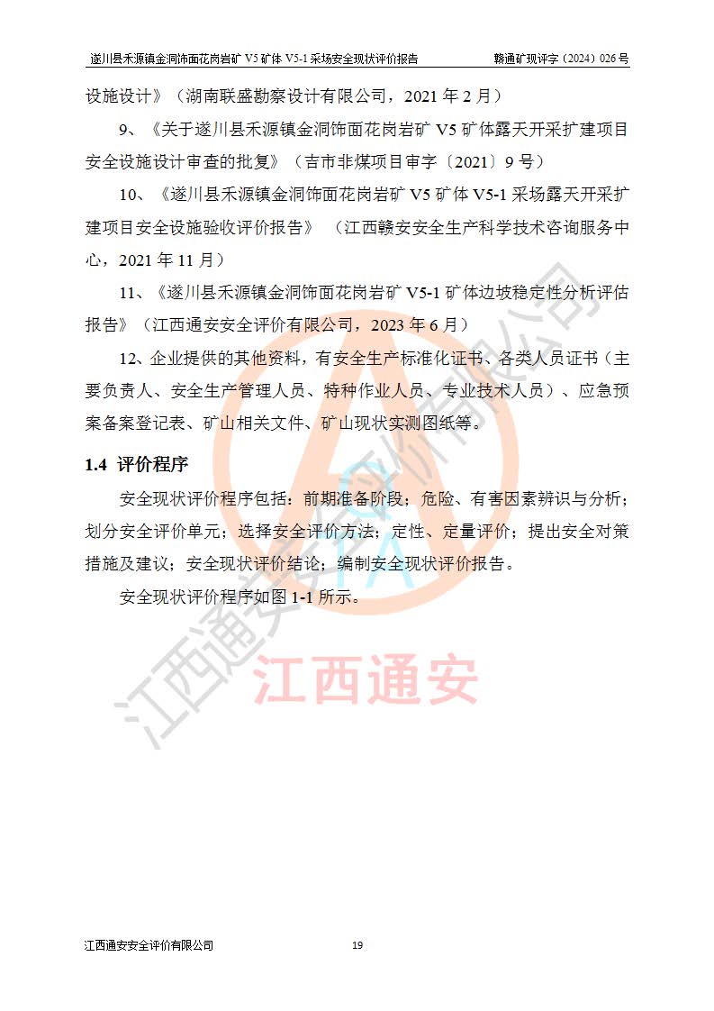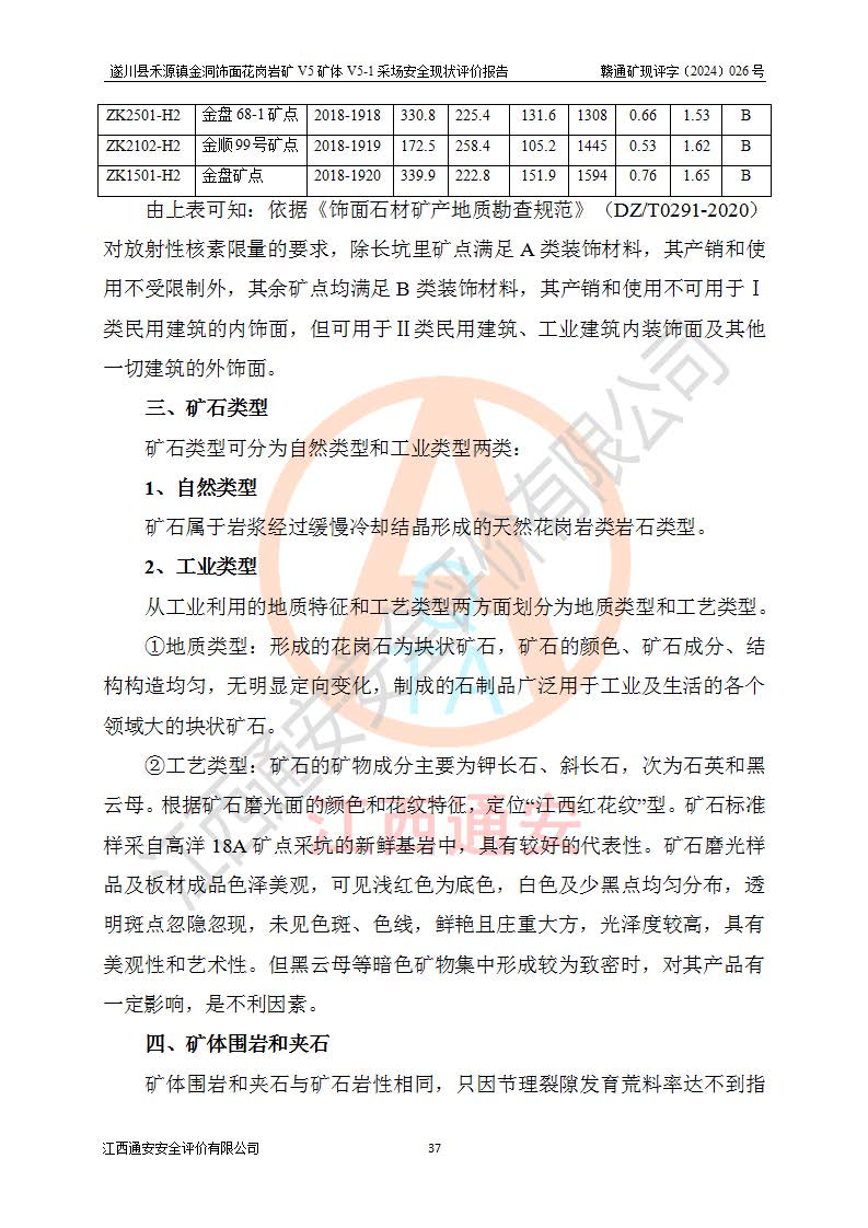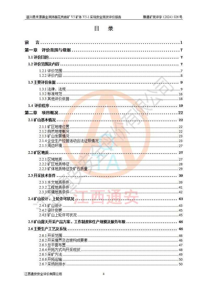 1、該評價項目中存在的主要危險因素:火災,坍塌(滑坡),**傷害,機械傷害,觸電與雷擊,物體打擊,泥石流,起重傷害,高處墜落,淹溺,容器爆炸等危險有害因素。 2、該評價項目中存在的有害因素包括:粉塵、噪聲與振動、不良作業(yè)環(huán)境,如高溫、雷擊對礦山人員的傷害和其他不利的環(huán)境因素等。 3、該評價項目為非金屬露天礦山,無瓦斯和自燃發(fā)火危險,礦區(qū)范圍內(nèi)及周邊無較大水系,礦區(qū)水文地質(zhì)條件簡單。該礦山只是對飾面用石料進行機械開采,不使用有毒有害危險化學品藥劑。該評價項目使用的壓力容器為空壓機儲氣罐,其工作介質(zhì)為空氣,屬**性、非易燃介質(zhì)。綜合上述分析,本評價項目不存在重大危險源。 上述主要危險、有害因素在采取本報告第六章中提出的安全對策措施及建議后,能得到**控制。遂川縣禾源鎮(zhèn)金洞飾面花崗巖礦V5礦體V5-1采場設備、設施和場所符合**安全生產(chǎn)有關法律、法規(guī)、標準及規(guī)范的規(guī)定。礦山采用露天開采、公路開拓、汽車運輸方式,安全生產(chǎn)條件一般,能滿足基本的安全生產(chǎn)活動;安全管理能滿足法規(guī)要求,礦山露天開采按照《安全設施設計》組織生產(chǎn)、具備安全生產(chǎn)條件。 |
