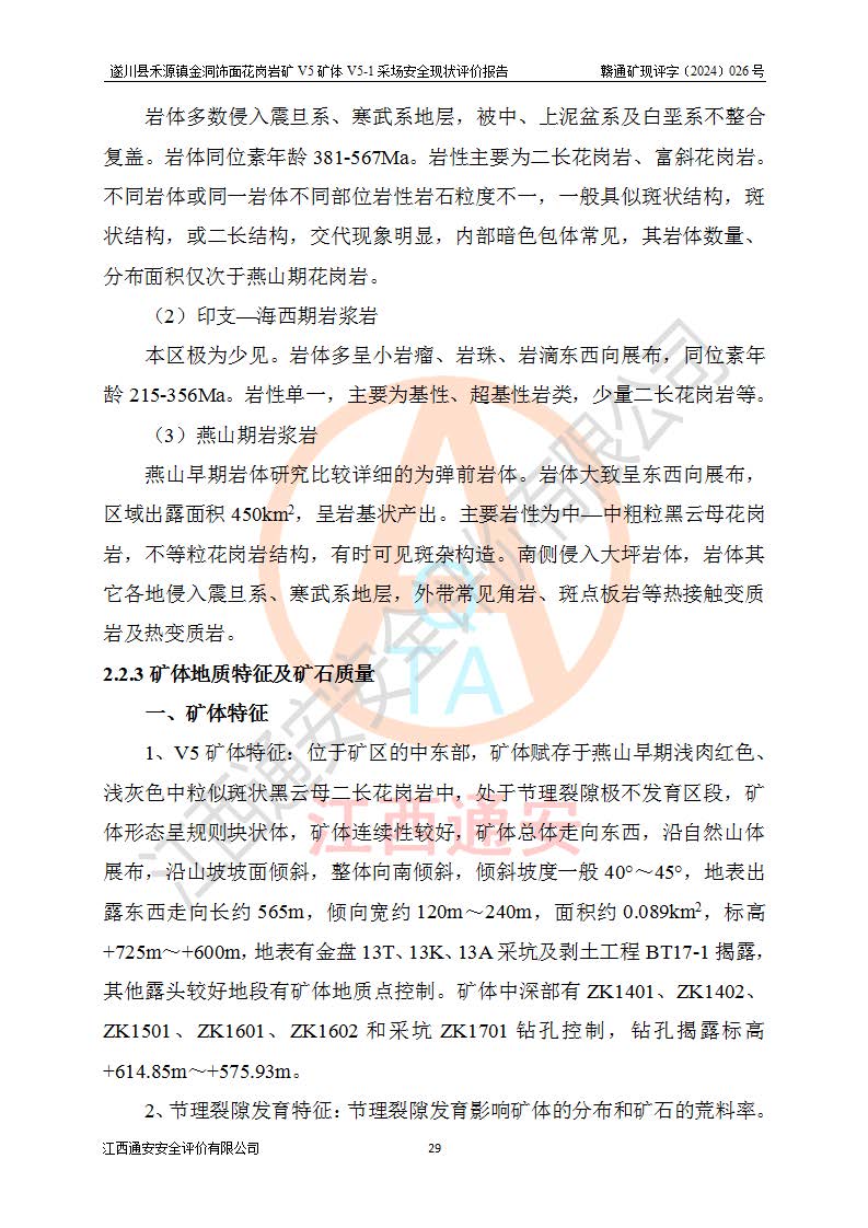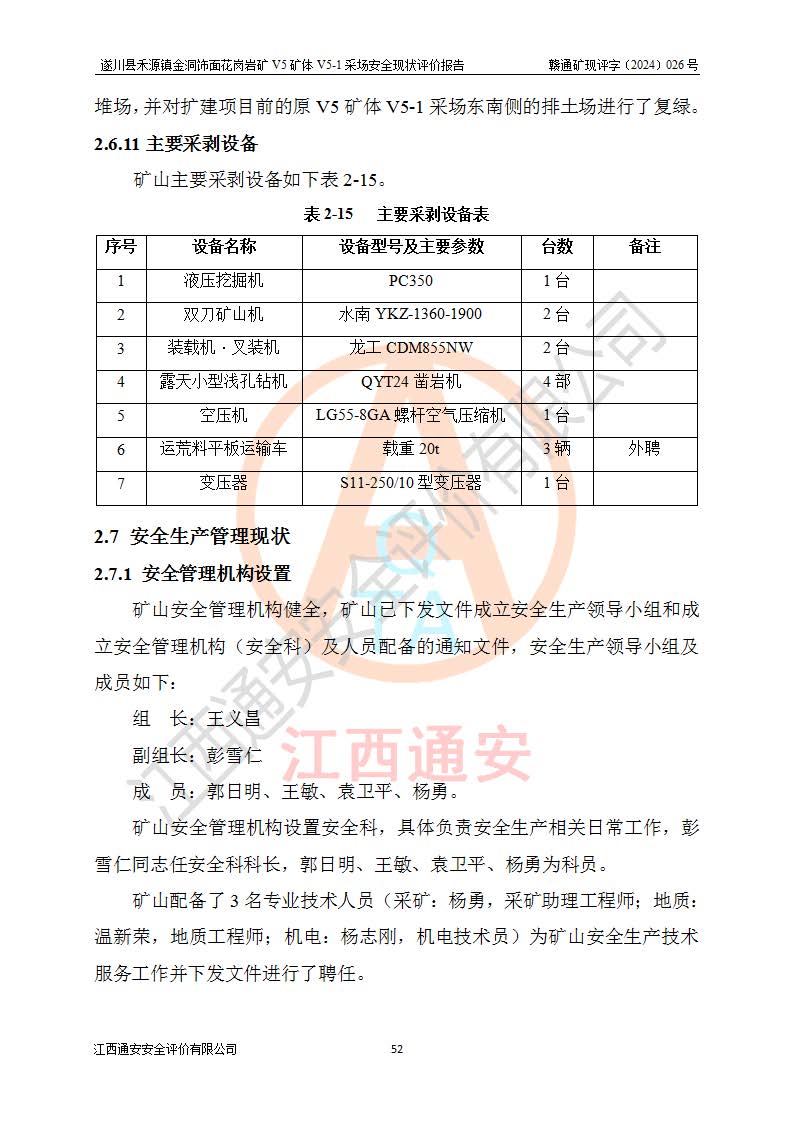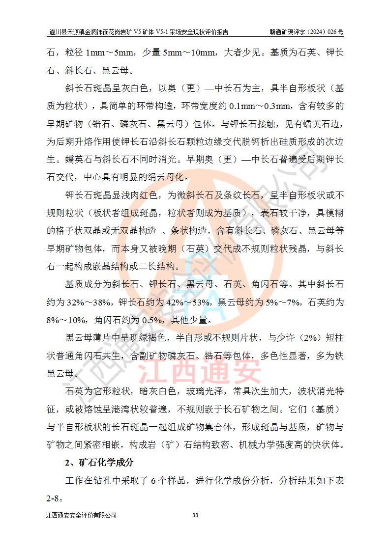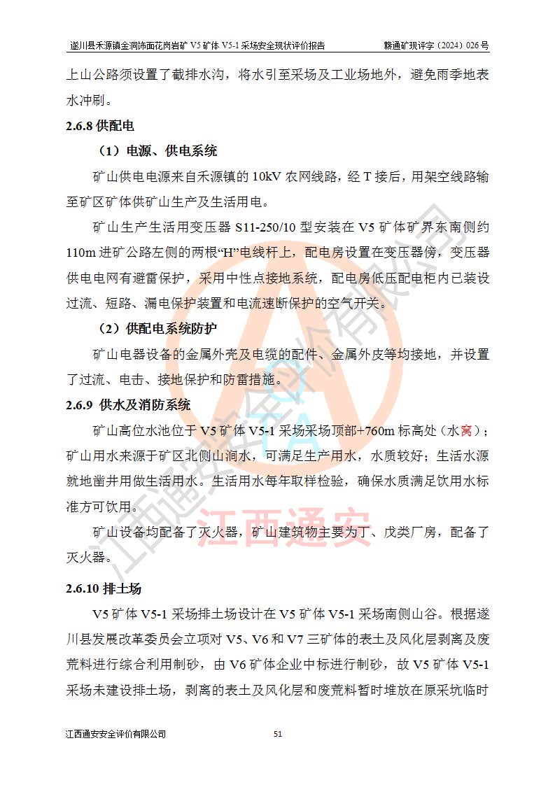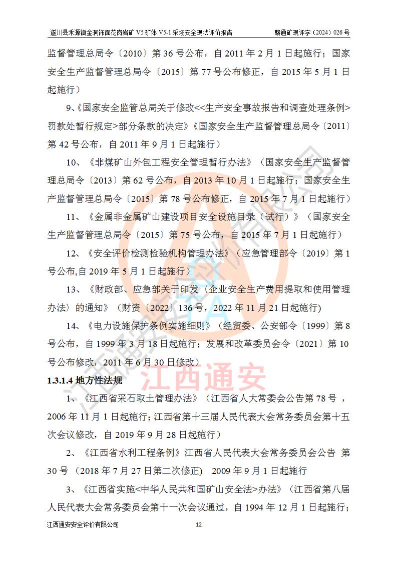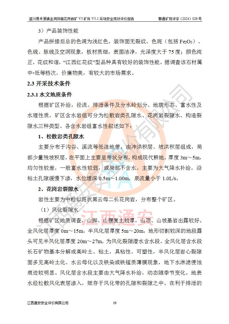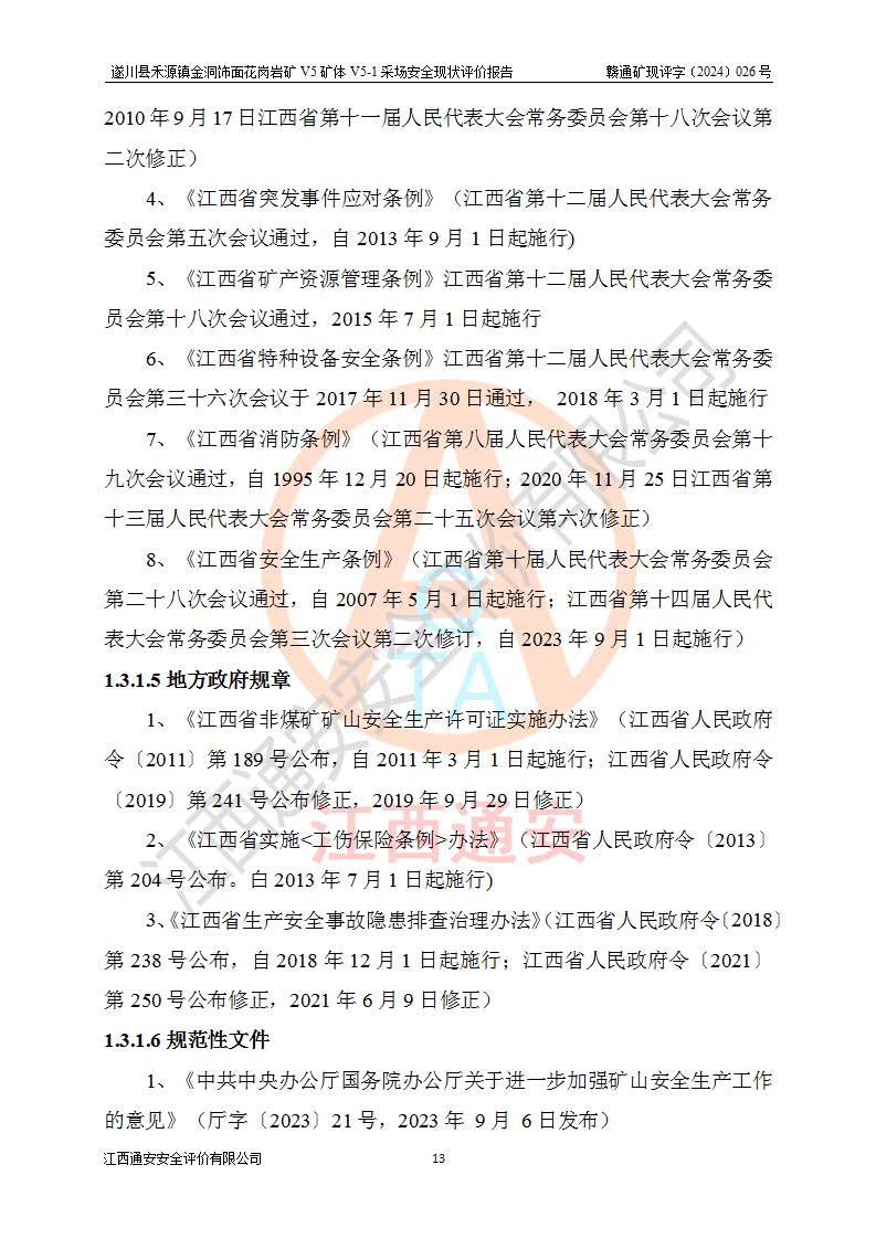 1、該評價項目中存在的主要危險因素:火災,坍塌(滑坡),**傷害,機械傷害,觸電與雷擊,物體打擊,泥石流,起重傷害,高處墜落,淹溺,容器爆炸等危險有害因素。 2、該評價項目中存在的有害因素包括:粉塵、噪聲與振動、不良作業(yè)環(huán)境,如高溫、雷擊對礦山人員的傷害和其他不利的環(huán)境因素等。 3、該評價項目為非金屬露天礦山,無瓦斯和自燃發(fā)火危險,礦區(qū)范圍內(nèi)及周邊無較大水系,礦區(qū)水文地質(zhì)條件簡單。該礦山只是對飾面用石料進行機械開采,不使用有毒有害危險化學品藥劑。該評價項目使用的壓力容器為空壓機儲氣罐,其工作介質(zhì)為空氣,屬**性、非易燃介質(zhì)。綜合上述分析,本評價項目不存在重大危險源。 上述主要危險、有害因素在采取本報告第六章中提出的安全對策措施及建議后,能得到**控制。遂川縣禾源鎮(zhèn)金洞飾面花崗巖礦V5礦體V5-1采場設備、設施和場所符合**安全生產(chǎn)有關法律、法規(guī)、標準及規(guī)范的規(guī)定。礦山采用露天開采、公路開拓、汽車運輸方式,安全生產(chǎn)條件一般,能滿足基本的安全生產(chǎn)活動;安全管理能滿足法規(guī)要求,礦山露天開采按照《安全設施設計》組織生產(chǎn)、具備安全生產(chǎn)條件。 |