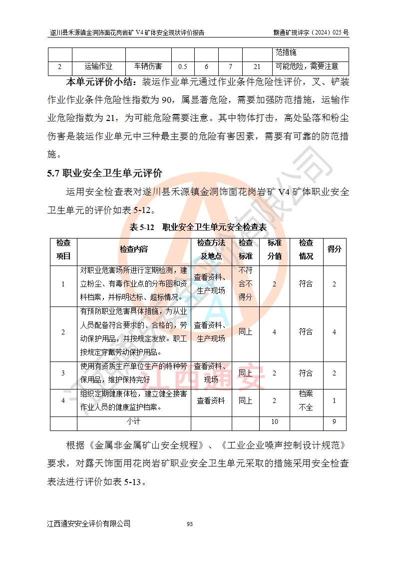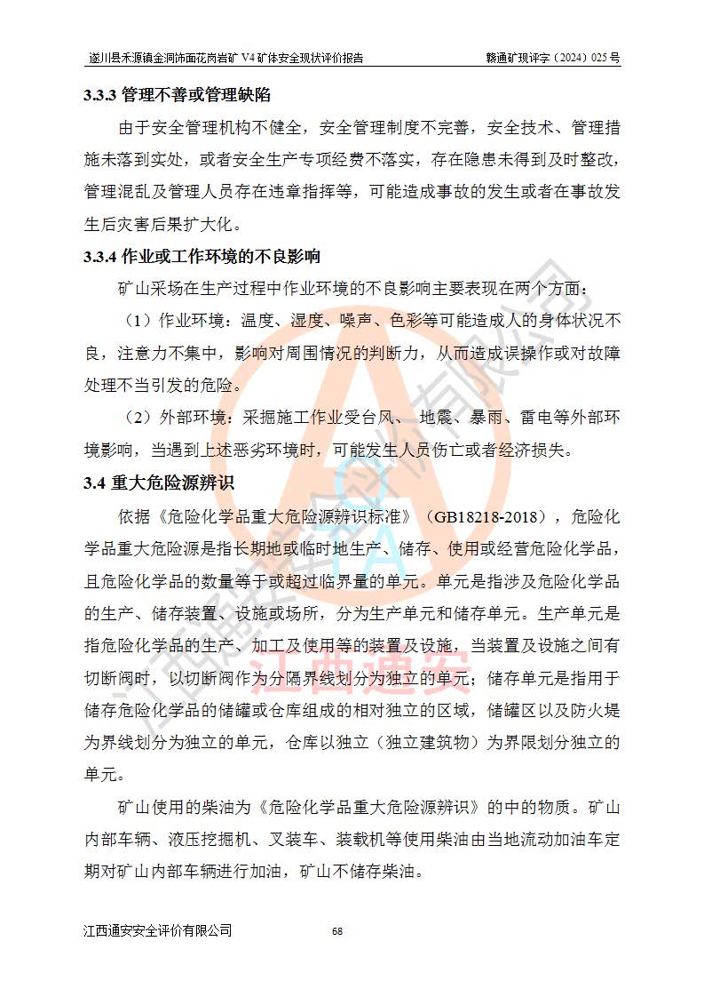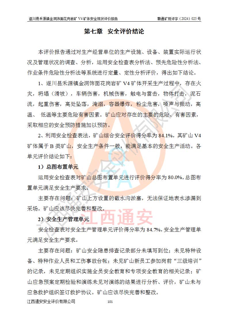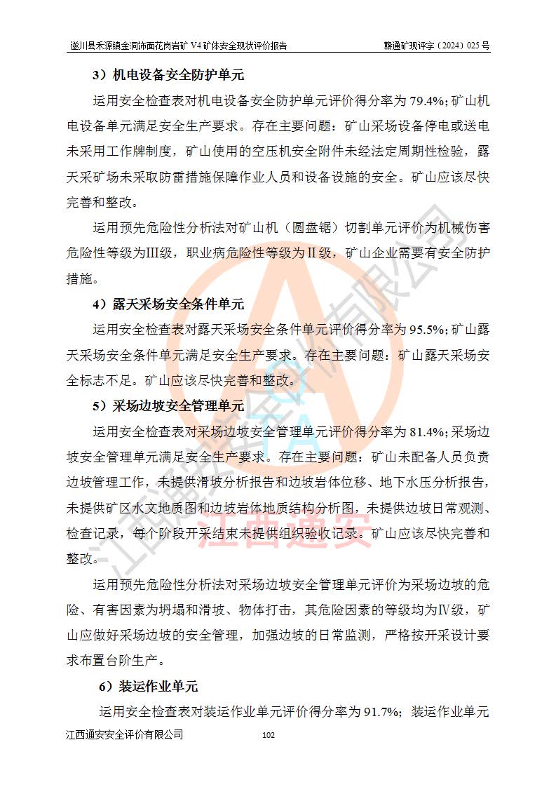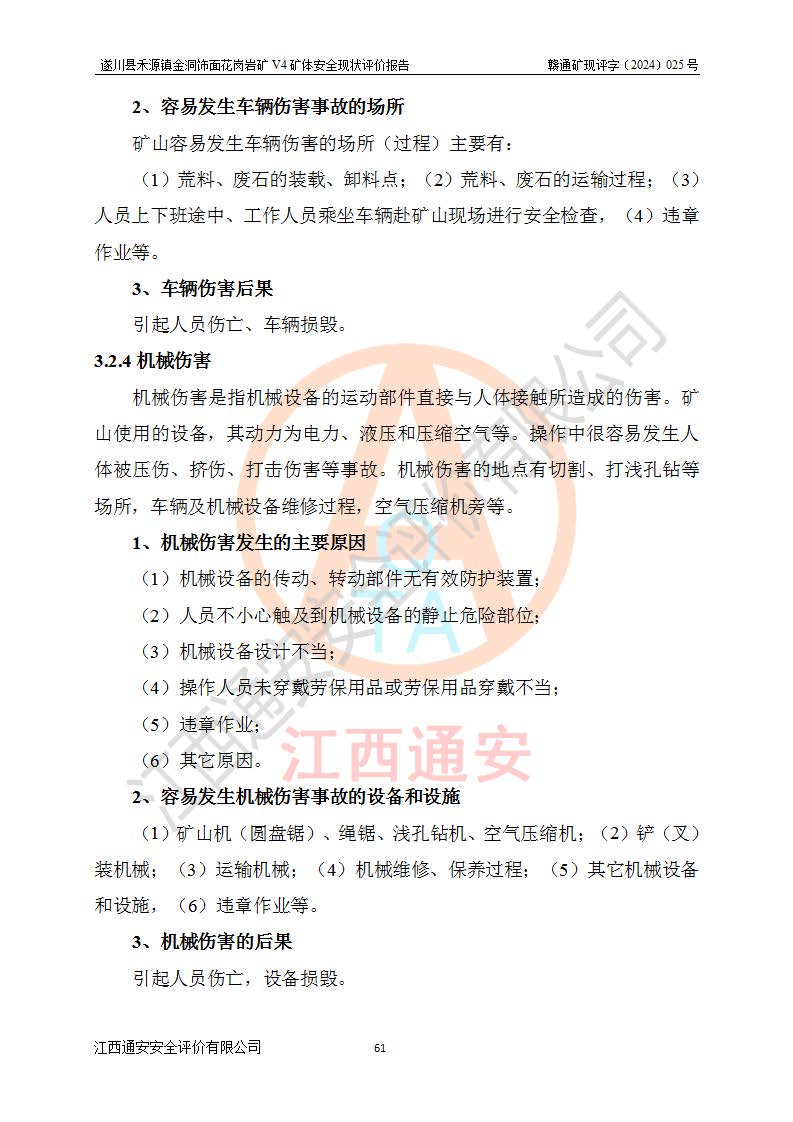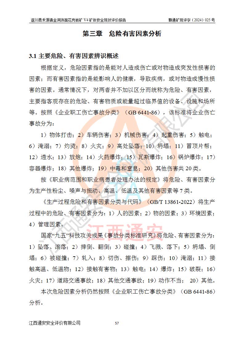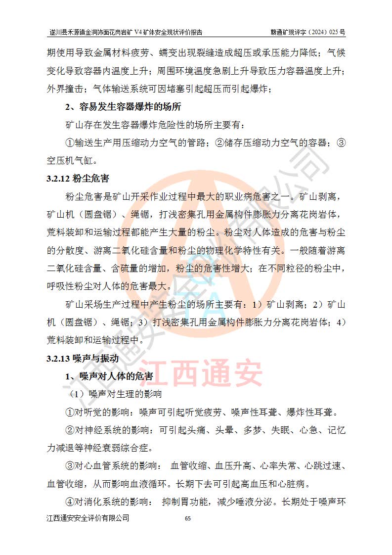 1、該評(píng)價(jià)項(xiàng)目中存在的主要危險(xiǎn)因素:火災(zāi),坍塌(滑坡),**傷害,機(jī)械傷害,觸電與雷擊,物體打擊,泥石流,起重傷害,高處墜落,淹溺,容器爆炸等危險(xiǎn)有害因素。 2、該評(píng)價(jià)項(xiàng)目中存在的有害因素包括:粉塵、噪聲與振動(dòng)、不良作業(yè)環(huán)境,如高溫、雷擊對(duì)礦山人員的傷害和其他不利的環(huán)境因素等。 3、該評(píng)價(jià)項(xiàng)目為非金屬露天礦山,無(wú)瓦斯和自燃發(fā)火危險(xiǎn),礦區(qū)范圍內(nèi)及周邊無(wú)較大水系,礦區(qū)水文地質(zhì)條件簡(jiǎn)單。該礦山只是對(duì)飾面用石料進(jìn)行機(jī)械開采,不使用有毒有害危險(xiǎn)化學(xué)品藥劑。該評(píng)價(jià)項(xiàng)目使用的壓力容器為空壓機(jī)儲(chǔ)氣罐,其工作介質(zhì)為空氣,屬**性、非易燃介質(zhì)。綜合上述分析,本評(píng)價(jià)項(xiàng)目不存在重大危險(xiǎn)源。 上述主要危險(xiǎn)、有害因素在采取本報(bào)告第六章中提出的安全對(duì)策措施及建議后,能得到**控制。遂川縣禾源鎮(zhèn)金洞飾面花崗巖礦V4礦體設(shè)備、設(shè)施和場(chǎng)所符合**安全生產(chǎn)有關(guān)法律、法規(guī)、標(biāo)準(zhǔn)及規(guī)范的規(guī)定。礦山采用露天開采、公路開拓、汽車運(yùn)輸方式,安全生產(chǎn)條件一般,能滿足基本的安全生產(chǎn)活動(dòng);安全管理能滿足法規(guī)要求,礦山露天開采按照《安全設(shè)施設(shè)計(jì)》組織生產(chǎn)、具備安全生產(chǎn)條件。 |