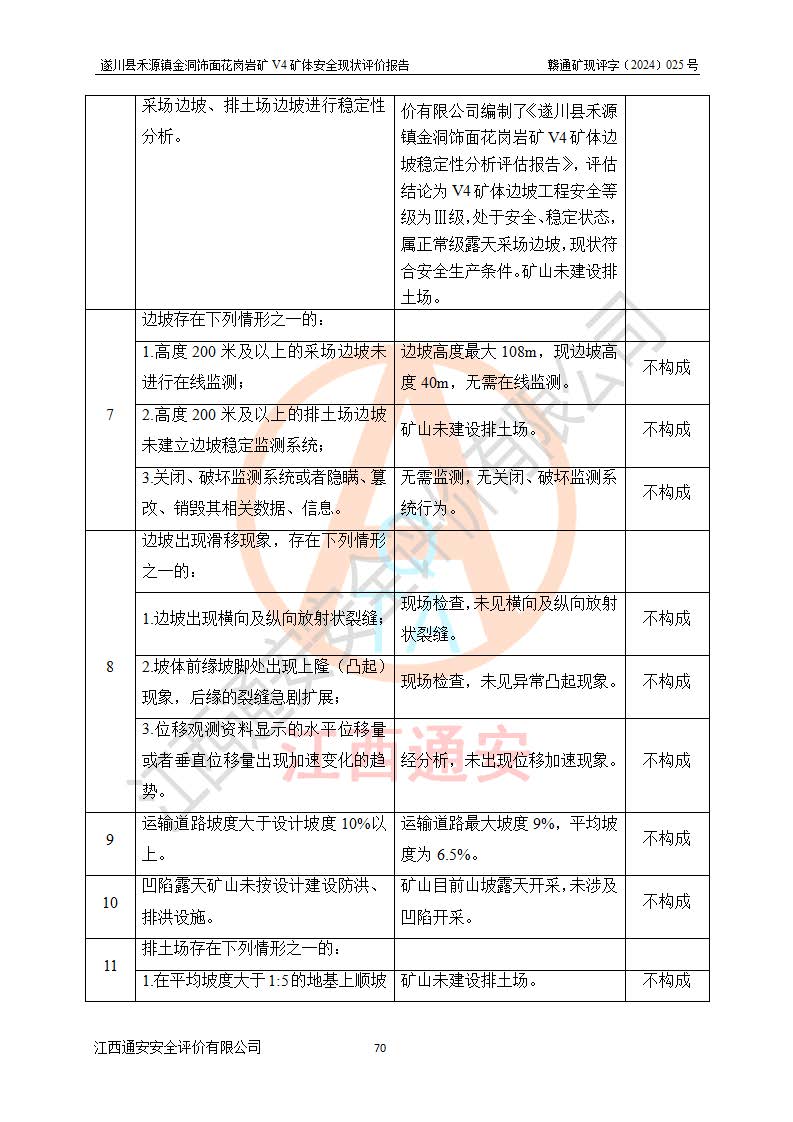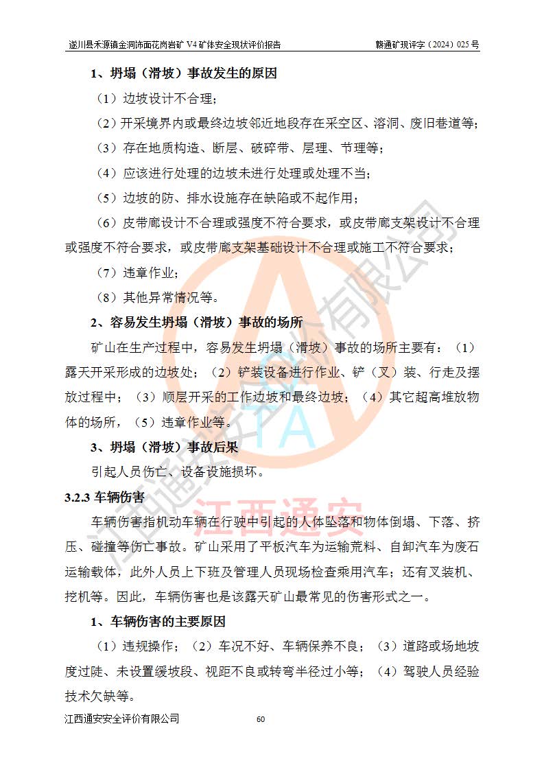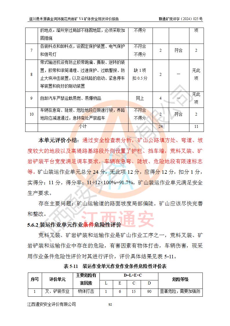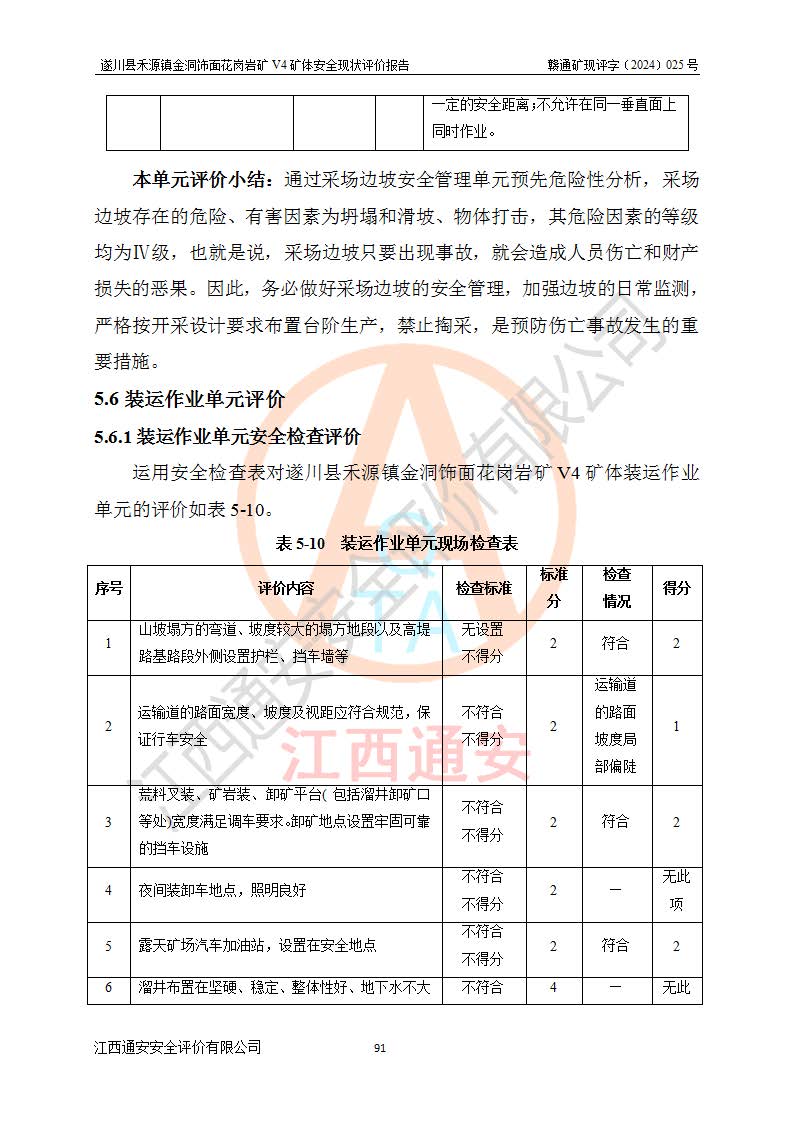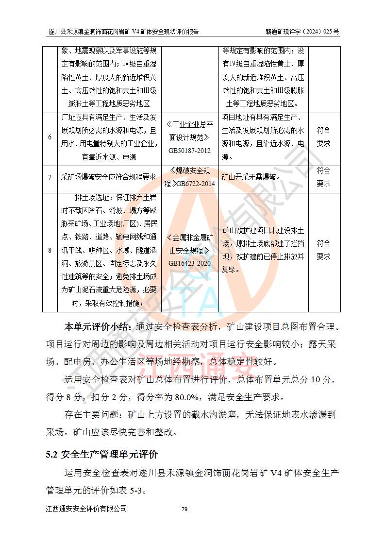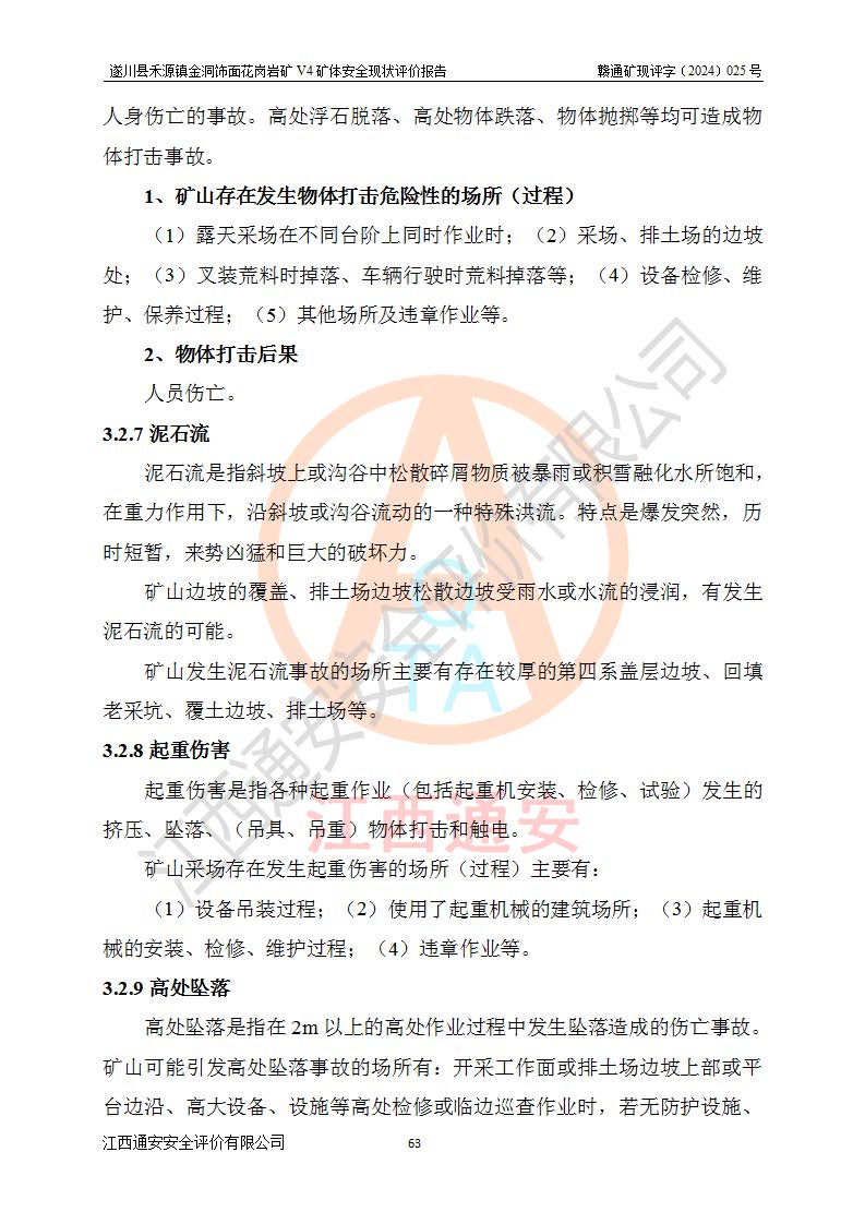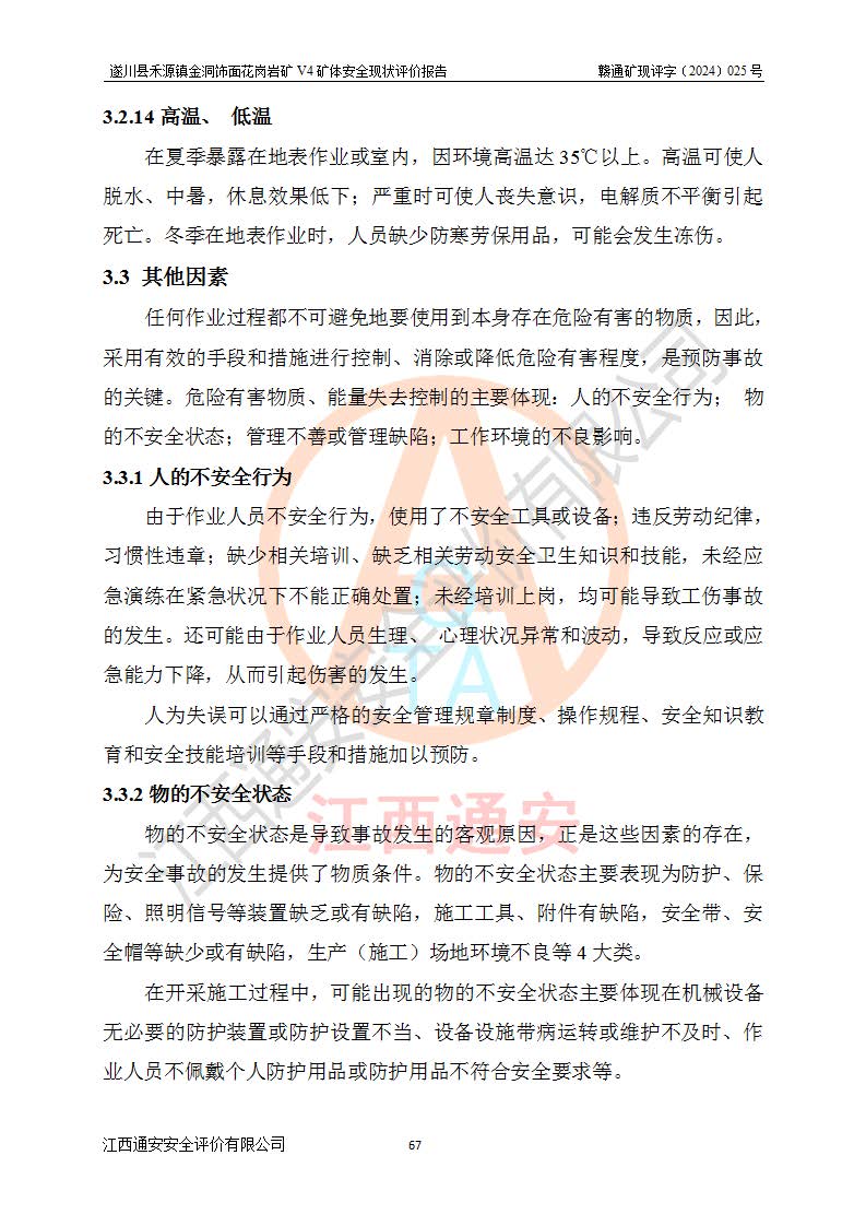 1、該評(píng)價(jià)項(xiàng)目中存在的主要危險(xiǎn)因素:火災(zāi),坍塌(滑坡),**傷害,機(jī)械傷害,觸電與雷擊,物體打擊,泥石流,起重傷害,高處墜落,淹溺,容器爆炸等危險(xiǎn)有害因素。 2、該評(píng)價(jià)項(xiàng)目中存在的有害因素包括:粉塵、噪聲與振動(dòng)、不良作業(yè)環(huán)境,如高溫、雷擊對(duì)礦山人員的傷害和其他不利的環(huán)境因素等。 3、該評(píng)價(jià)項(xiàng)目為非金屬露天礦山,無(wú)瓦斯和自燃發(fā)火危險(xiǎn),礦區(qū)范圍內(nèi)及周邊無(wú)較大水系,礦區(qū)水文地質(zhì)條件簡(jiǎn)單。該礦山只是對(duì)飾面用石料進(jìn)行機(jī)械開采,不使用有毒有害危險(xiǎn)化學(xué)品藥劑。該評(píng)價(jià)項(xiàng)目使用的壓力容器為空壓機(jī)儲(chǔ)氣罐,其工作介質(zhì)為空氣,屬**性、非易燃介質(zhì)。綜合上述分析,本評(píng)價(jià)項(xiàng)目不存在重大危險(xiǎn)源。 上述主要危險(xiǎn)、有害因素在采取本報(bào)告第六章中提出的安全對(duì)策措施及建議后,能得到**控制。遂川縣禾源鎮(zhèn)金洞飾面花崗巖礦V4礦體設(shè)備、設(shè)施和場(chǎng)所符合**安全生產(chǎn)有關(guān)法律、法規(guī)、標(biāo)準(zhǔn)及規(guī)范的規(guī)定。礦山采用露天開采、公路開拓、汽車運(yùn)輸方式,安全生產(chǎn)條件一般,能滿足基本的安全生產(chǎn)活動(dòng);安全管理能滿足法規(guī)要求,礦山露天開采按照《安全設(shè)施設(shè)計(jì)》組織生產(chǎn)、具備安全生產(chǎn)條件。 |