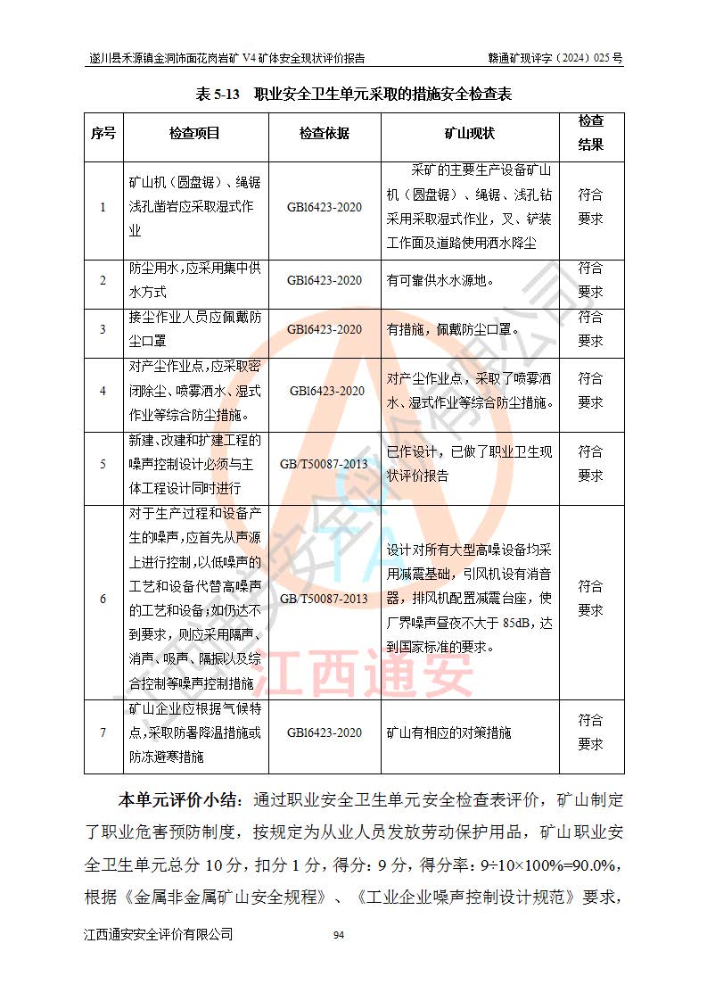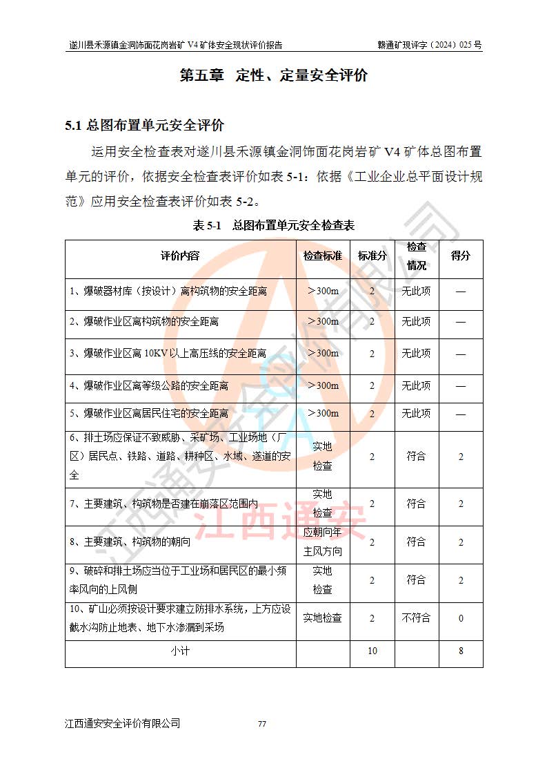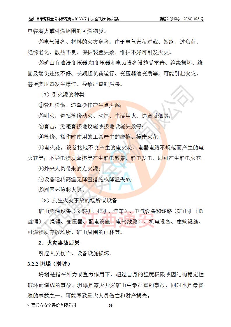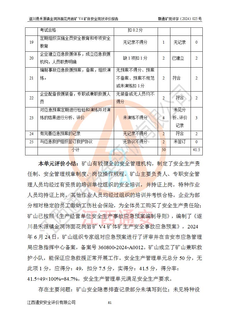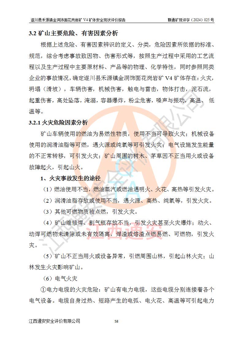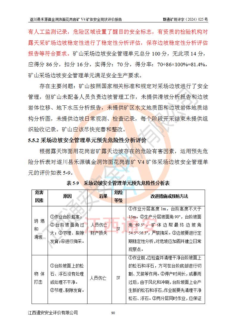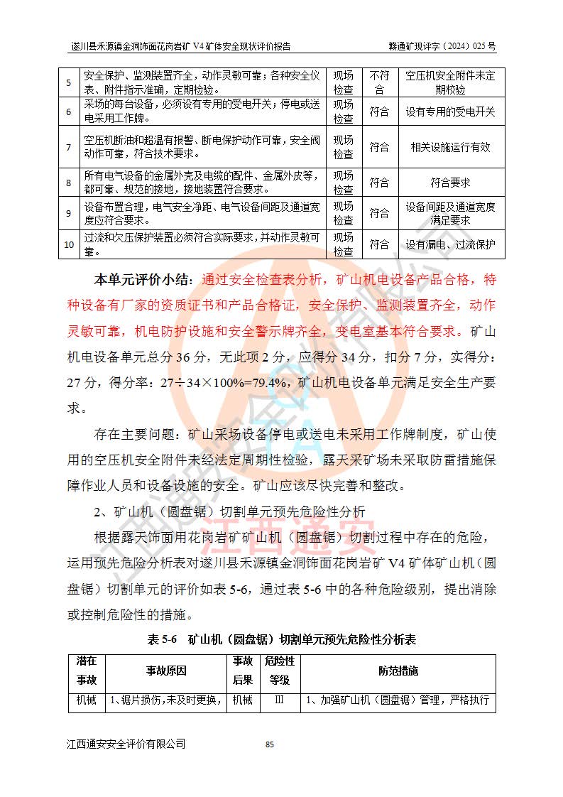 1、該評(píng)價(jià)項(xiàng)目中存在的主要危險(xiǎn)因素:火災(zāi),坍塌(滑坡),**傷害,機(jī)械傷害,觸電與雷擊,物體打擊,泥石流,起重傷害,高處墜落,淹溺,容器爆炸等危險(xiǎn)有害因素。 2、該評(píng)價(jià)項(xiàng)目中存在的有害因素包括:粉塵、噪聲與振動(dòng)、不良作業(yè)環(huán)境,如高溫、雷擊對(duì)礦山人員的傷害和其他不利的環(huán)境因素等。 3、該評(píng)價(jià)項(xiàng)目為非金屬露天礦山,無(wú)瓦斯和自燃發(fā)火危險(xiǎn),礦區(qū)范圍內(nèi)及周邊無(wú)較大水系,礦區(qū)水文地質(zhì)條件簡(jiǎn)單。該礦山只是對(duì)飾面用石料進(jìn)行機(jī)械開采,不使用有毒有害危險(xiǎn)化學(xué)品藥劑。該評(píng)價(jià)項(xiàng)目使用的壓力容器為空壓機(jī)儲(chǔ)氣罐,其工作介質(zhì)為空氣,屬**性、非易燃介質(zhì)。綜合上述分析,本評(píng)價(jià)項(xiàng)目不存在重大危險(xiǎn)源。 上述主要危險(xiǎn)、有害因素在采取本報(bào)告第六章中提出的安全對(duì)策措施及建議后,能得到**控制。遂川縣禾源鎮(zhèn)金洞飾面花崗巖礦V4礦體設(shè)備、設(shè)施和場(chǎng)所符合**安全生產(chǎn)有關(guān)法律、法規(guī)、標(biāo)準(zhǔn)及規(guī)范的規(guī)定。礦山采用露天開采、公路開拓、汽車運(yùn)輸方式,安全生產(chǎn)條件一般,能滿足基本的安全生產(chǎn)活動(dòng);安全管理能滿足法規(guī)要求,礦山露天開采按照《安全設(shè)施設(shè)計(jì)》組織生產(chǎn)、具備安全生產(chǎn)條件。 |