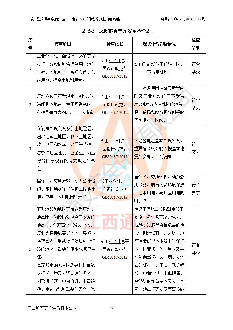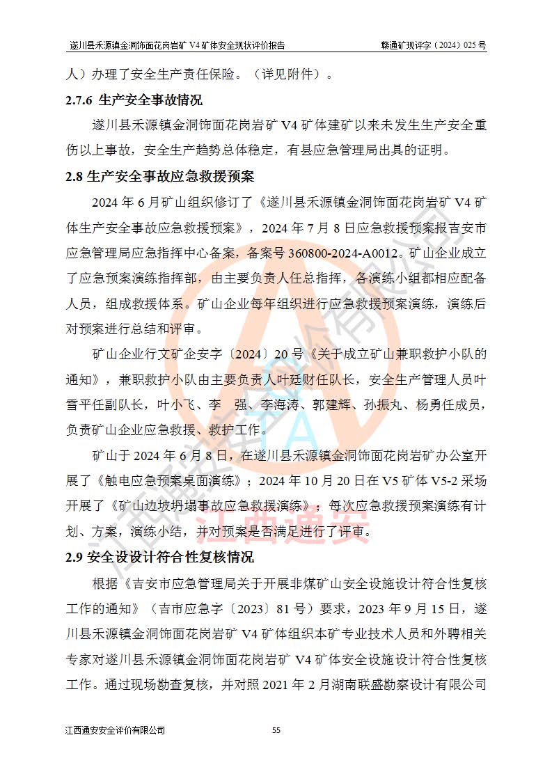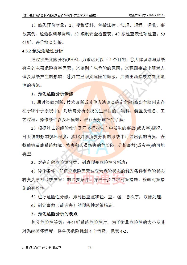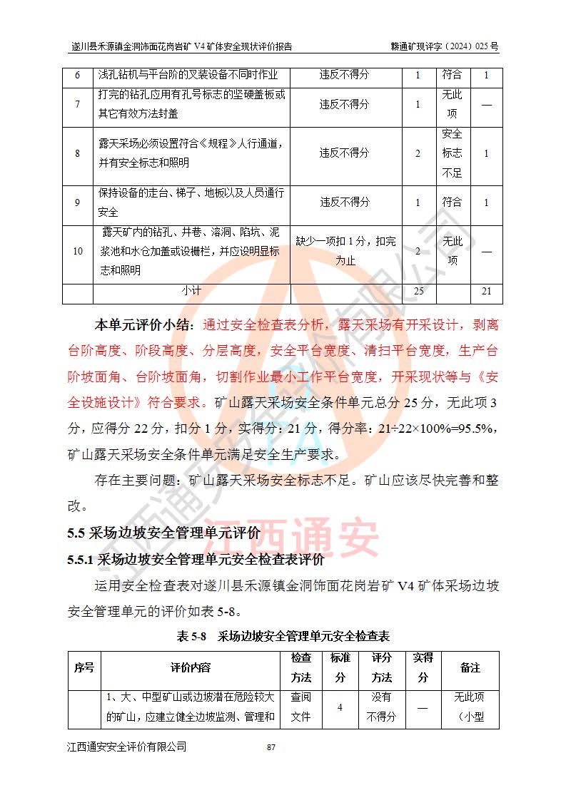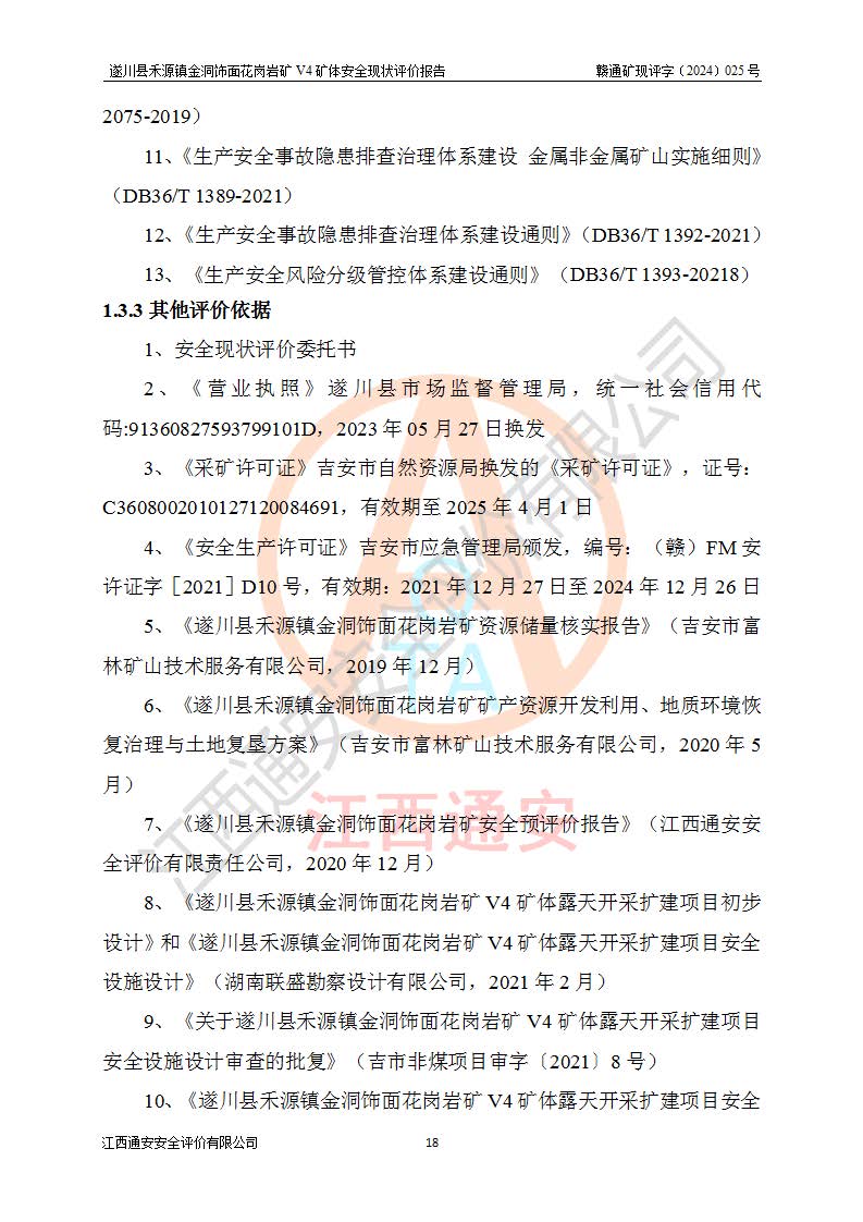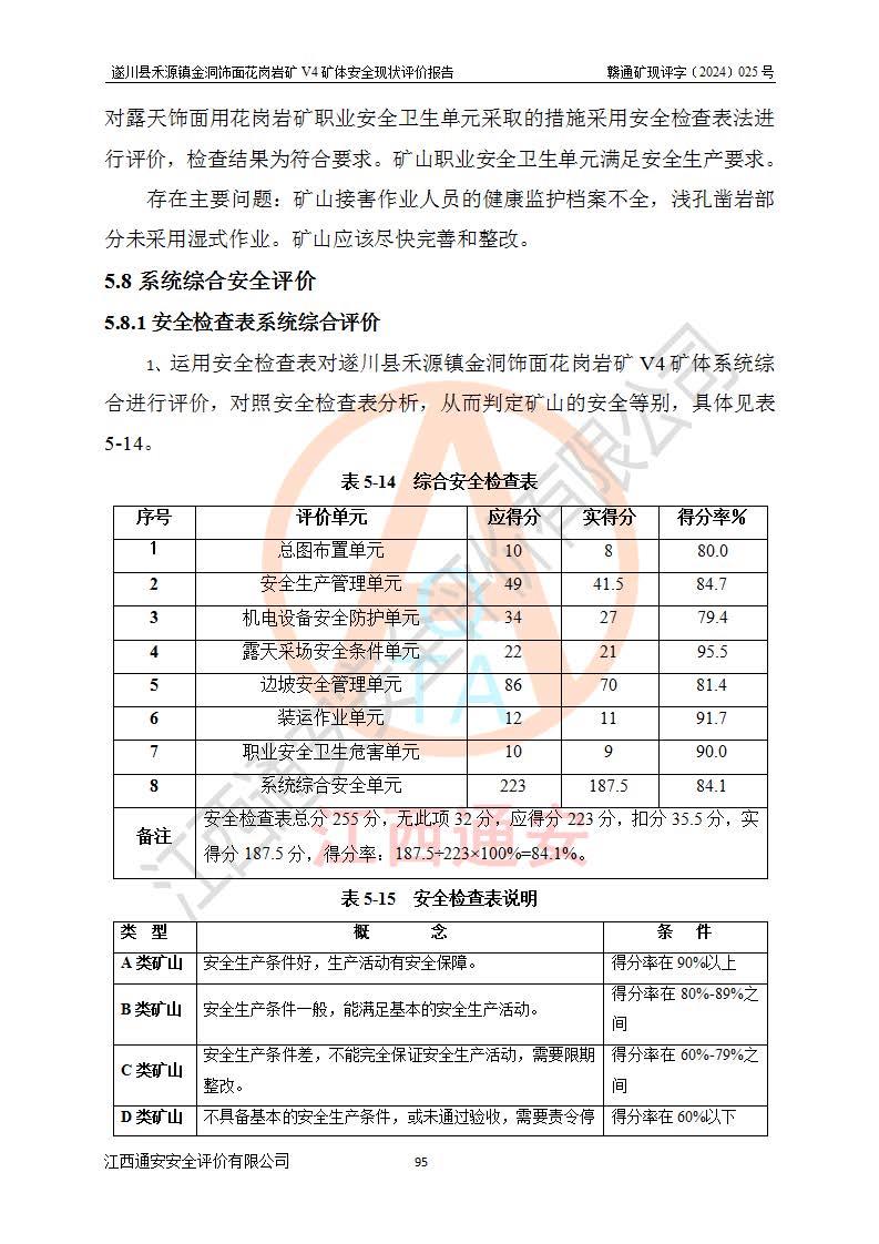 1、該評(píng)價(jià)項(xiàng)目中存在的主要危險(xiǎn)因素:火災(zāi),坍塌(滑坡),**傷害,機(jī)械傷害,觸電與雷擊,物體打擊,泥石流,起重傷害,高處墜落,淹溺,容器爆炸等危險(xiǎn)有害因素。 2、該評(píng)價(jià)項(xiàng)目中存在的有害因素包括:粉塵、噪聲與振動(dòng)、不良作業(yè)環(huán)境,如高溫、雷擊對(duì)礦山人員的傷害和其他不利的環(huán)境因素等。 3、該評(píng)價(jià)項(xiàng)目為非金屬露天礦山,無(wú)瓦斯和自燃發(fā)火危險(xiǎn),礦區(qū)范圍內(nèi)及周邊無(wú)較大水系,礦區(qū)水文地質(zhì)條件簡(jiǎn)單。該礦山只是對(duì)飾面用石料進(jìn)行機(jī)械開采,不使用有毒有害危險(xiǎn)化學(xué)品藥劑。該評(píng)價(jià)項(xiàng)目使用的壓力容器為空壓機(jī)儲(chǔ)氣罐,其工作介質(zhì)為空氣,屬**性、非易燃介質(zhì)。綜合上述分析,本評(píng)價(jià)項(xiàng)目不存在重大危險(xiǎn)源。 上述主要危險(xiǎn)、有害因素在采取本報(bào)告第六章中提出的安全對(duì)策措施及建議后,能得到**控制。遂川縣禾源鎮(zhèn)金洞飾面花崗巖礦V4礦體設(shè)備、設(shè)施和場(chǎng)所符合**安全生產(chǎn)有關(guān)法律、法規(guī)、標(biāo)準(zhǔn)及規(guī)范的規(guī)定。礦山采用露天開采、公路開拓、汽車運(yùn)輸方式,安全生產(chǎn)條件一般,能滿足基本的安全生產(chǎn)活動(dòng);安全管理能滿足法規(guī)要求,礦山露天開采按照《安全設(shè)施設(shè)計(jì)》組織生產(chǎn)、具備安全生產(chǎn)條件。 |