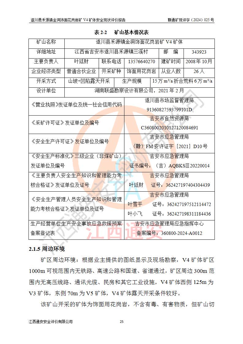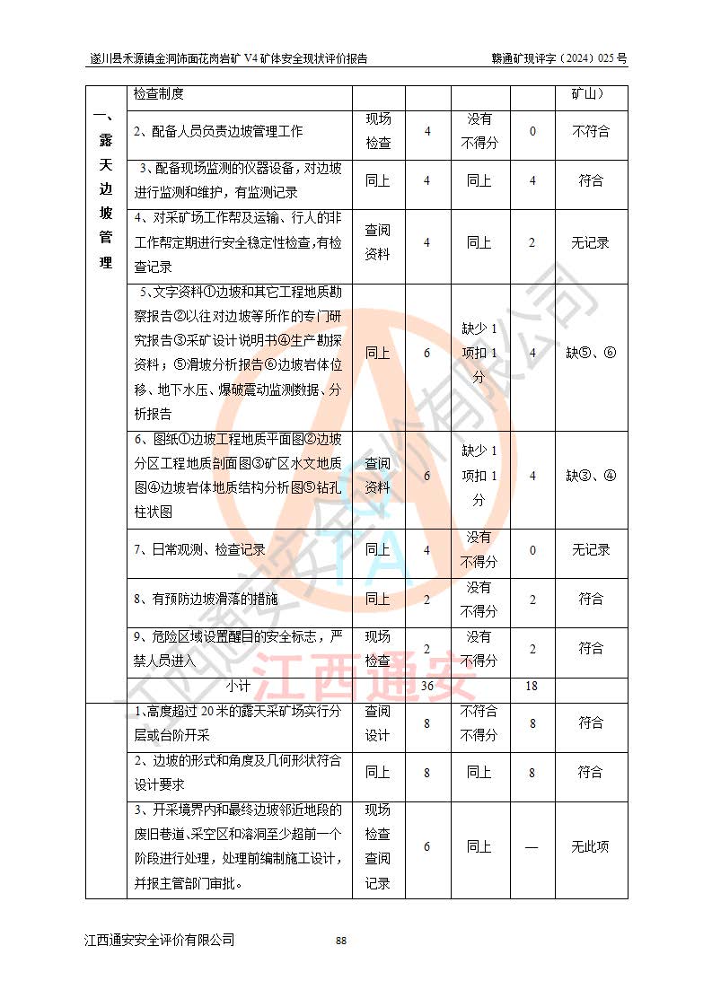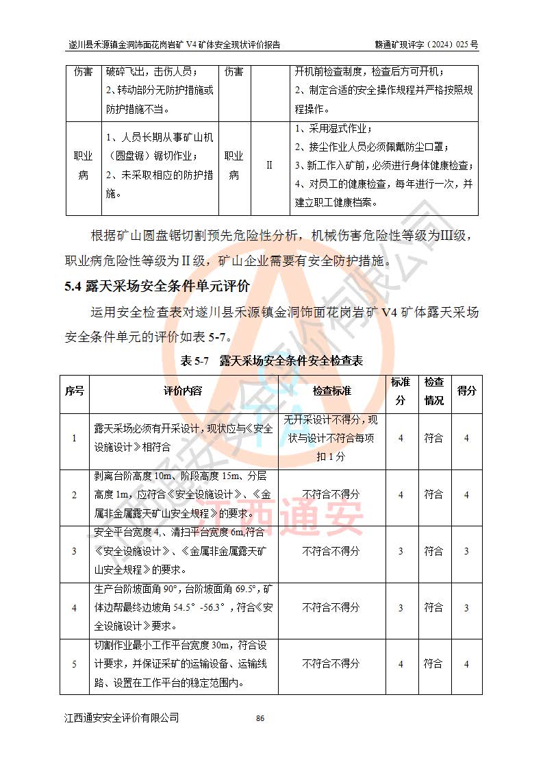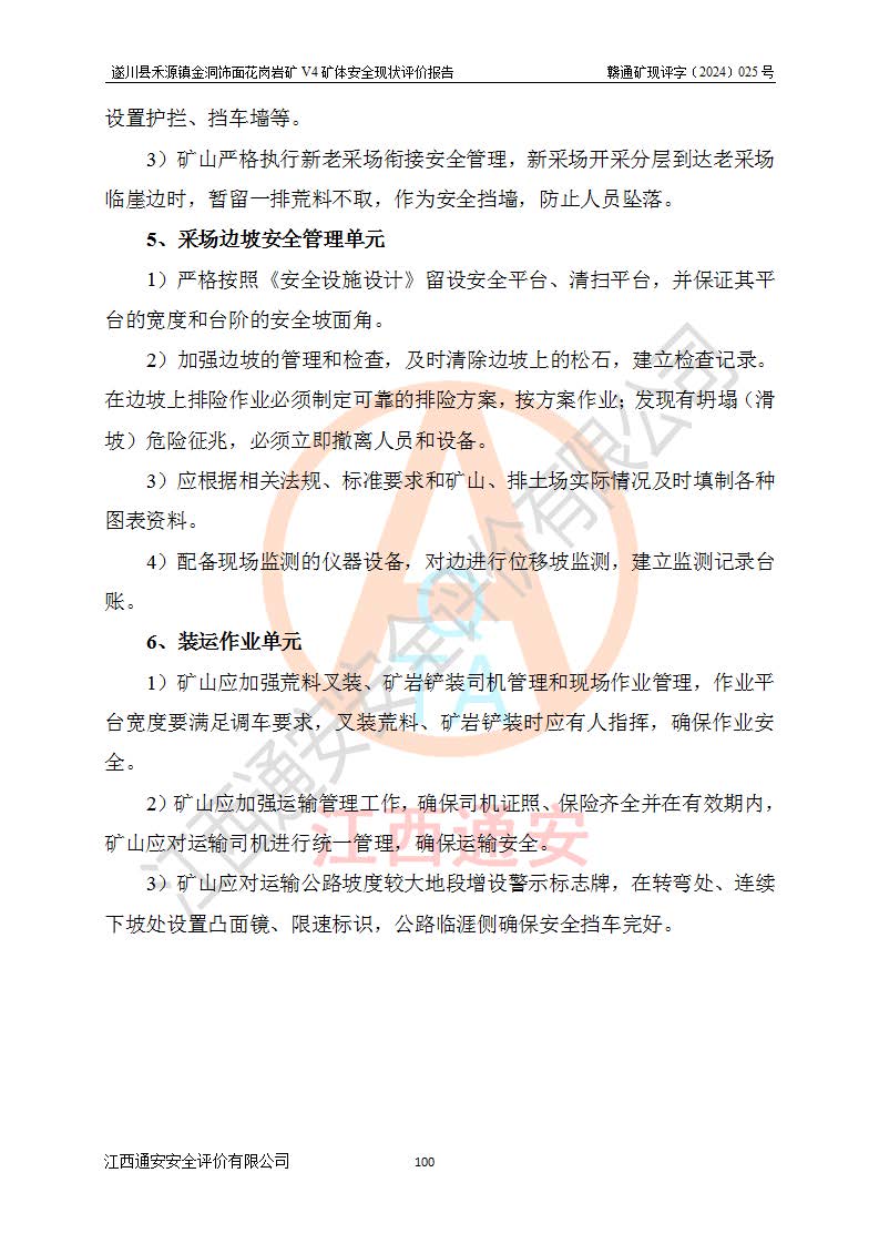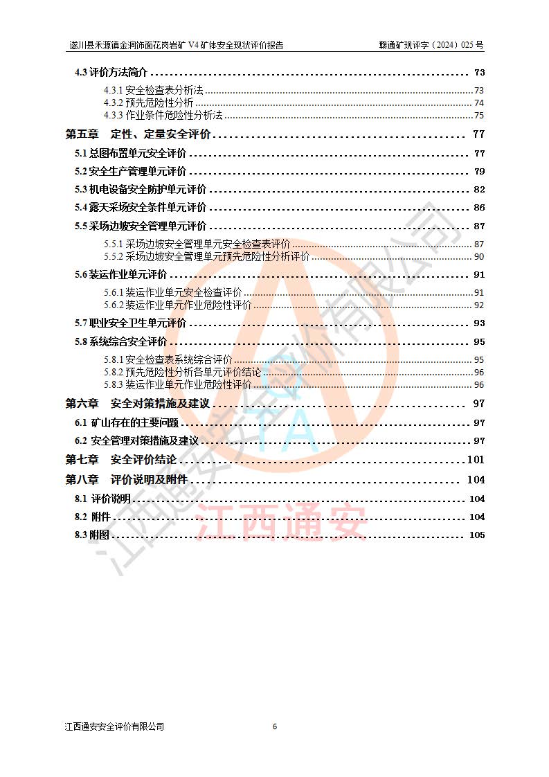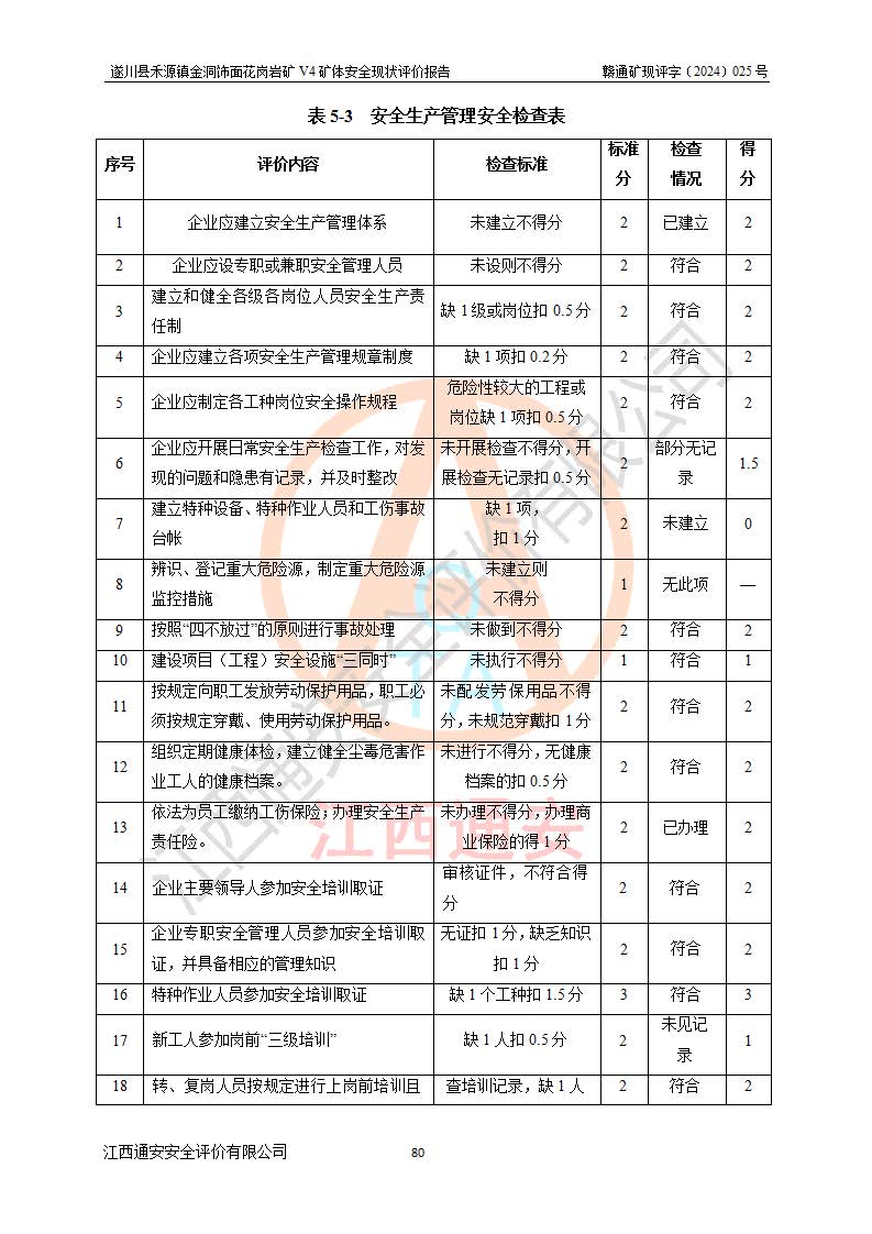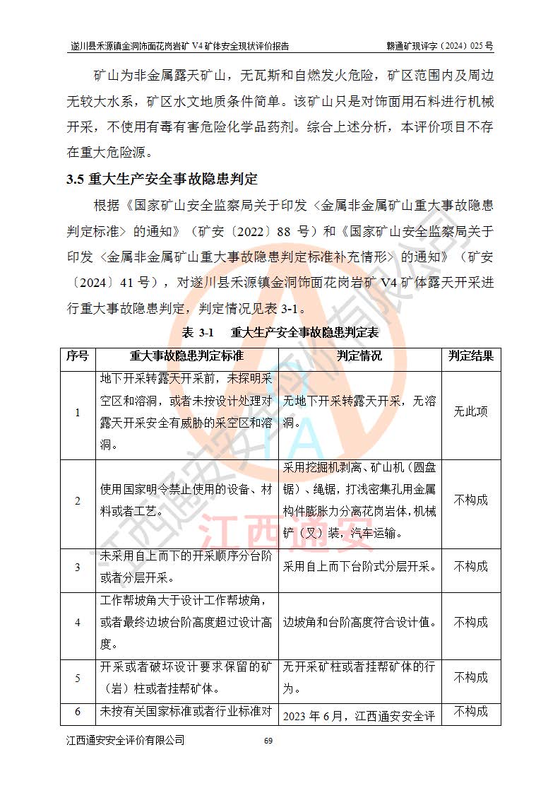 1、該評(píng)價(jià)項(xiàng)目中存在的主要危險(xiǎn)因素:火災(zāi),坍塌(滑坡),**傷害,機(jī)械傷害,觸電與雷擊,物體打擊,泥石流,起重傷害,高處墜落,淹溺,容器爆炸等危險(xiǎn)有害因素。 2、該評(píng)價(jià)項(xiàng)目中存在的有害因素包括:粉塵、噪聲與振動(dòng)、不良作業(yè)環(huán)境,如高溫、雷擊對(duì)礦山人員的傷害和其他不利的環(huán)境因素等。 3、該評(píng)價(jià)項(xiàng)目為非金屬露天礦山,無(wú)瓦斯和自燃發(fā)火危險(xiǎn),礦區(qū)范圍內(nèi)及周邊無(wú)較大水系,礦區(qū)水文地質(zhì)條件簡(jiǎn)單。該礦山只是對(duì)飾面用石料進(jìn)行機(jī)械開采,不使用有毒有害危險(xiǎn)化學(xué)品藥劑。該評(píng)價(jià)項(xiàng)目使用的壓力容器為空壓機(jī)儲(chǔ)氣罐,其工作介質(zhì)為空氣,屬**性、非易燃介質(zhì)。綜合上述分析,本評(píng)價(jià)項(xiàng)目不存在重大危險(xiǎn)源。 上述主要危險(xiǎn)、有害因素在采取本報(bào)告第六章中提出的安全對(duì)策措施及建議后,能得到**控制。遂川縣禾源鎮(zhèn)金洞飾面花崗巖礦V4礦體設(shè)備、設(shè)施和場(chǎng)所符合**安全生產(chǎn)有關(guān)法律、法規(guī)、標(biāo)準(zhǔn)及規(guī)范的規(guī)定。礦山采用露天開采、公路開拓、汽車運(yùn)輸方式,安全生產(chǎn)條件一般,能滿足基本的安全生產(chǎn)活動(dòng);安全管理能滿足法規(guī)要求,礦山露天開采按照《安全設(shè)施設(shè)計(jì)》組織生產(chǎn)、具備安全生產(chǎn)條件。 |